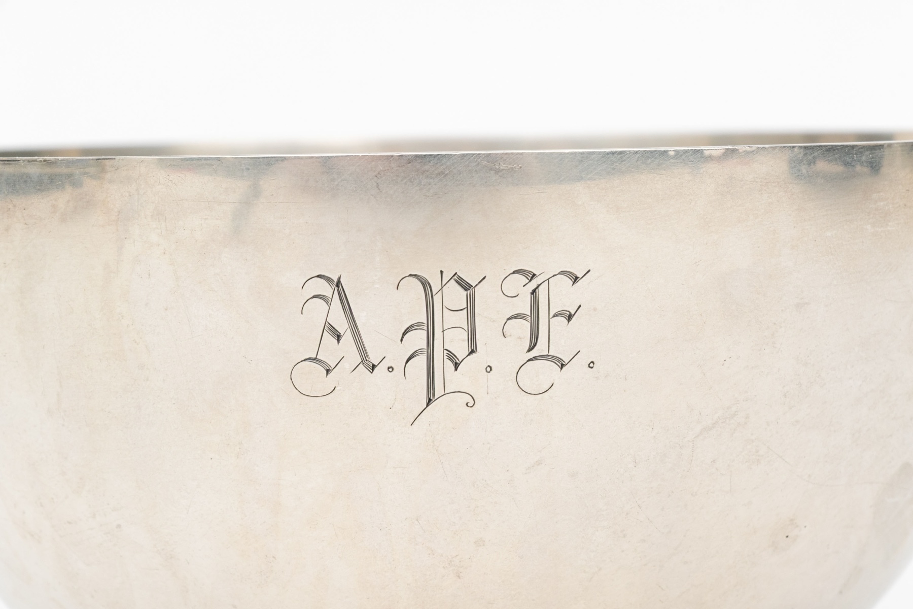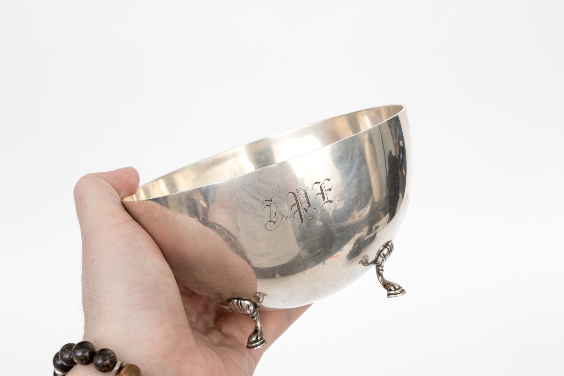 A deep round bowl raised on four shell and scroll legs with hoof feet. Monogrammed.