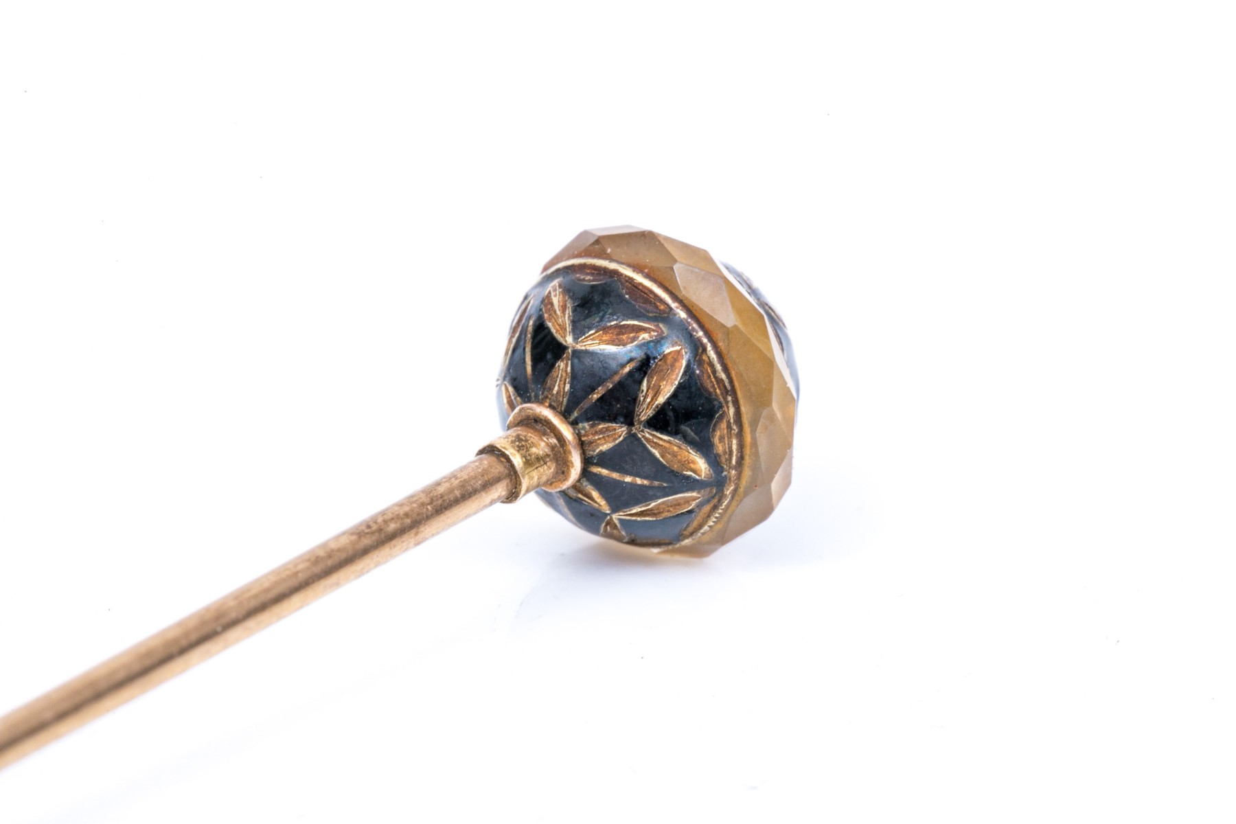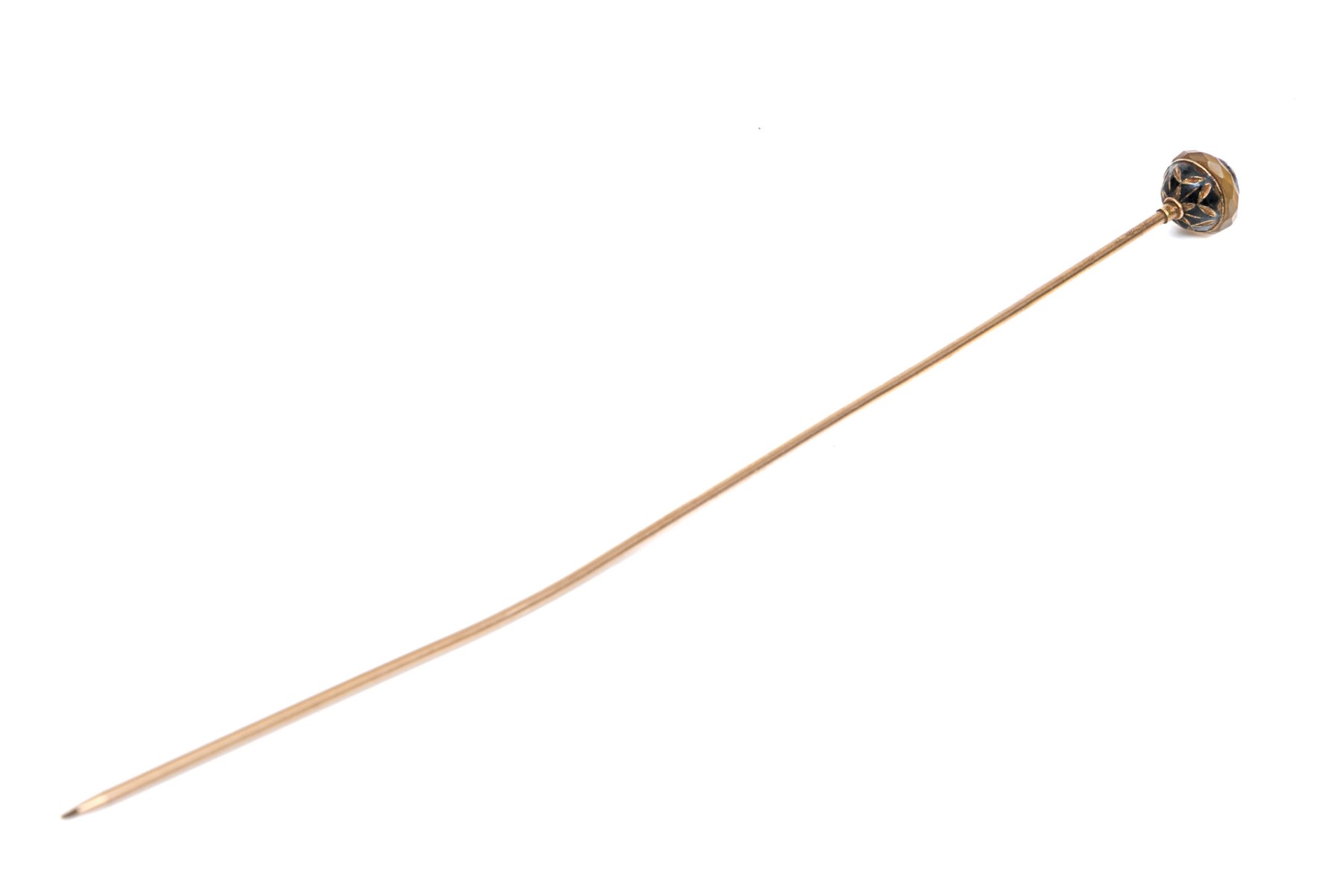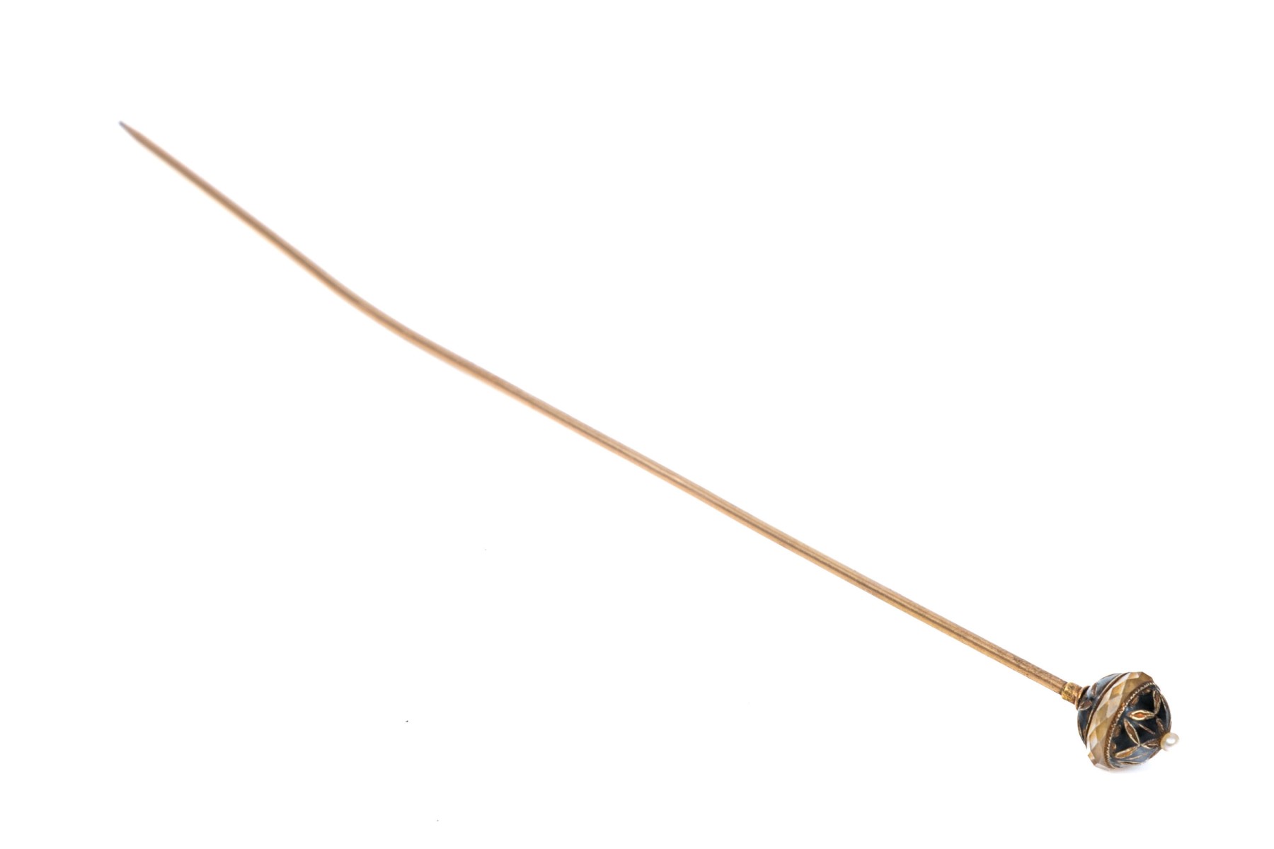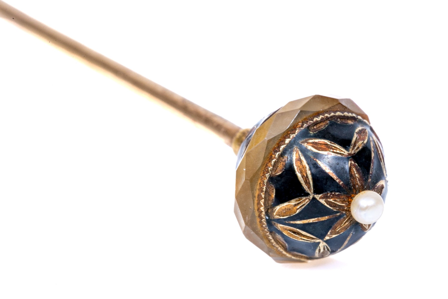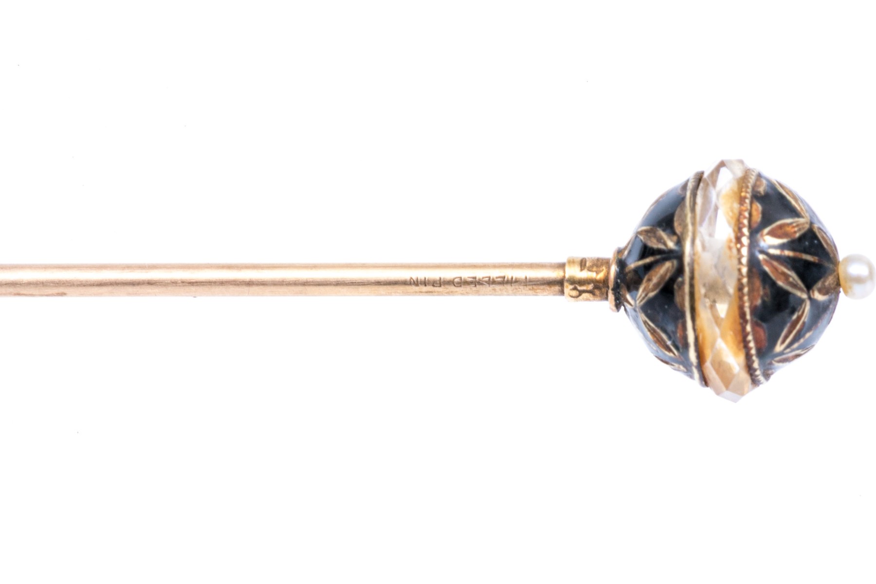 Antique striking 14k top black enamel, crystal and cultured pearl hat pin, gold filled stem
