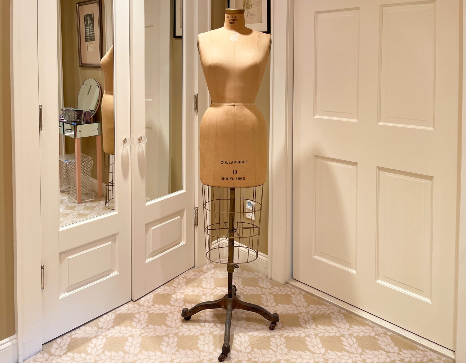 The fabric covered dress form with wired lower dress portion stands upon an iron finished pedestal with base supported on four feet.