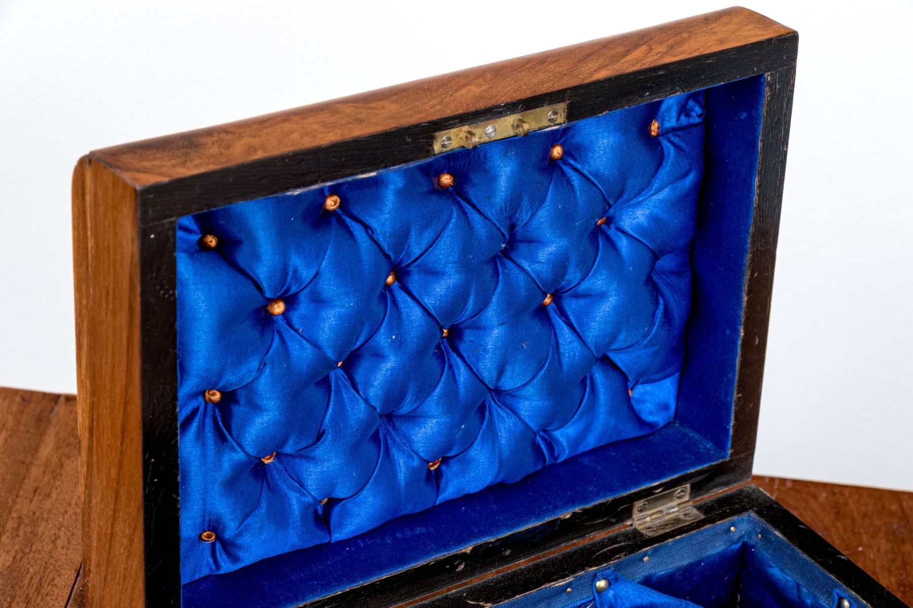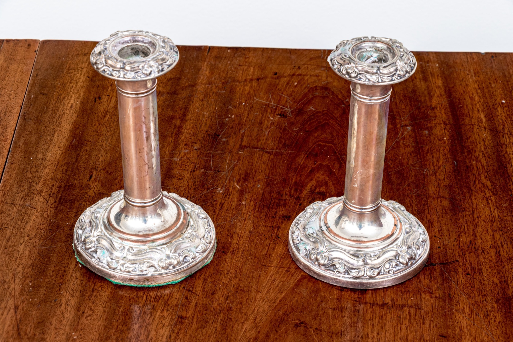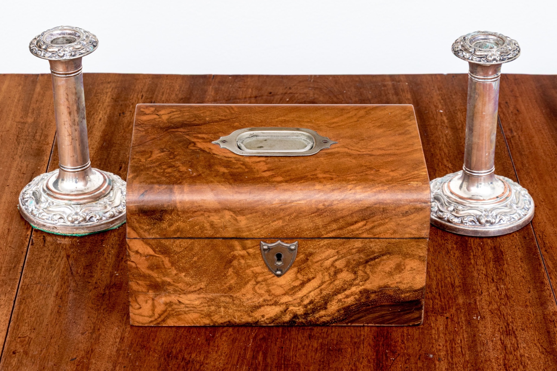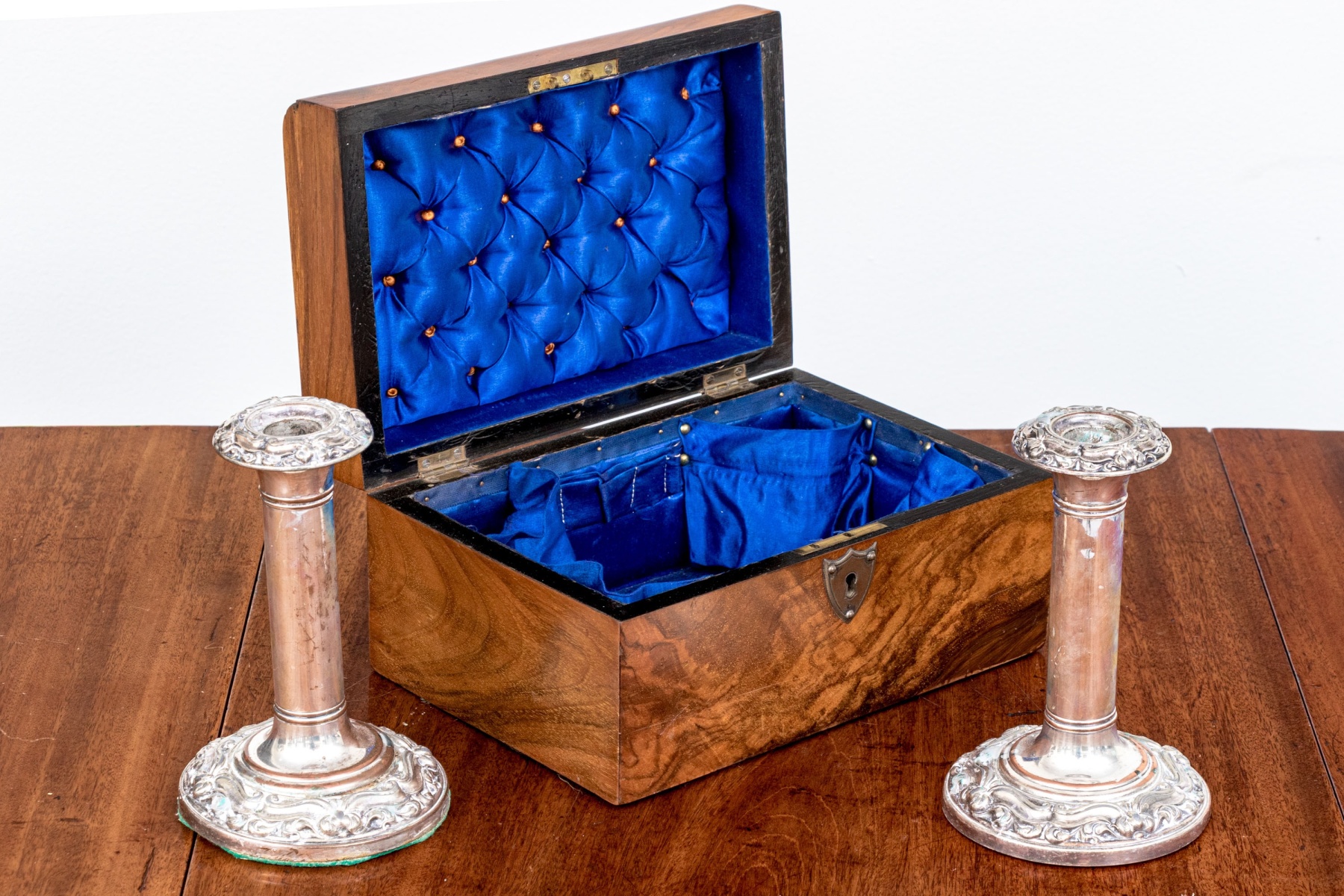 A lovely collection of antique tabletop pieces including a pair of silver plated candlesticks with decorative repousse feet and nozzles and a hinged figured wood jewelry box with brass top handle and shield form key escutcheon lined in rich royal blue fabric.