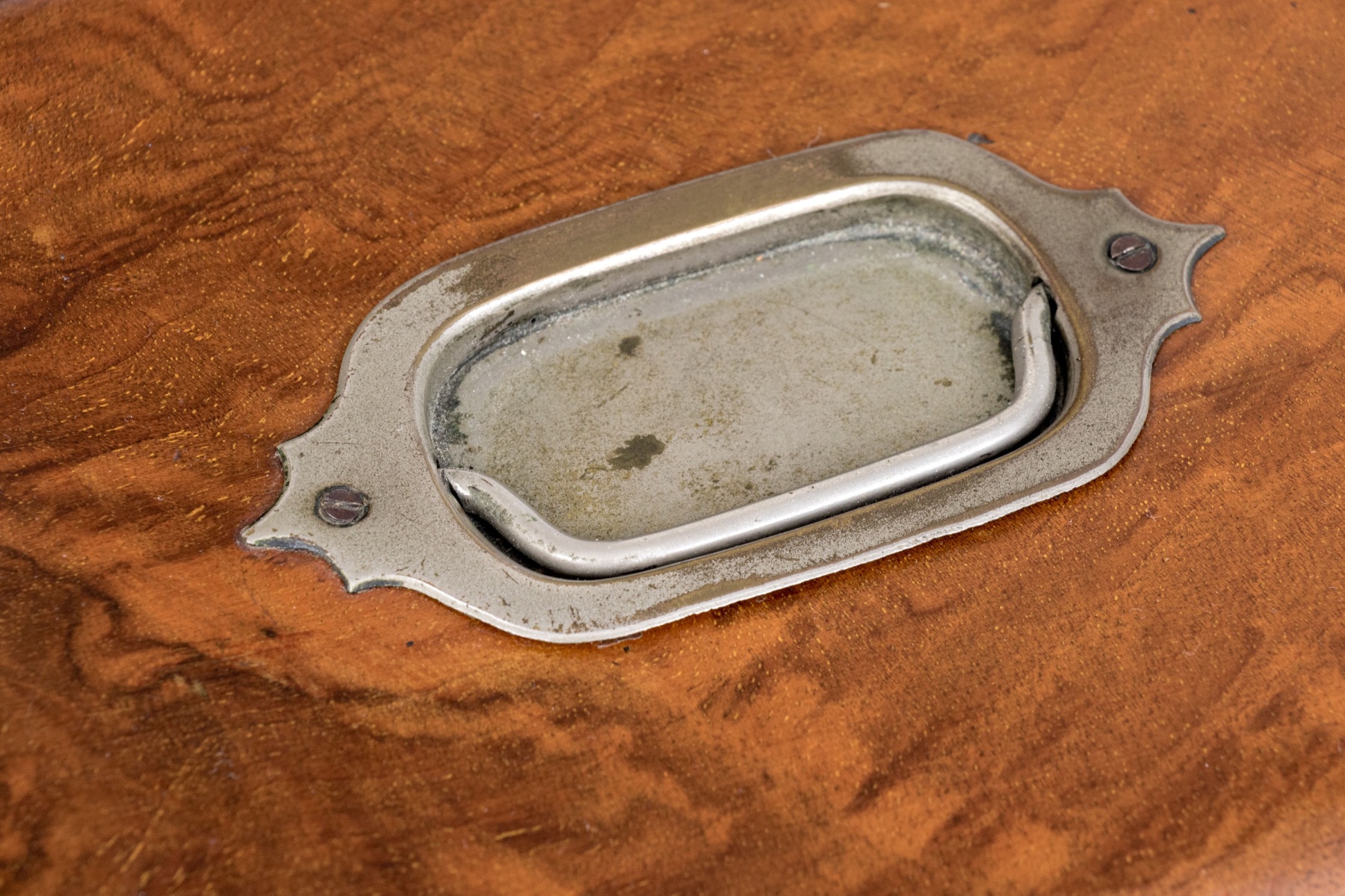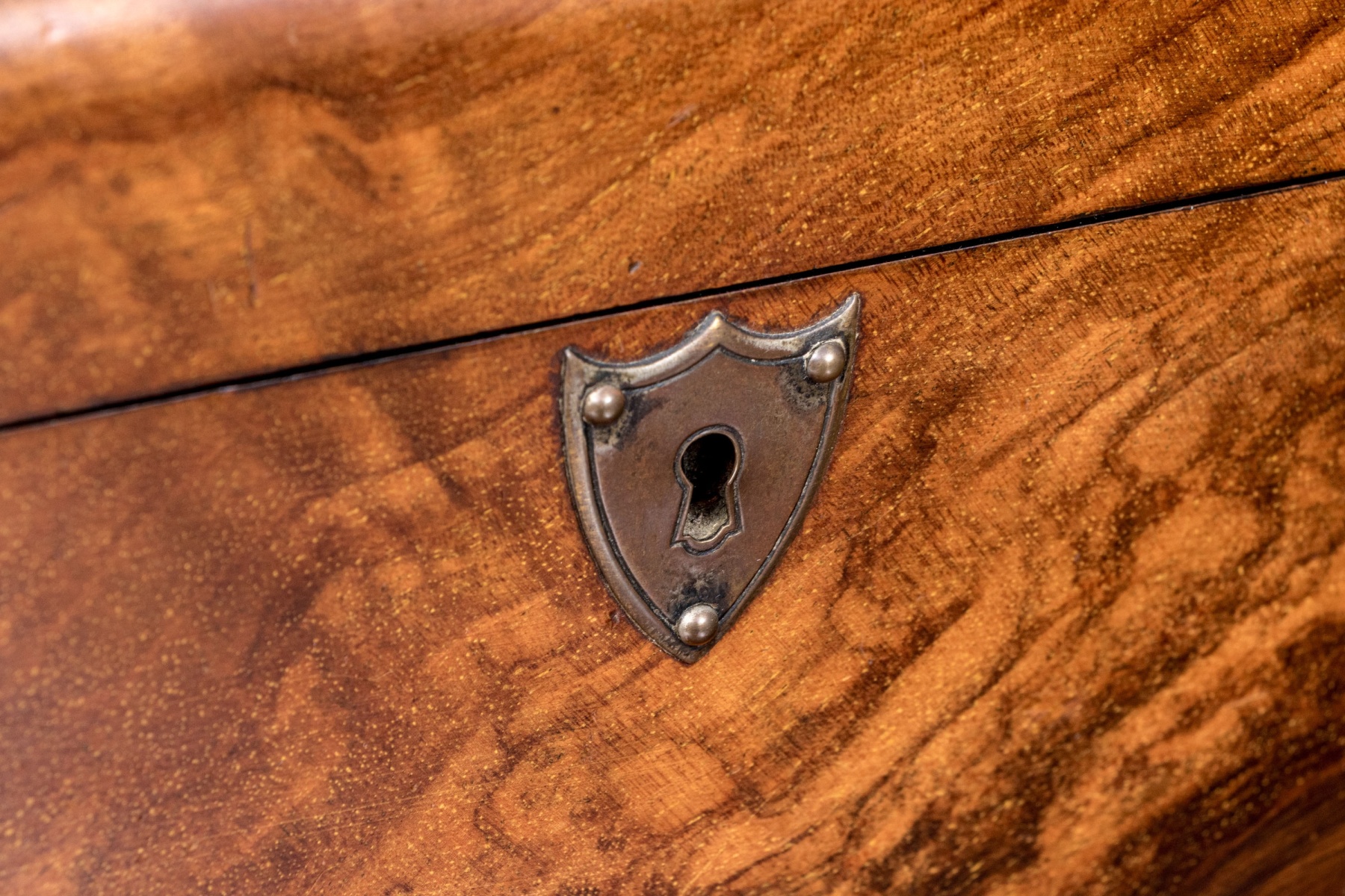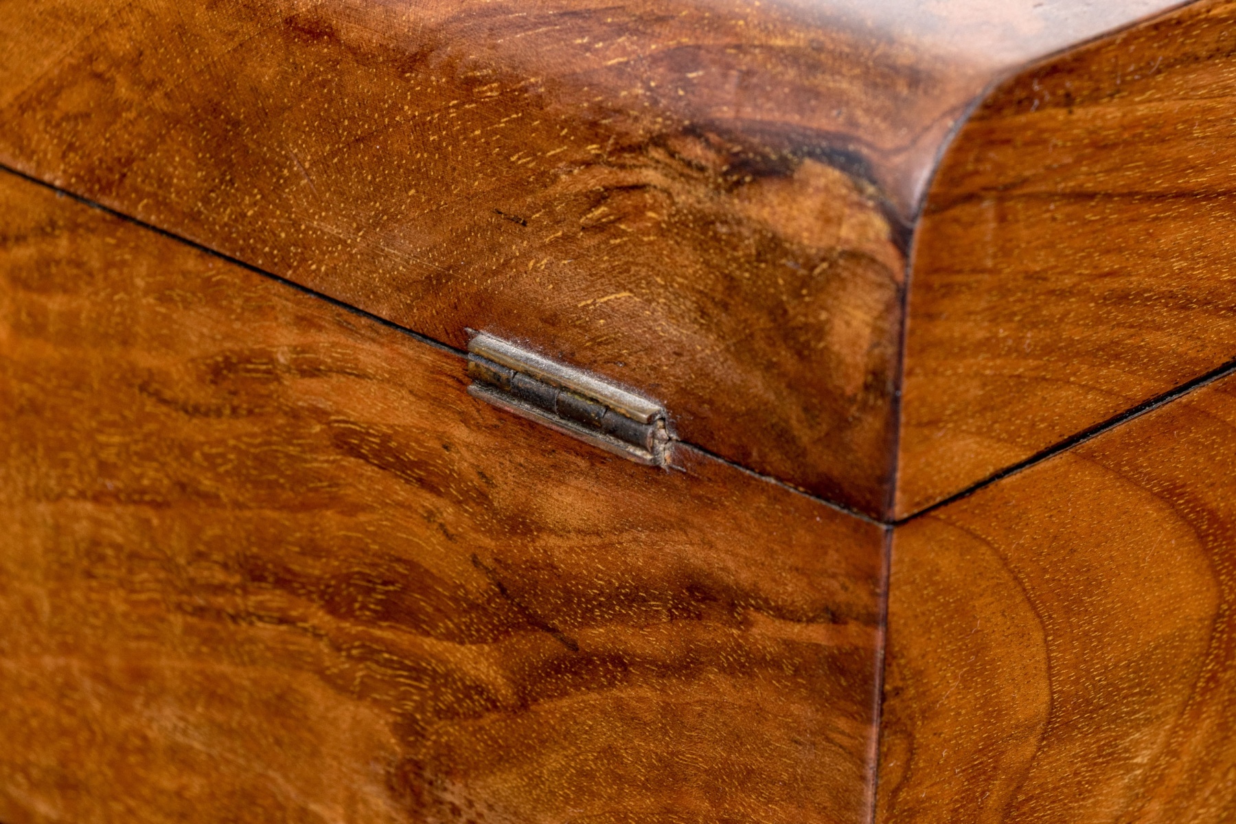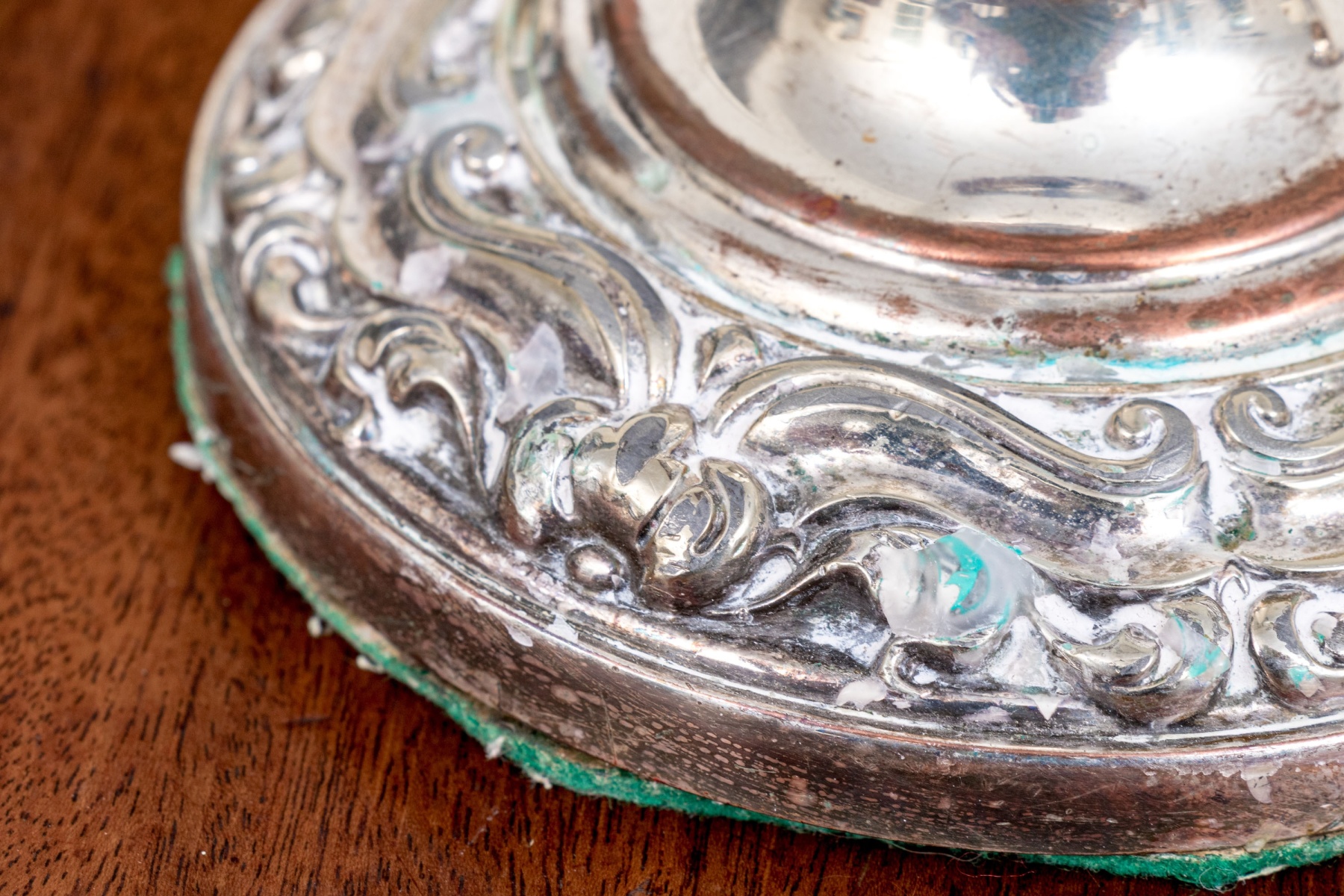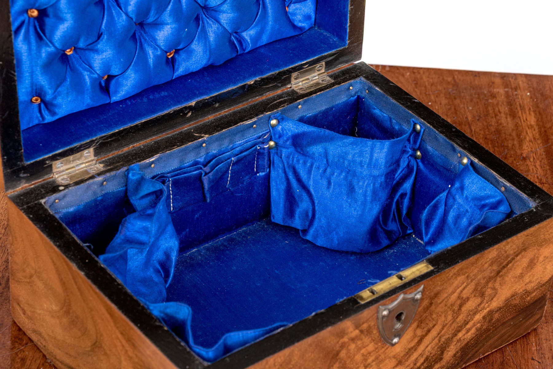 A lovely collection of antique tabletop pieces including a pair of silver plated candlesticks with decorative repousse feet and nozzles and a hinged figured wood jewelry box with brass top handle and shield form key escutcheon lined in rich royal blue fabric.