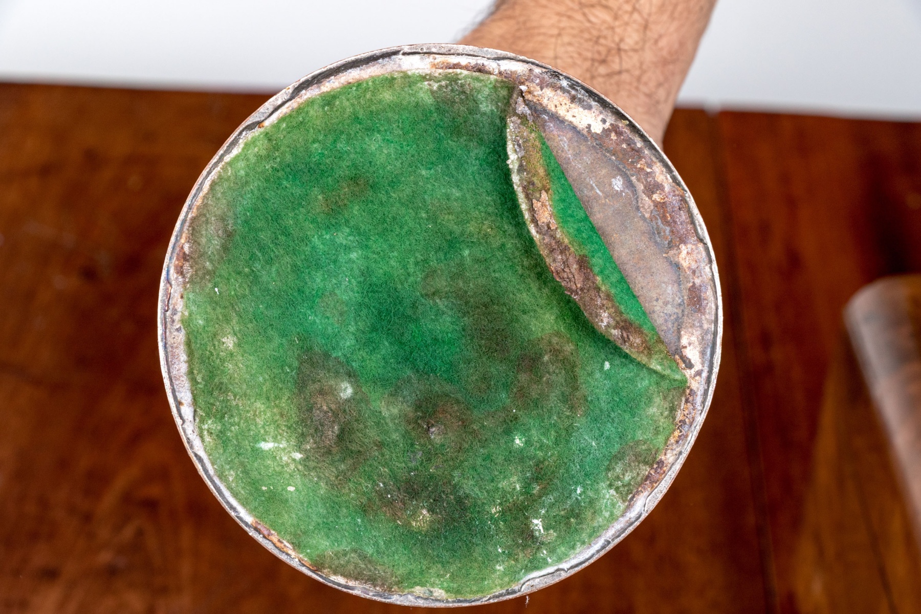 Good overall. Slight tilting to one candlestick column. Candlesticks with some minor dings and tarnish. Does not include a key for the box.