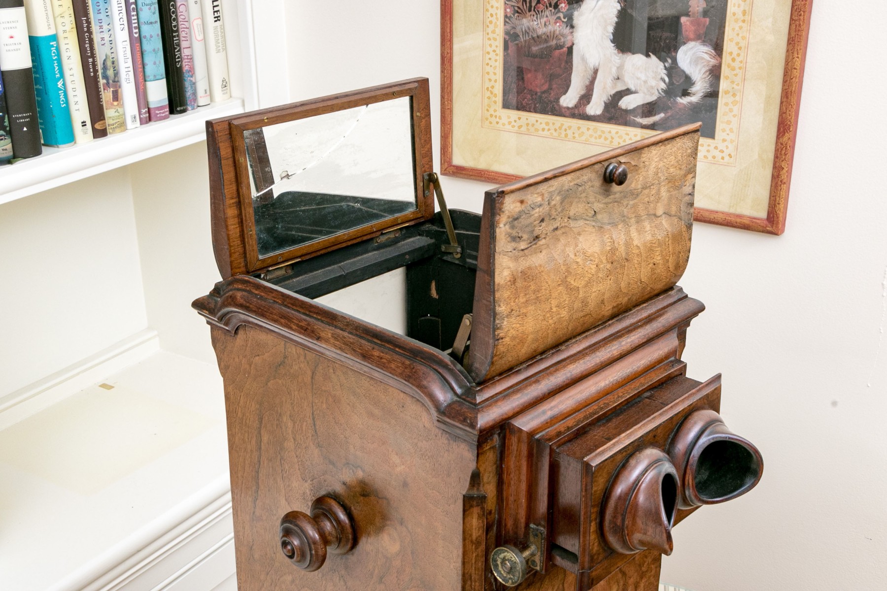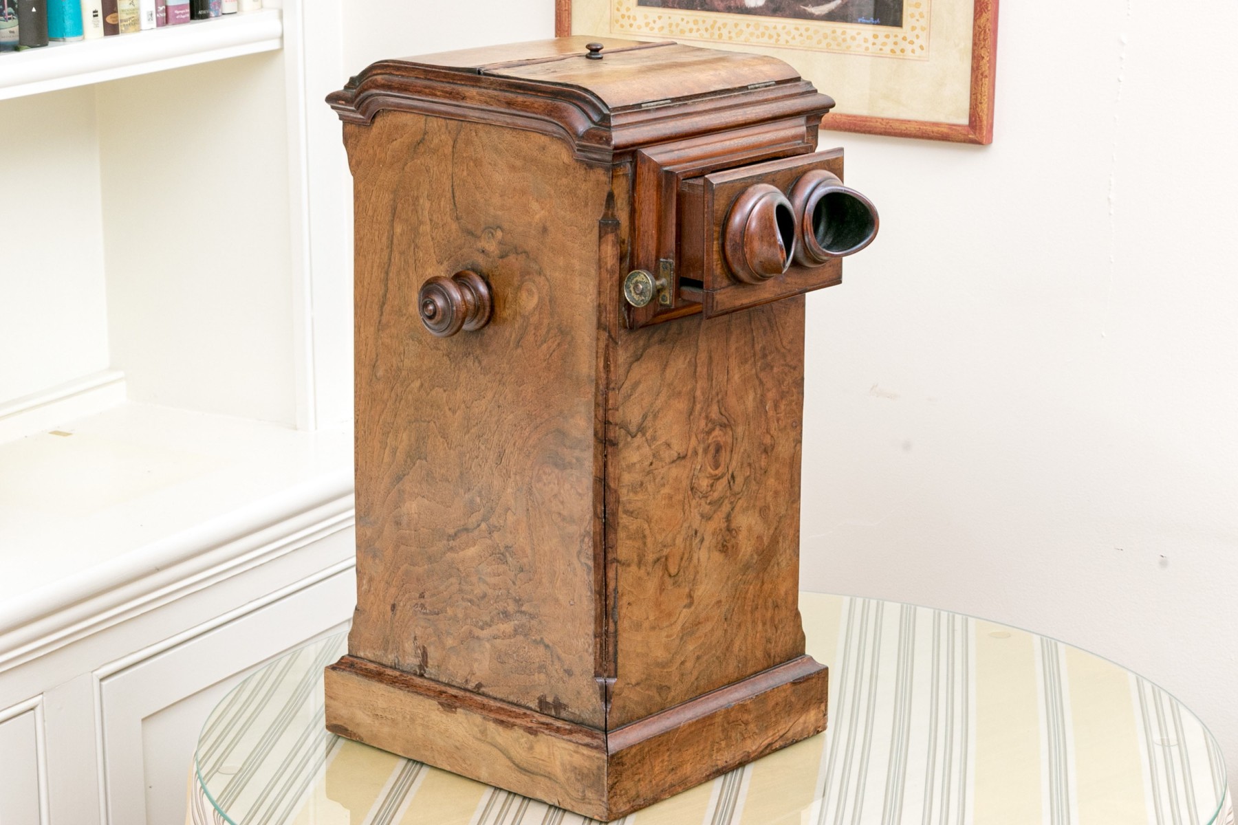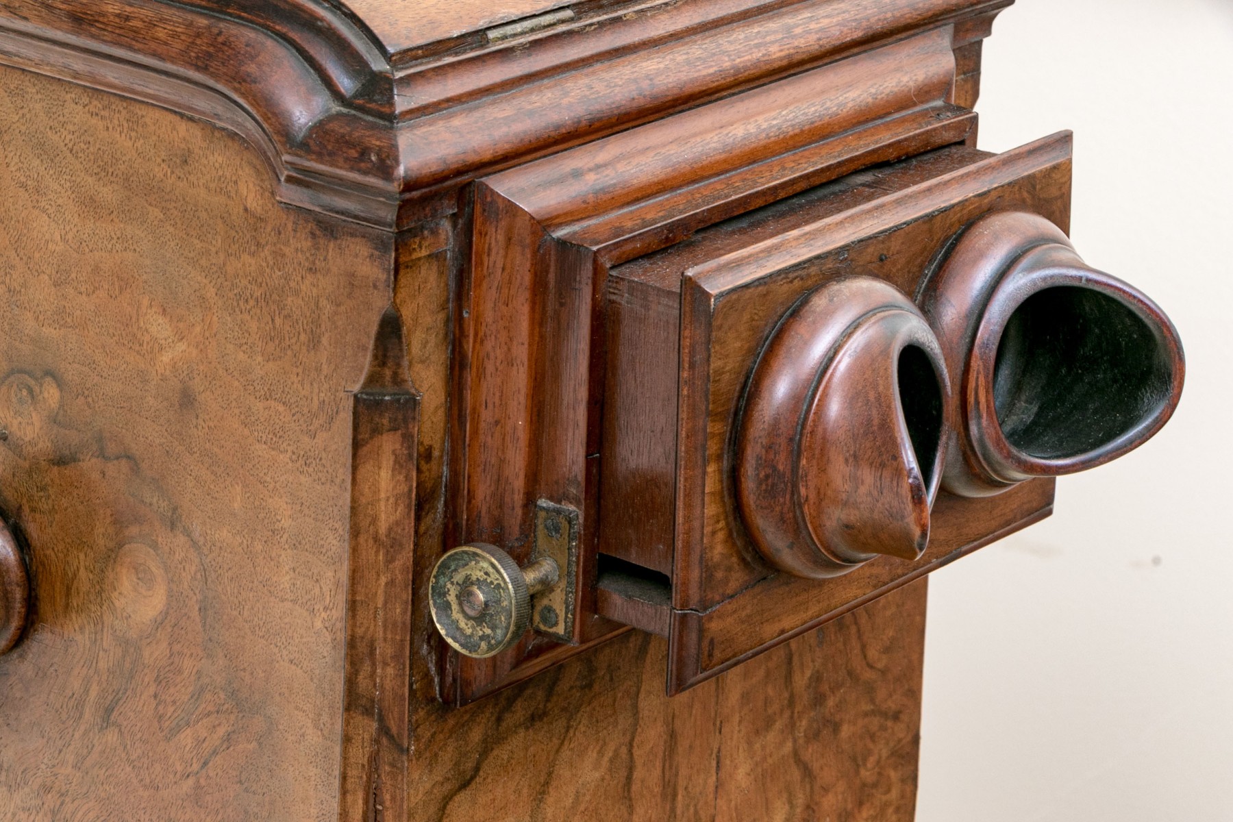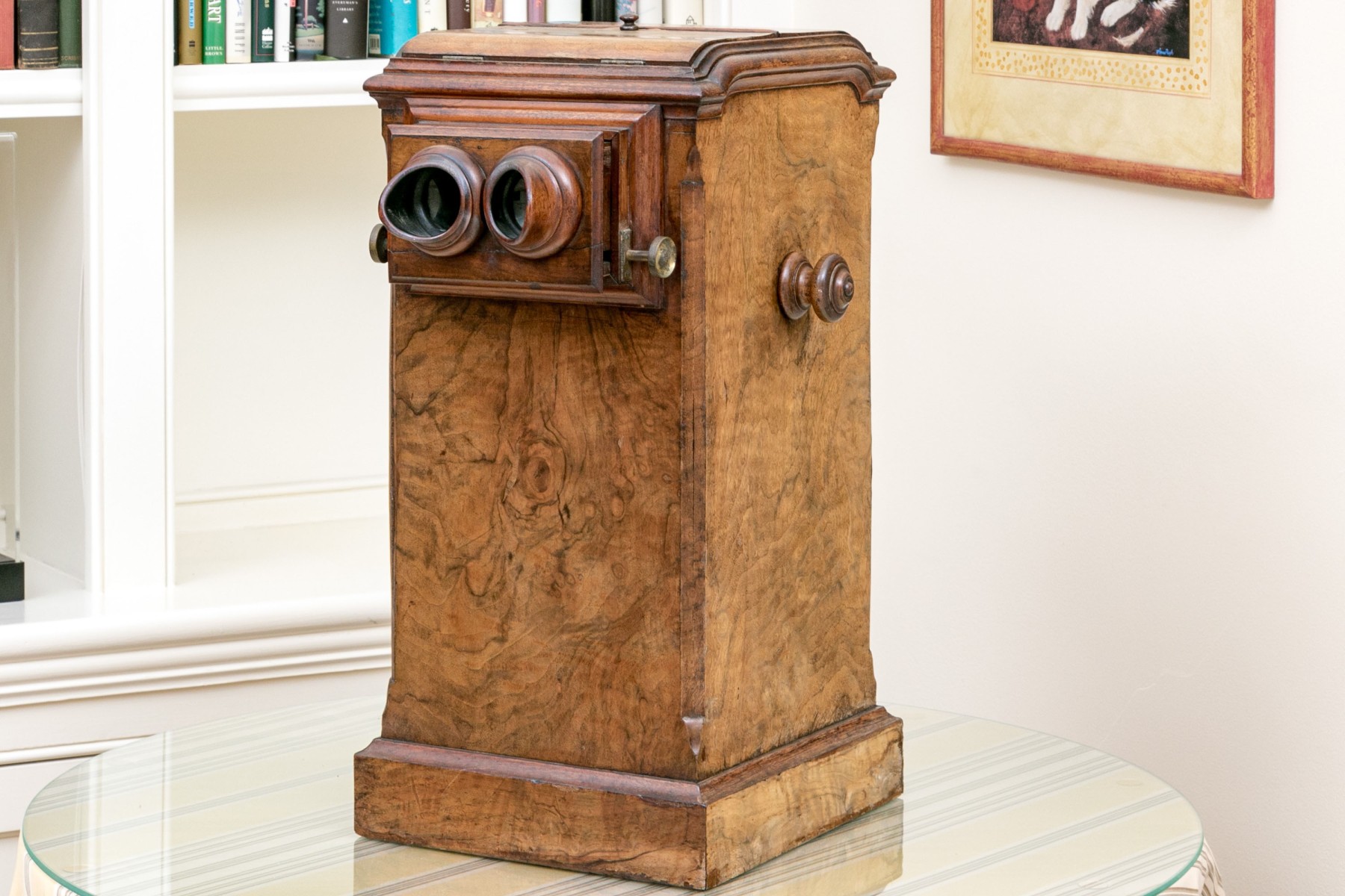 A fabulous antique tabletop stereoscopic viewer beautifully veneered in honeyed medium-light brown wood.