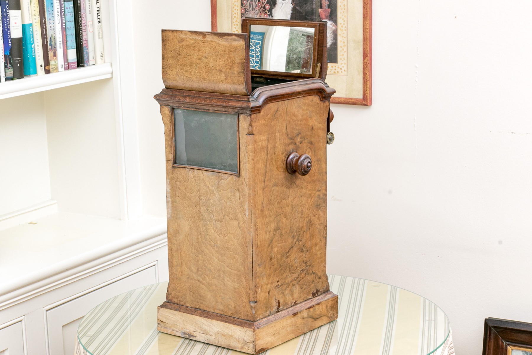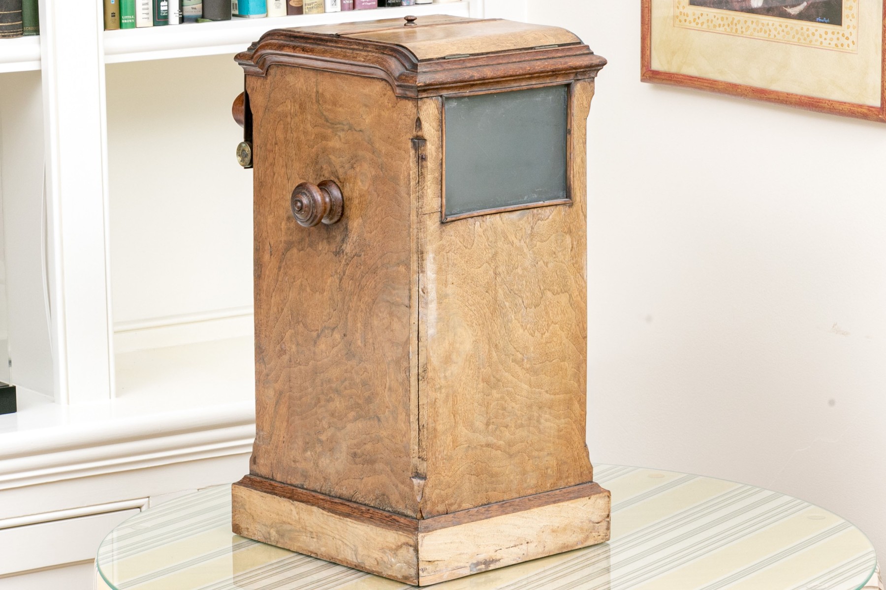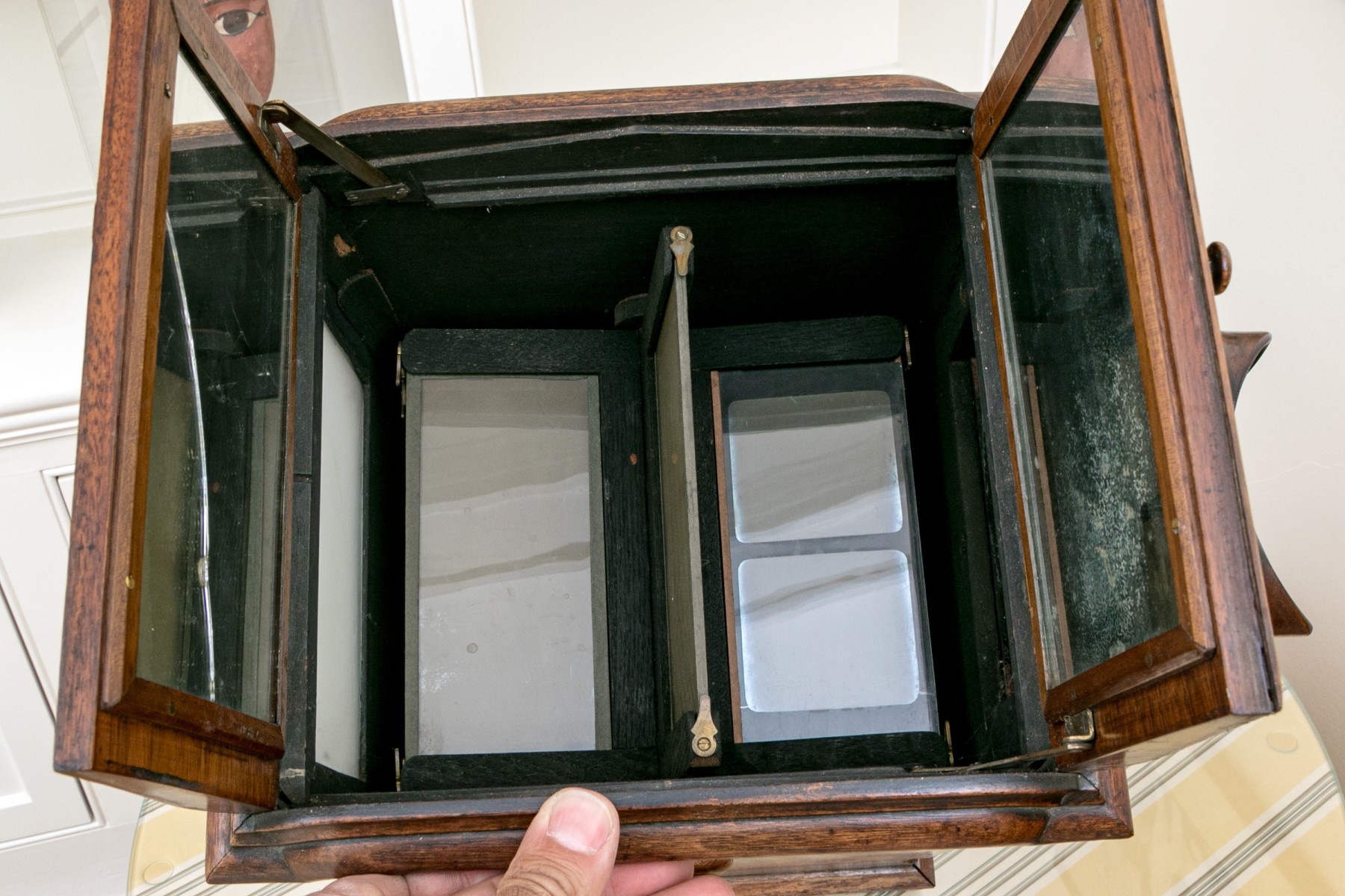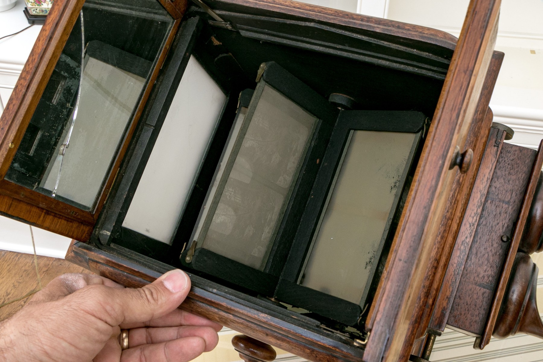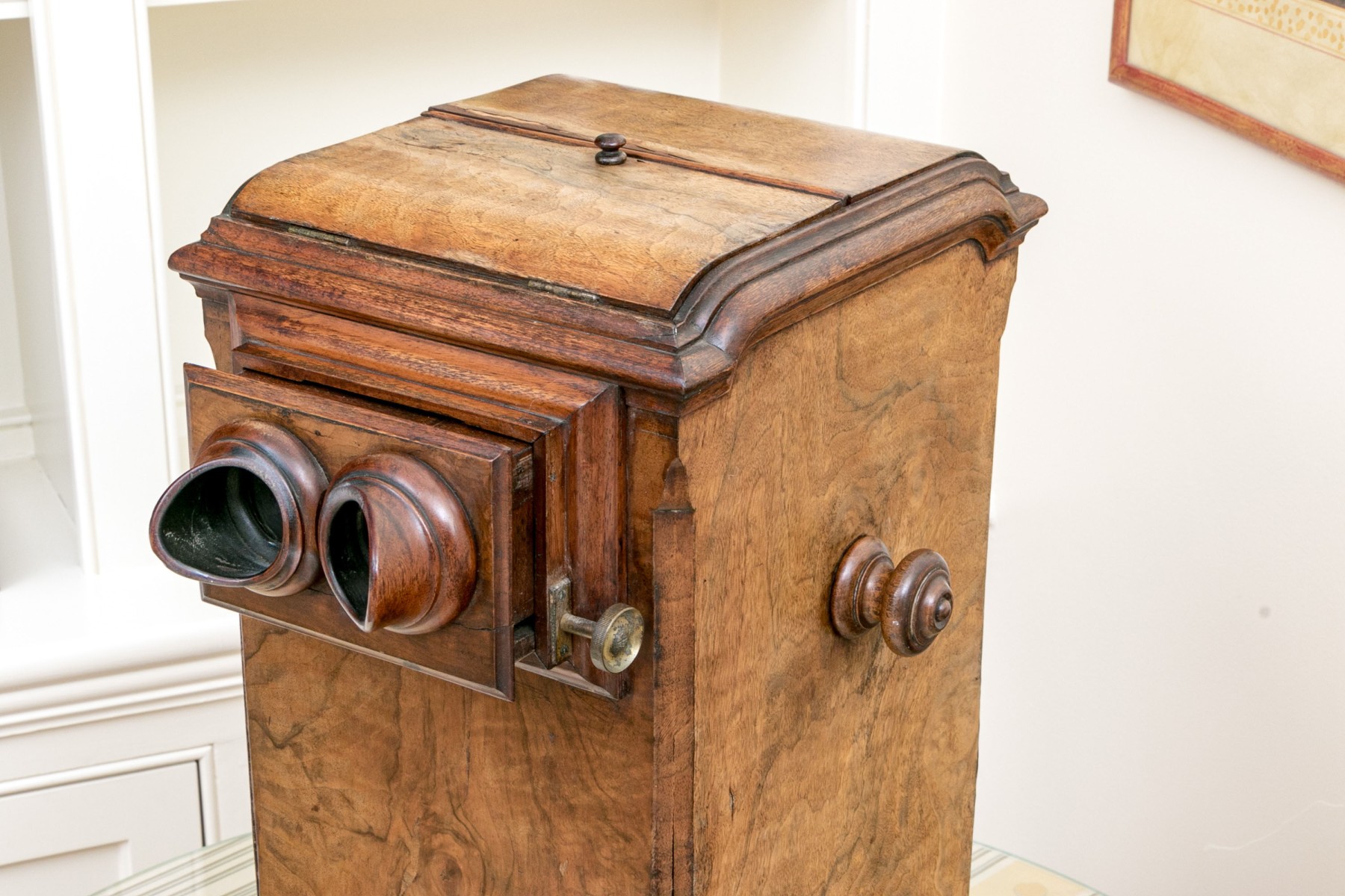 A fabulous antique tabletop stereoscopic viewer beautifully veneered in honeyed medium-light brown wood.