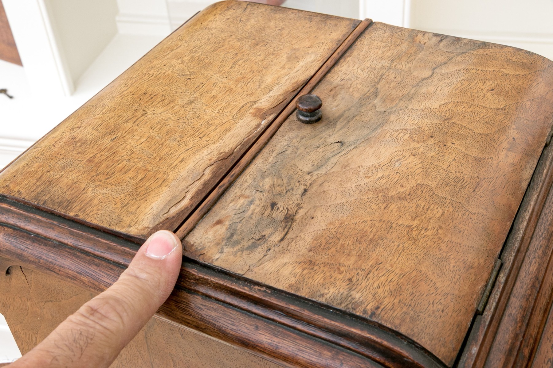 With wear commensurate with age including surface scratches, scuffs, nicks, finish wear, checking, and veneer losses. One of the mirrors is cracked. Please review the pictures as they are a part of the condition report.