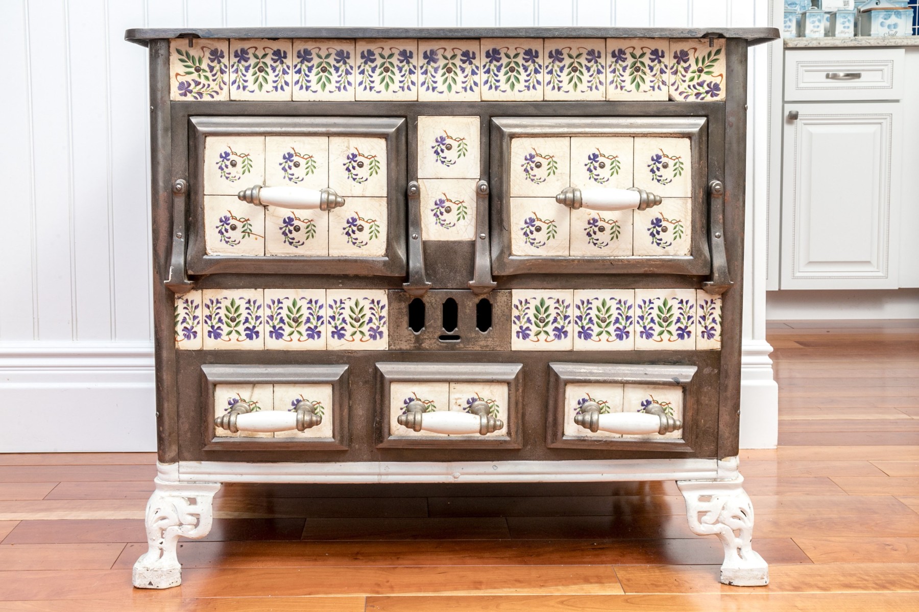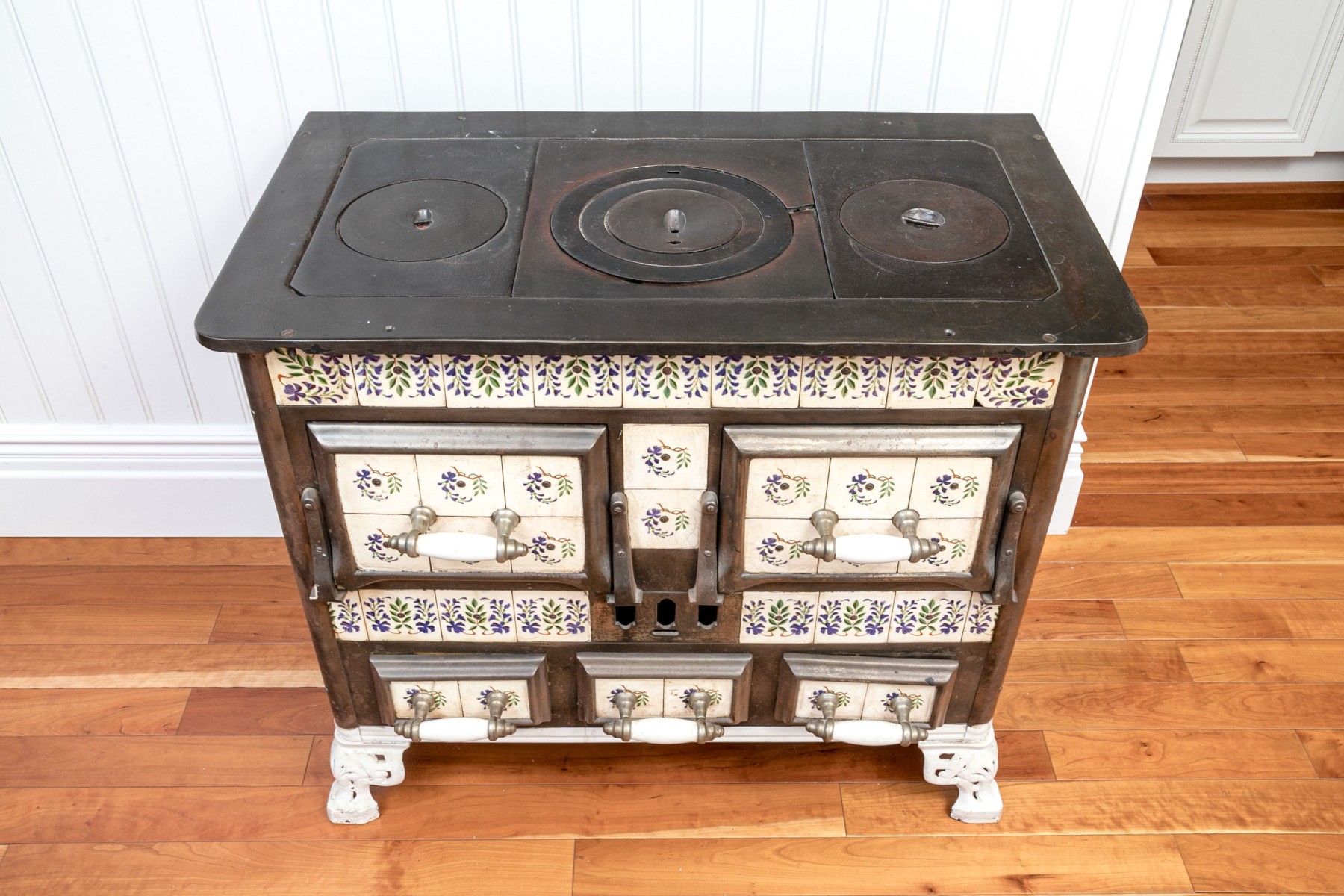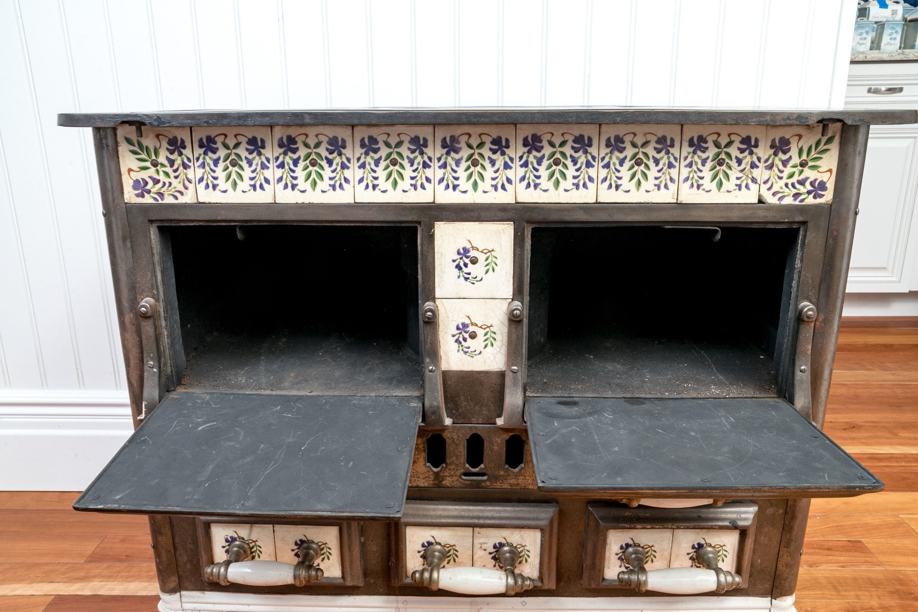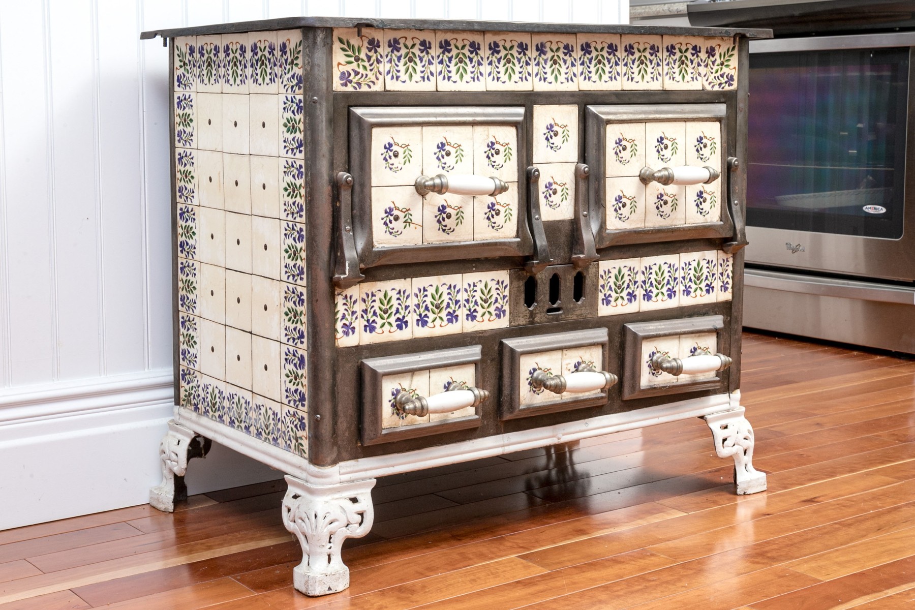 tile encrusted stove with cast iron and steel frame beautiful ornate pierced shell feet.