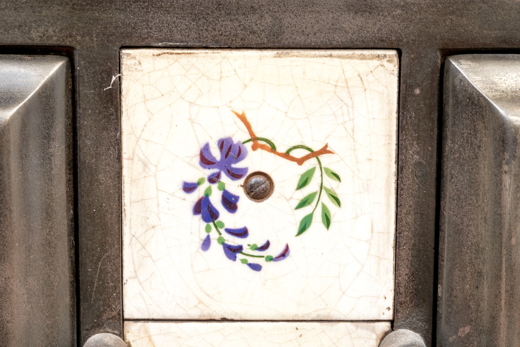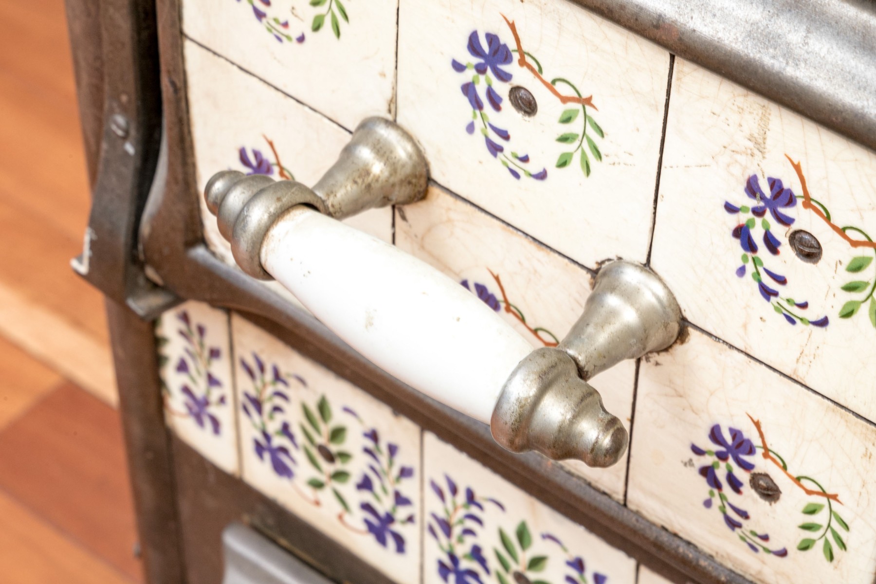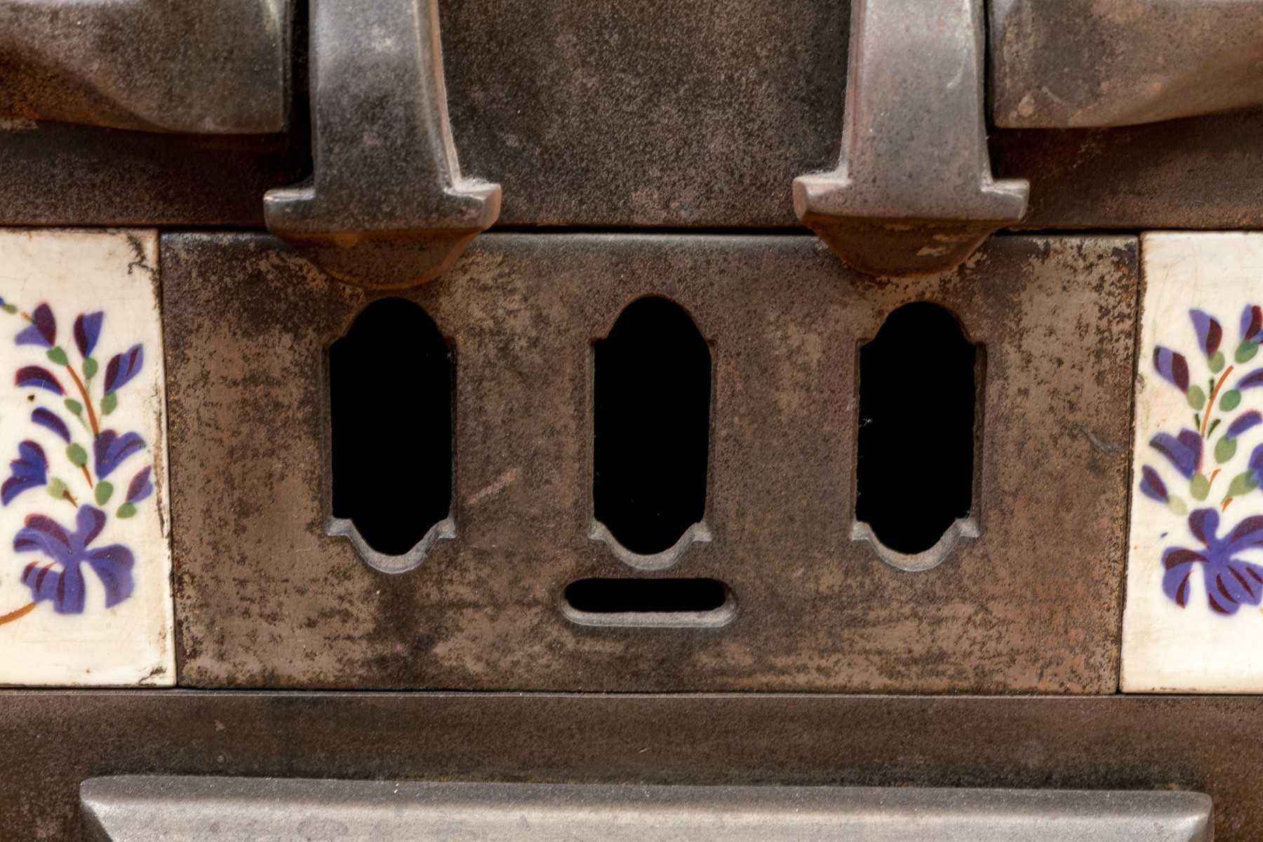 tile encrusted stove with cast iron and steel frame beautiful ornate pierced shell feet.