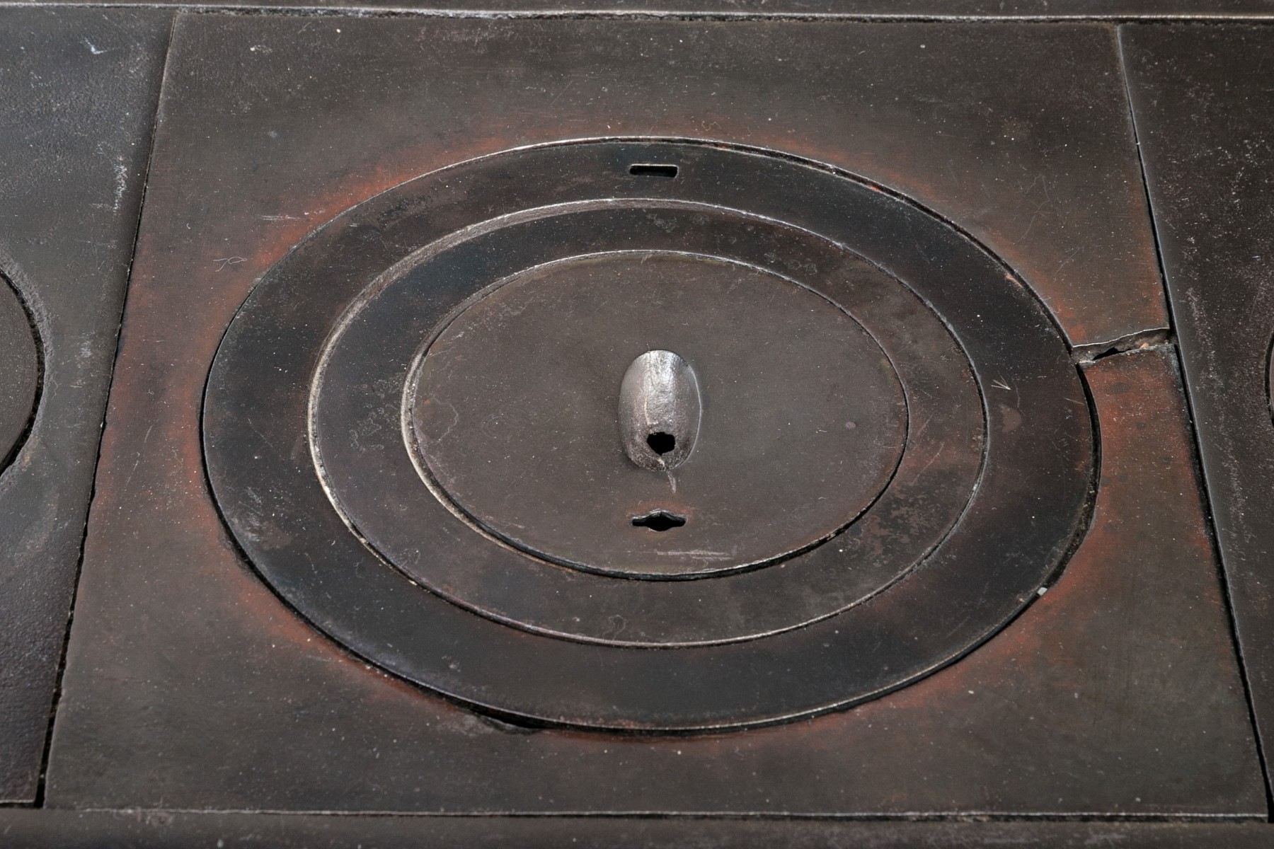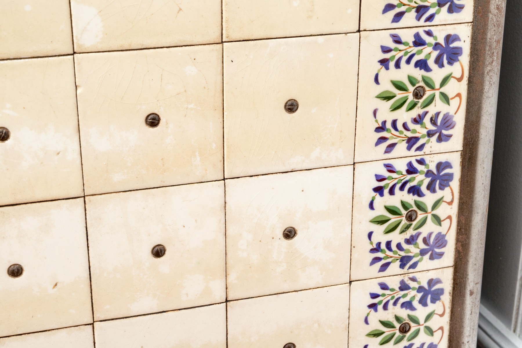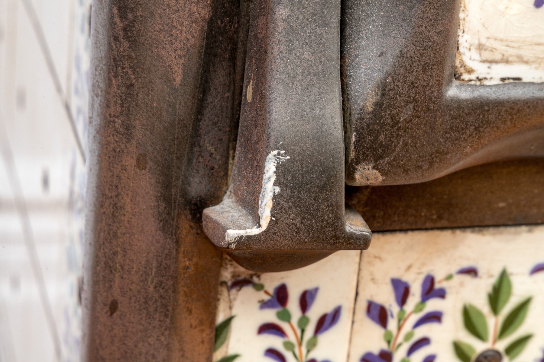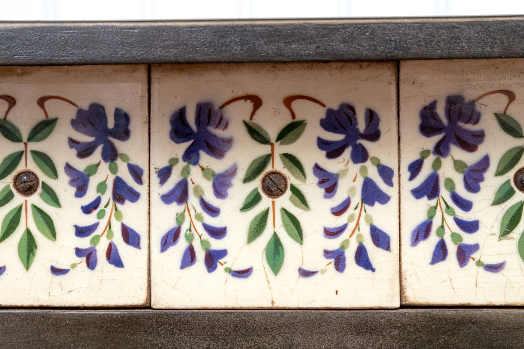 tile encrusted stove with cast iron and steel frame beautiful ornate pierced shell feet.