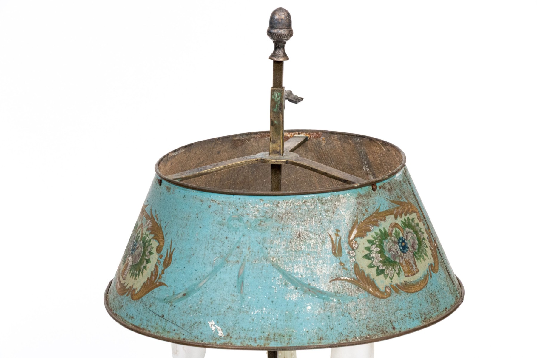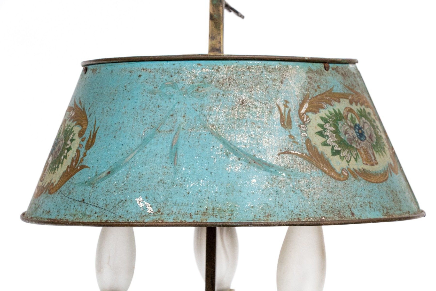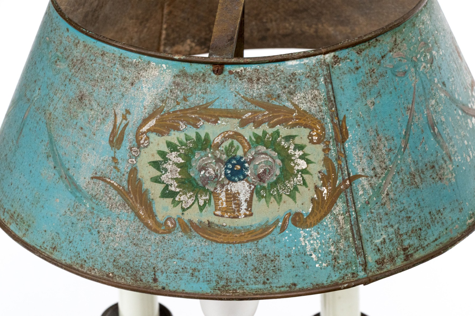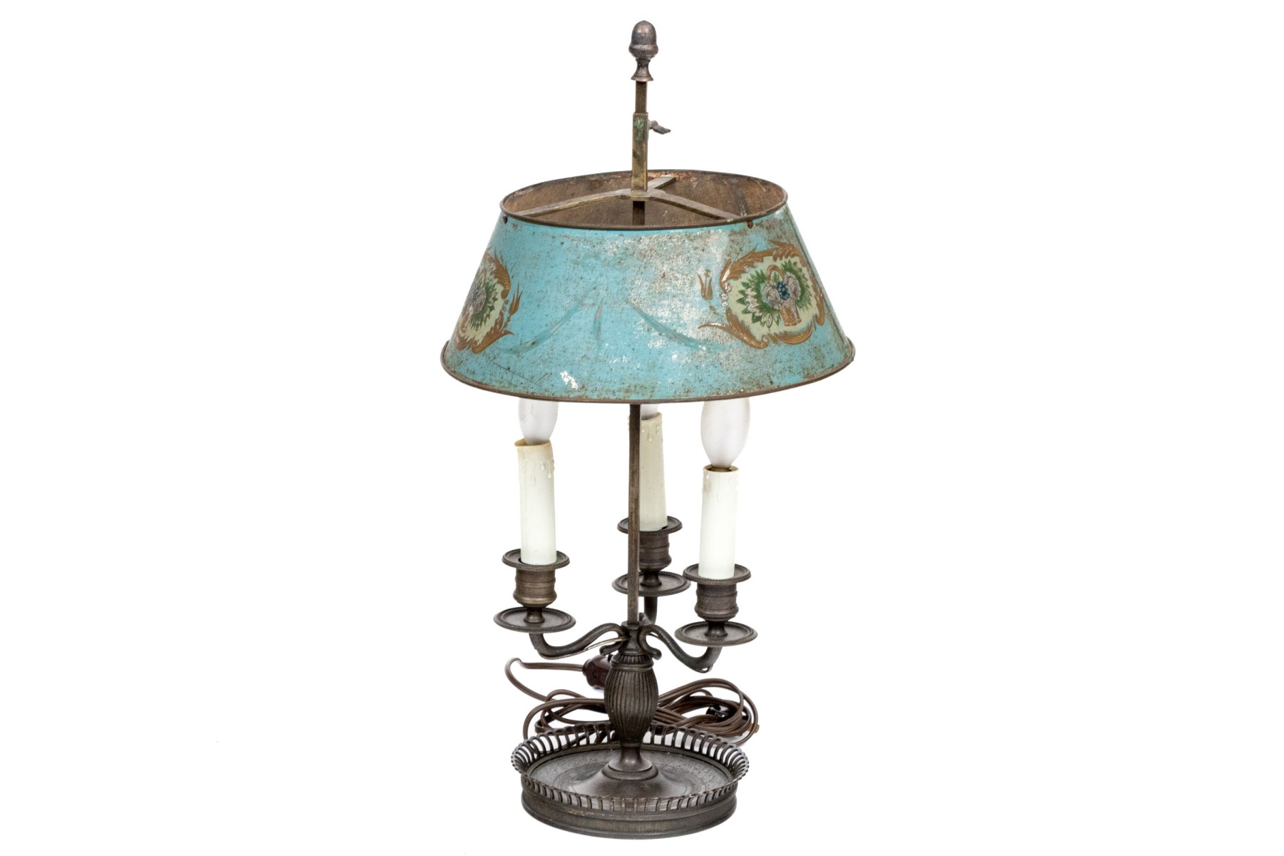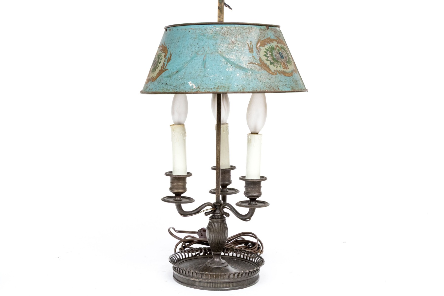 A wonderful antique bouillotte lamp electrified with three white candle sockets on curved arms under a sky blue tole empire shade painted with oval medallions of flower baskets surrounded by gilt foliate flourishes. The candle arms surround a ribbed ovoid column over a circular based with a flared and pieced gallery.