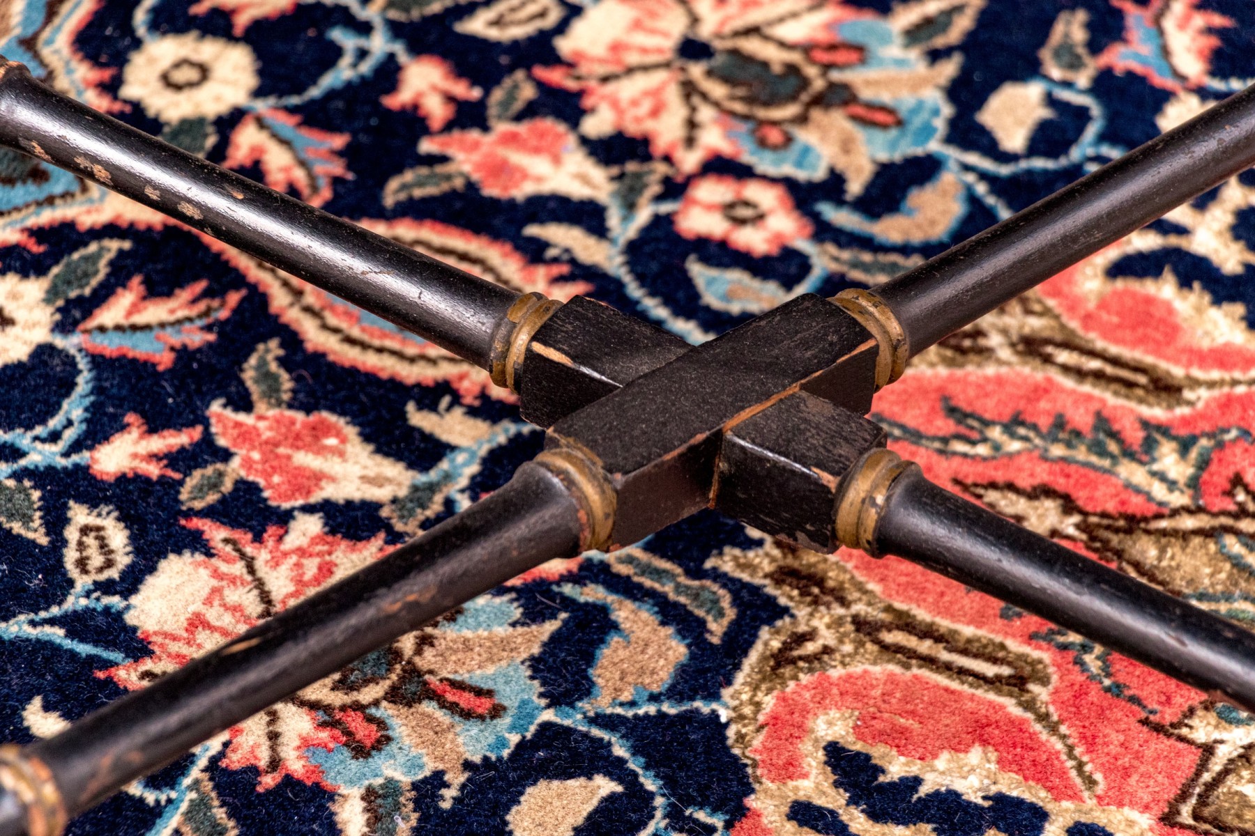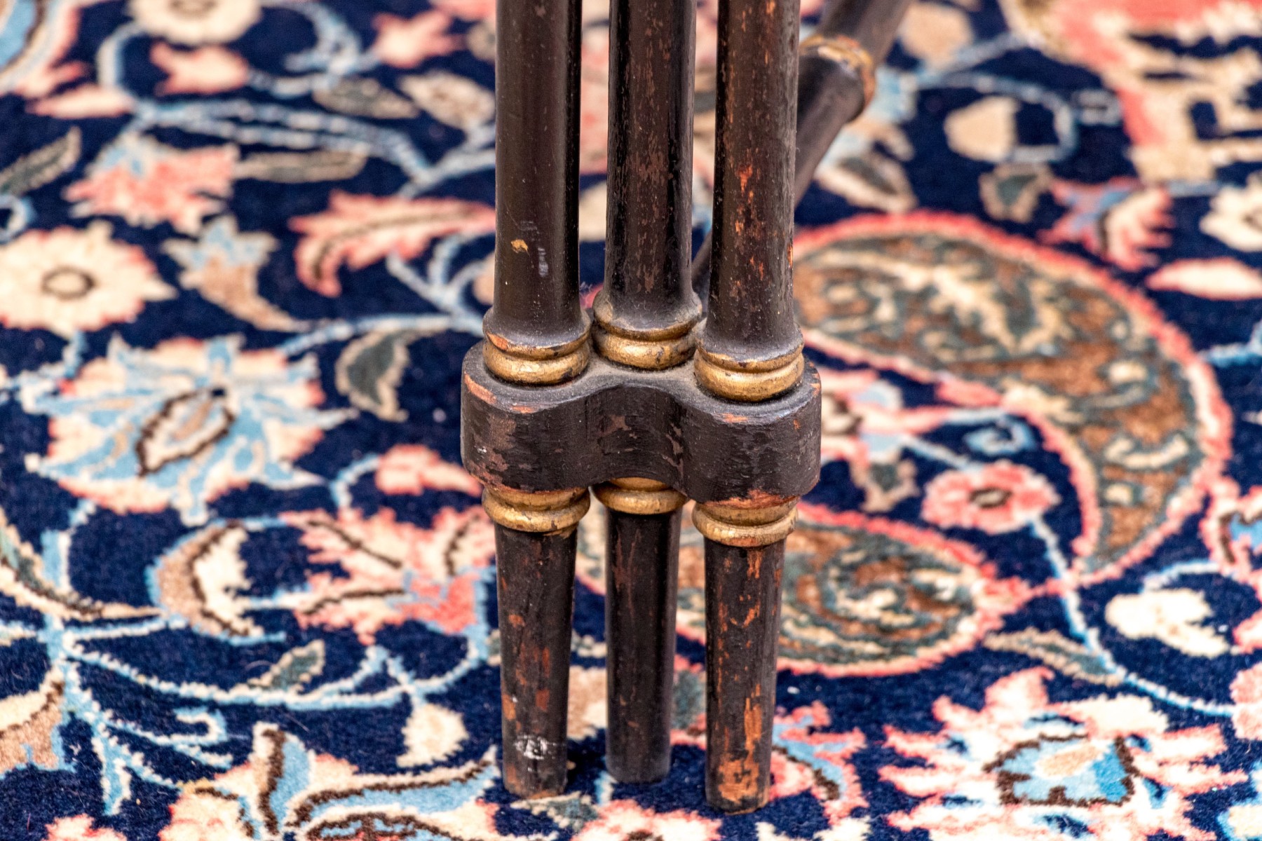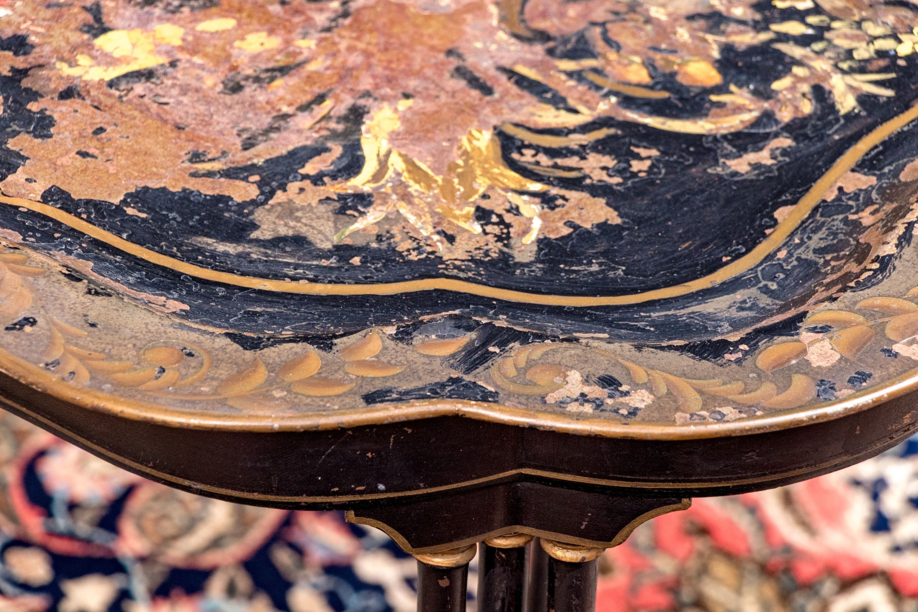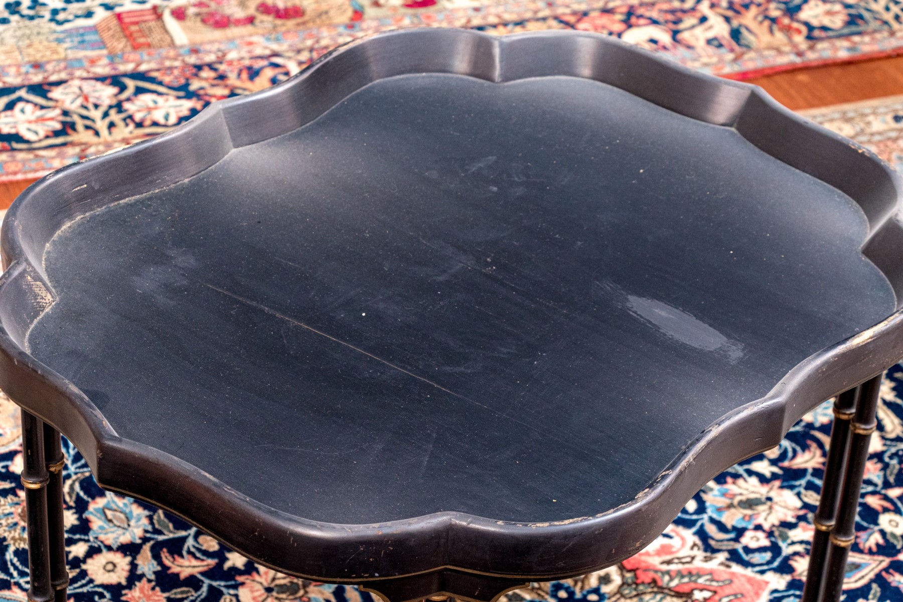 A lovely accent table with great chinoiserie charm showcasing a black tole tray with gilt borders and large floral flourishes set atop an ebonized stand with gilt banded accents creating a faux bamboo appearance. legs feature trios of dowels meeting at an X-stretcher support.