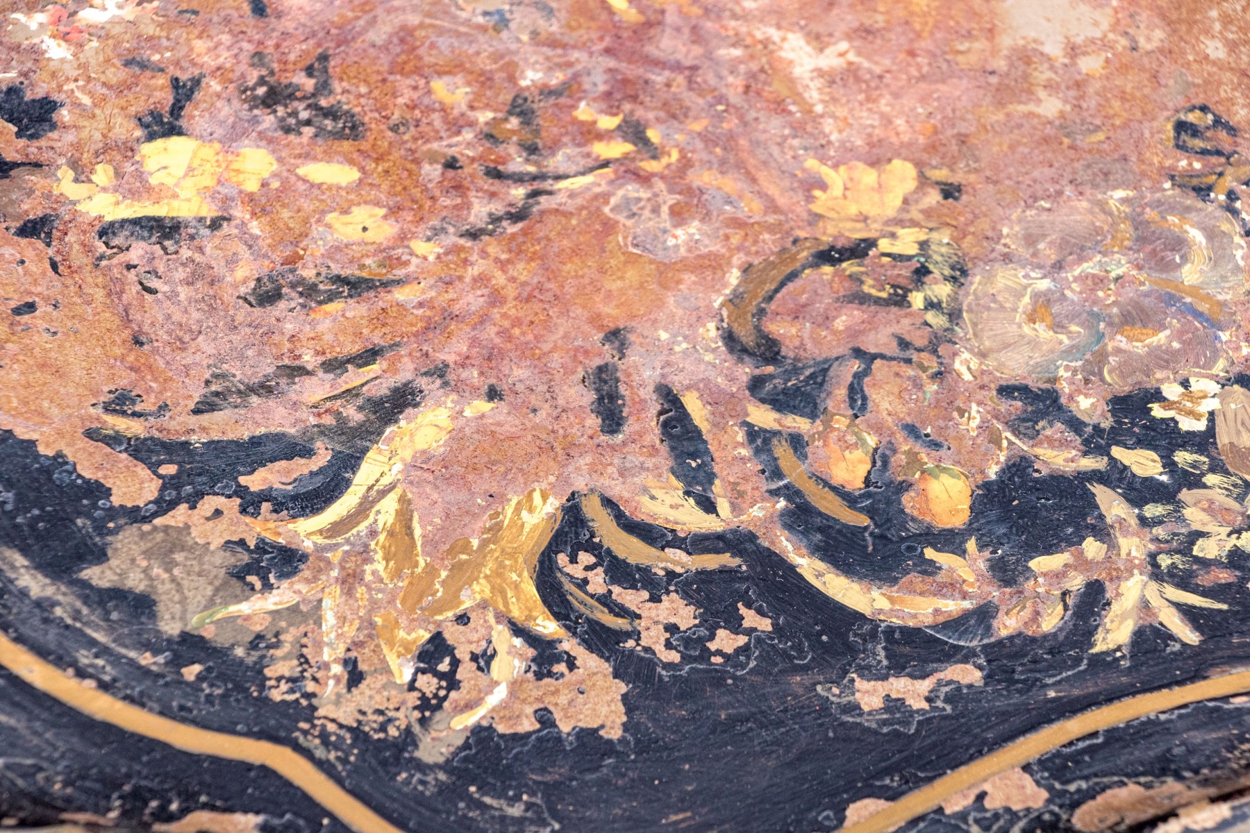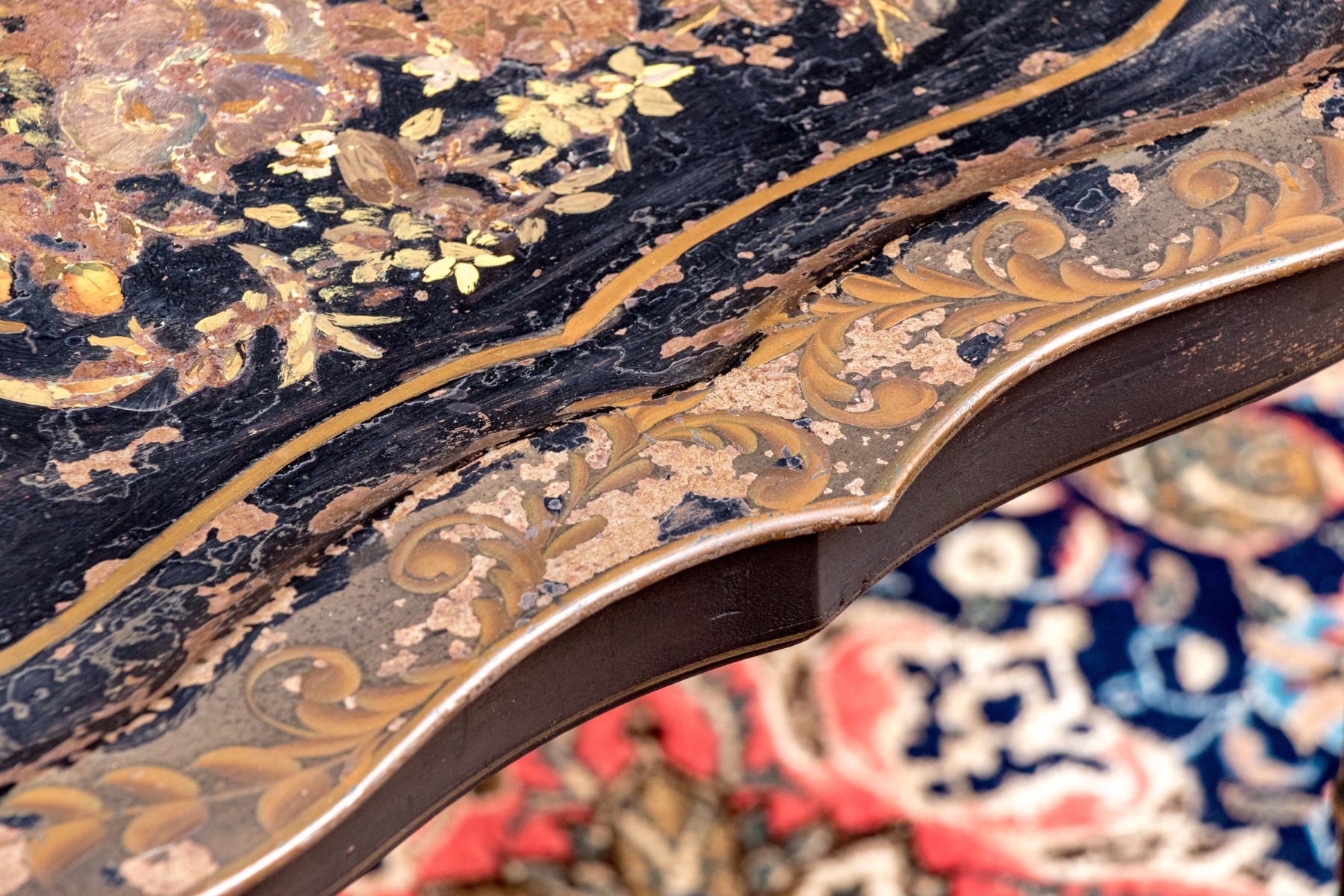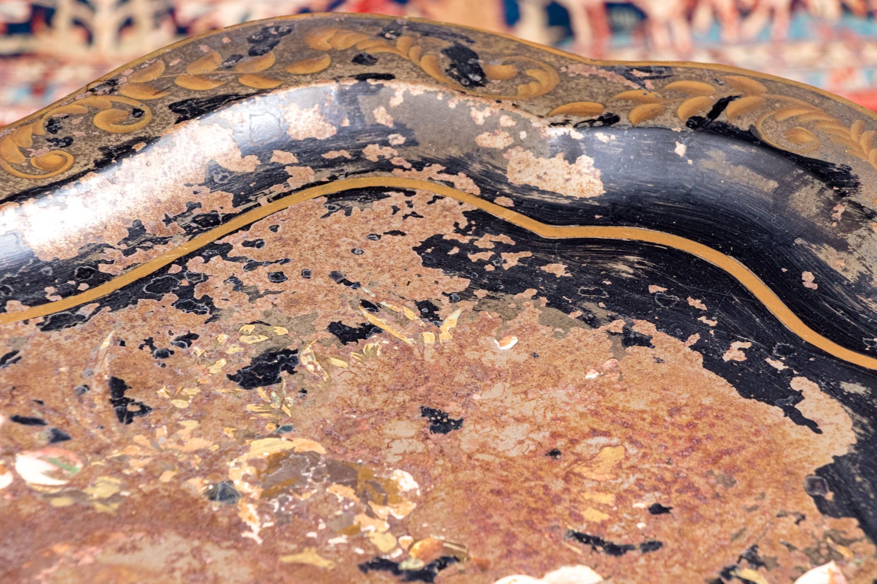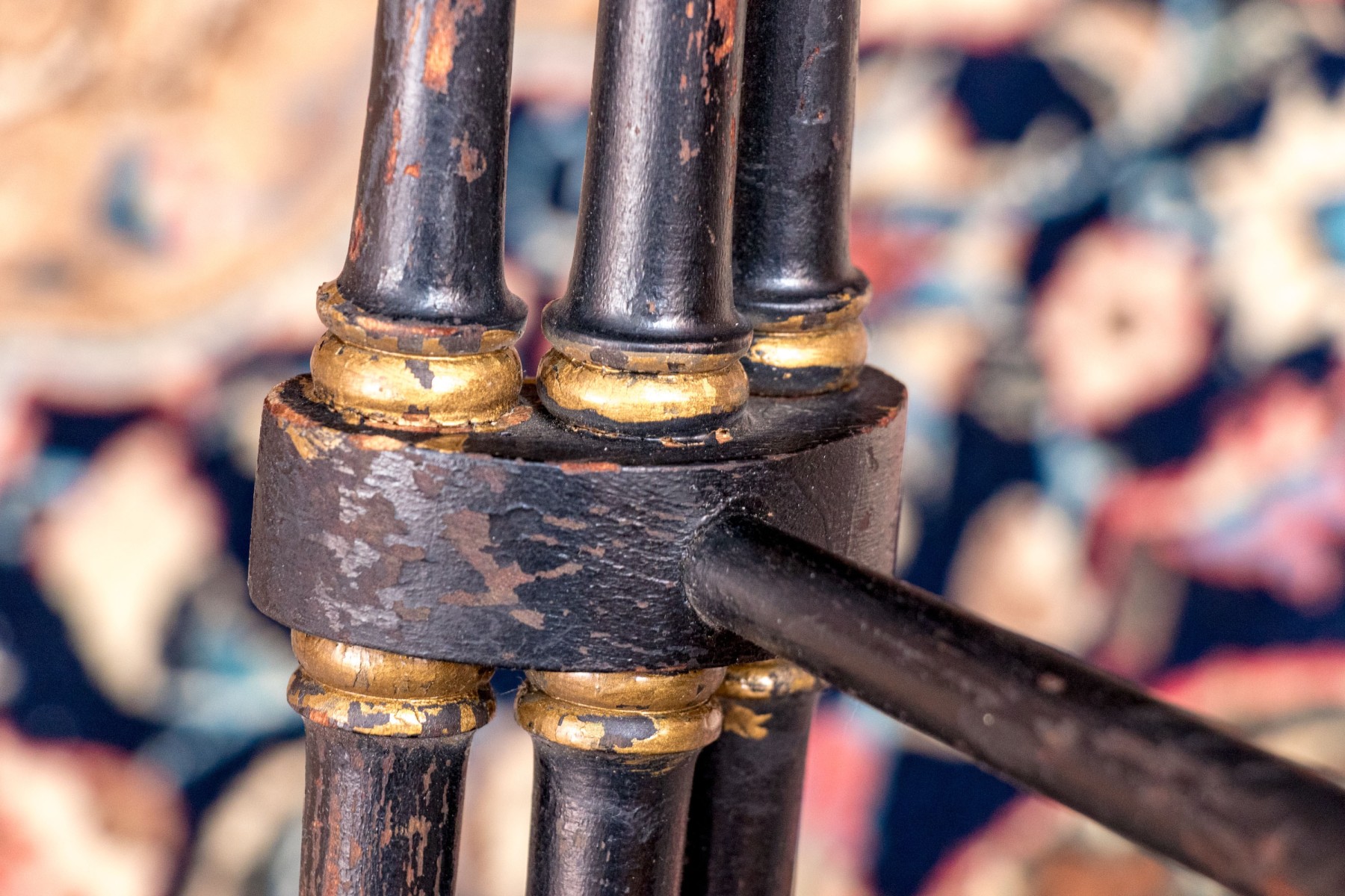 A lovely accent table with great chinoiserie charm showcasing a black tole tray with gilt borders and large floral flourishes set atop an ebonized stand with gilt banded accents creating a faux bamboo appearance. legs feature trios of dowels meeting at an X-stretcher support.