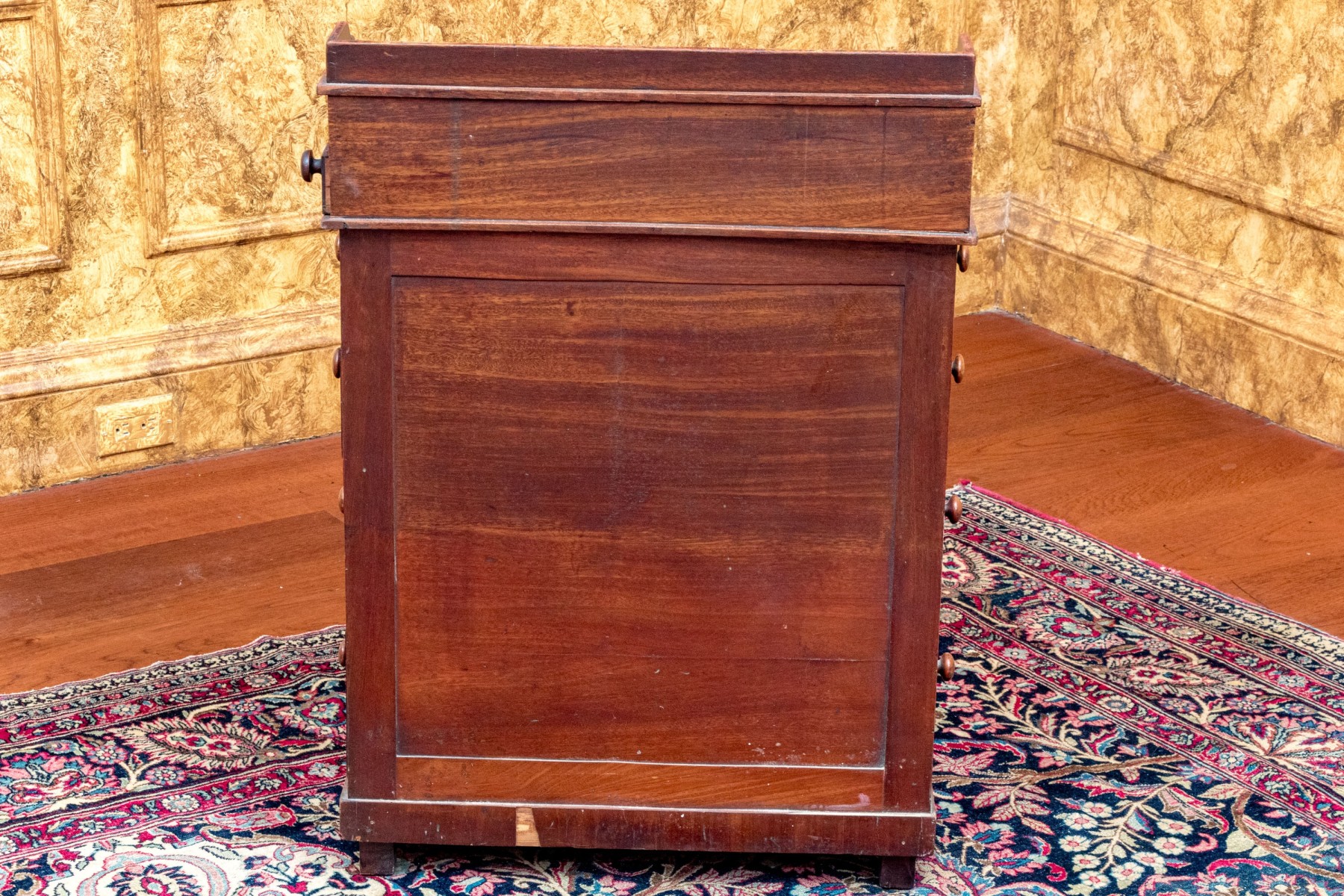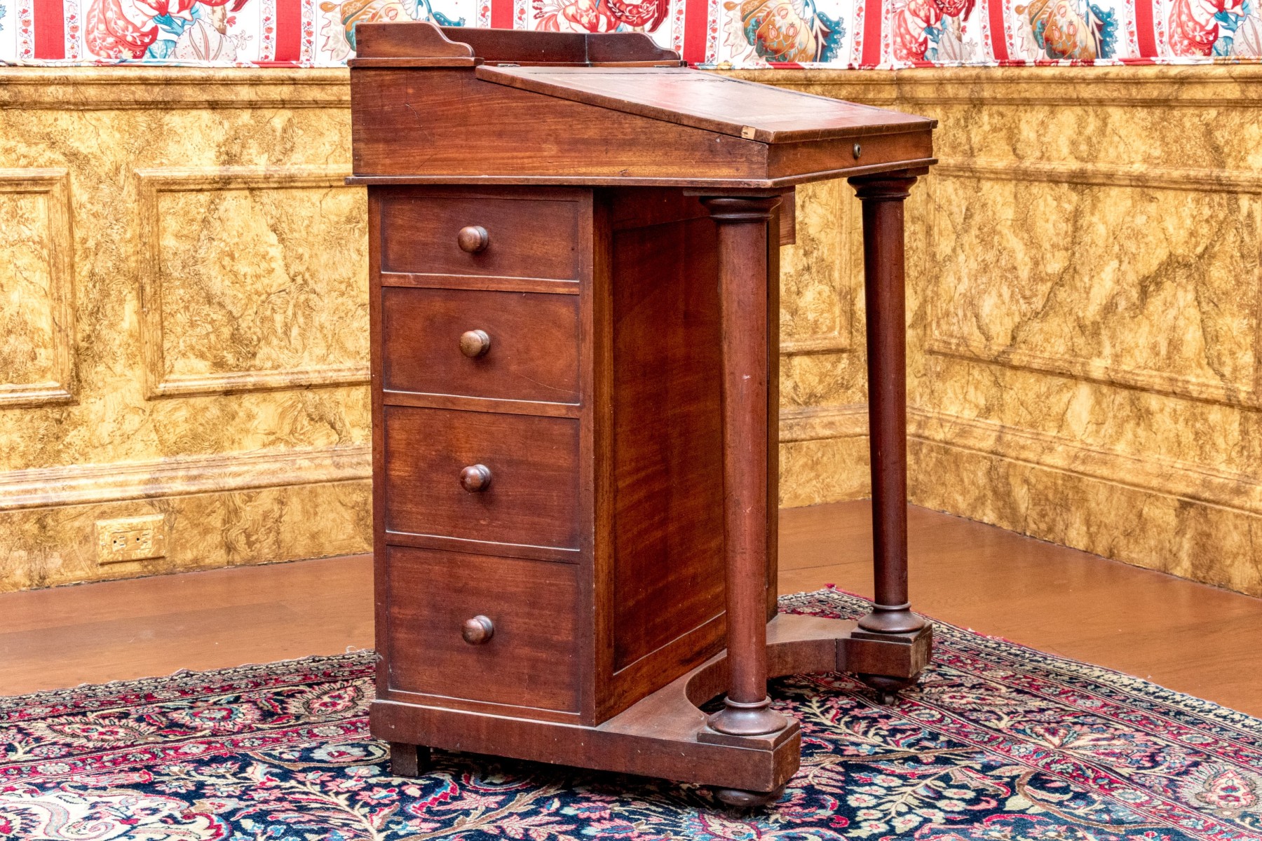 A wonderful antique Davenport desk with a classic lectern profile in gorgeous red-brown wood, designed with a three-quarter gallery leading to a hinged slant front writing surface inlaid with brown leather and finely tooled around the borders with foliage scrolls. The slant top opens to spacious storage room within, overhanging two cylindrical columns leading to a concave curved base on stout feet. The side of the body sports a small drawer at the top and four graduating drawers below, all adorned with circular wood knobs.