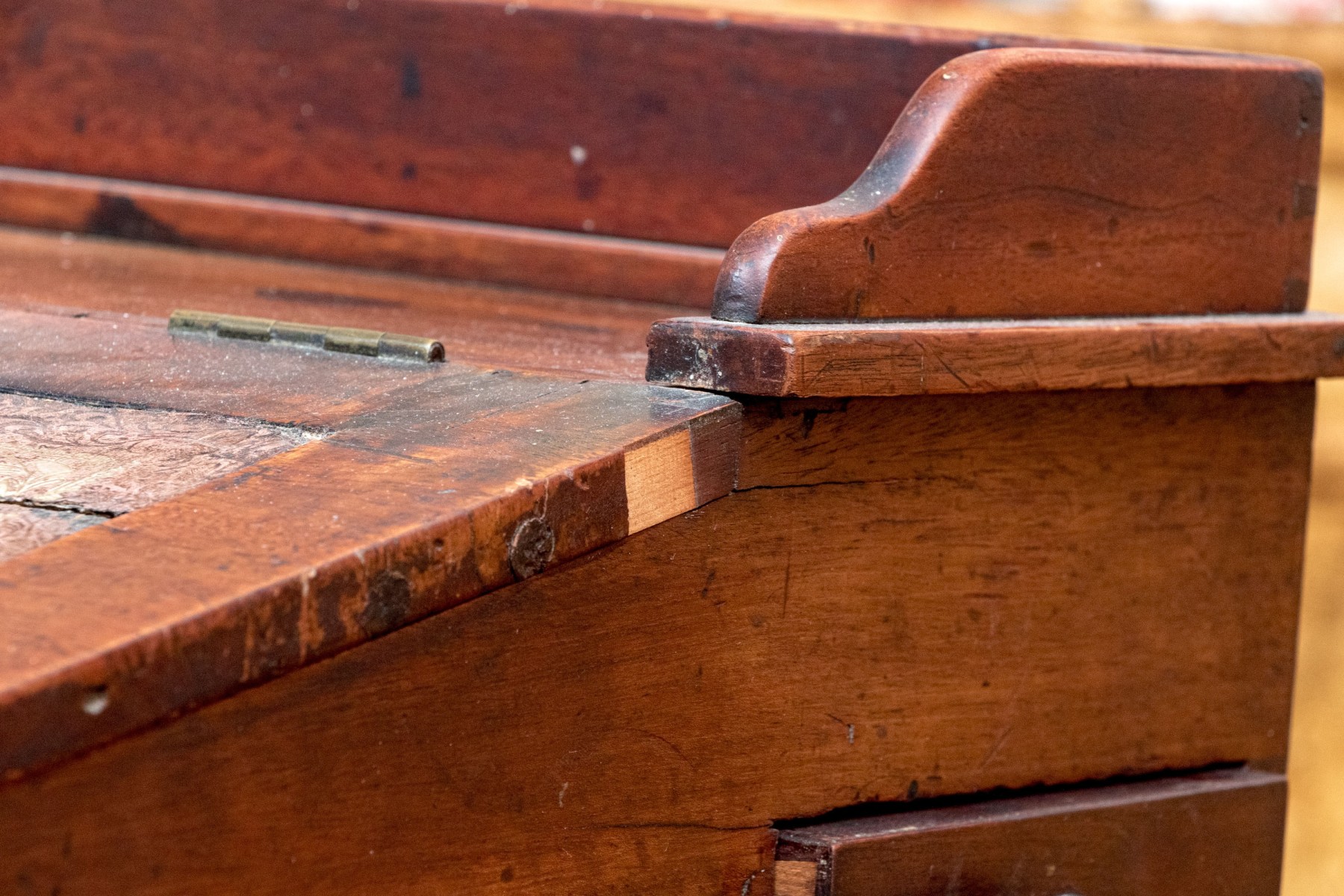 Four drawers on the right side of the desk. Slant front leather tooled top hinges open with storage inside.