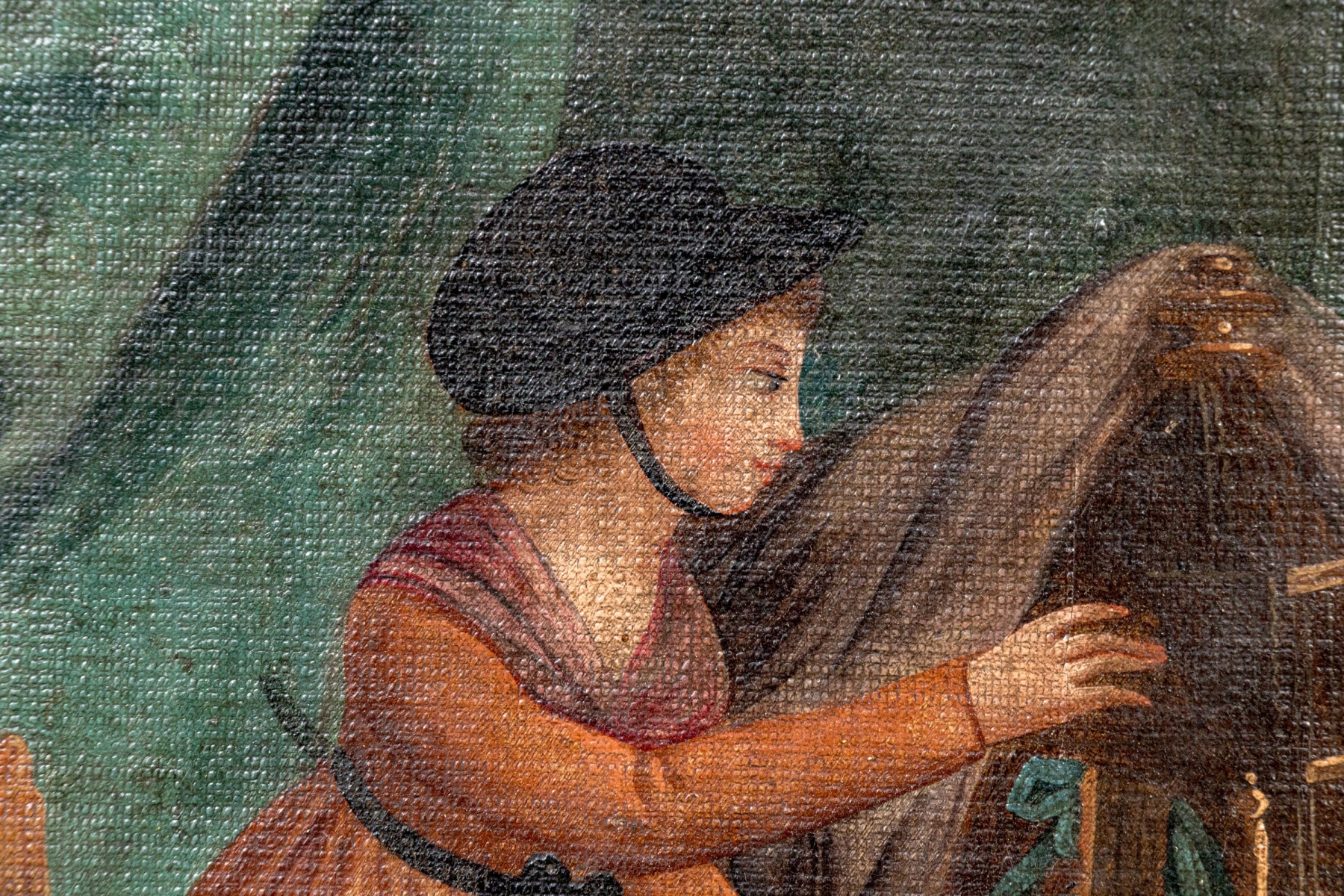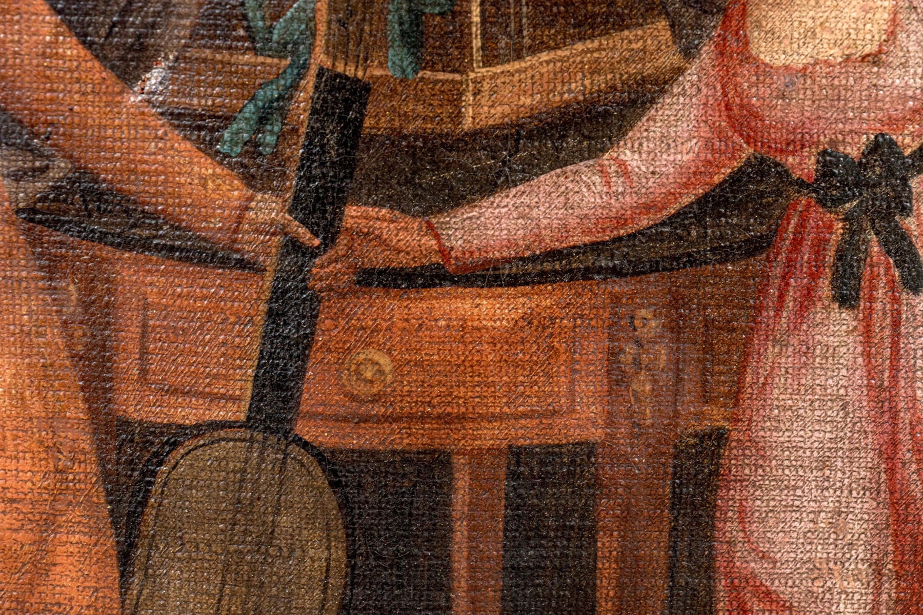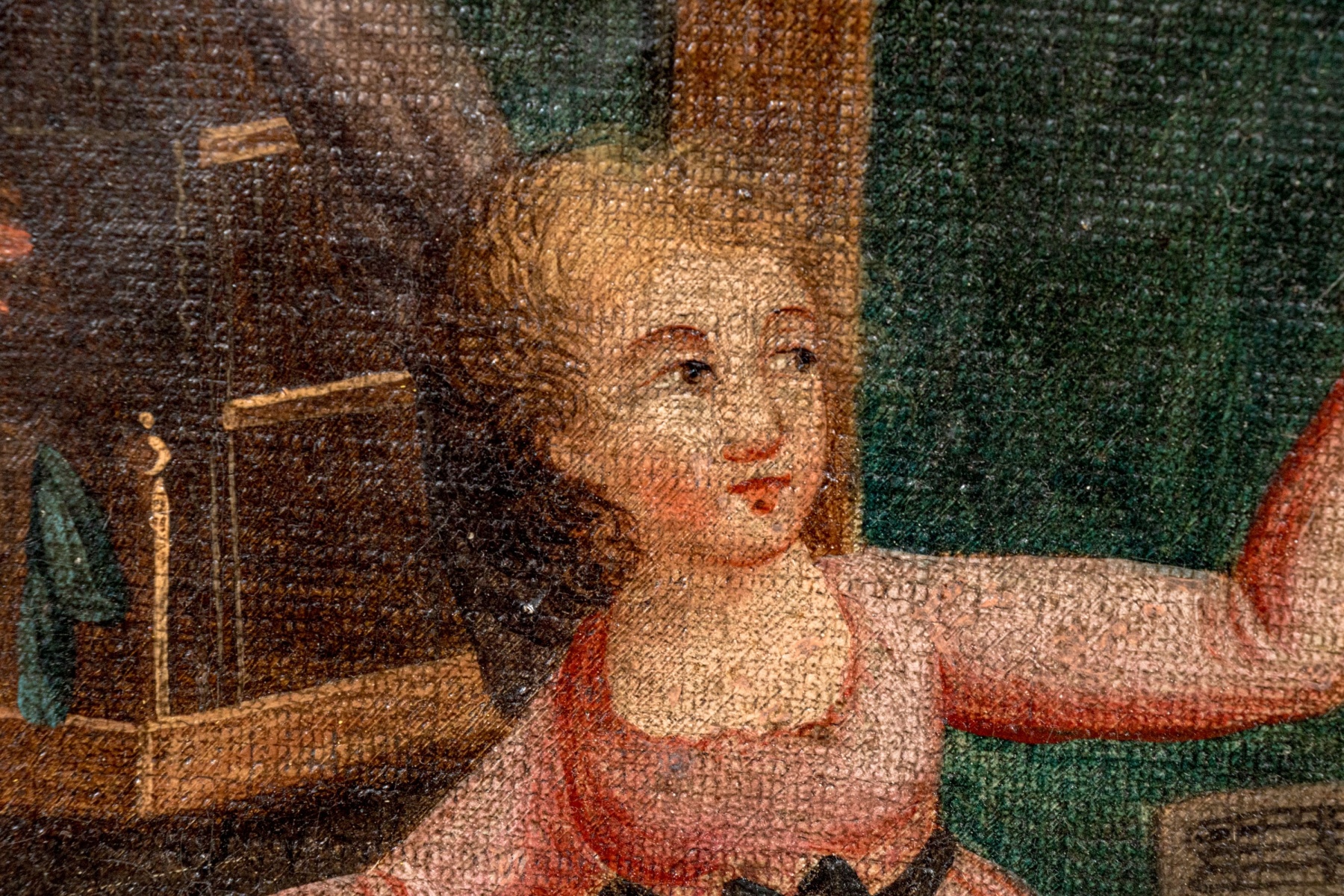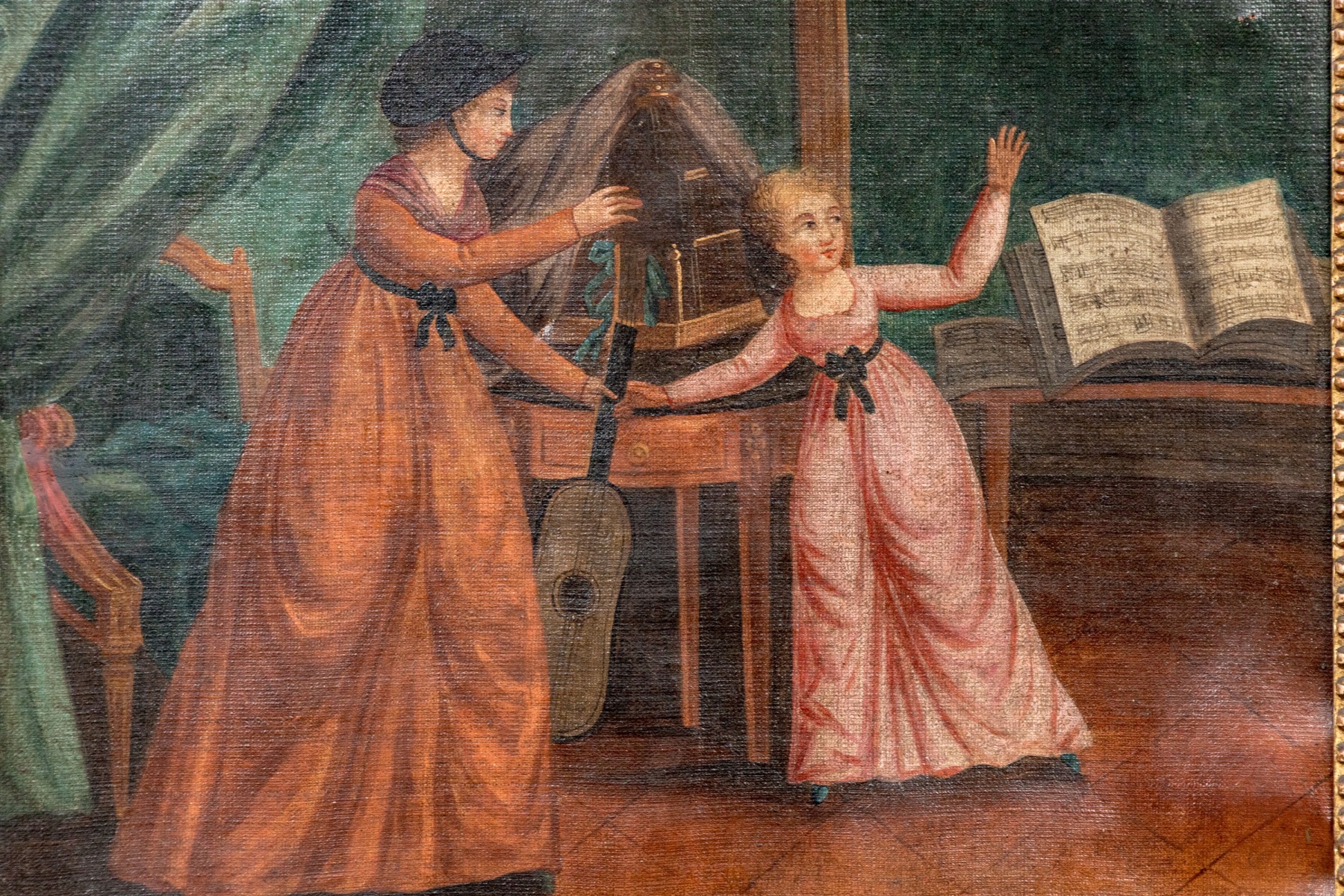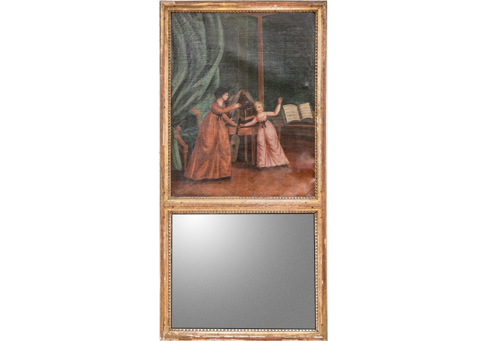 A fabulous antique trumeau mirror showcasing a rectangular mirror plate beneath a larger oil painting on canvas depicting a scene of a governess in orange-red teaching music to a young girl in pink music within an elegant interior. Both displayed in a gilt frame with beaded trims.