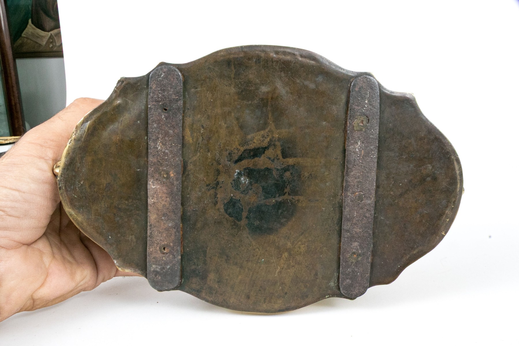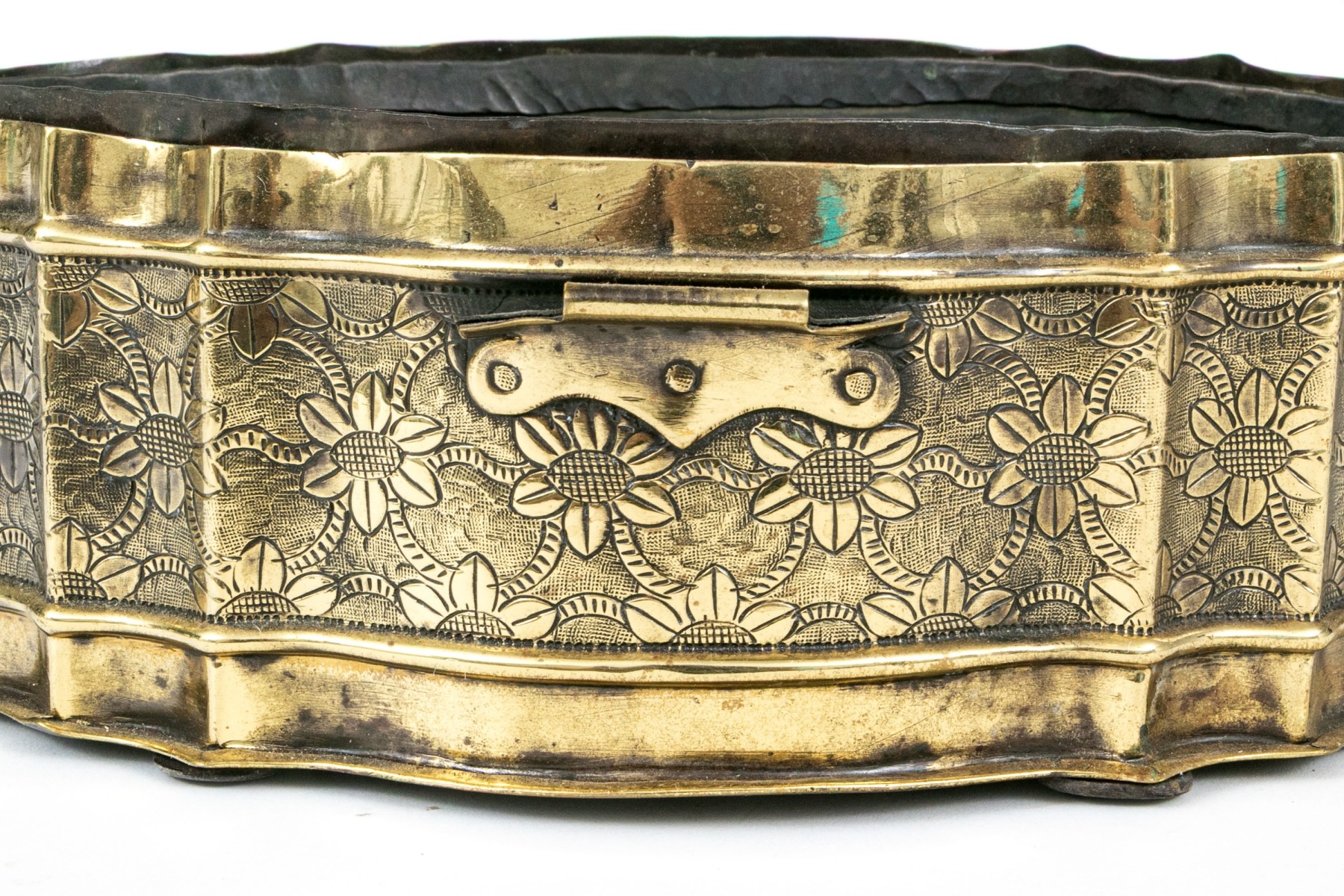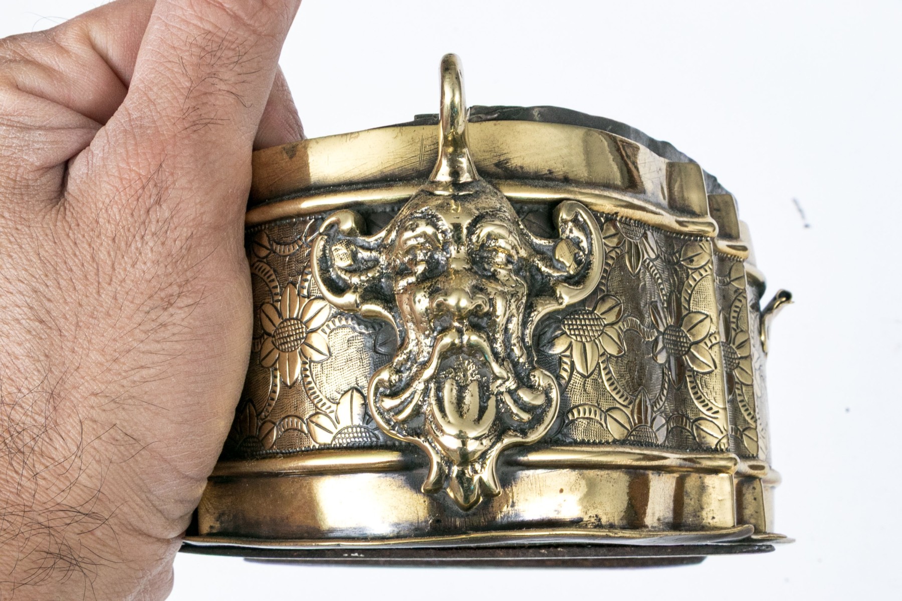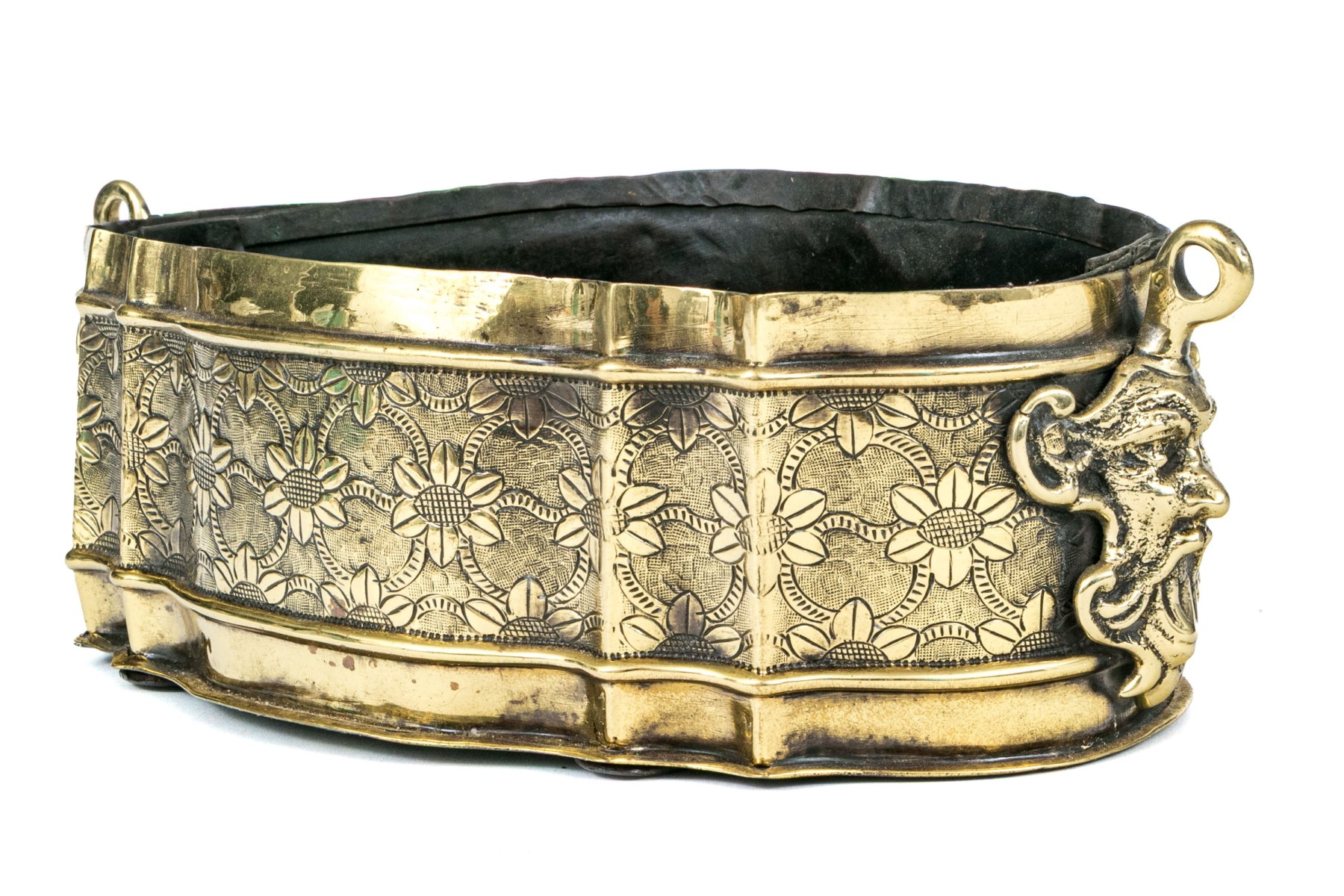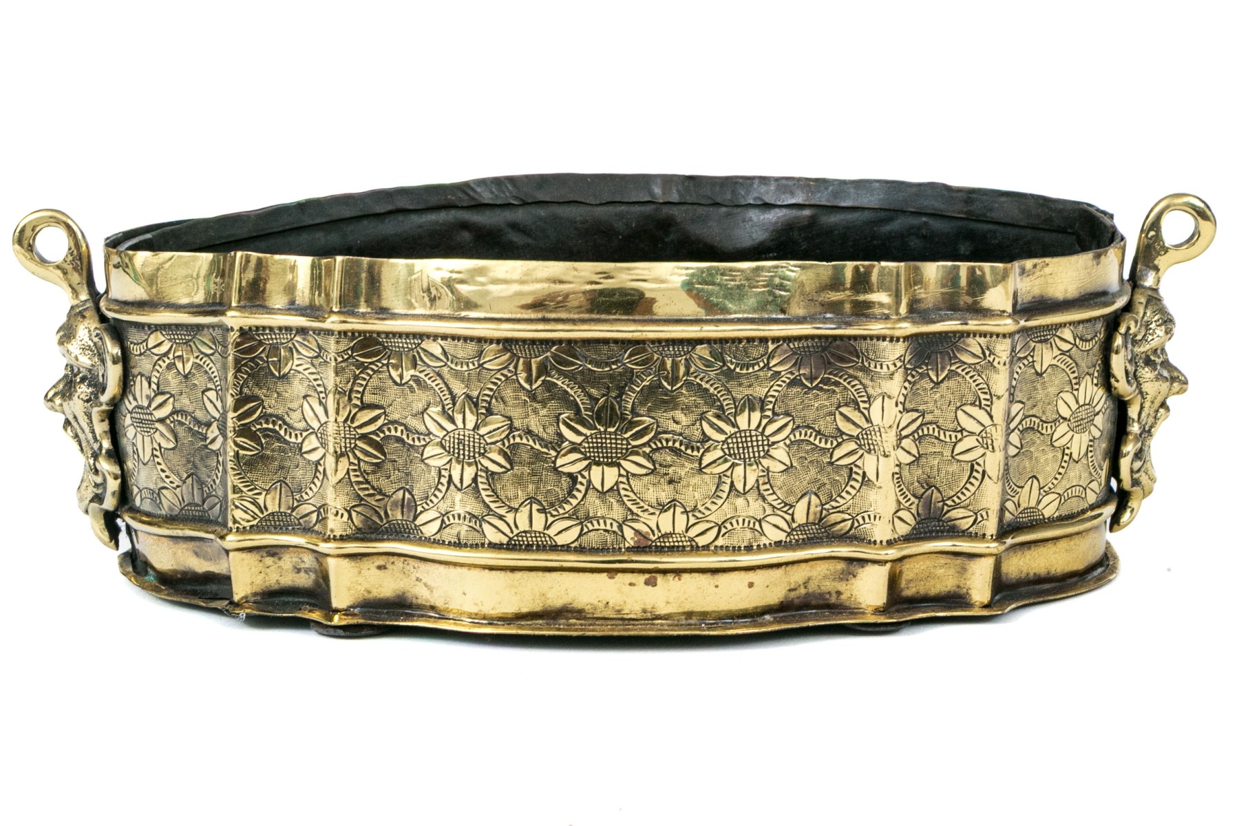 A charming brass jardiniere in shaped oval form, detailed with a wide band of flower and rope motif lattices flanked by face motif twin handles at either end. Fitted with a liner within.