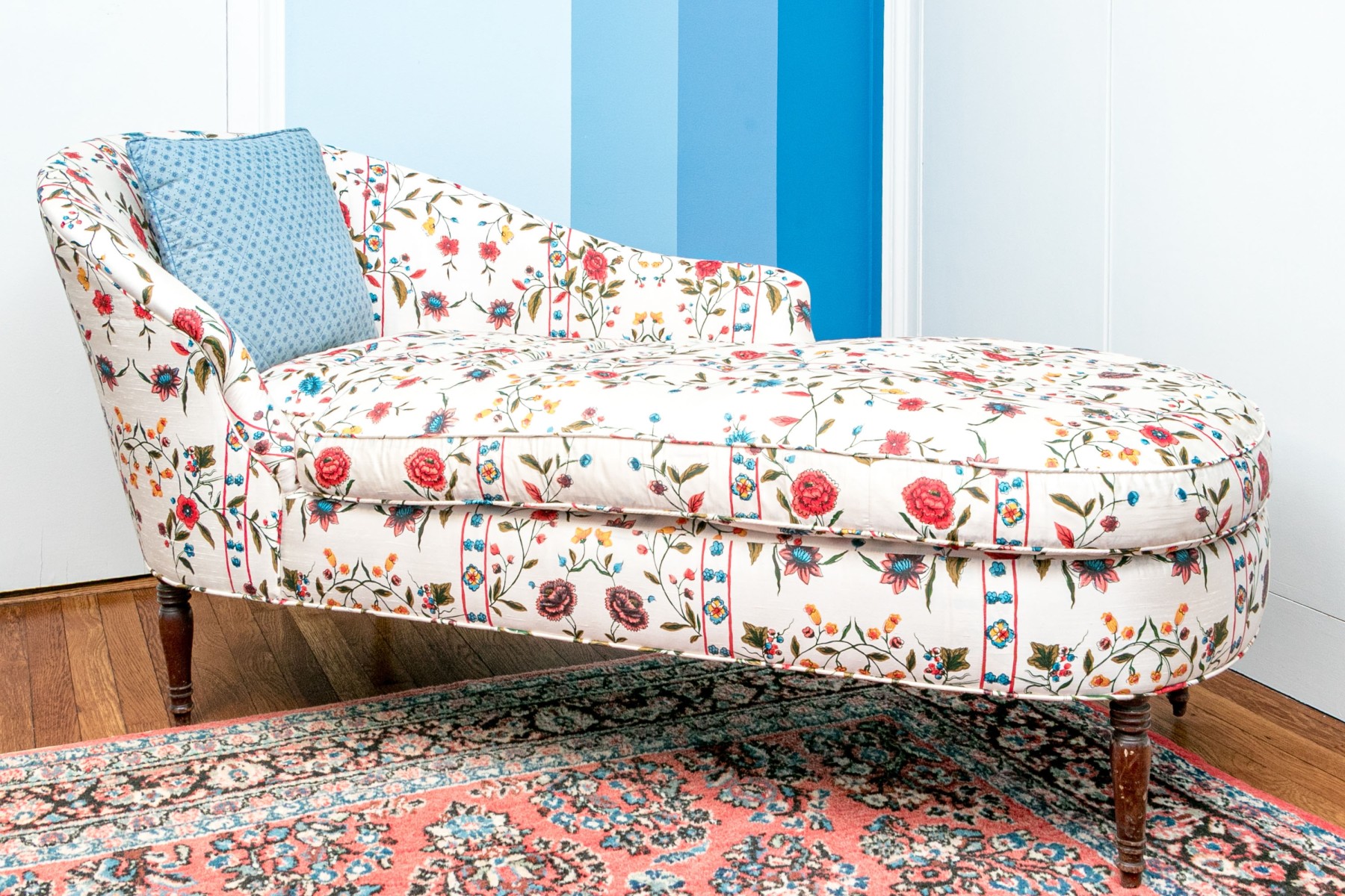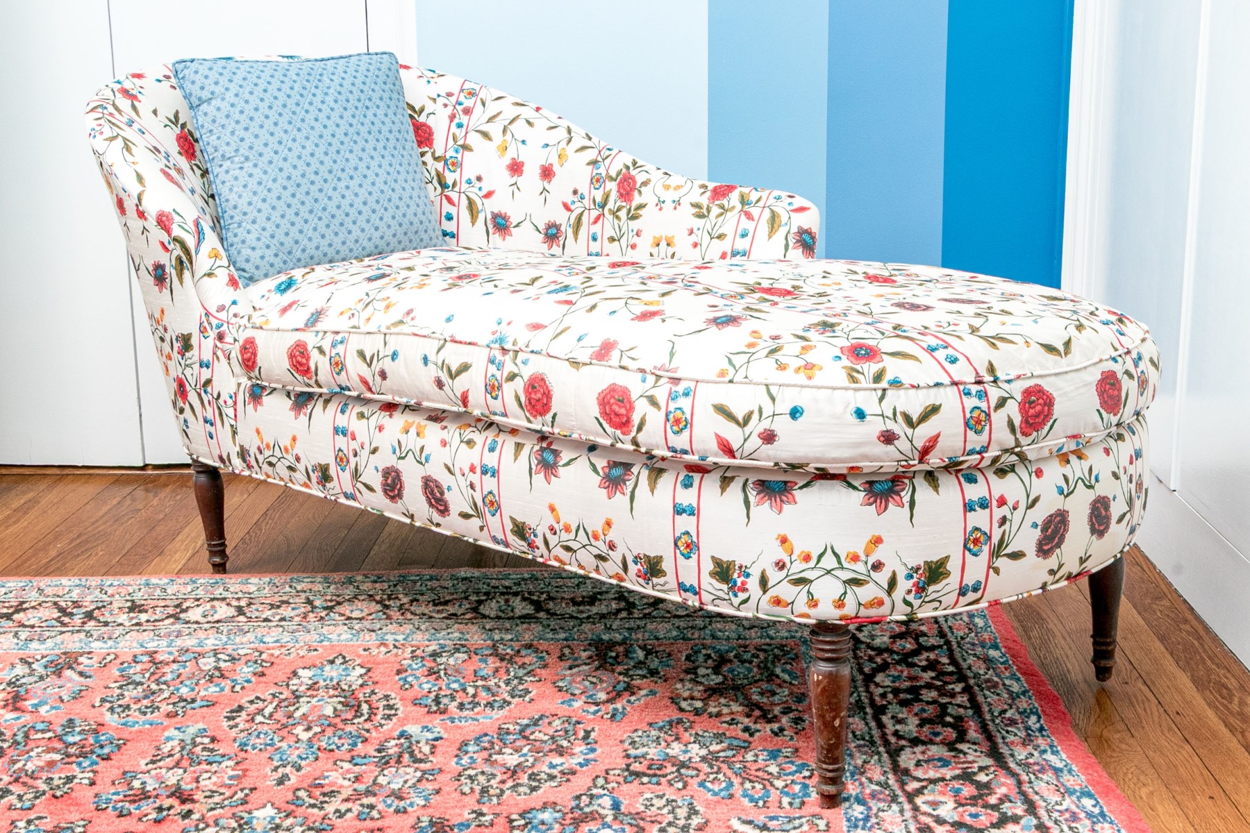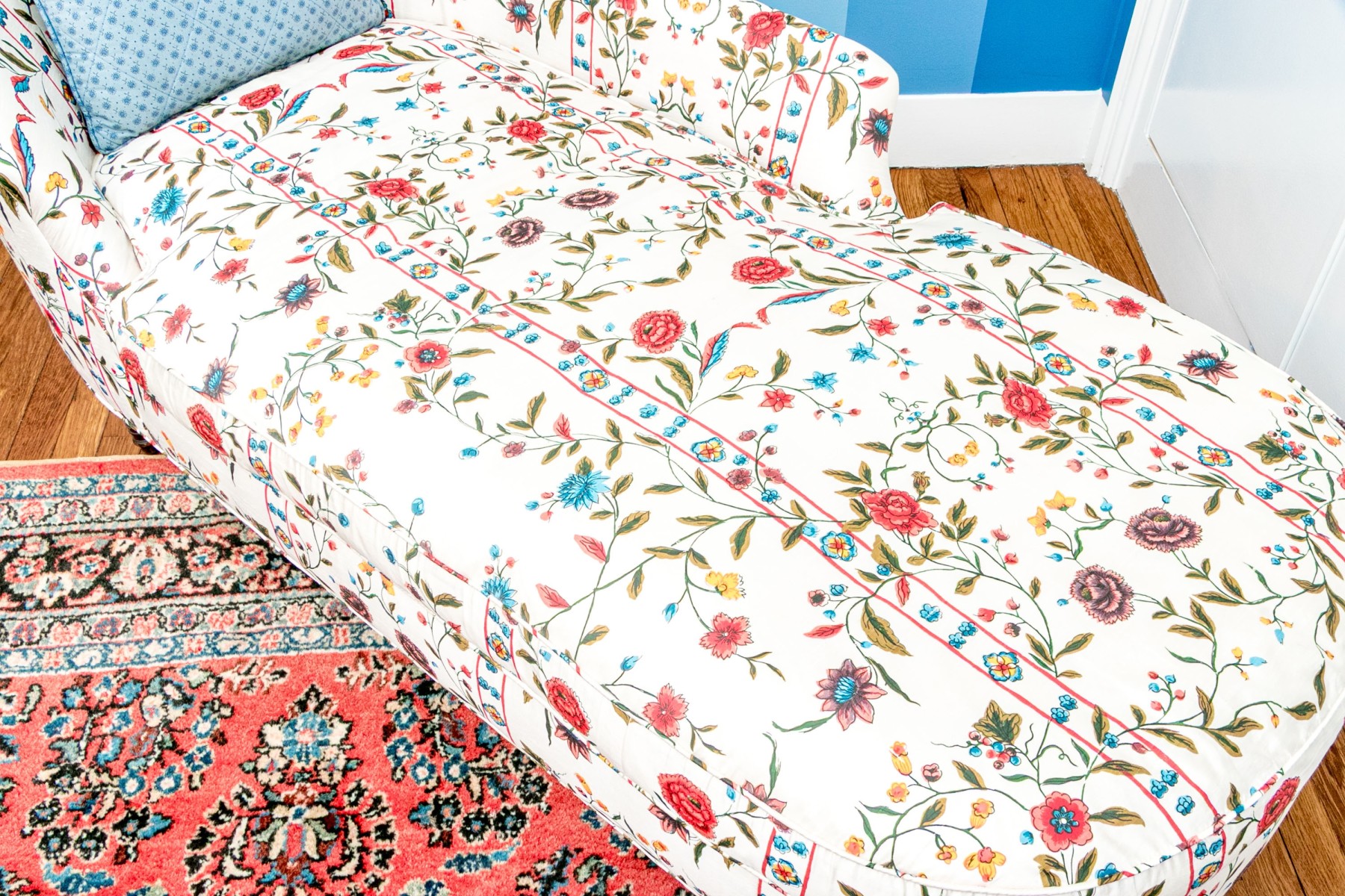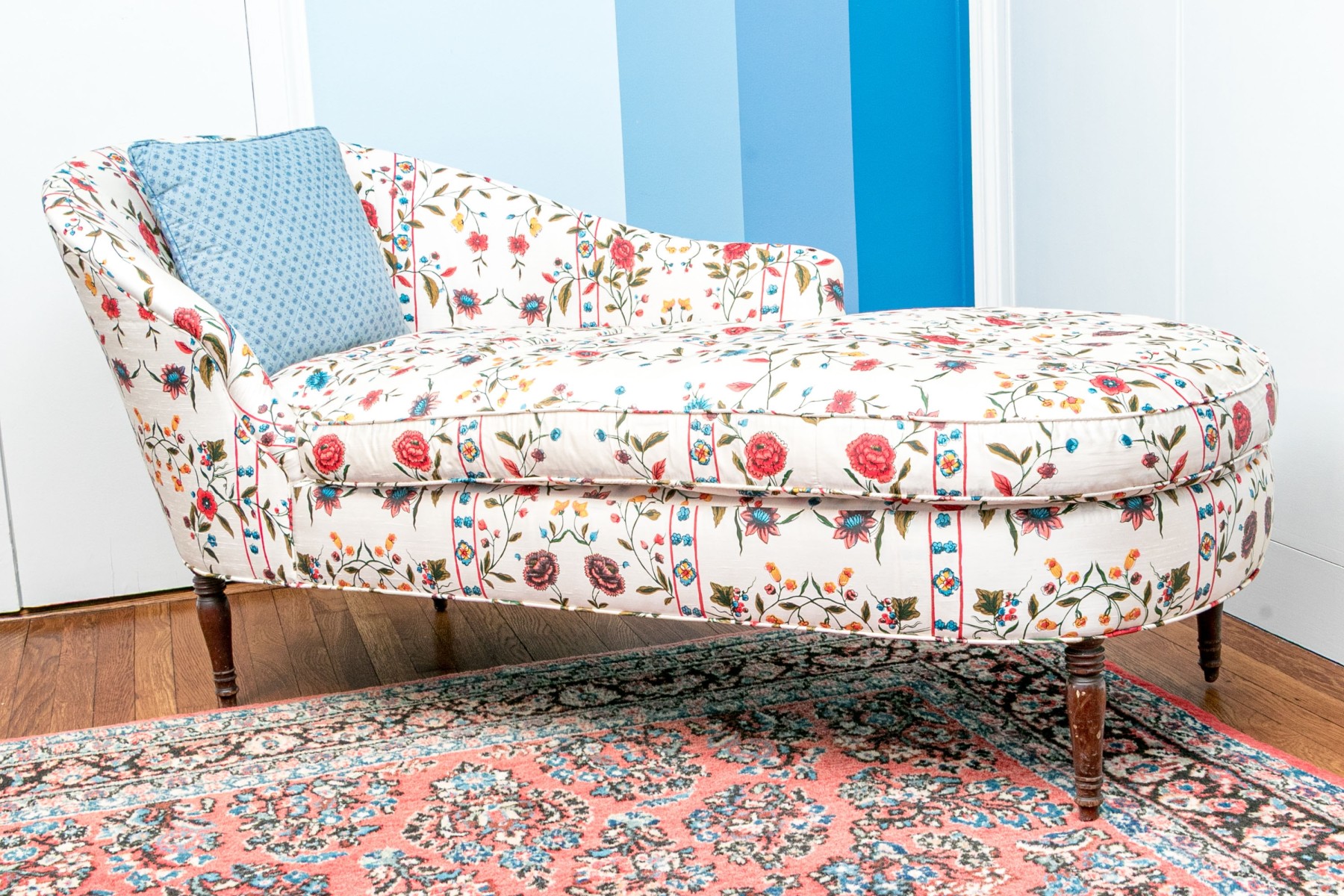 A delightful left arm chaise lounge with just the right touch of traditional elegance and contemporary cottage charm. The chaise features a gently swooped tub back and an elongated oval profile. The chaise is upholstered in beautiful white fabric with vibrant red, blue, and yellow flowers accented with red striped borders for a chintzy chic flare. Raised on nicely turned dark brown finished legs and finished with a blue throw pillow tying the colors together.