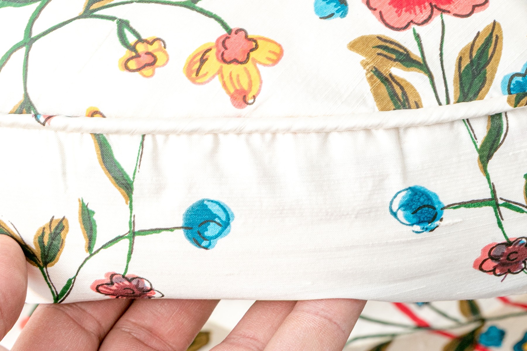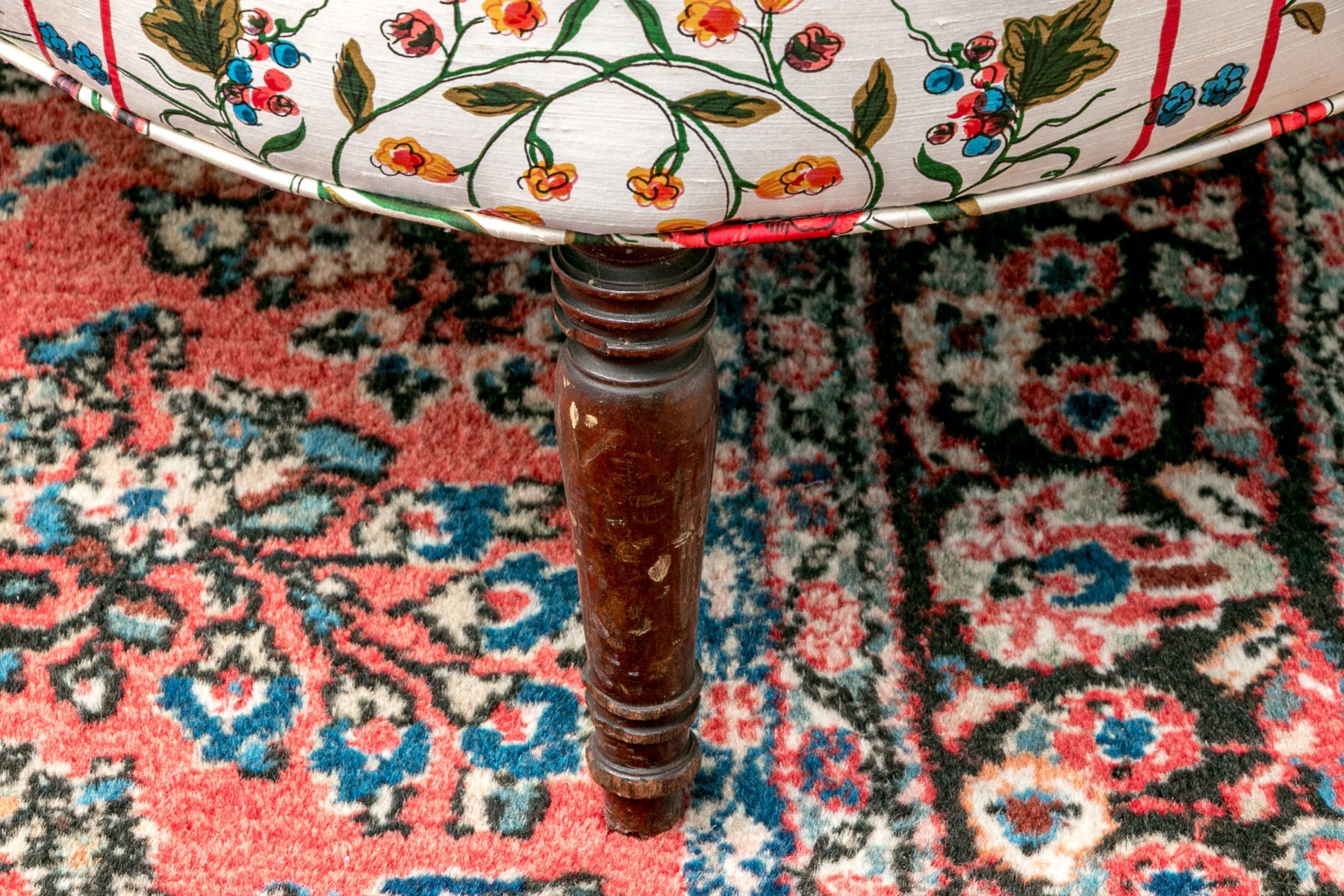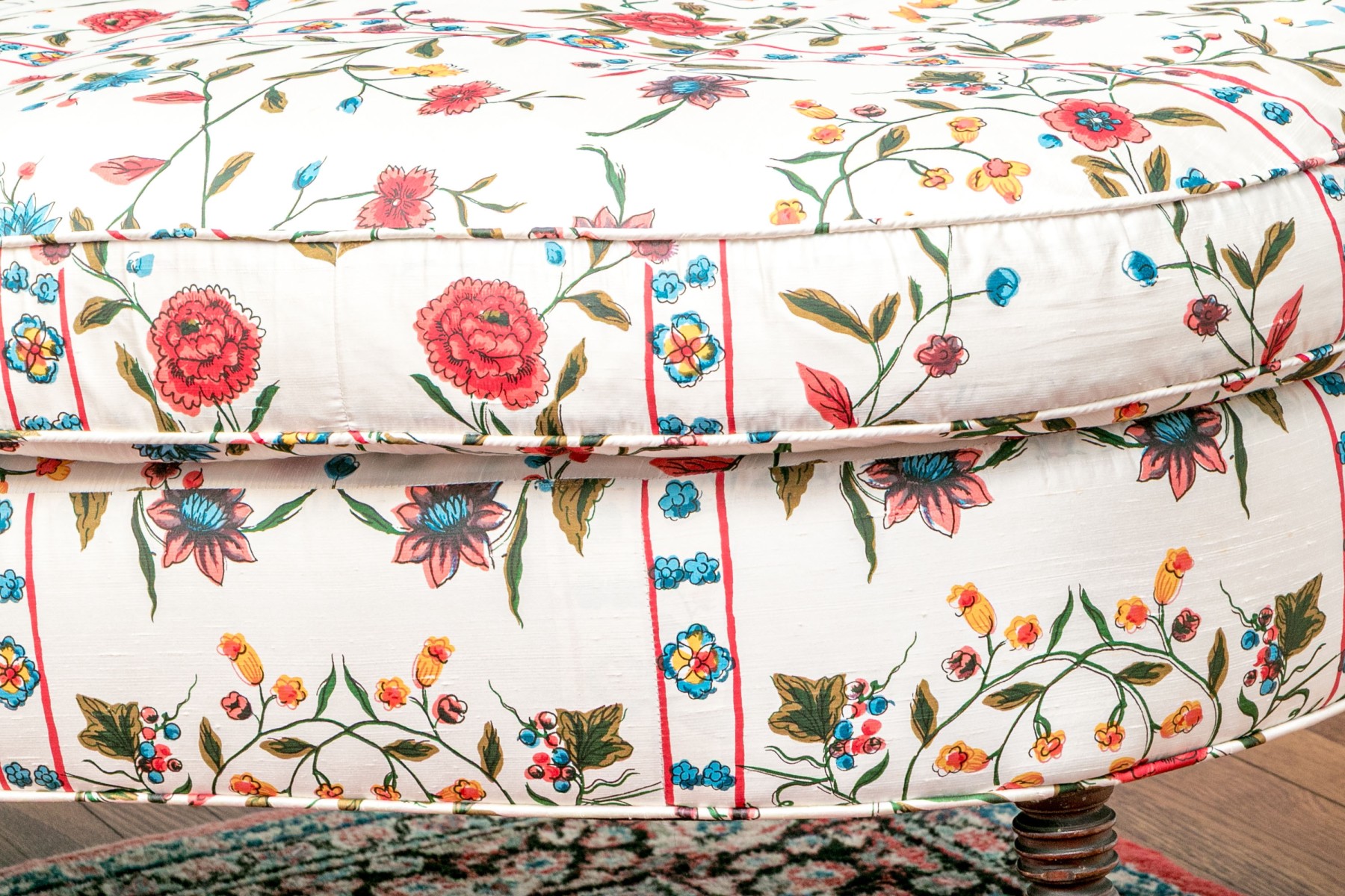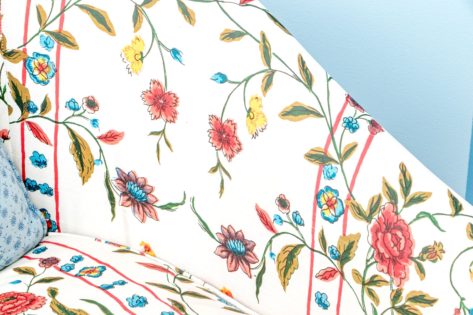 A delightful left arm chaise lounge with just the right touch of traditional elegance and contemporary cottage charm. The chaise features a gently swooped tub back and an elongated oval profile. The chaise is upholstered in beautiful white fabric with vibrant red, blue, and yellow flowers accented with red striped borders for a chintzy chic flare. Raised on nicely turned dark brown finished legs and finished with a blue throw pillow tying the colors together.