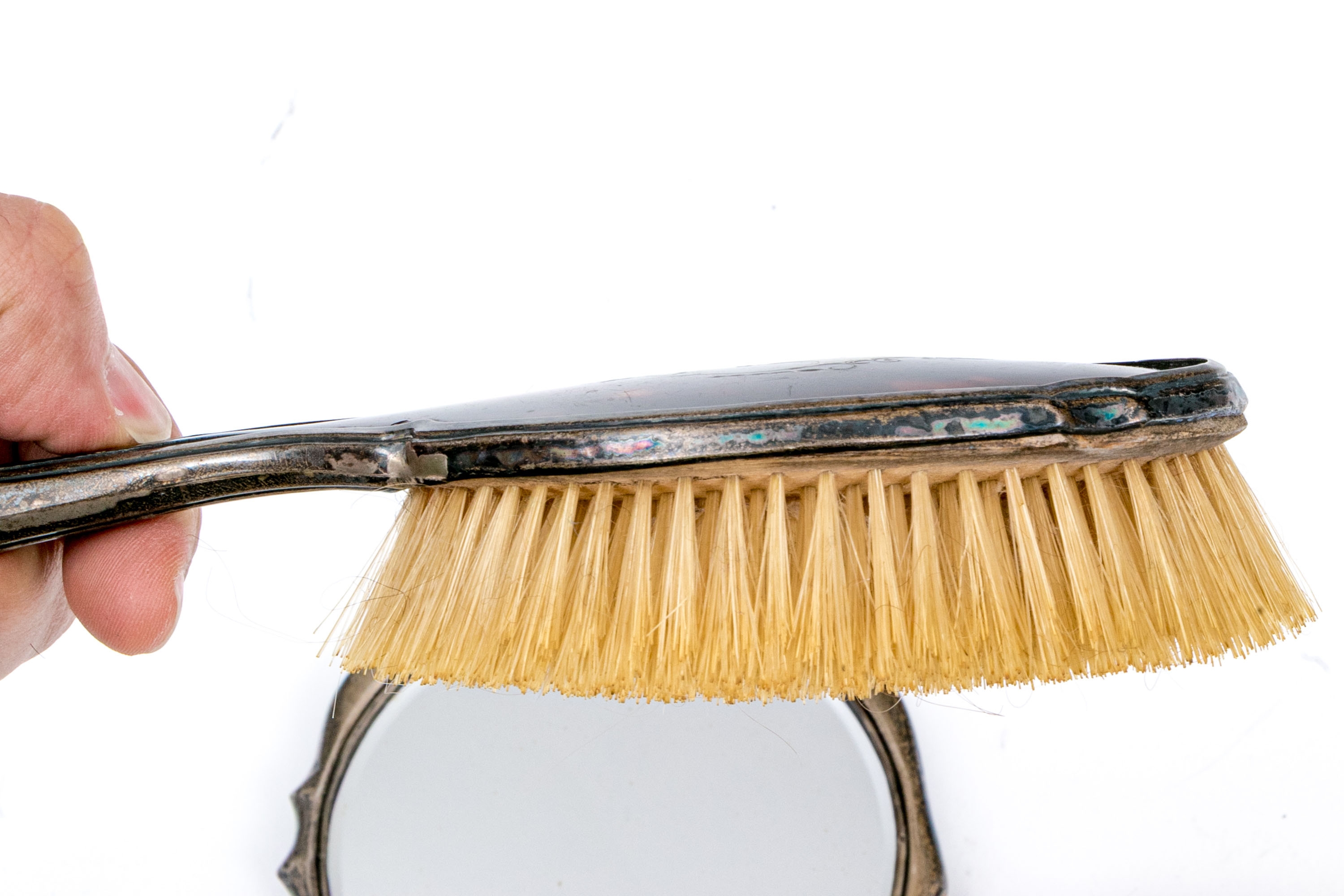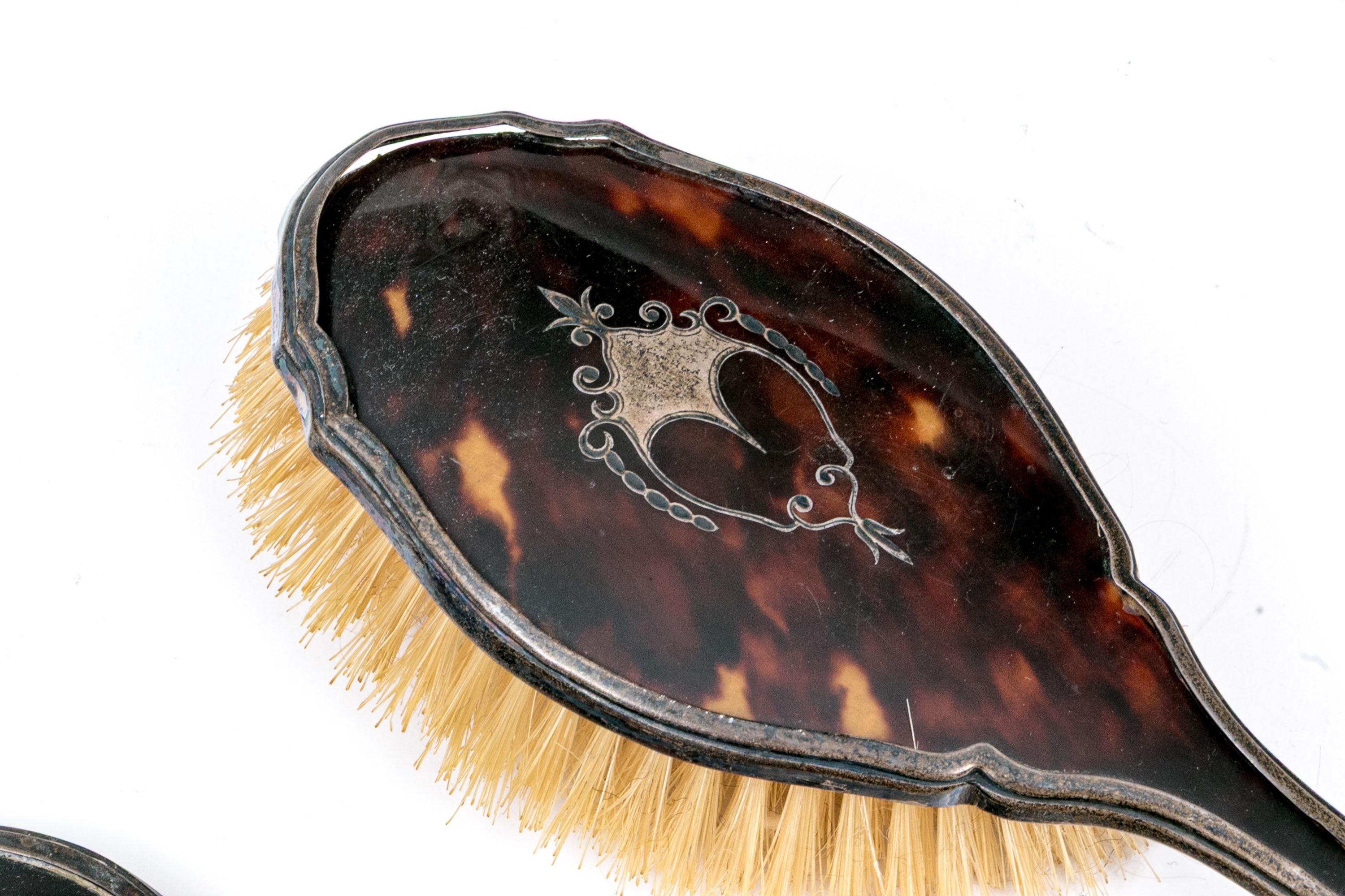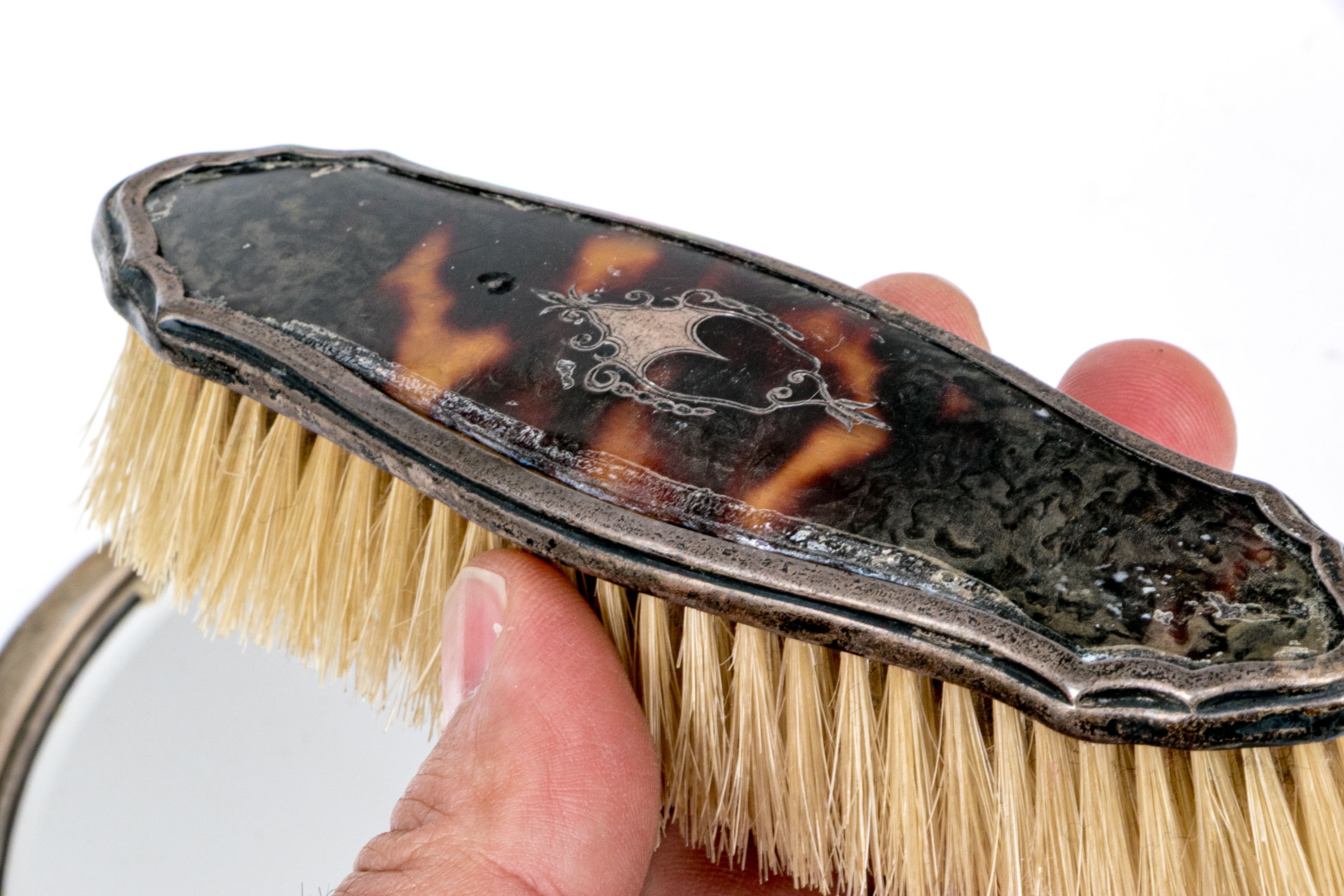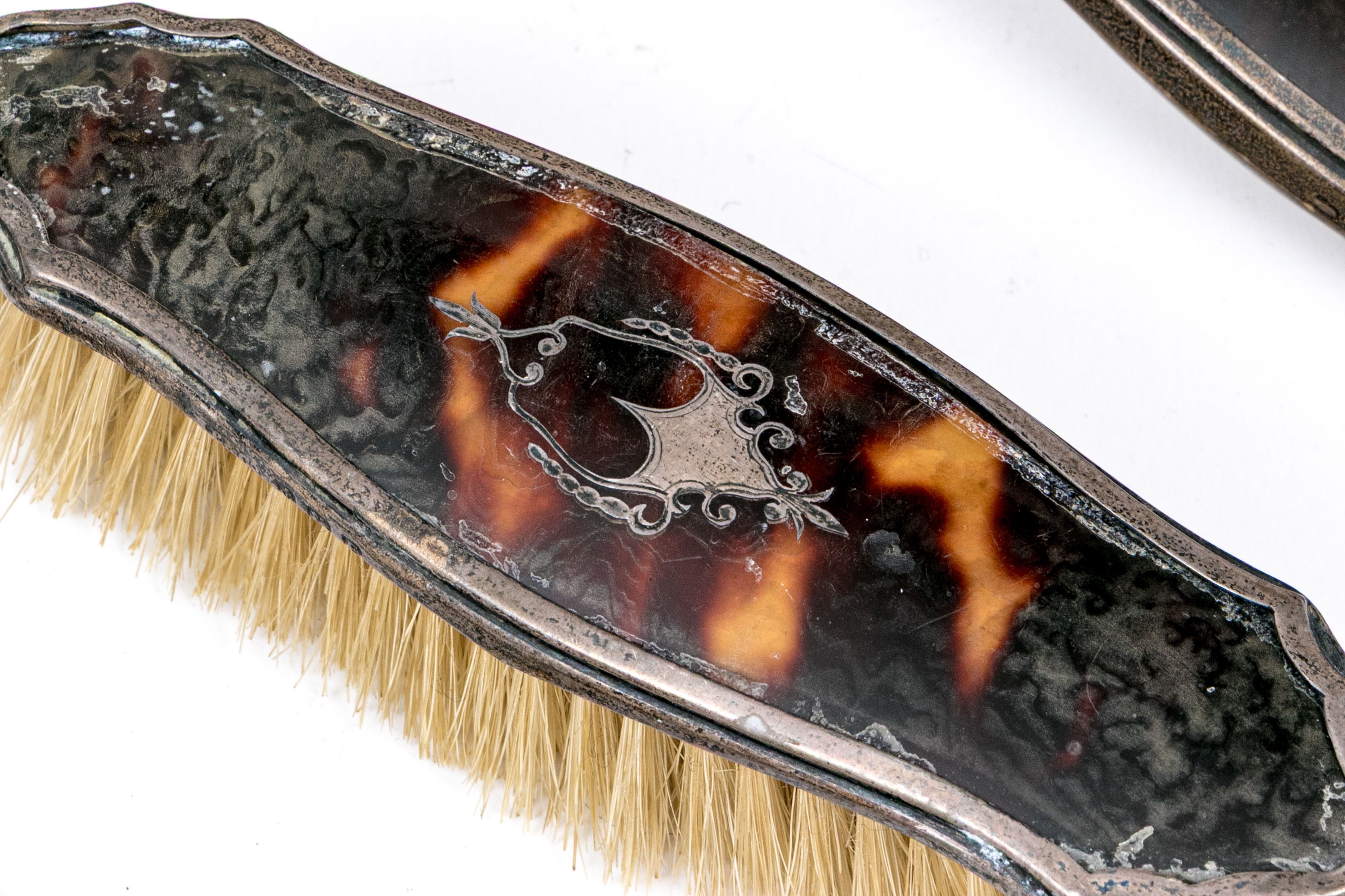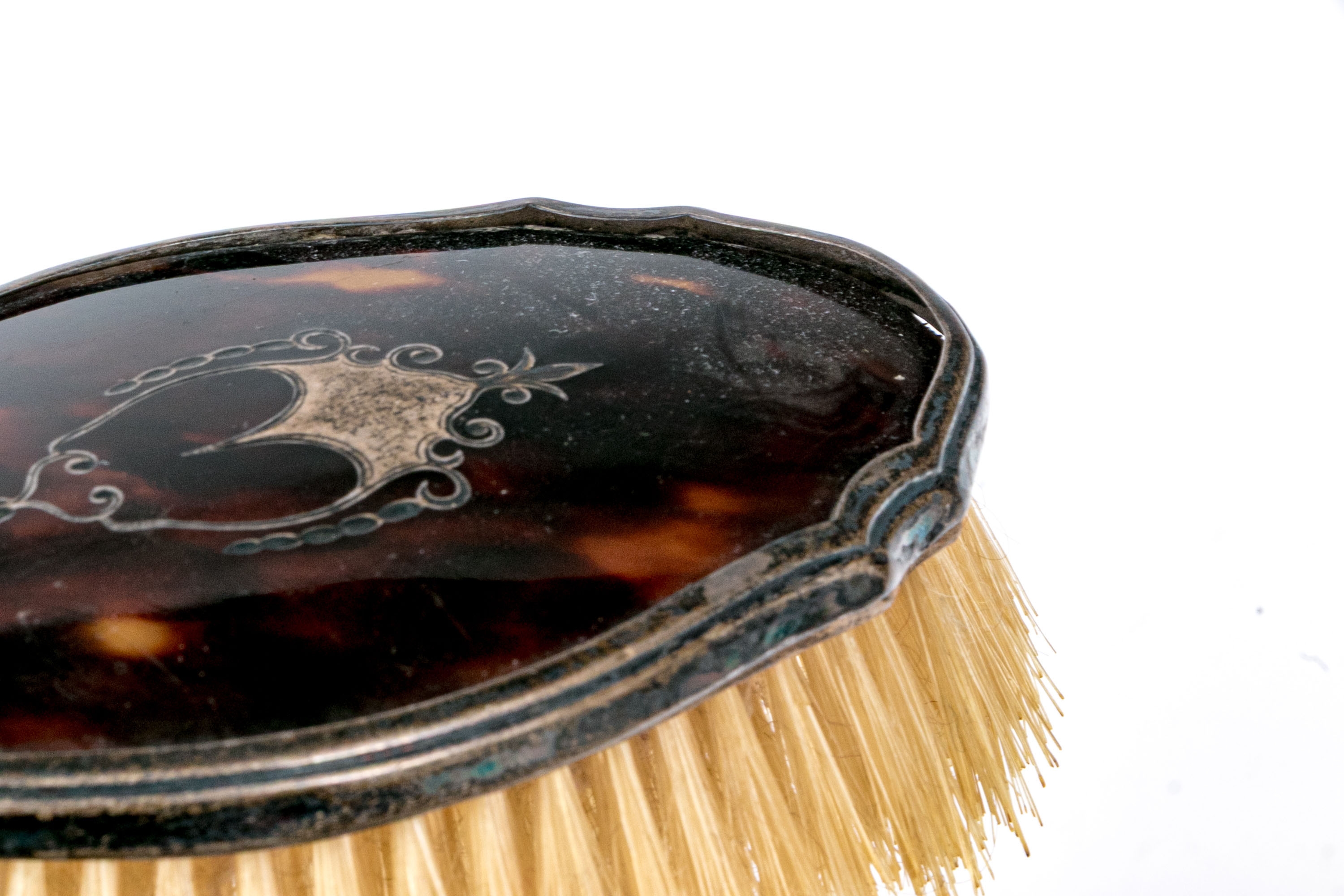 Wear including nics and losses to the tortoise shell and wear to the bristles. Heavily tarnished and worn silver mounts. Wear is commensurate with age and use.