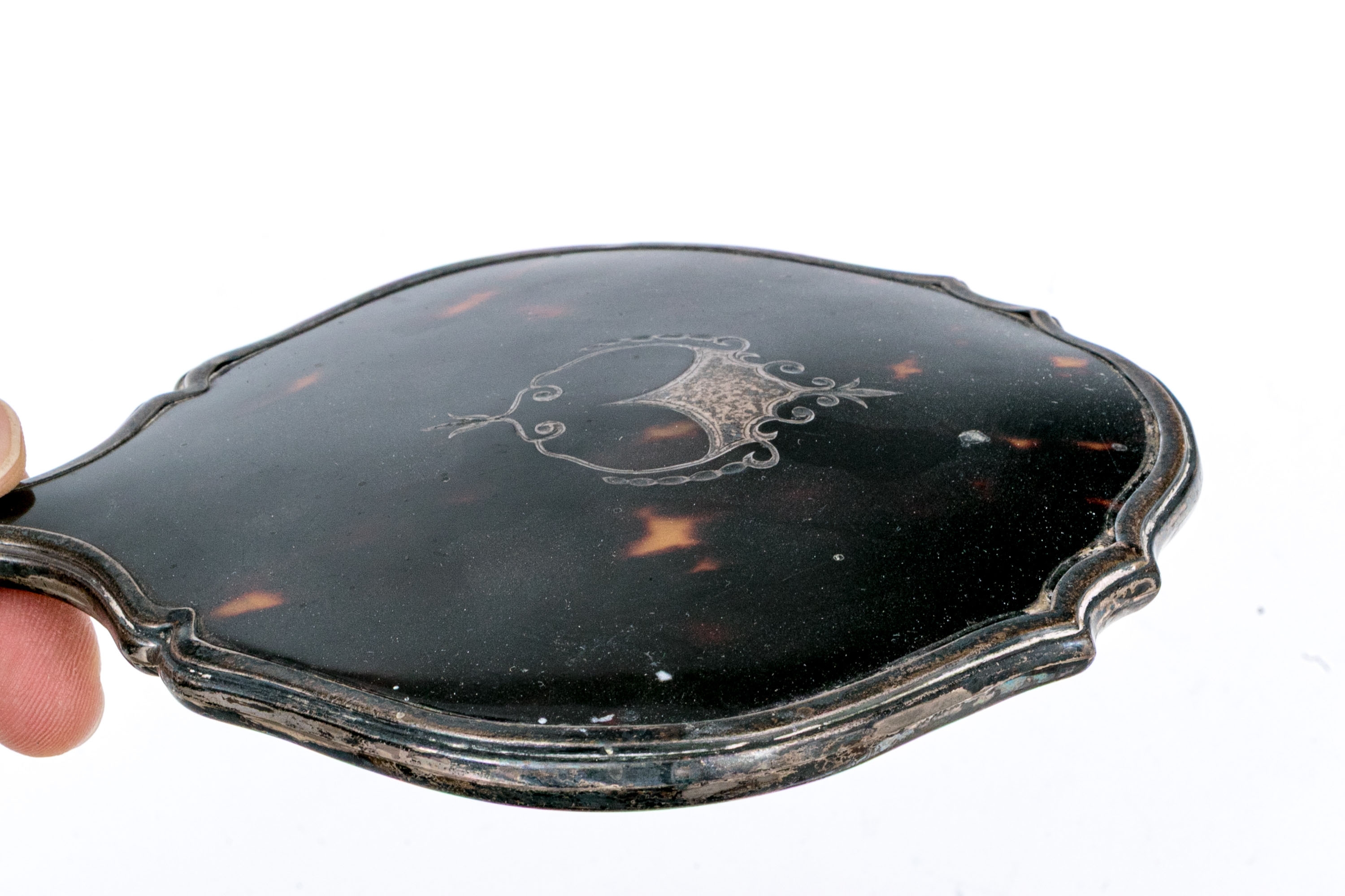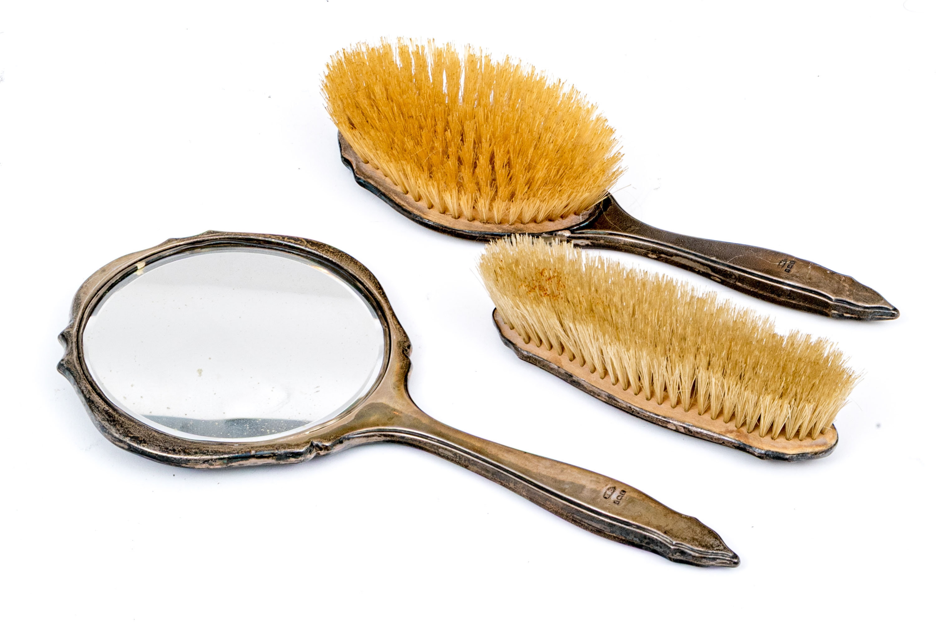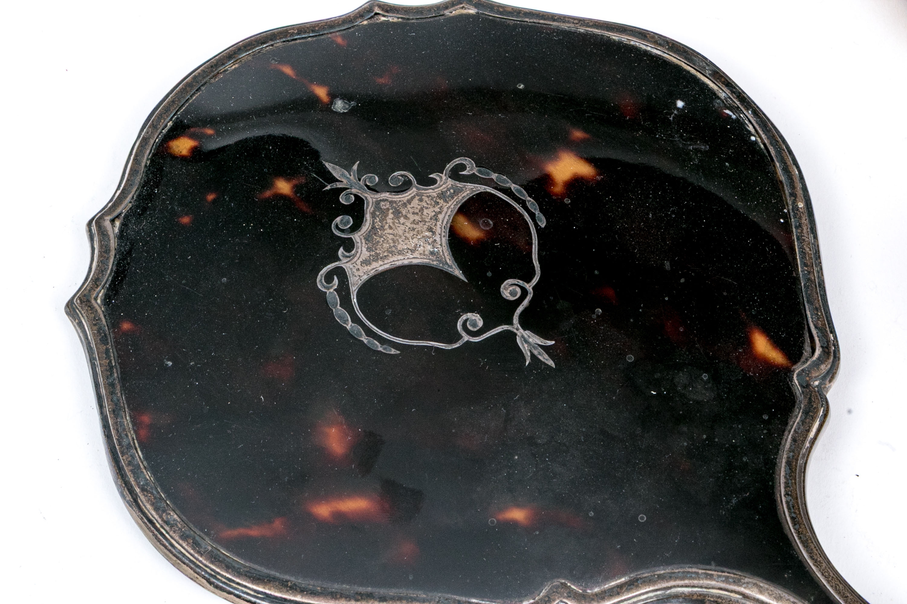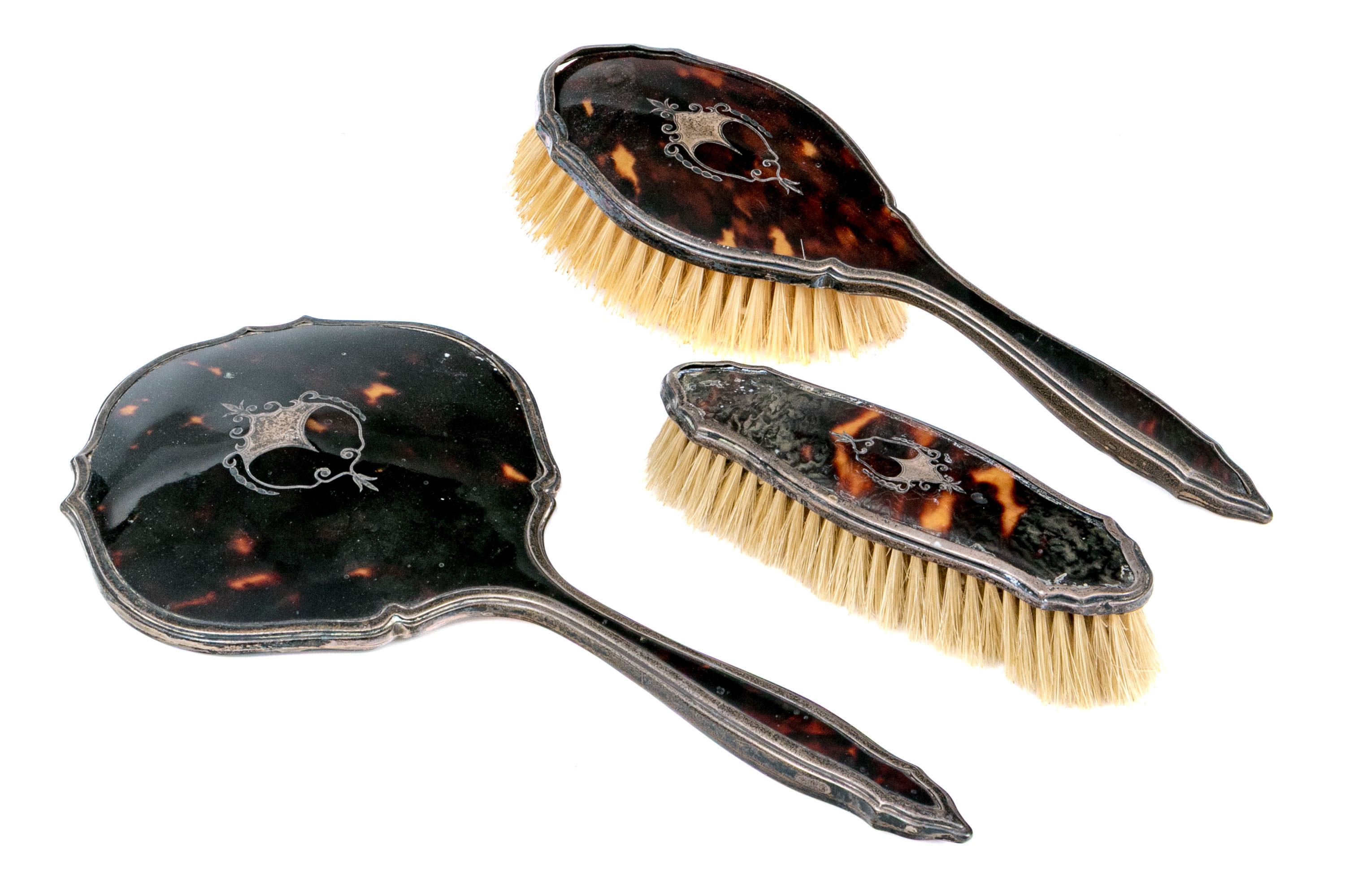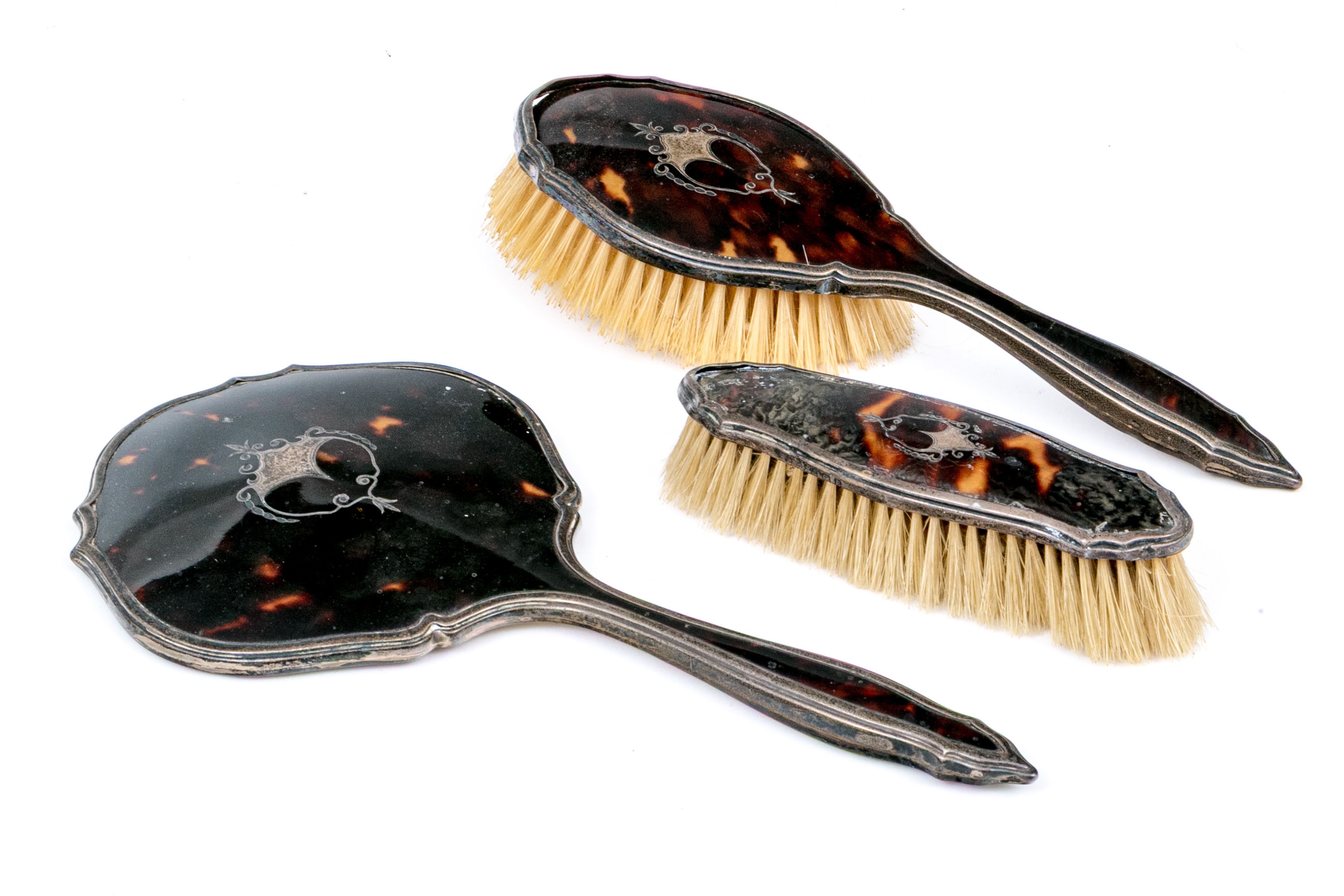 Wear including nics and losses to the tortoise shell and wear to the bristles. Heavily tarnished and worn silver mounts. Wear is commensurate with age and use.