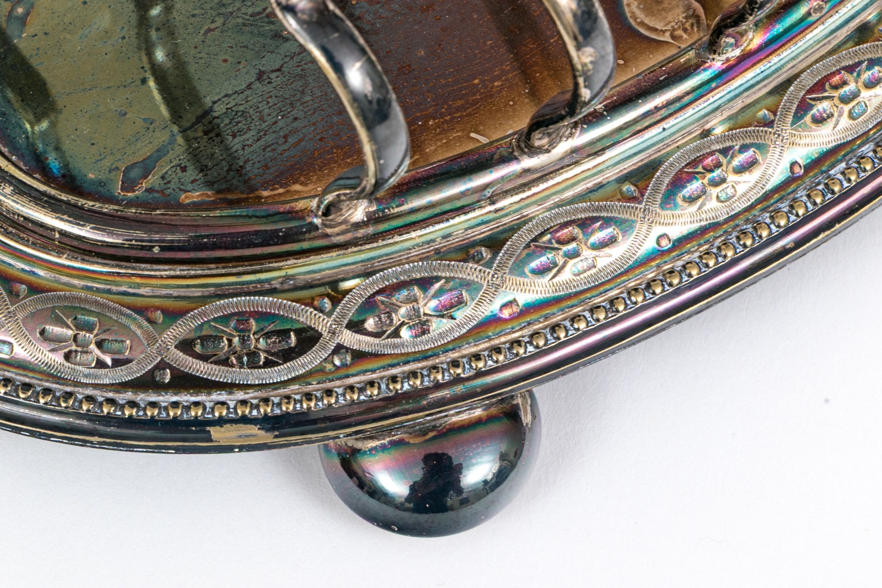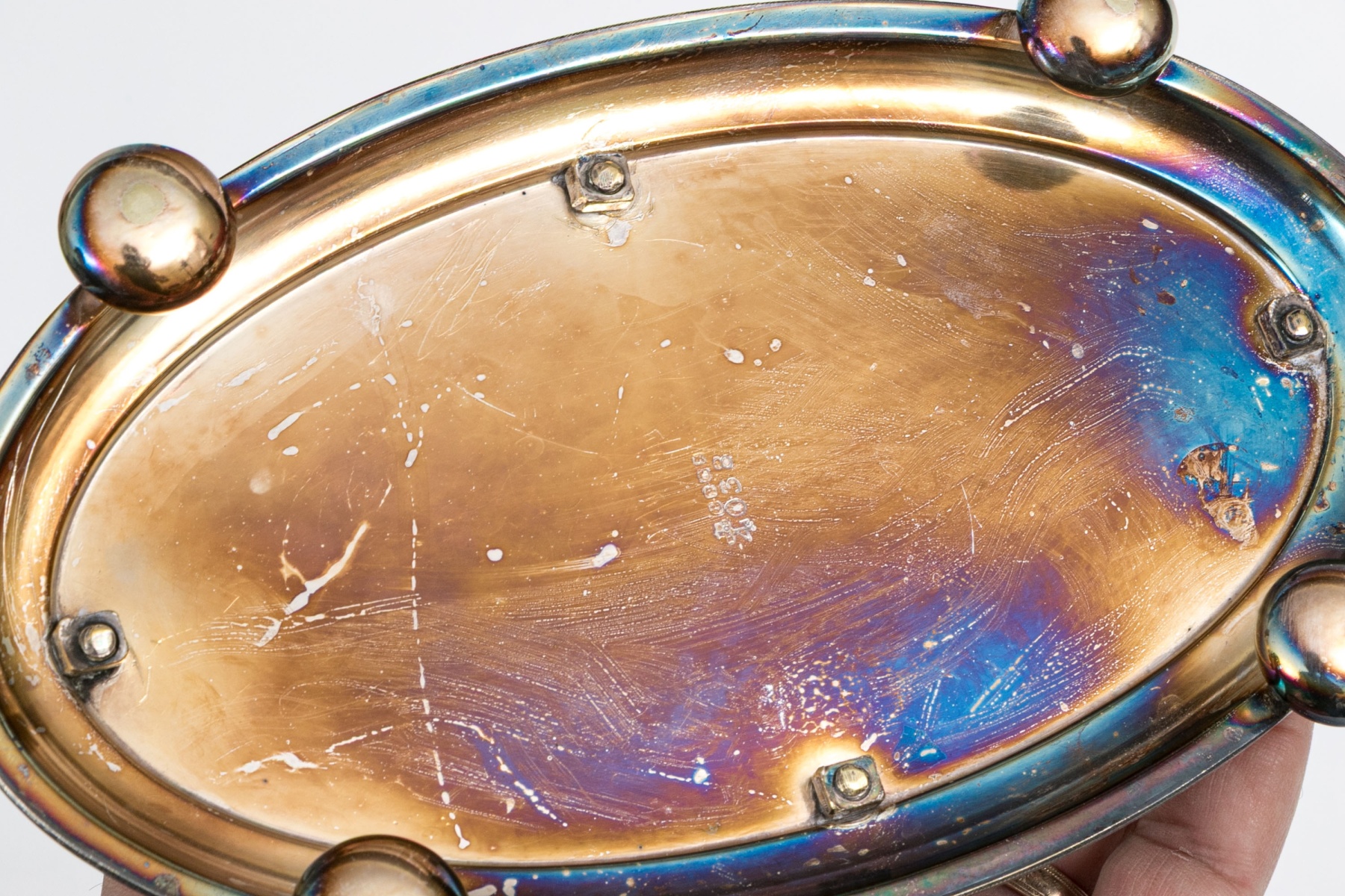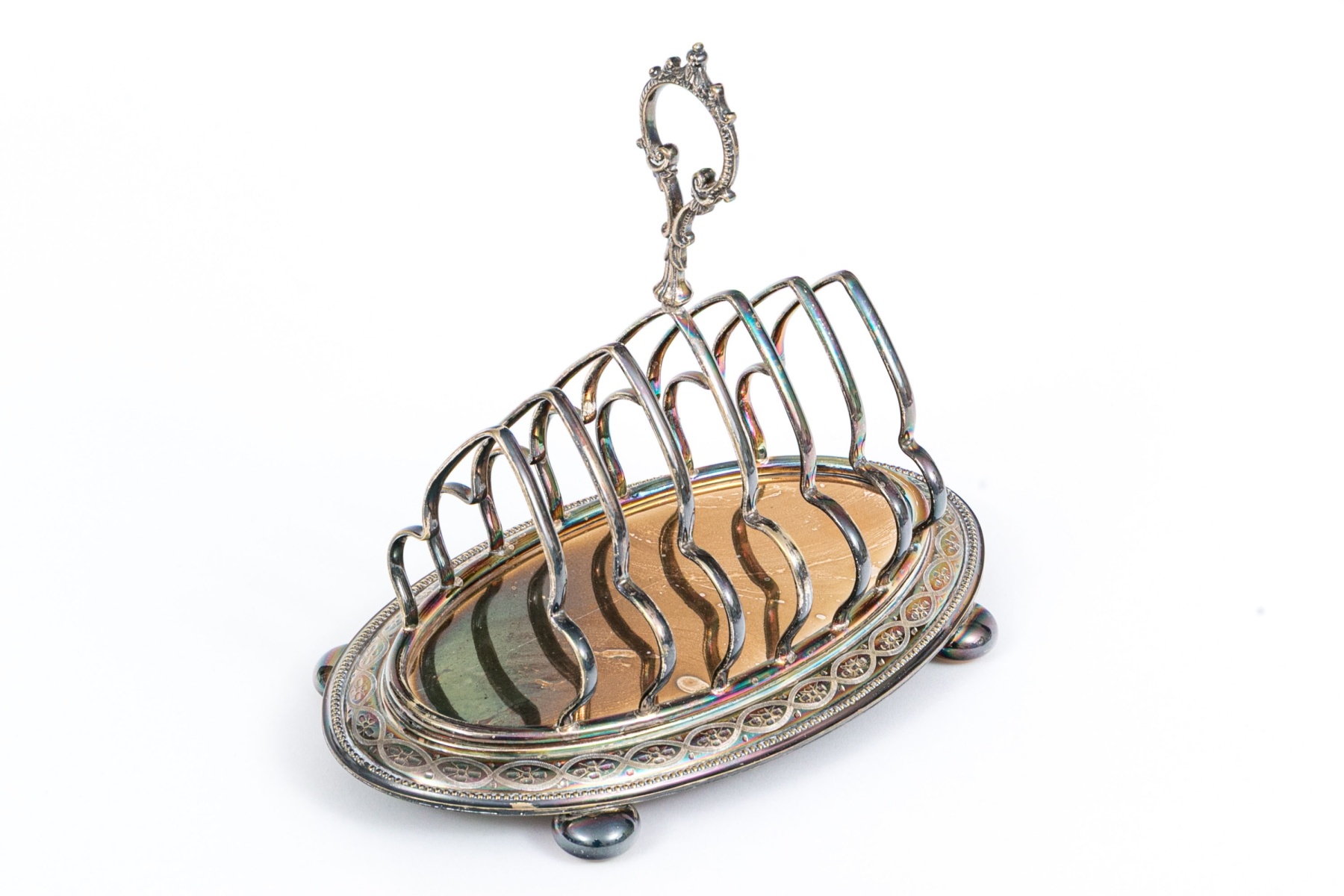 Set on four cushion form feet, having an oval base with beaded trim. The toast rack has dividers, with the central divider having a handle atop. While the toast rack could be used for its original intended purpose, they also make wonderful mail organizers.