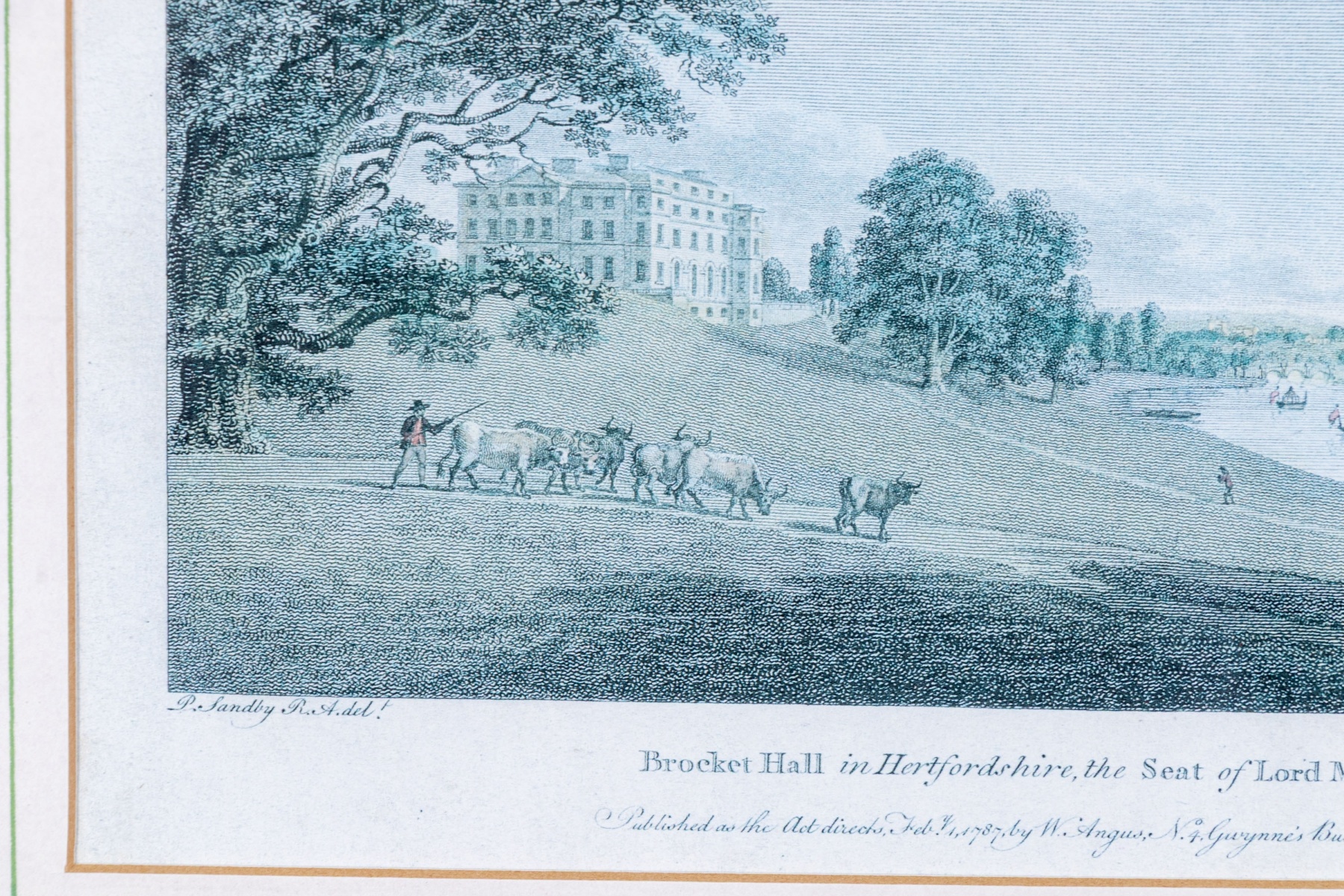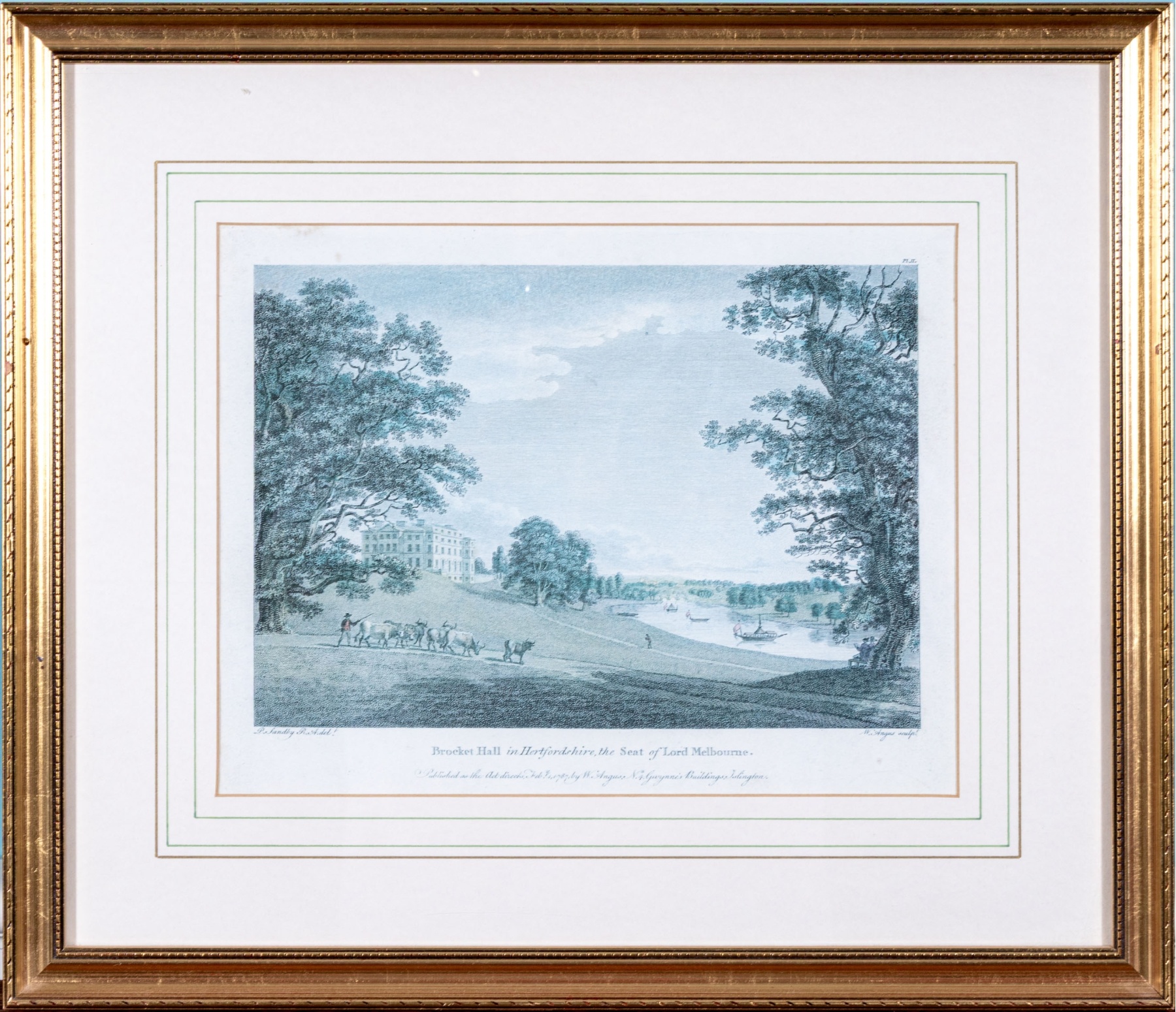 Color engraving by William Angus (English, c. 1752-1821) after the original painting by Paul Sandby (English, 1731-1809) "Brocket Hall in Hertfordshire, the Seat of Lord Melbourne" depicting a classic scene of figure and cattle walking along a dirt path overlooking a stately building and boats on a calm river beneath a vast sky above.