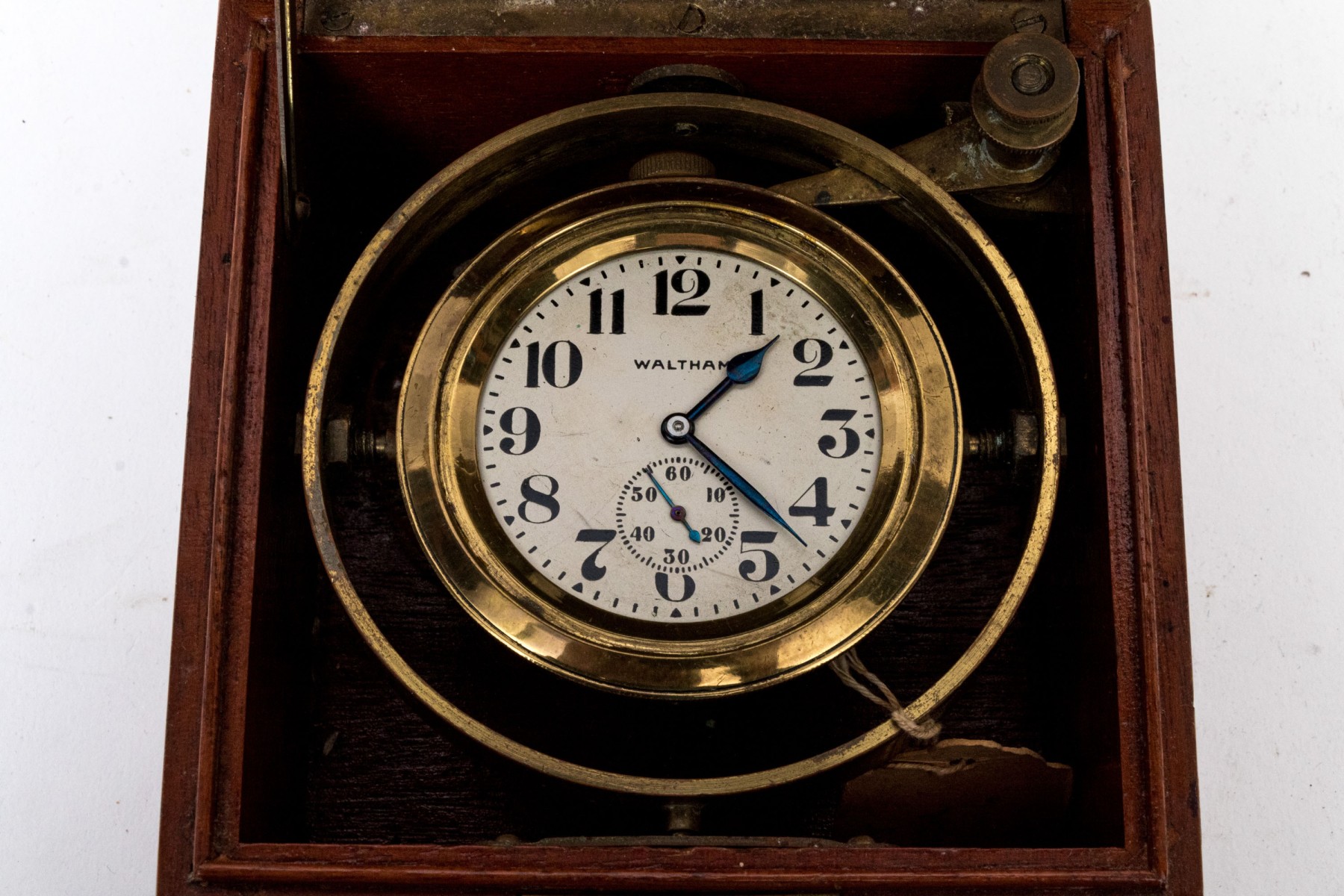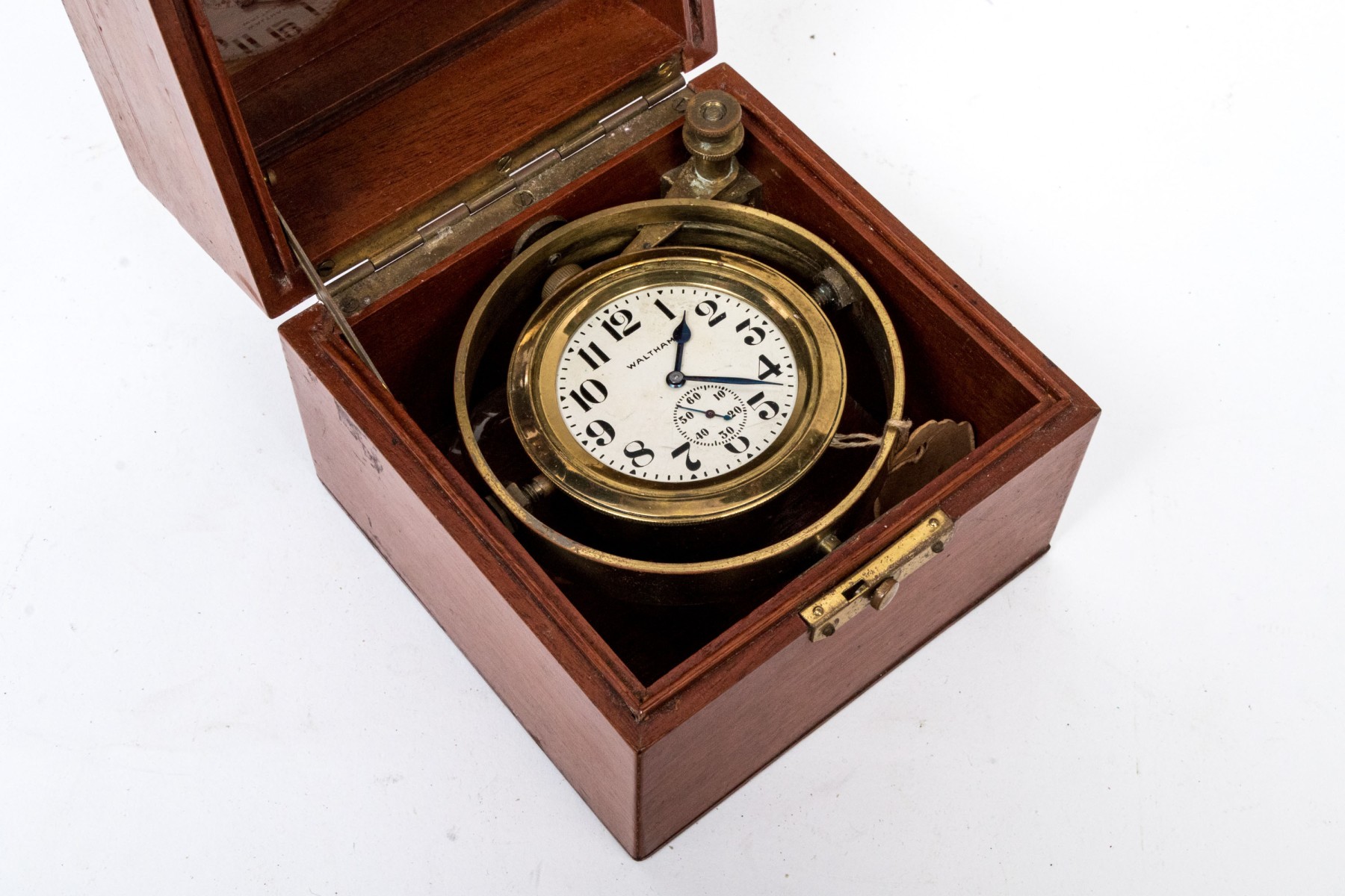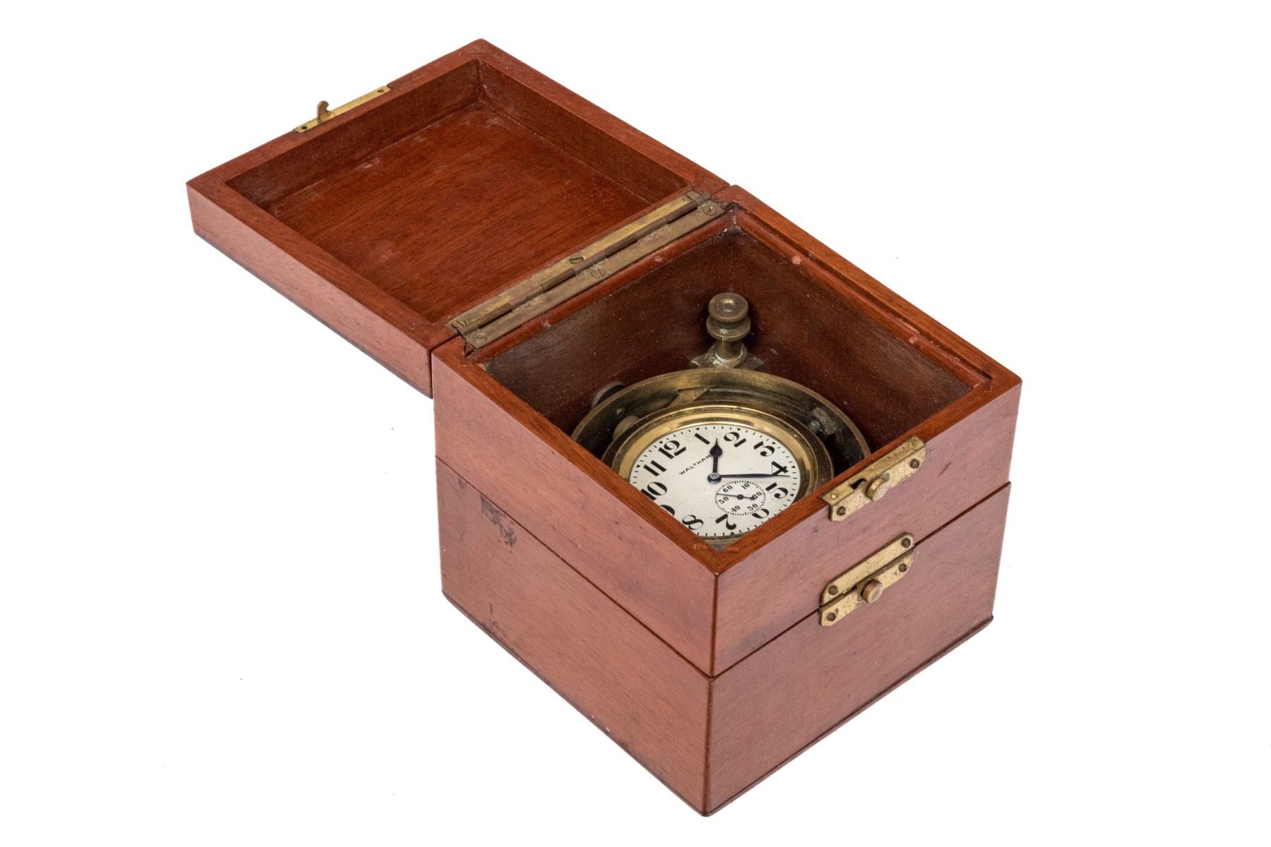 Made by the American company Waltham Watch Works, MA. Their classic chronometer In the wooden double hinged top case. The top opens to a glass top overlooking the chronometer in the lower case. Lacking the key.