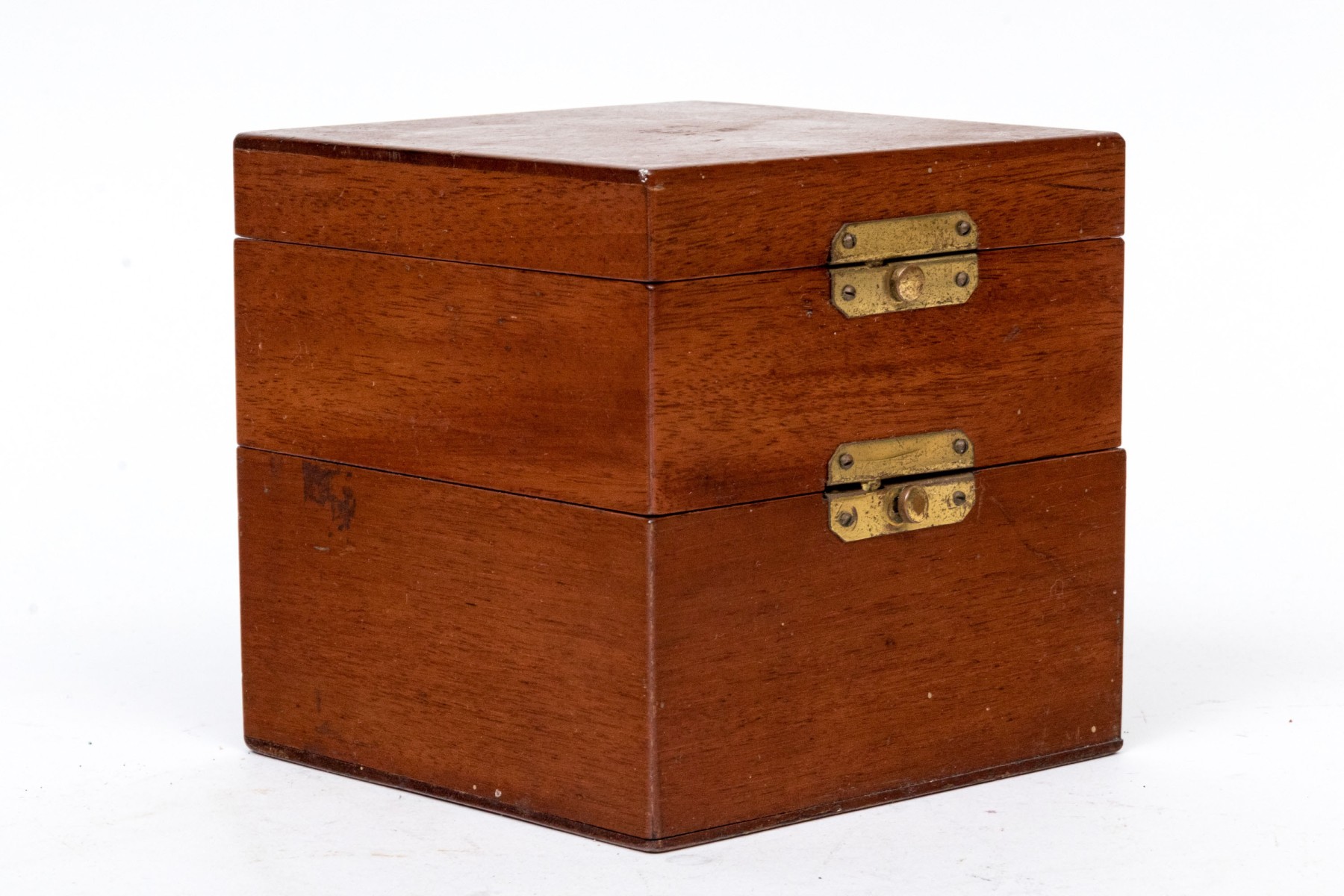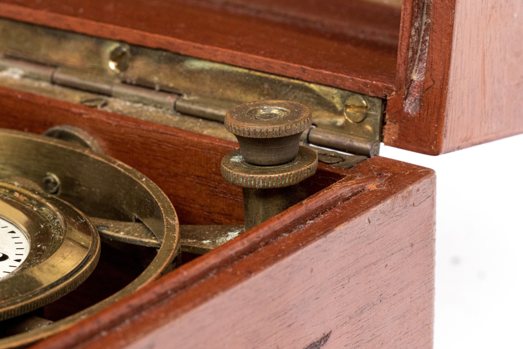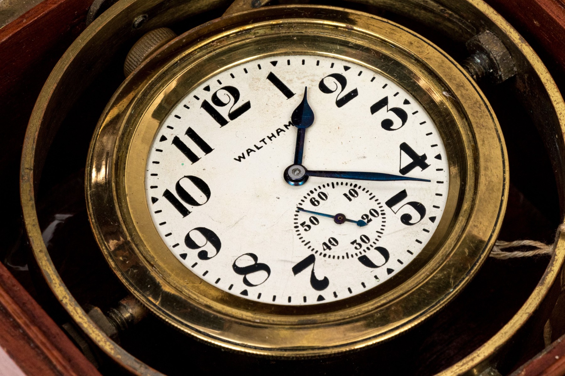Made by the American company Waltham Watch Works, MA. Their classic chronometer In the wooden double hinged top case. The top opens to a glass top overlooking the chronometer in the lower case. Lacking the key.
