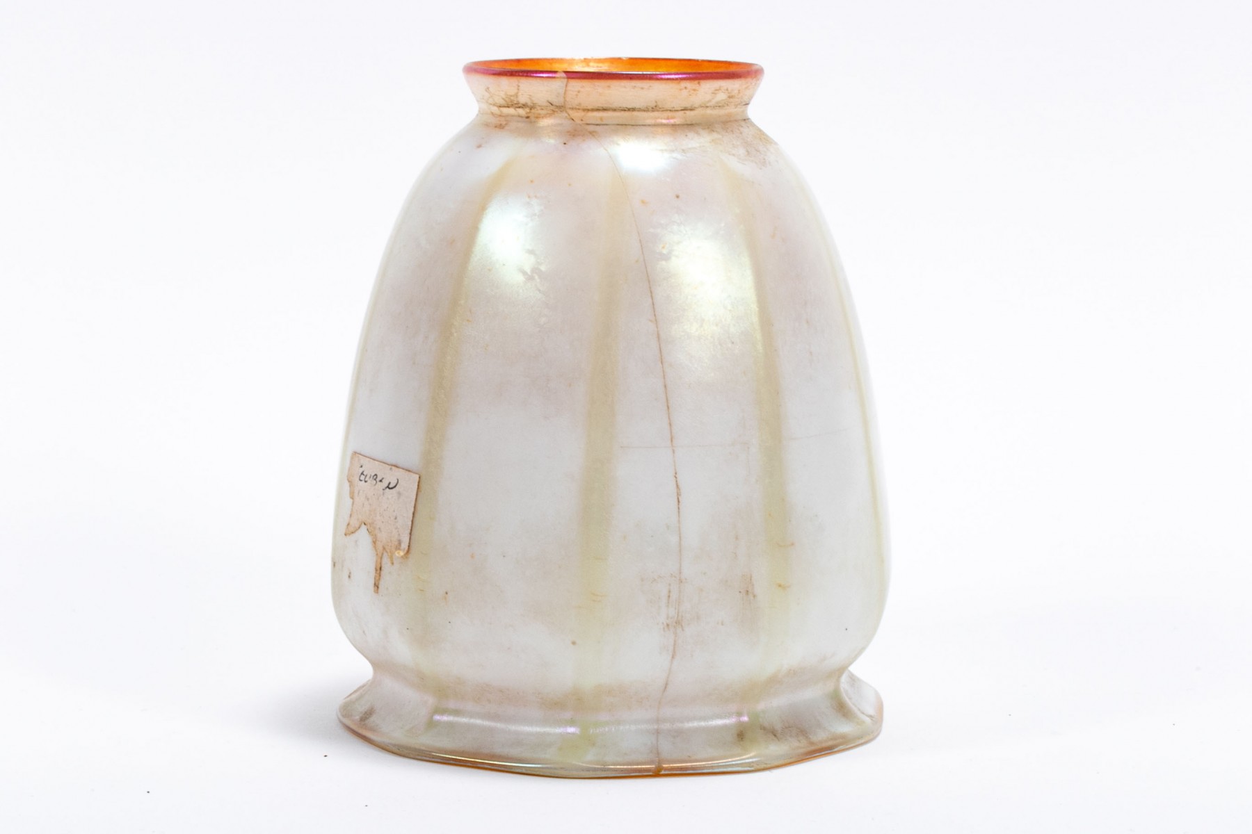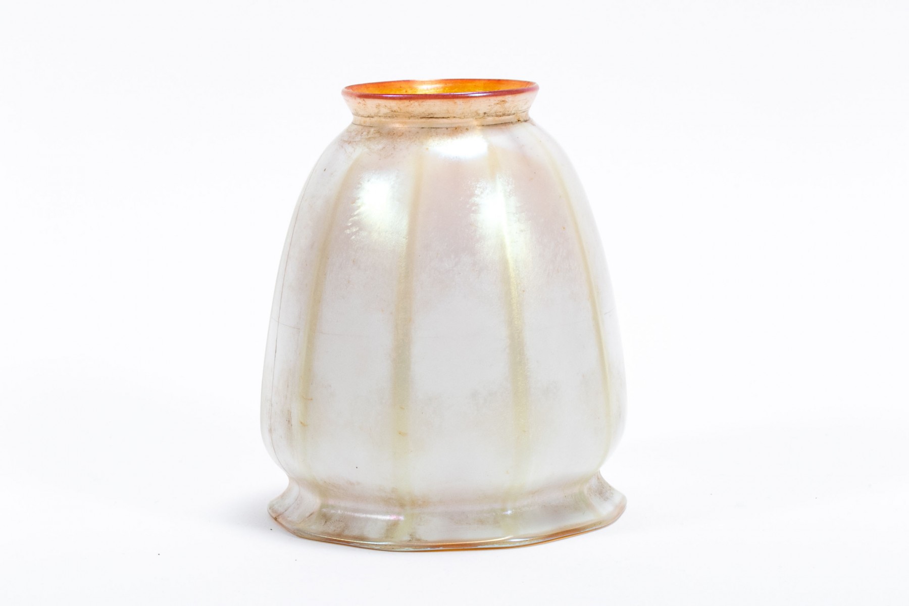 Antique Steuben shade in a white iridescent finish and a gold finished interior. Unmarked.