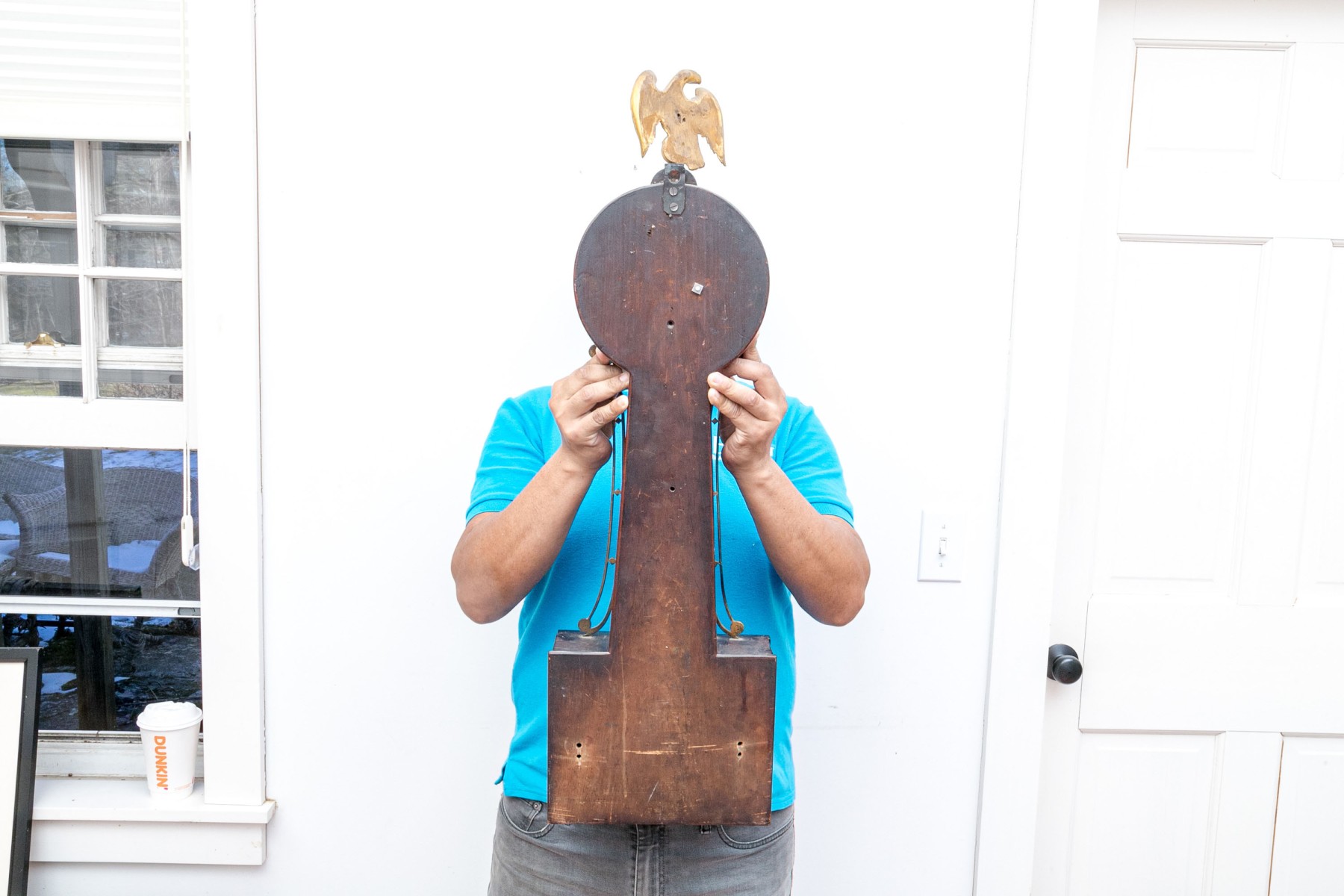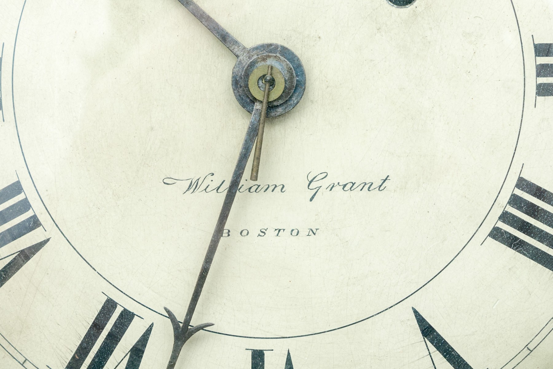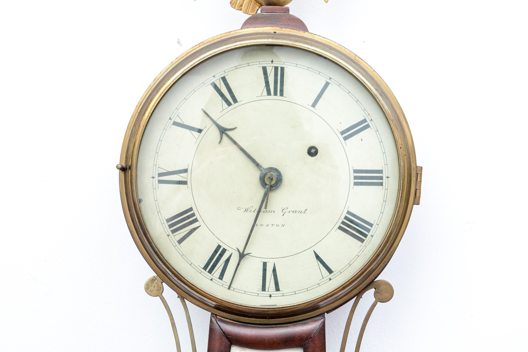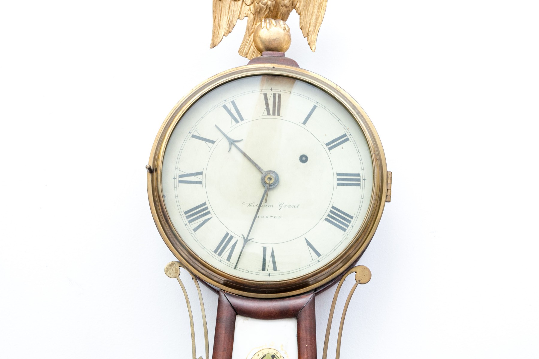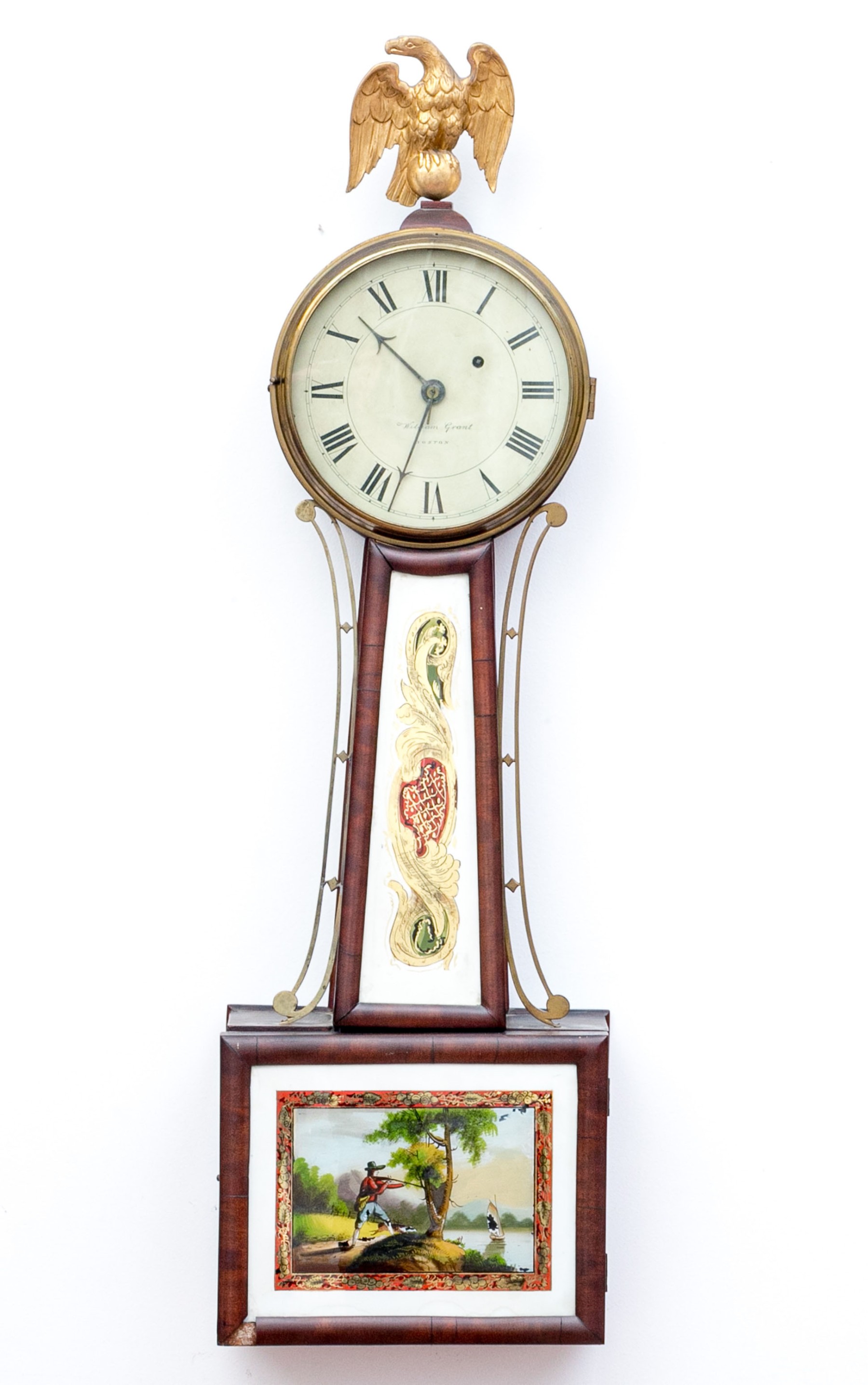 With fantastically carved and gilt eagle form finial. With pendulum. The wood frame with brass embellishments. Features inset eglomise panels, the bottom panel depicting a hunting scene. The circular clock face with roman numerals and signed "William Grant, Boston."