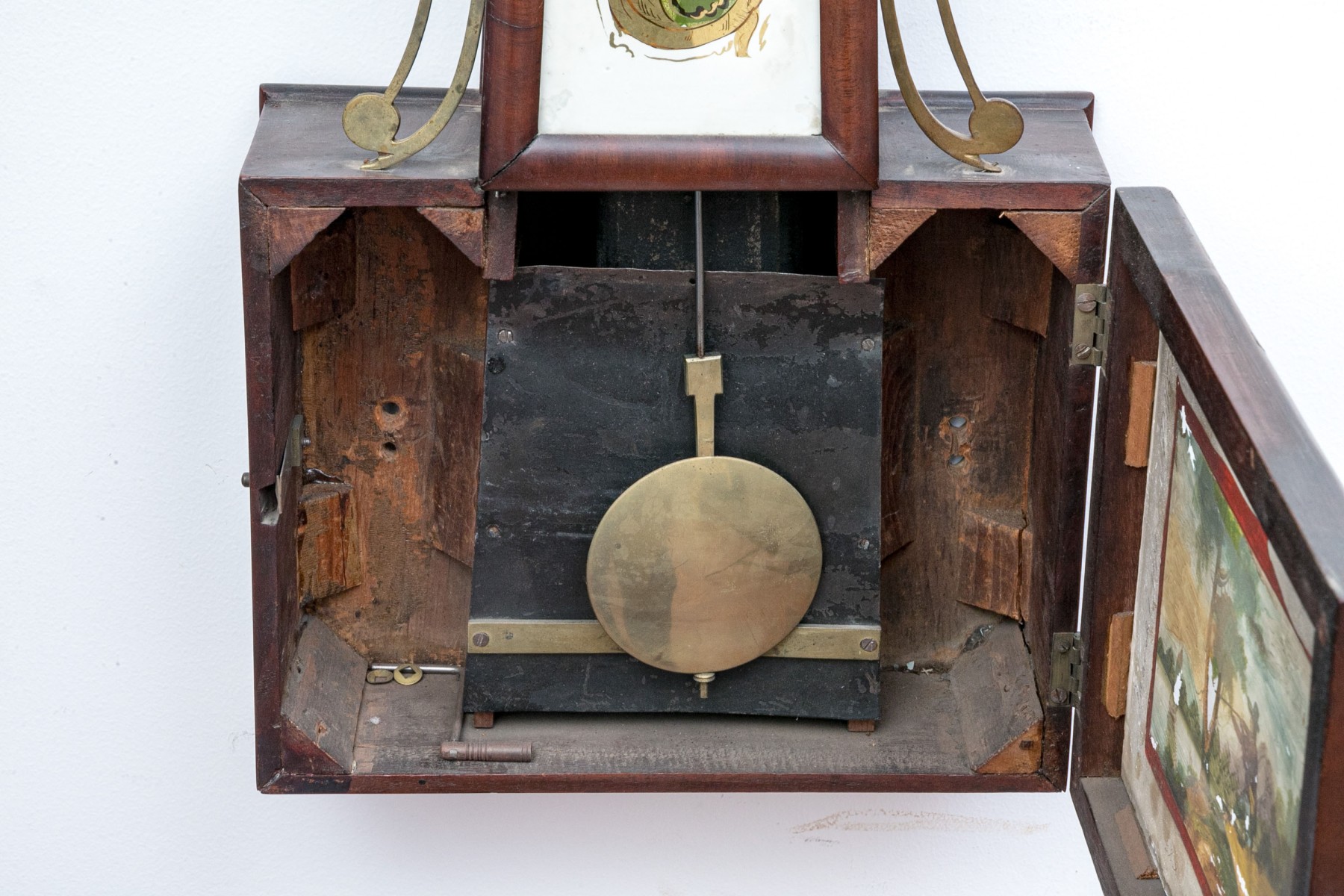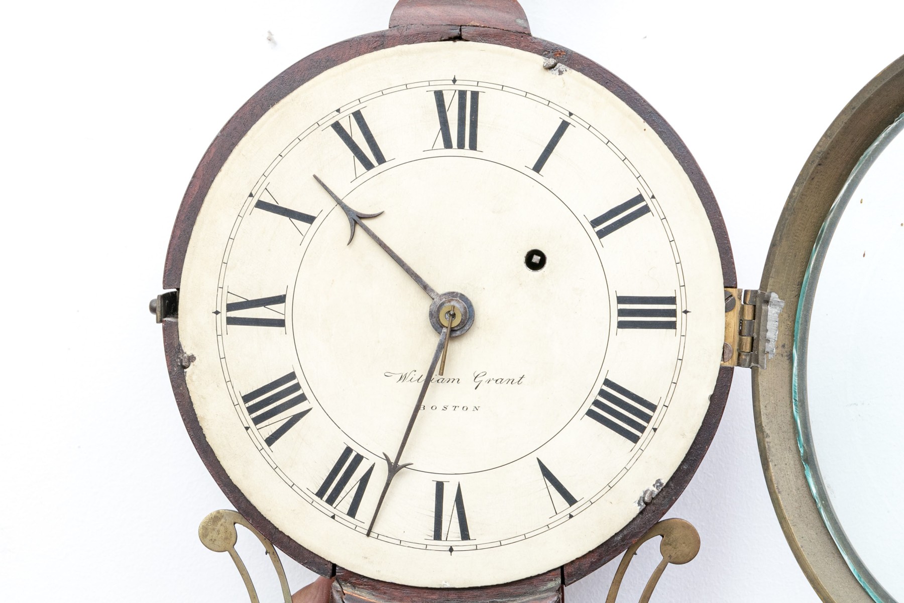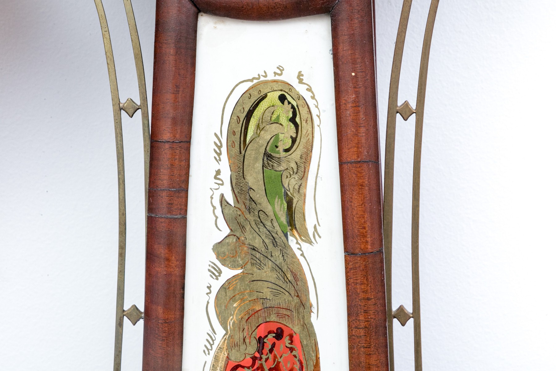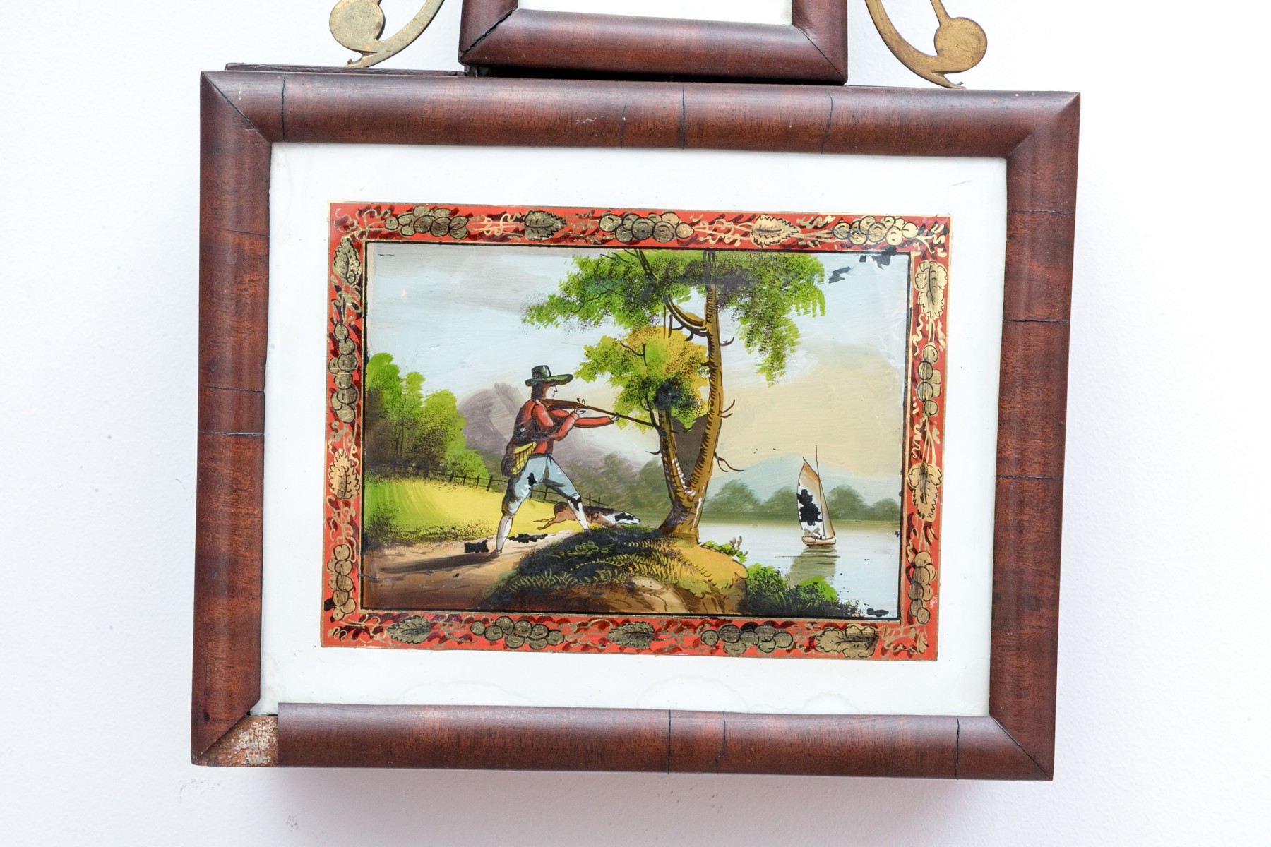 With fantastically carved and gilt eagle form finial. With pendulum. The wood frame with brass embellishments. Features inset eglomise panels, the bottom panel depicting a hunting scene. The circular clock face with roman numerals and signed "William Grant, Boston."