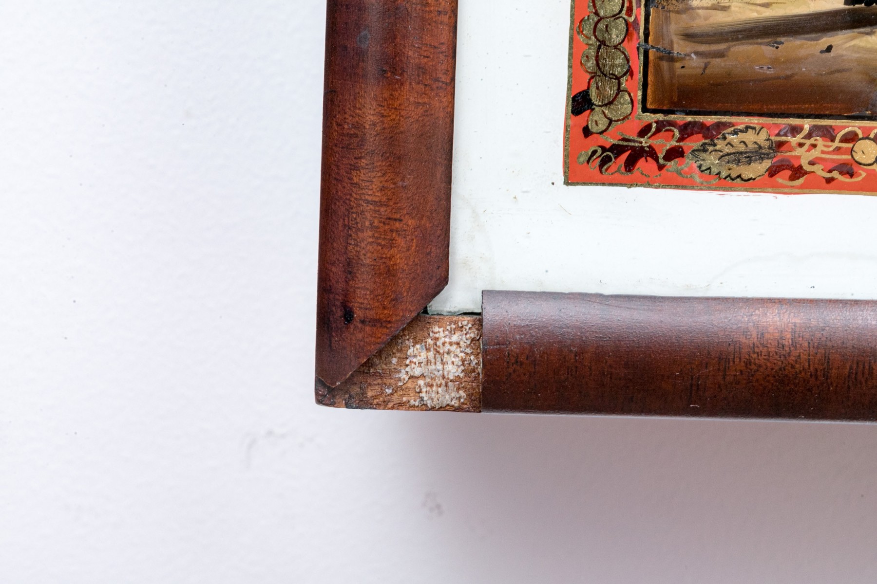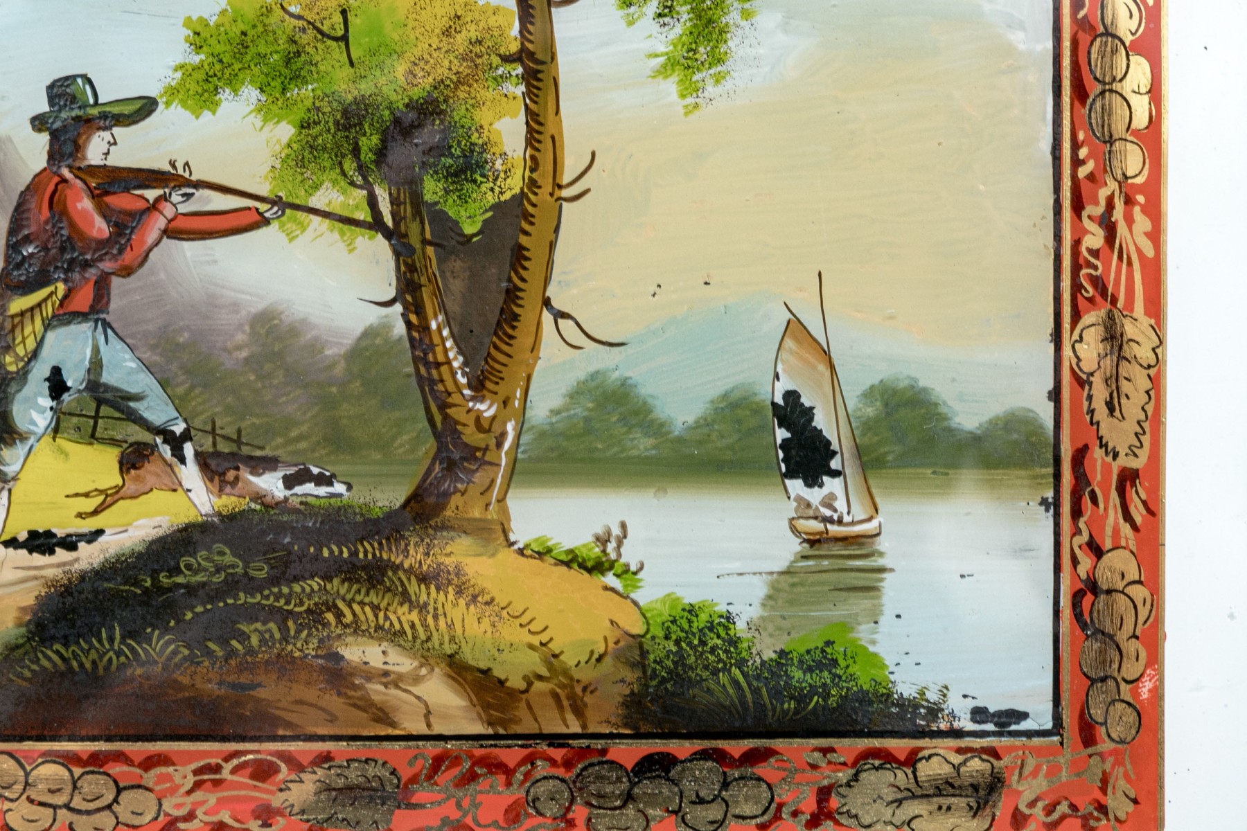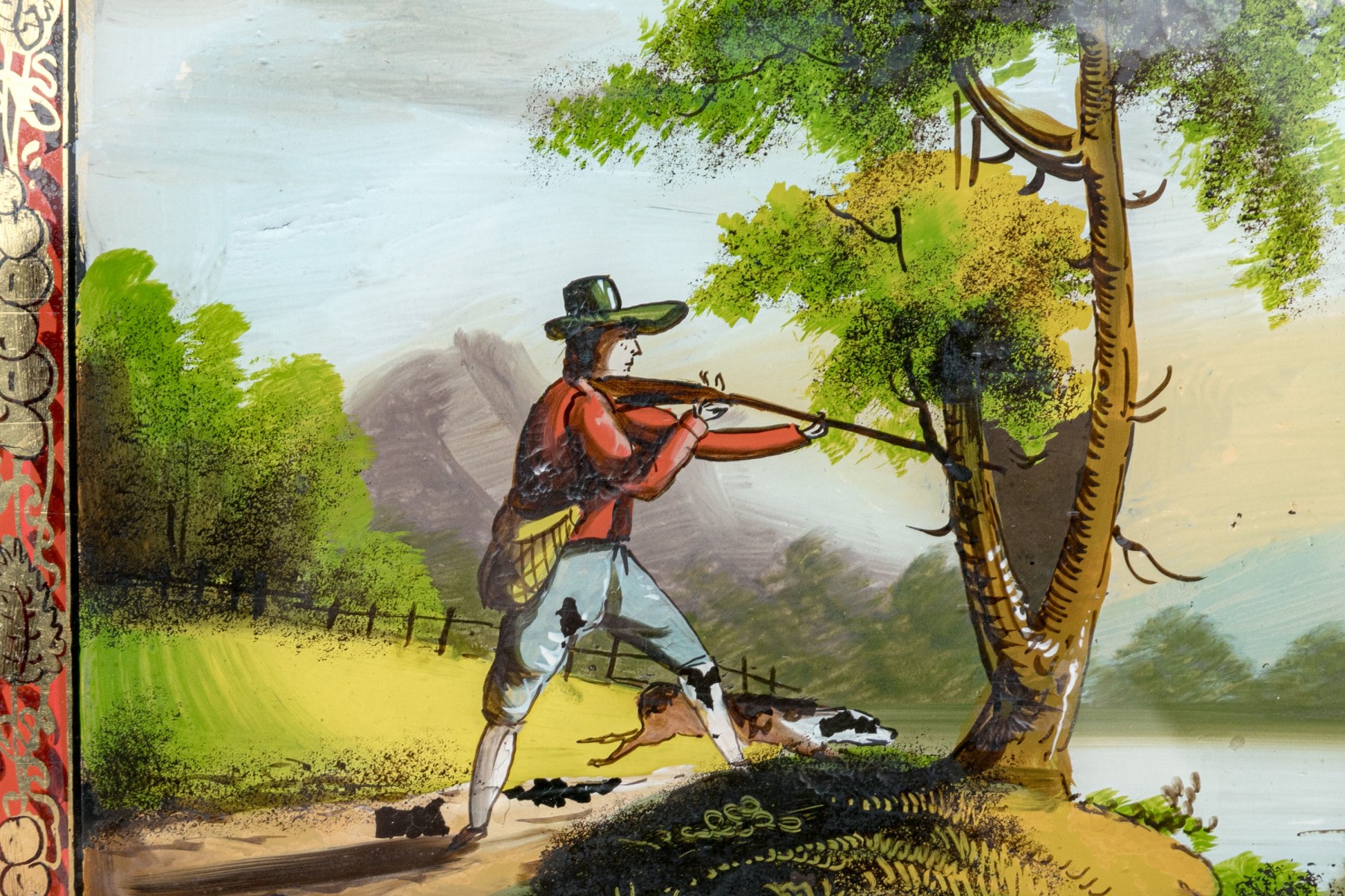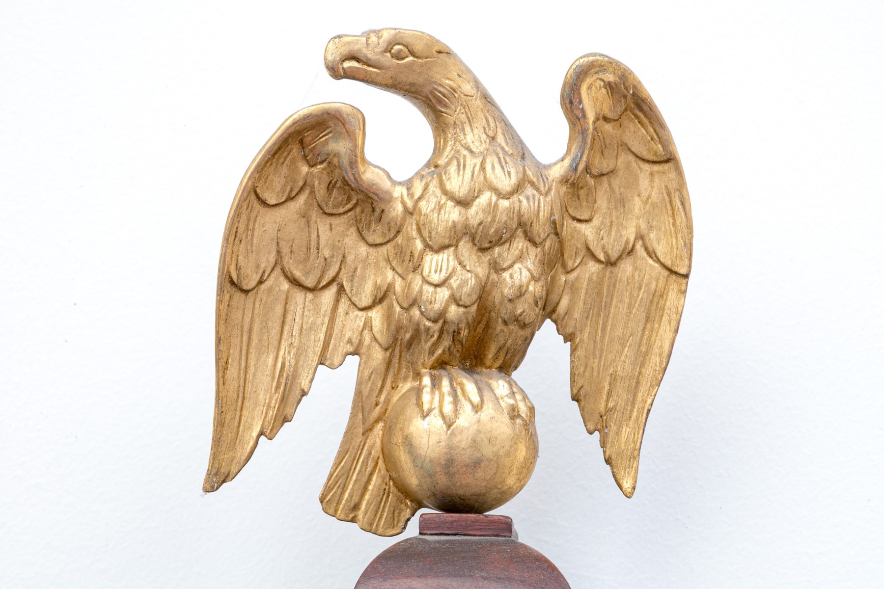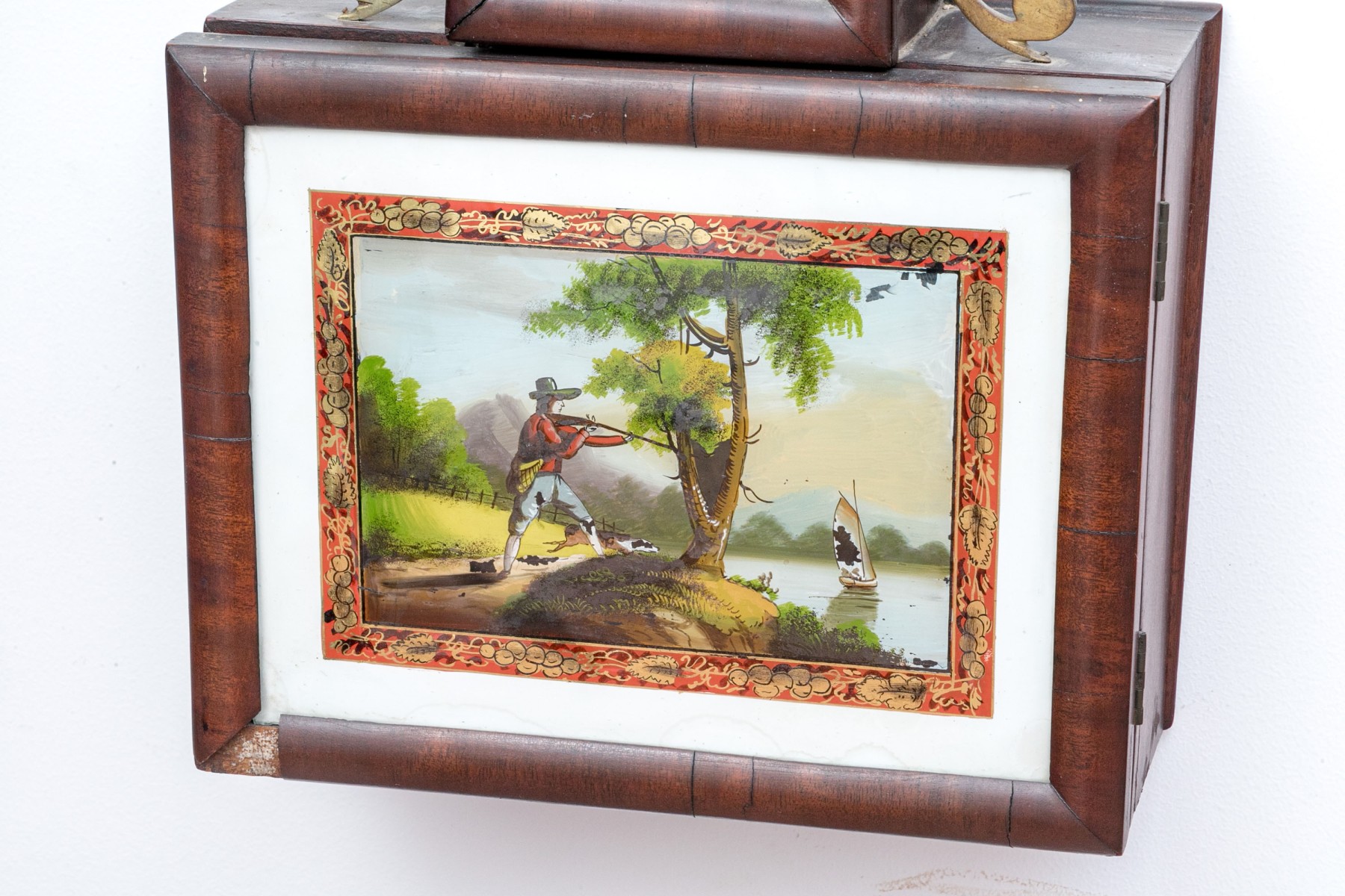With fantastically carved and gilt eagle form finial. With pendulum. The wood frame with brass embellishments. Features inset eglomise panels, the bottom panel depicting a hunting scene. The circular clock face with roman numerals and signed "William Grant, Boston."