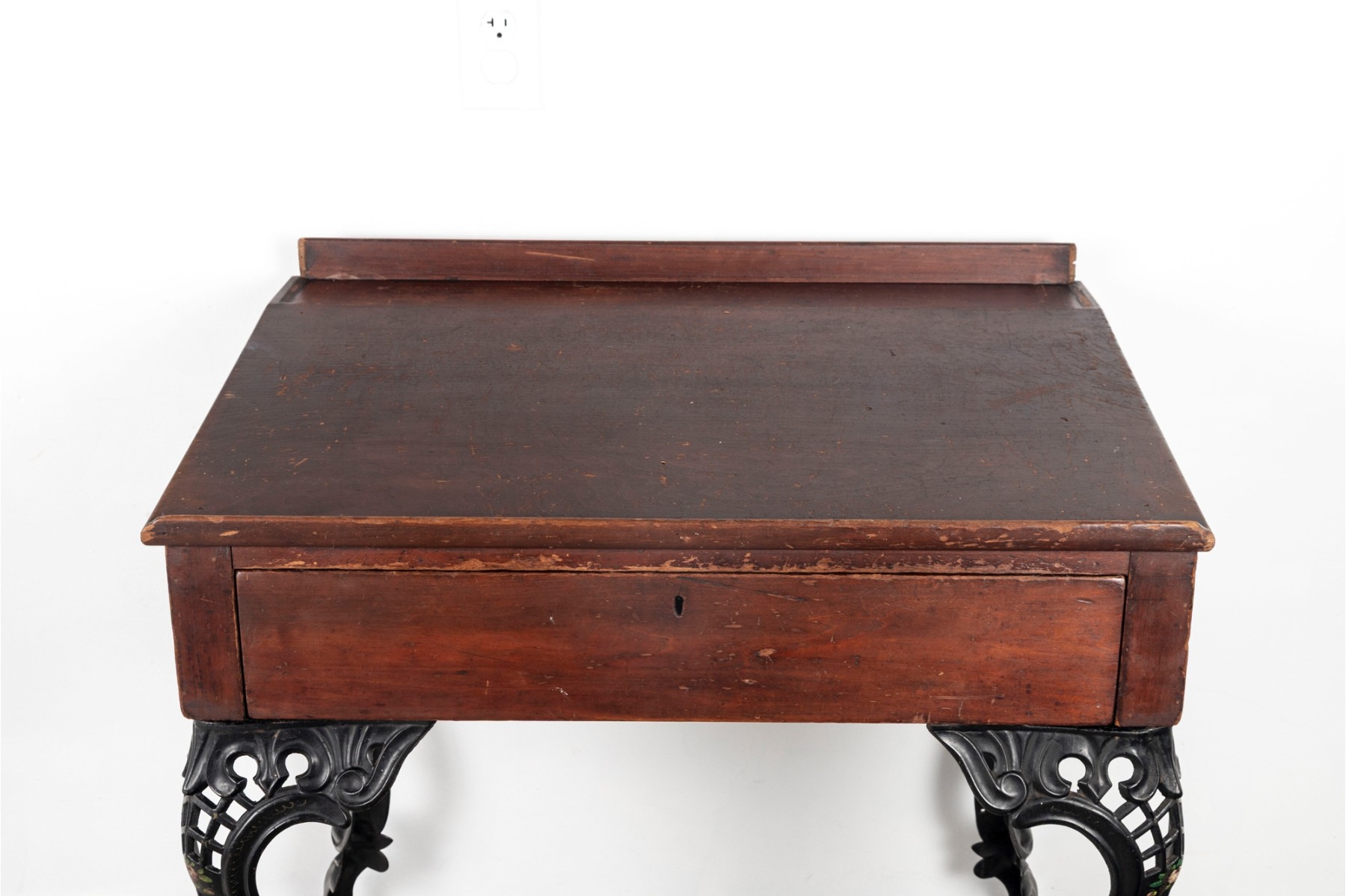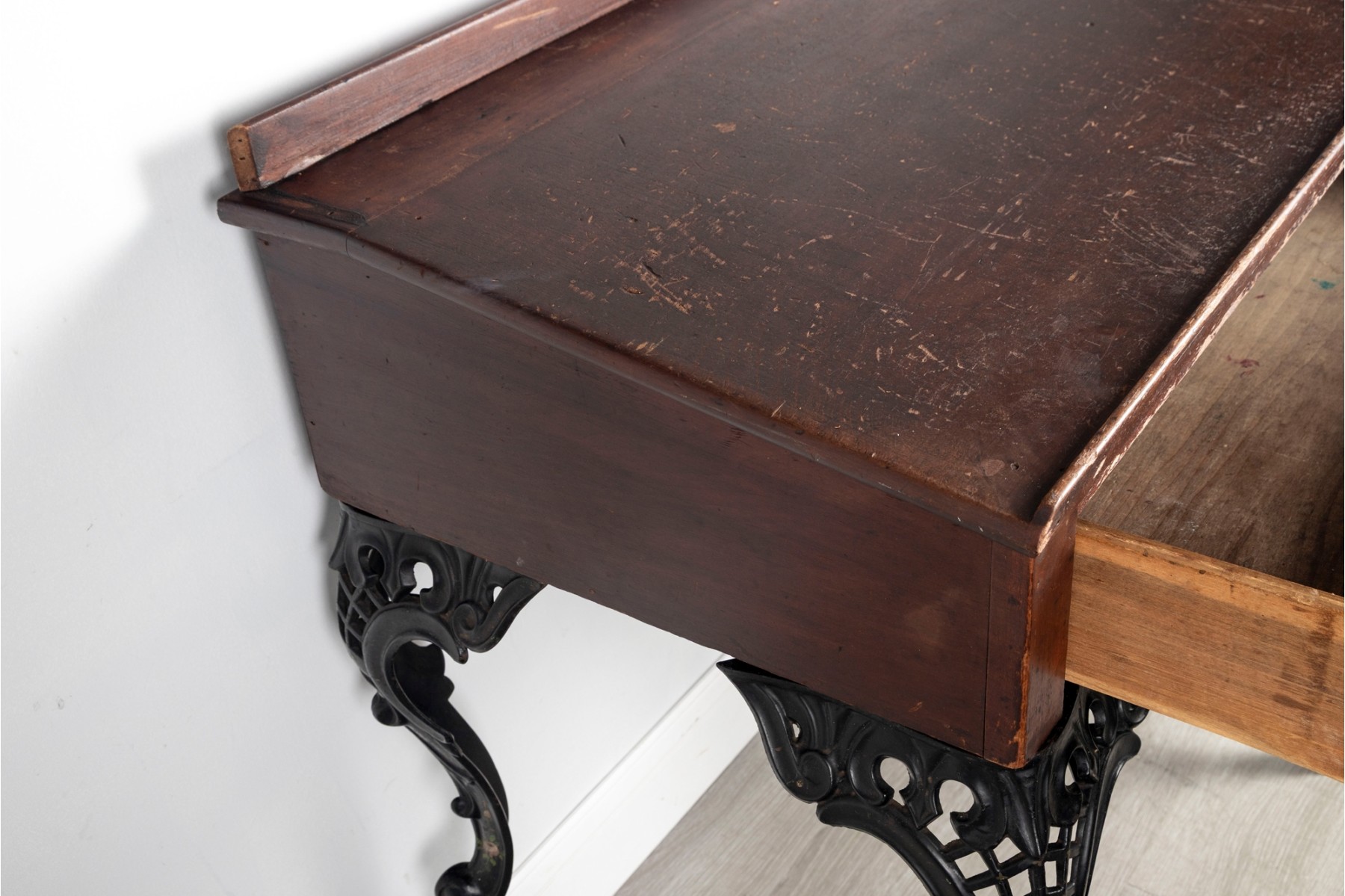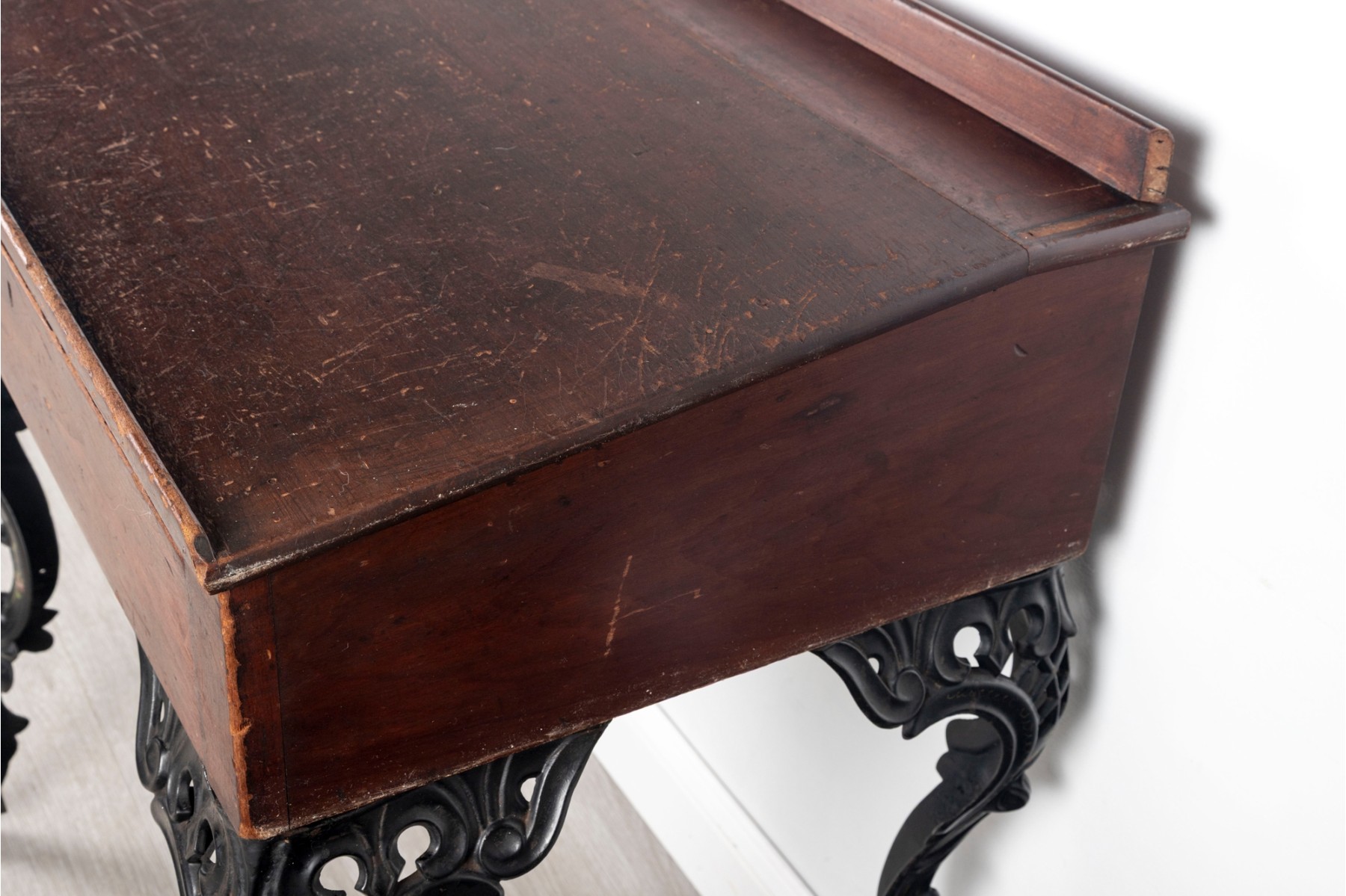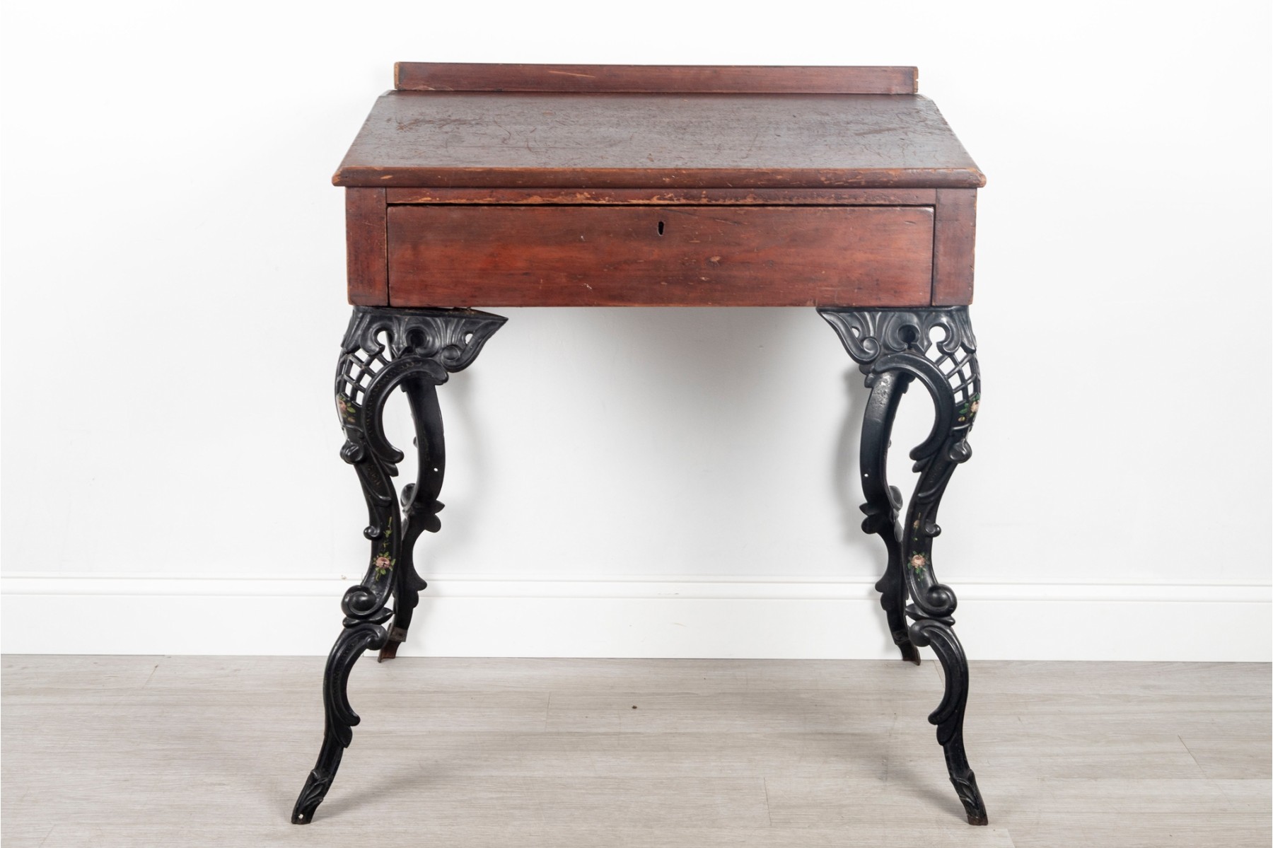 A gorgeous antique school desk with great Victorian appeal, crafted with a warm-toned medium brown wood case with a short back gallery and single drawer supported by four gorgeous black iron legs with shapely scrolled relief and pierced lattices.