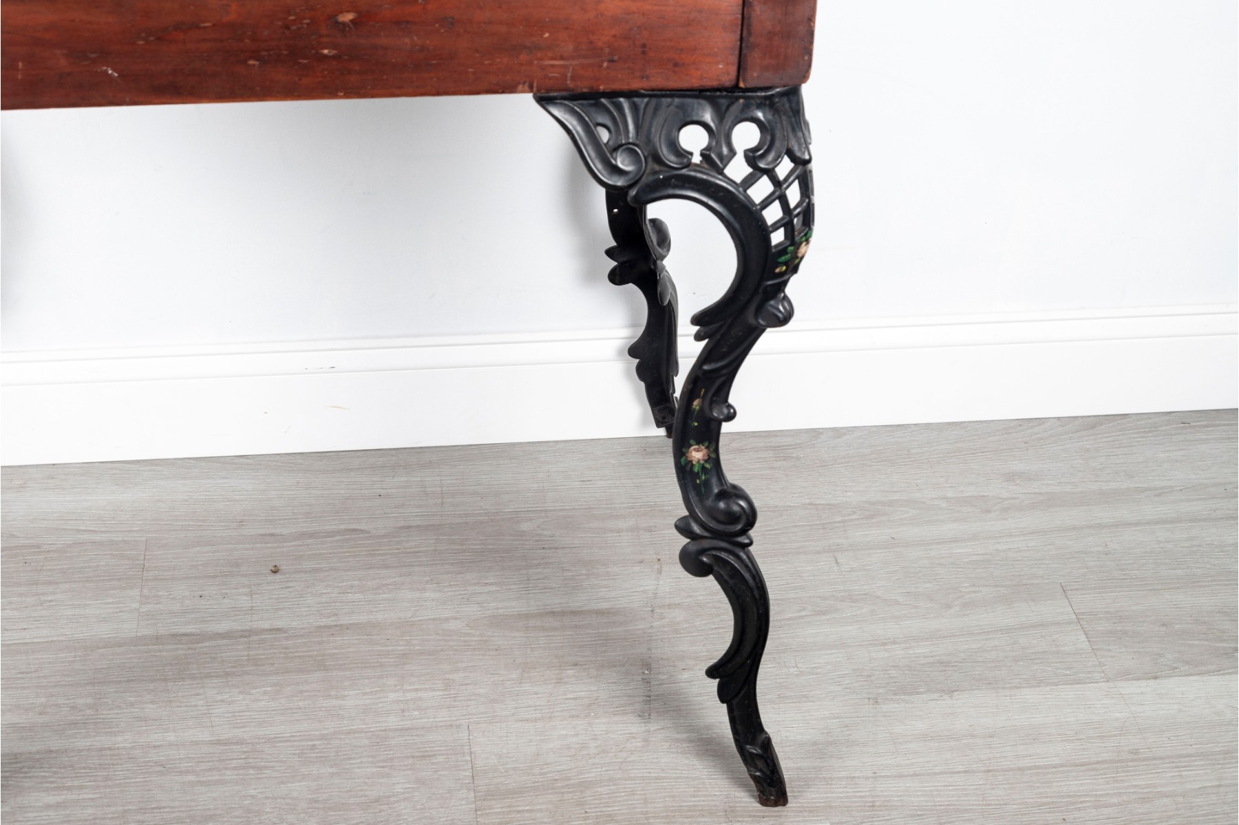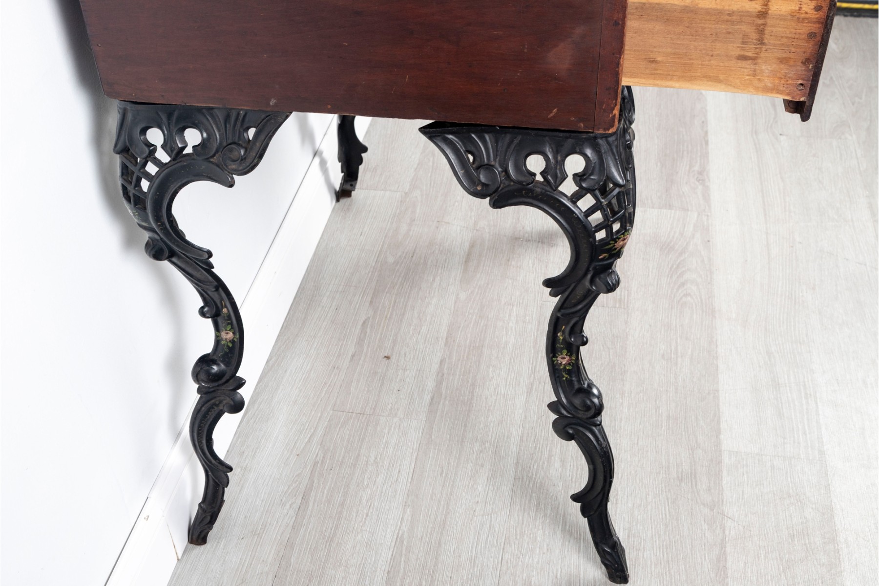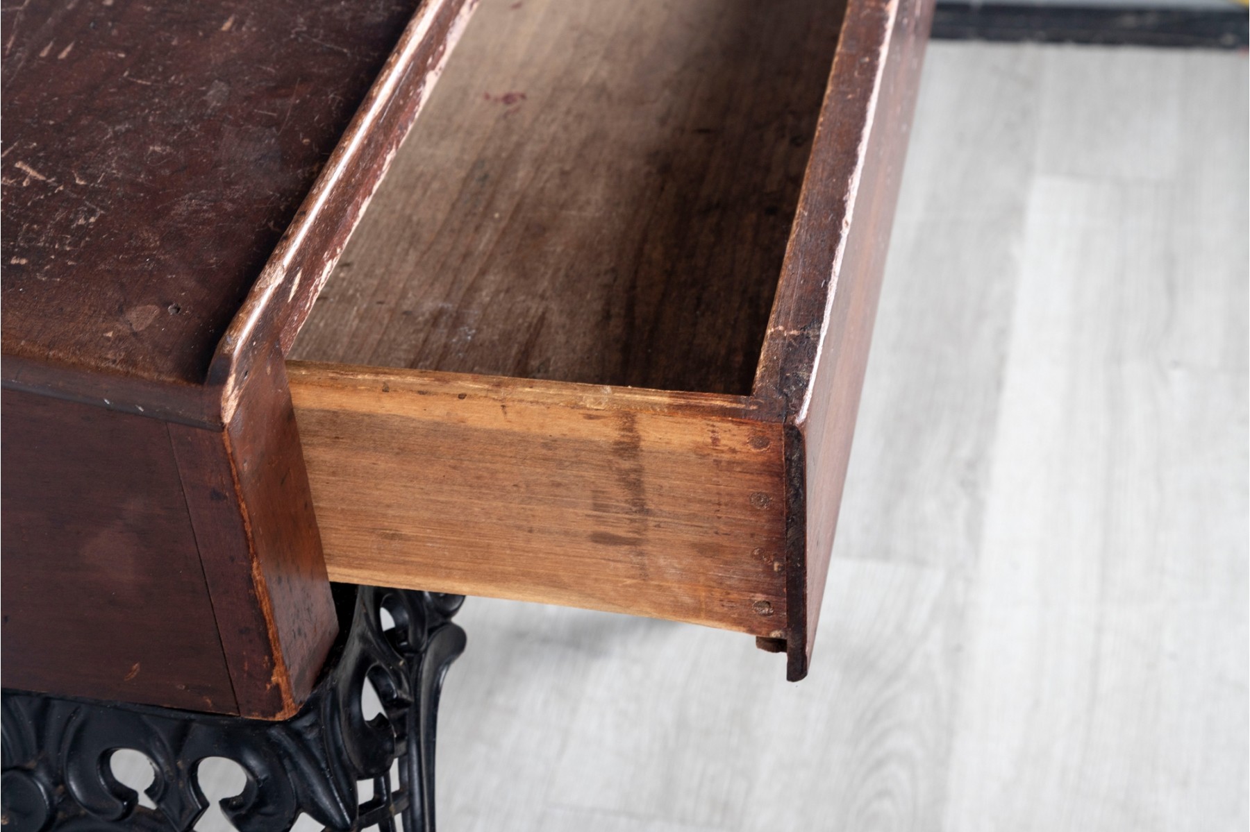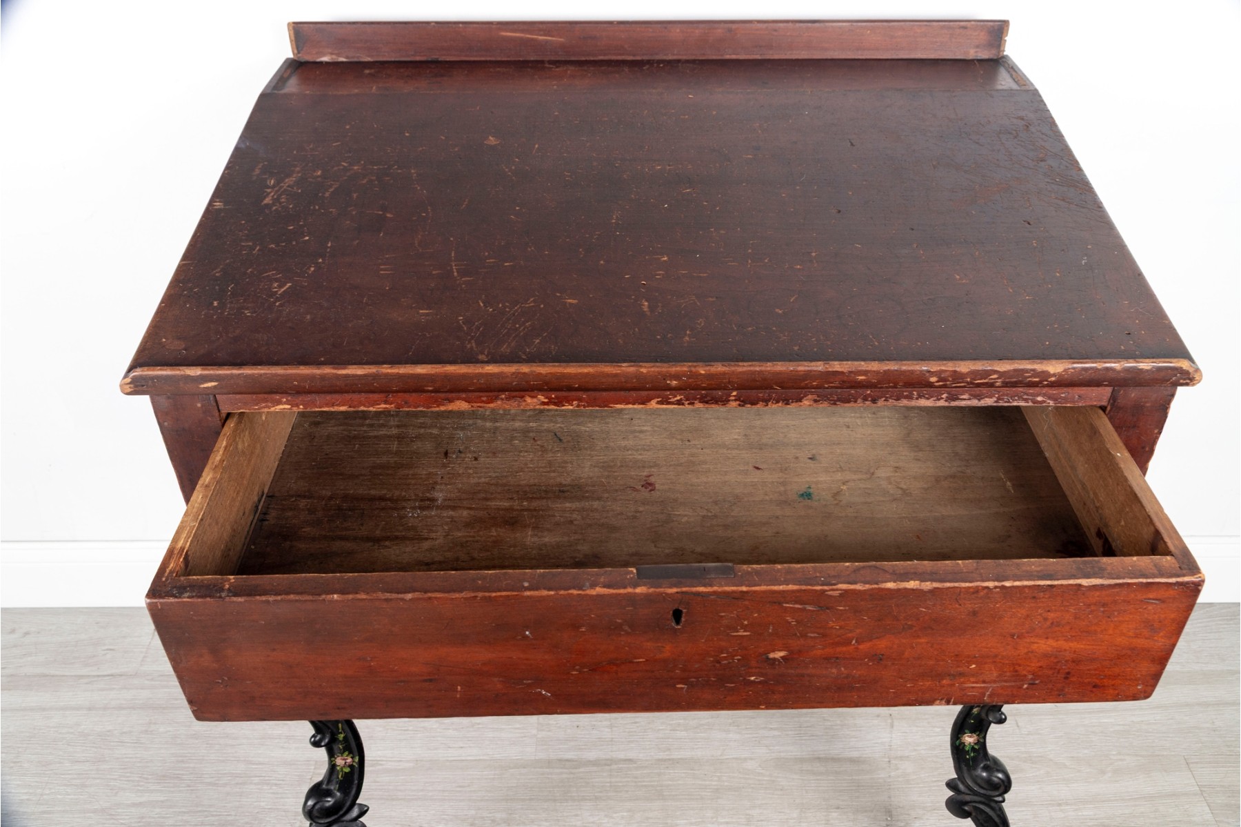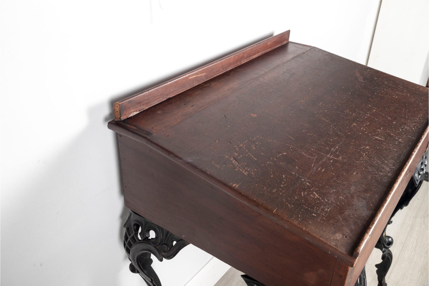 A gorgeous antique school desk with great Victorian appeal, crafted with a warm-toned medium brown wood case with a short back gallery and single drawer supported by four gorgeous black iron legs with shapely scrolled relief and pierced lattices.