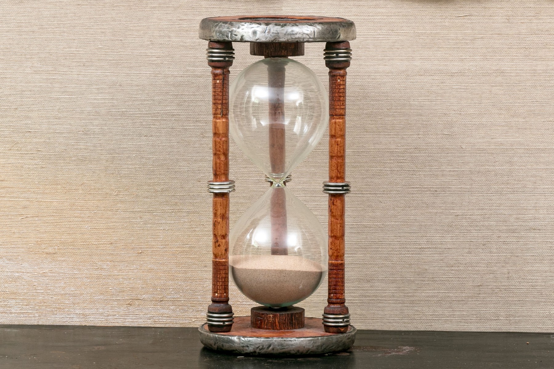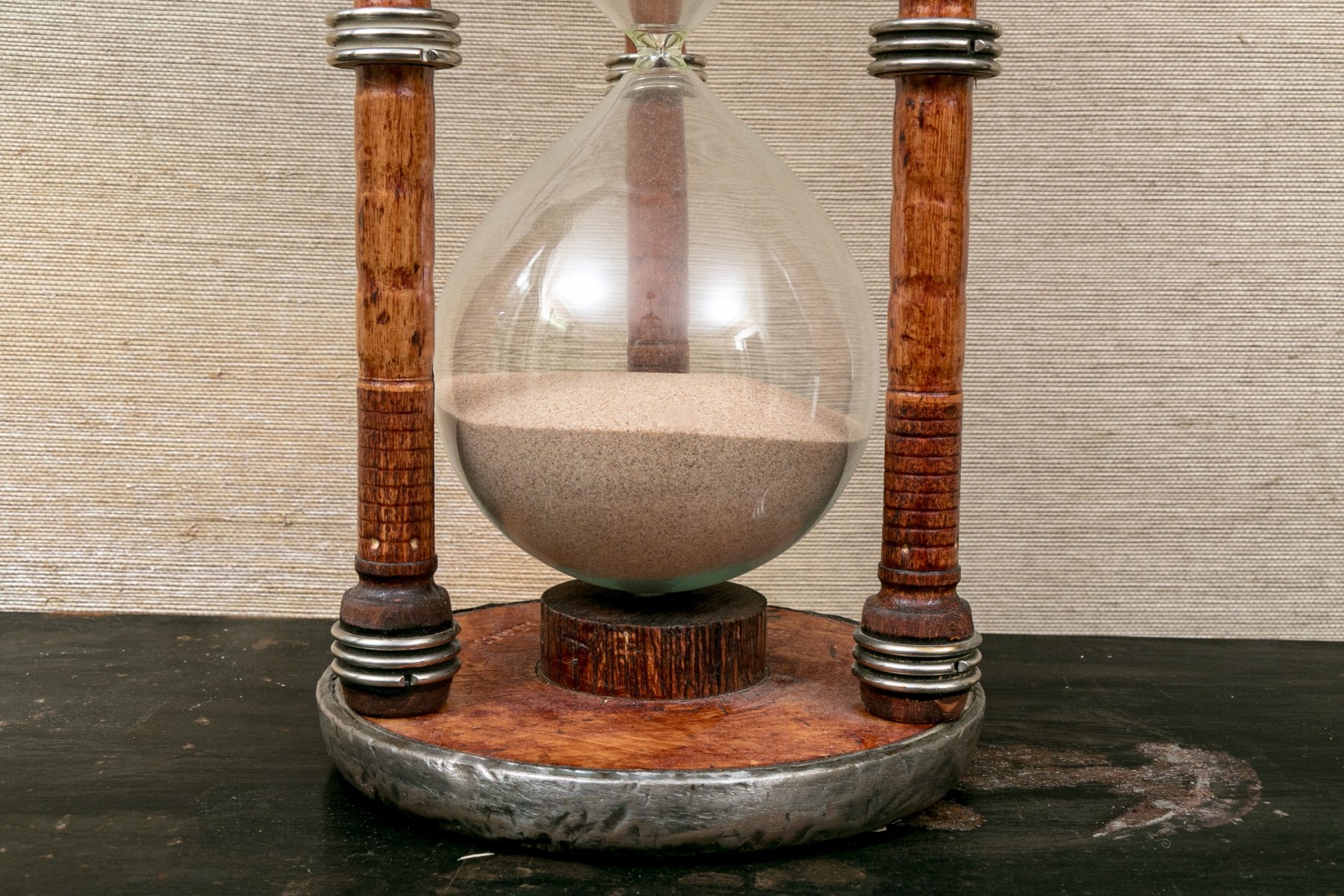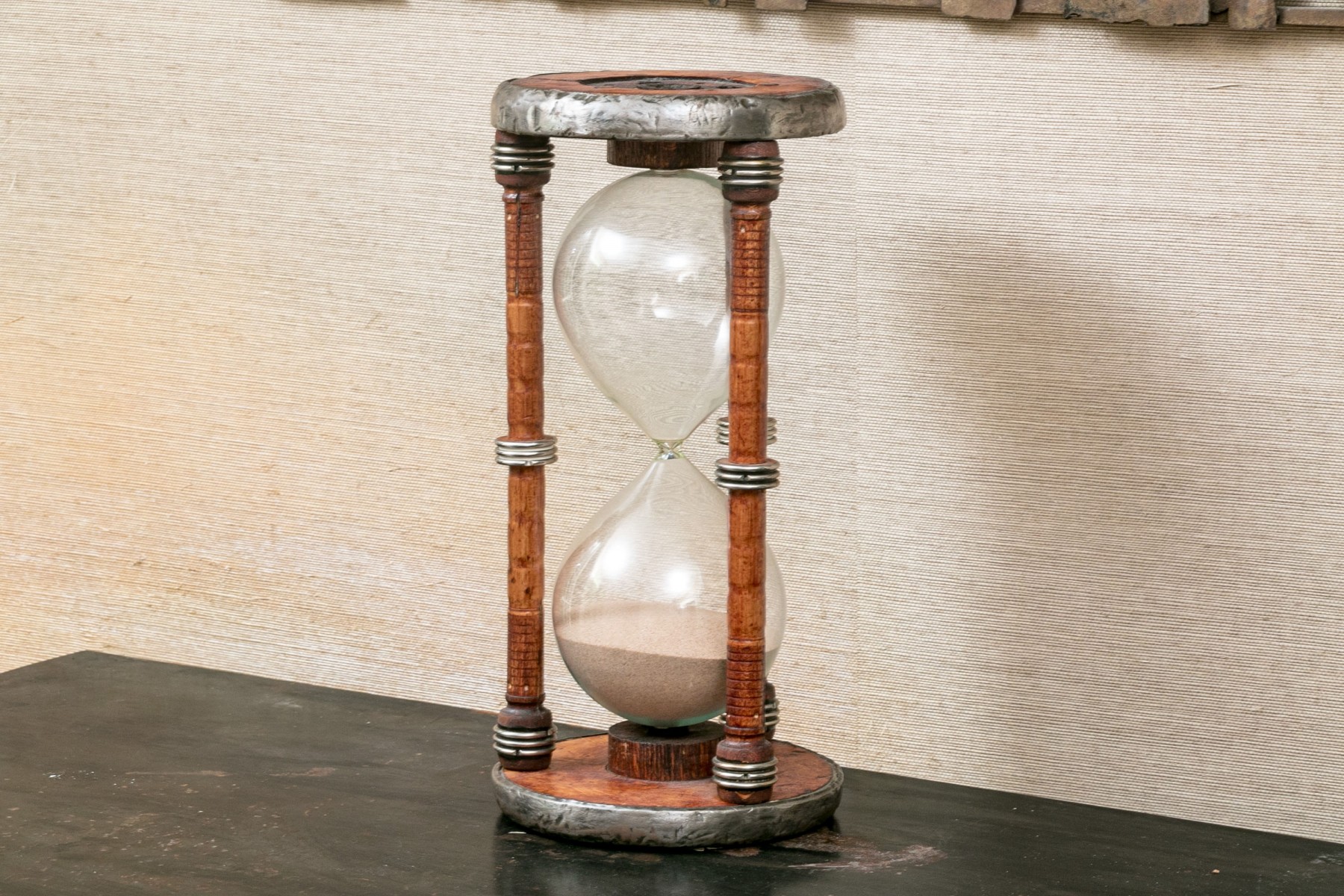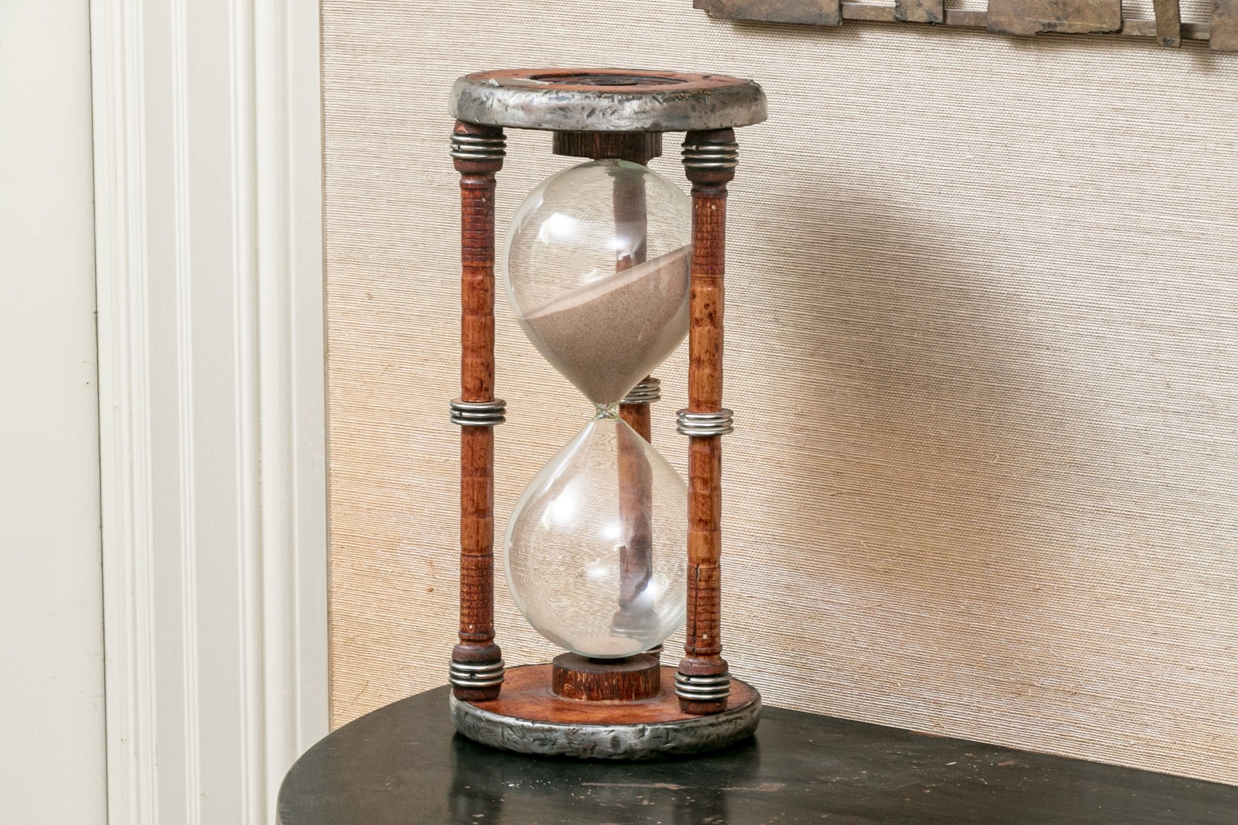 Metallic bound wood frame. Glass hourglass with sand to interior.