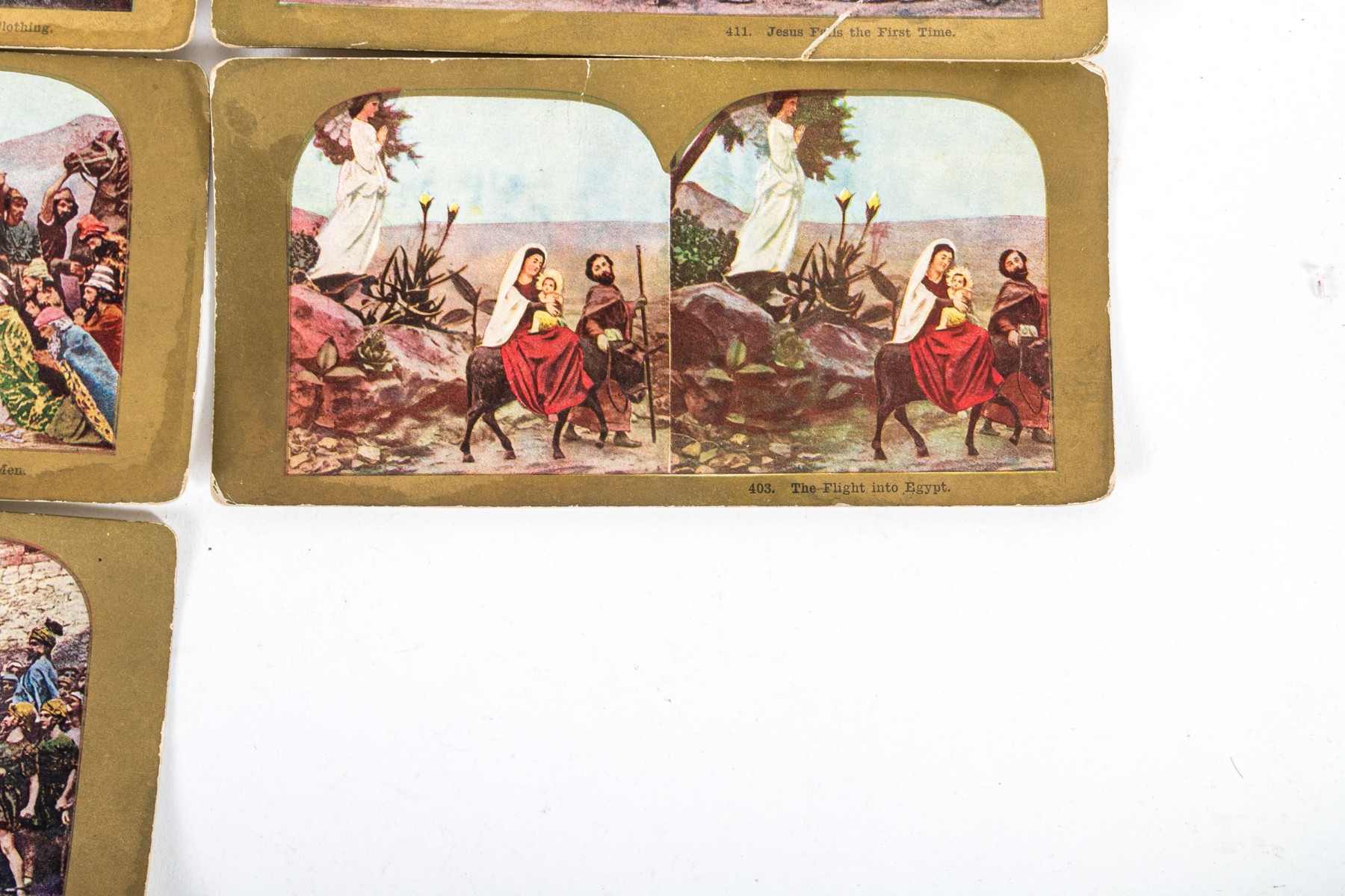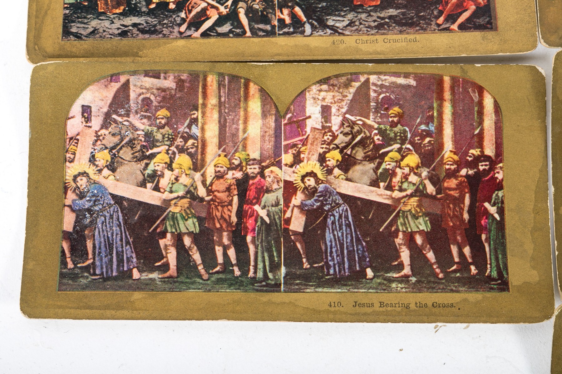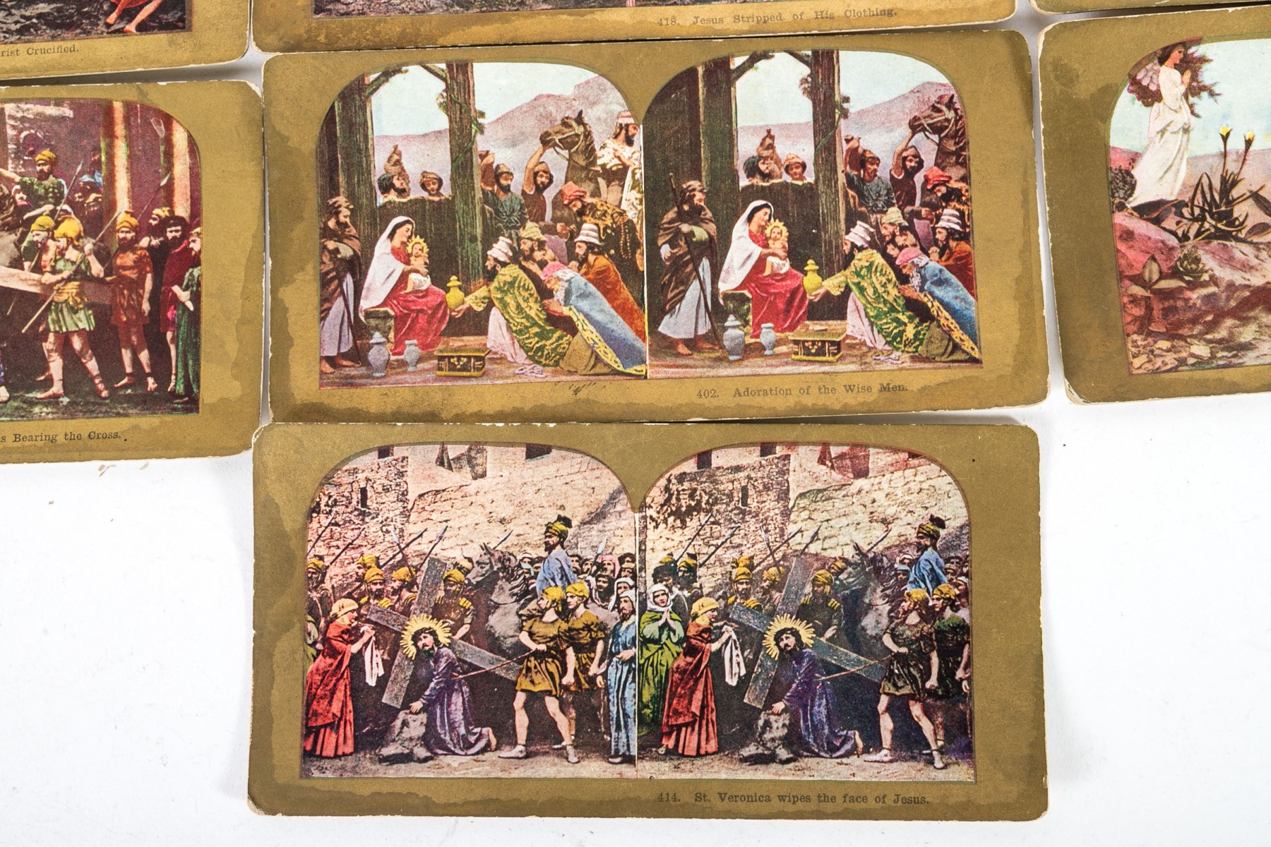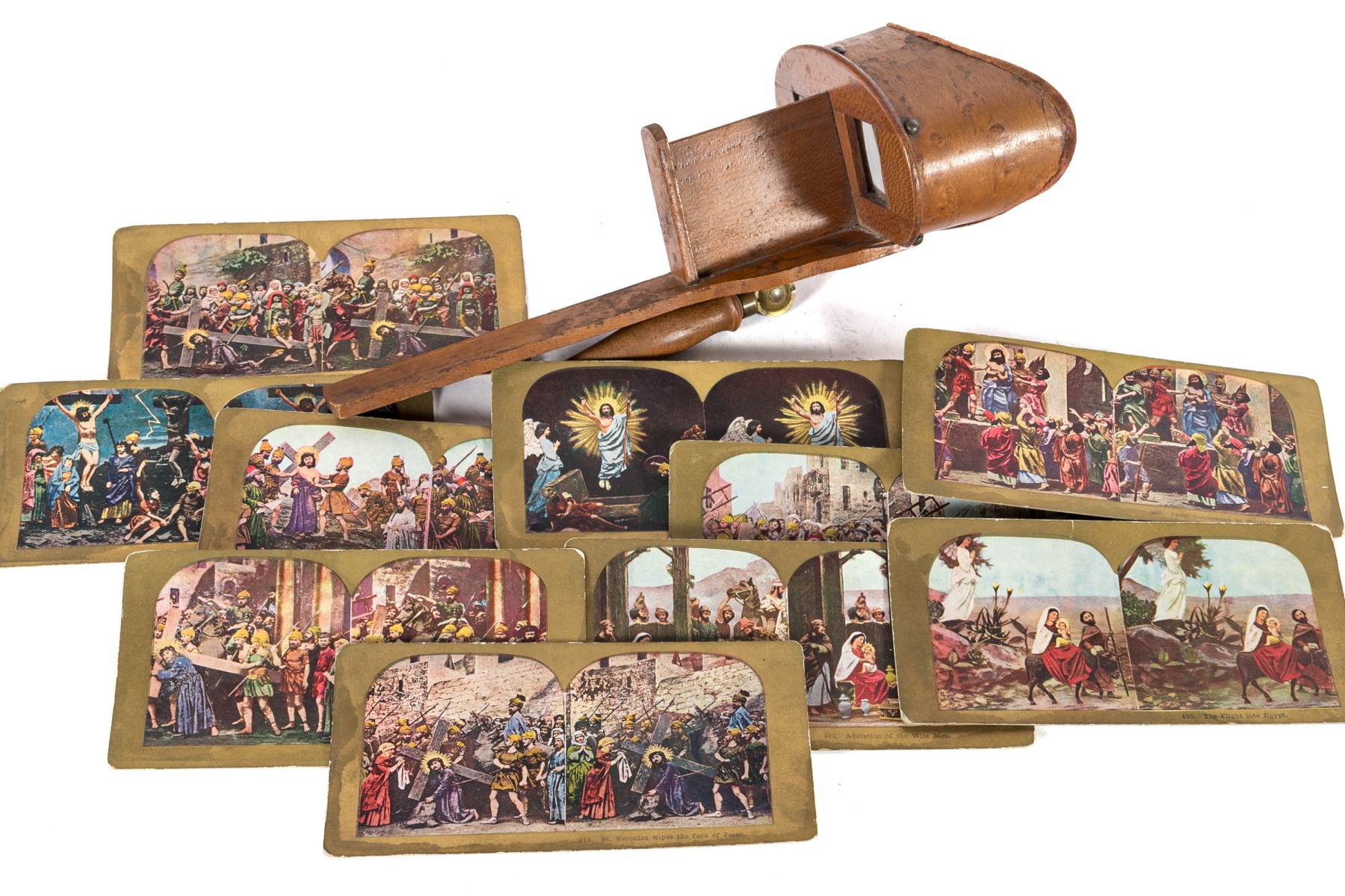 An antique Paragon Scope Keystone View Co. stereoscope in richly hued, warm-toned medium brown wood. Accompanied by a collection of gilt and colored stereoview cards depicting Christian scenes.