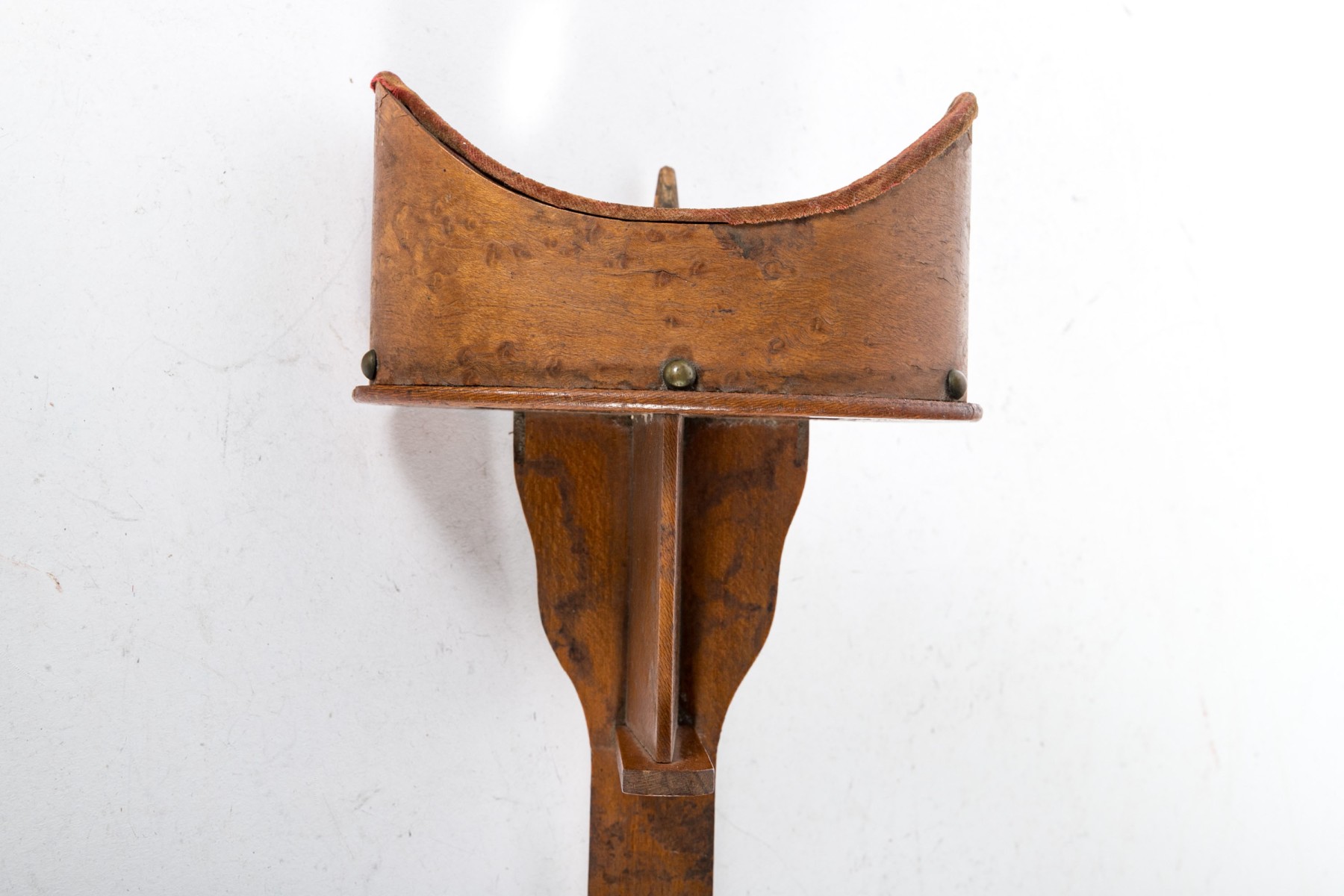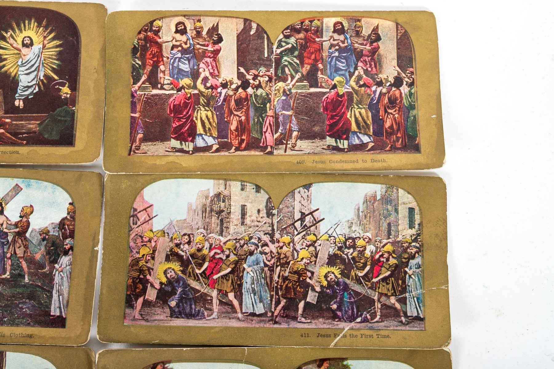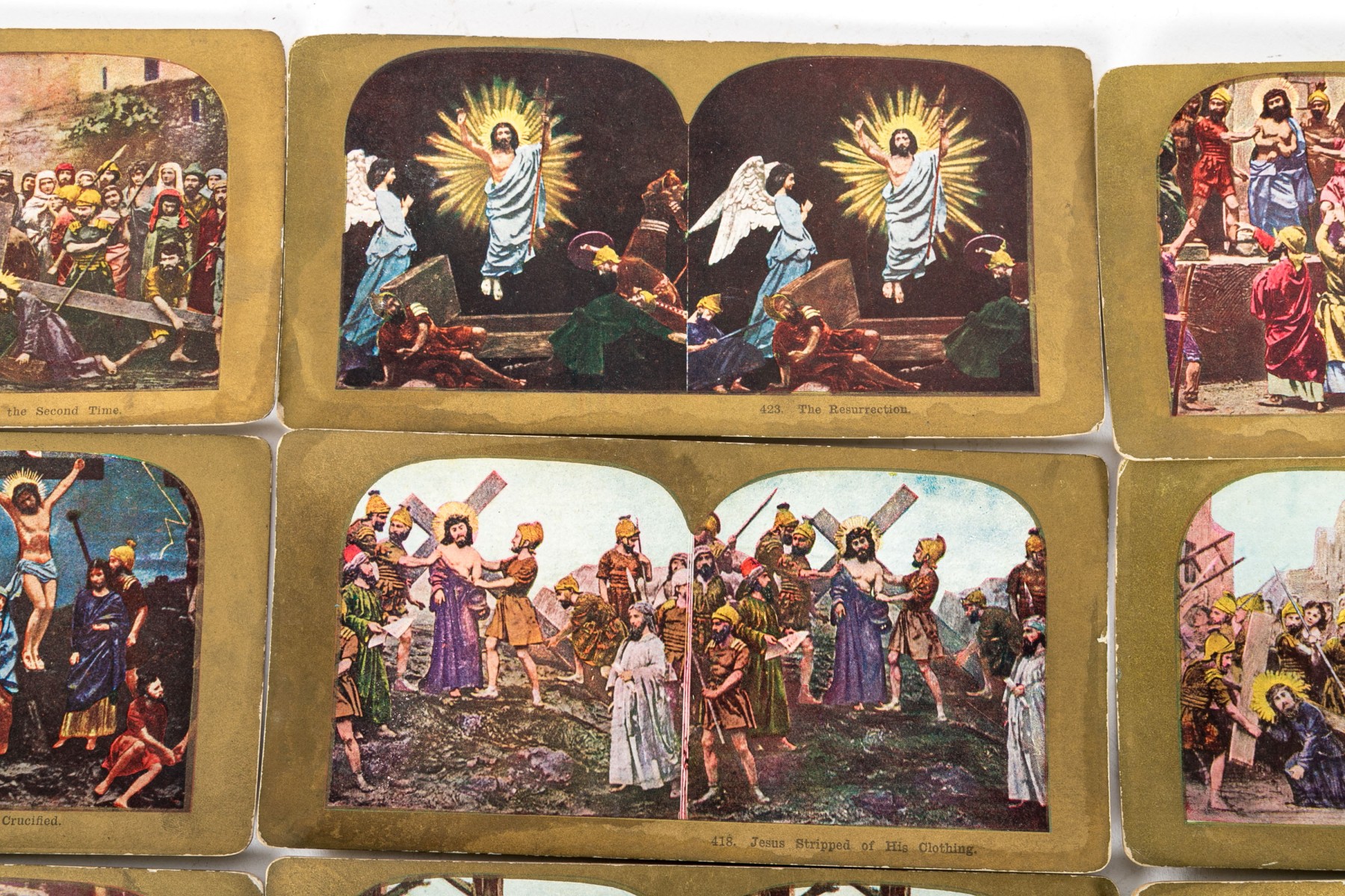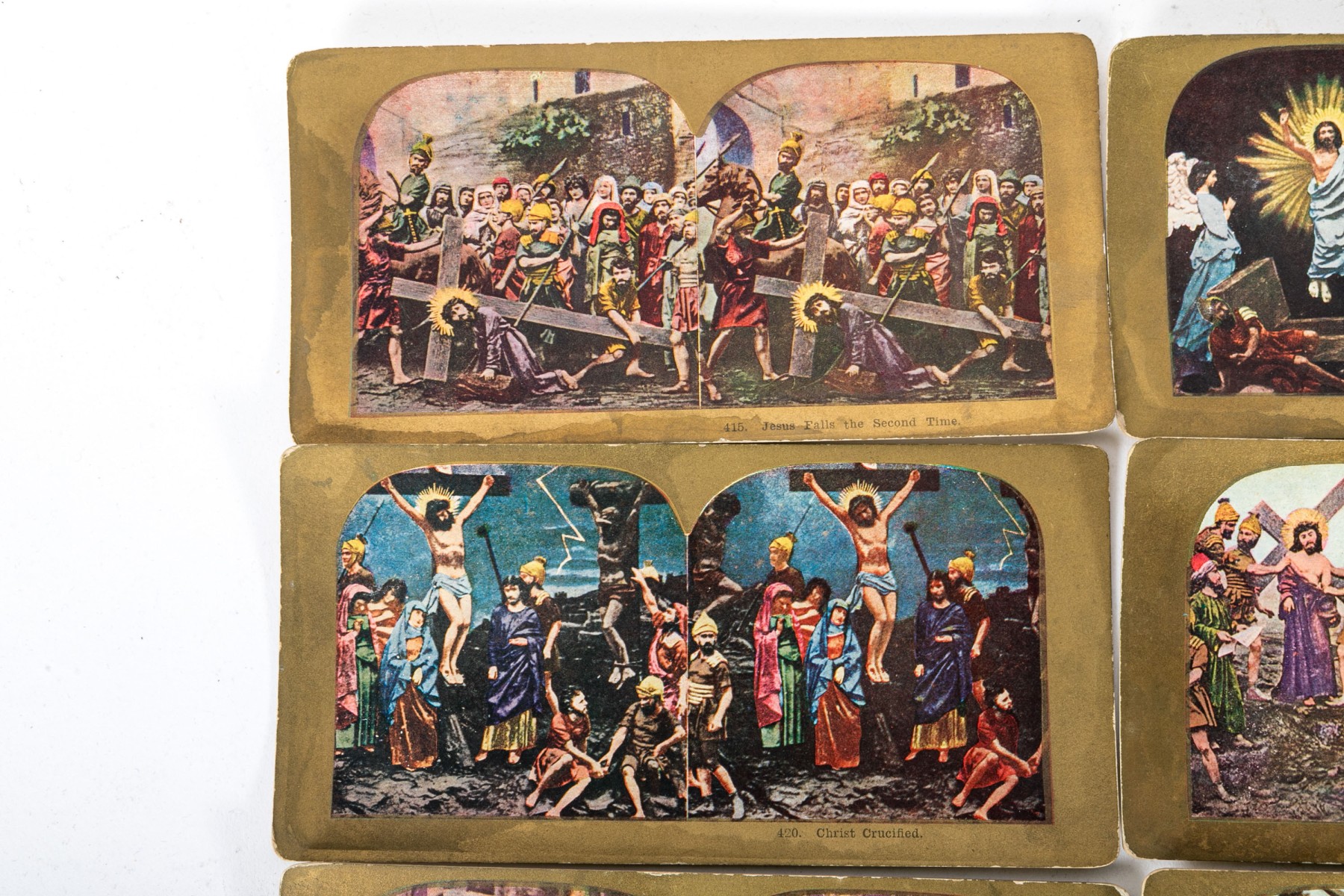 An antique Paragon Scope Keystone View Co. stereoscope in richly hued, warm-toned medium brown wood. Accompanied by a collection of gilt and colored stereoview cards depicting Christian scenes.