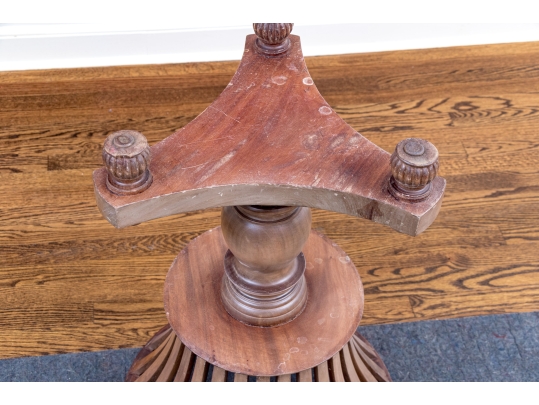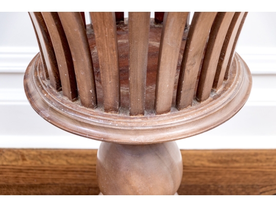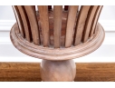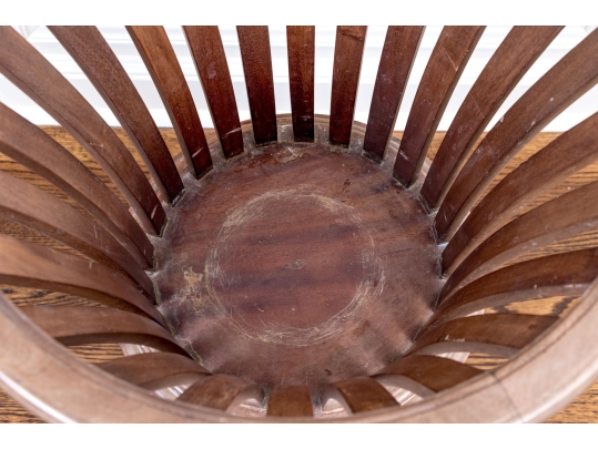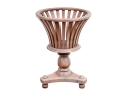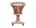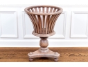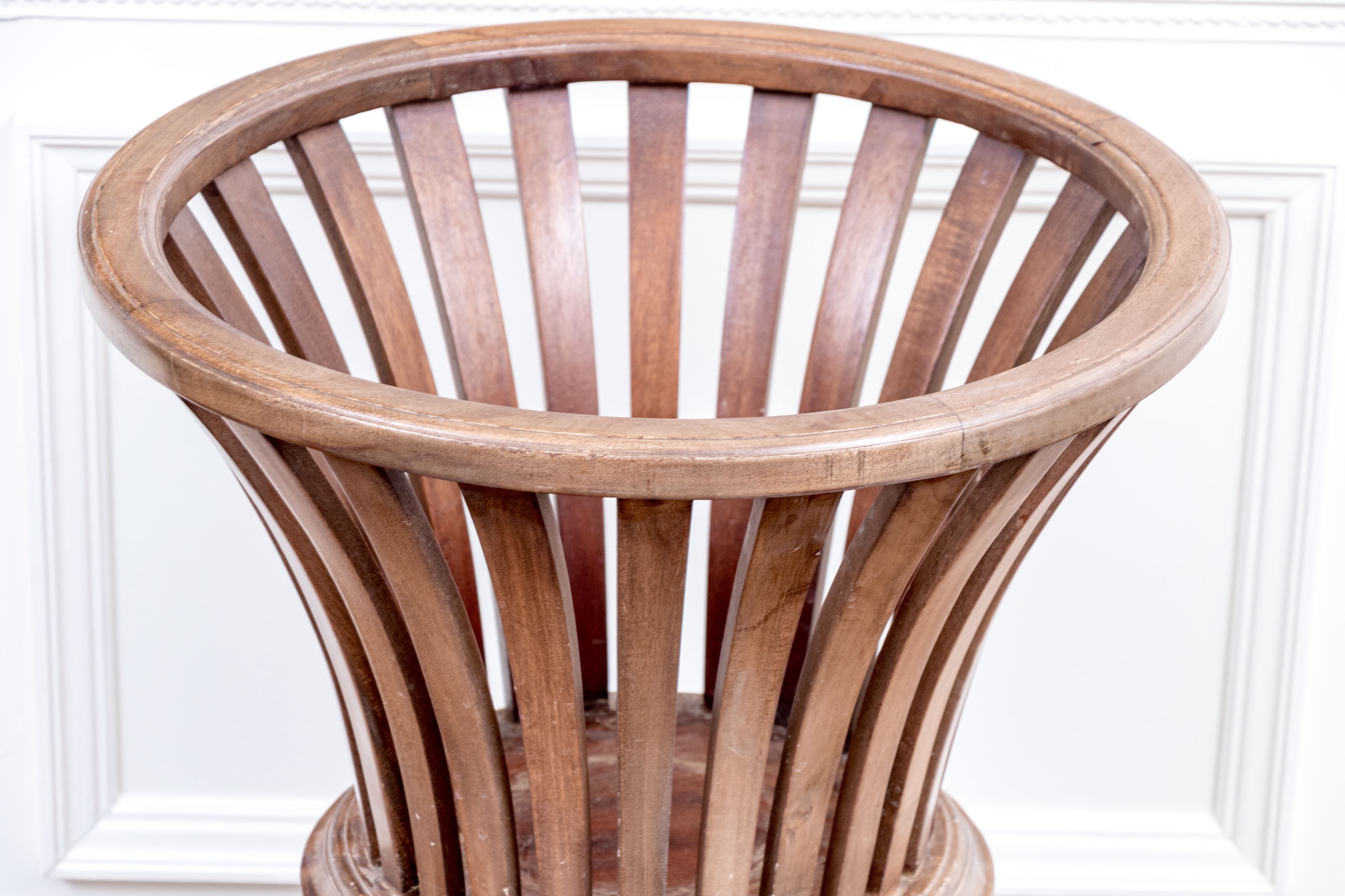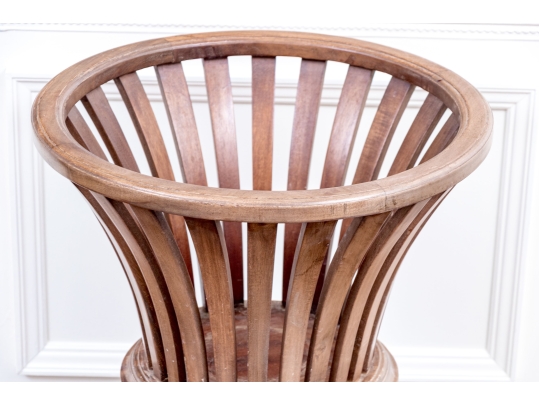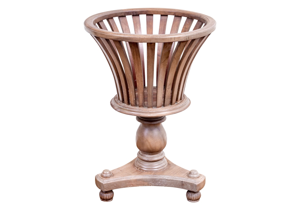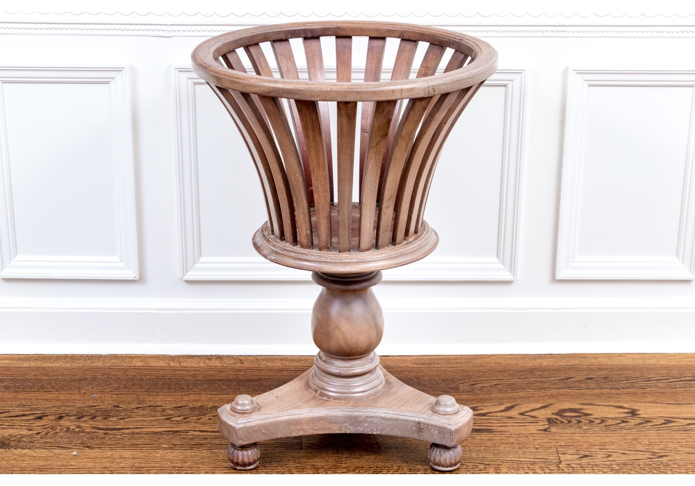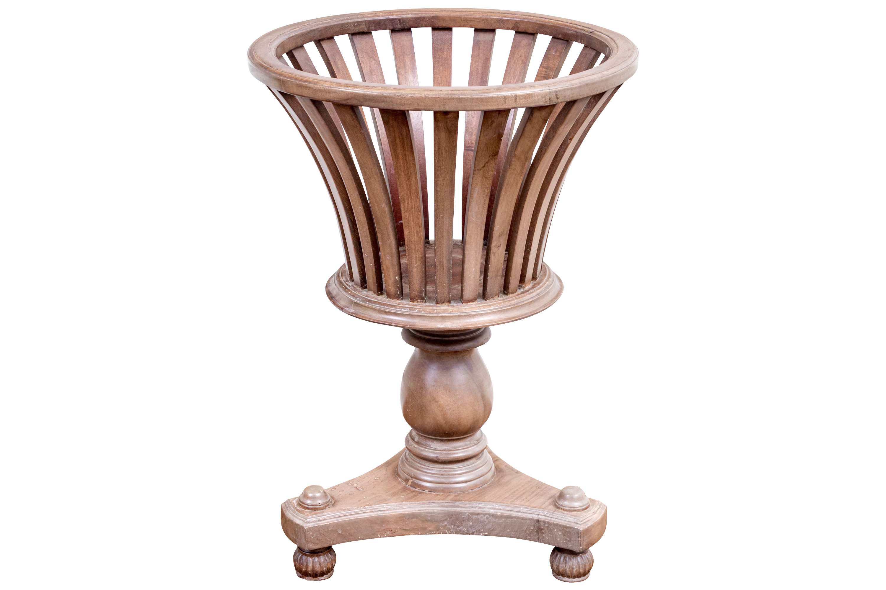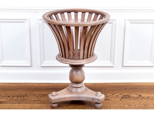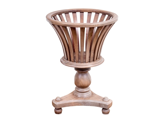 An openwork wooden basket made of curved staves on a carved frame. Raised on a baluster support mounted on a tripod base with raised knobs and ribbed ball feet.
