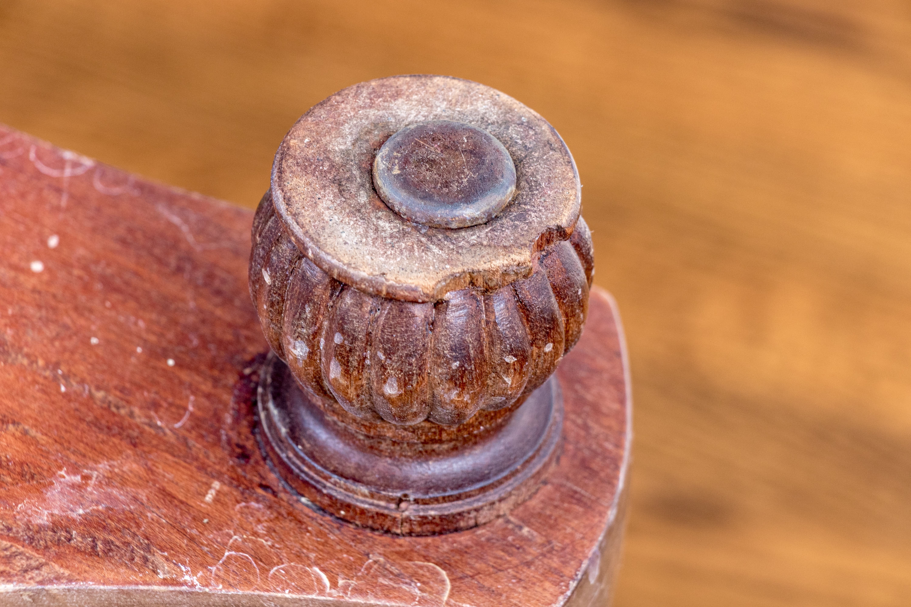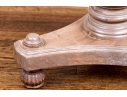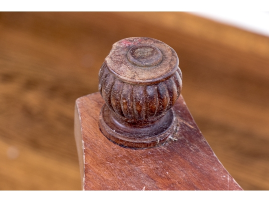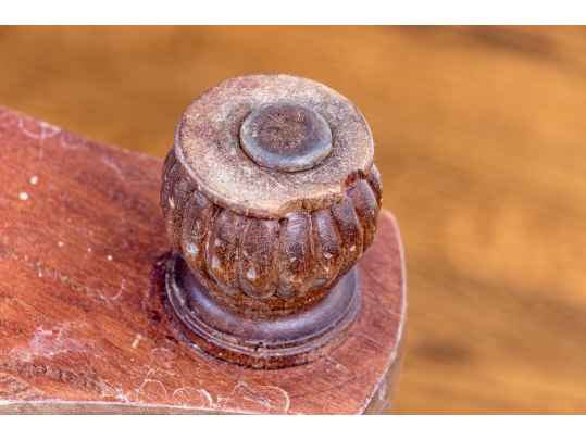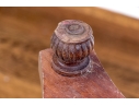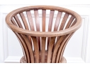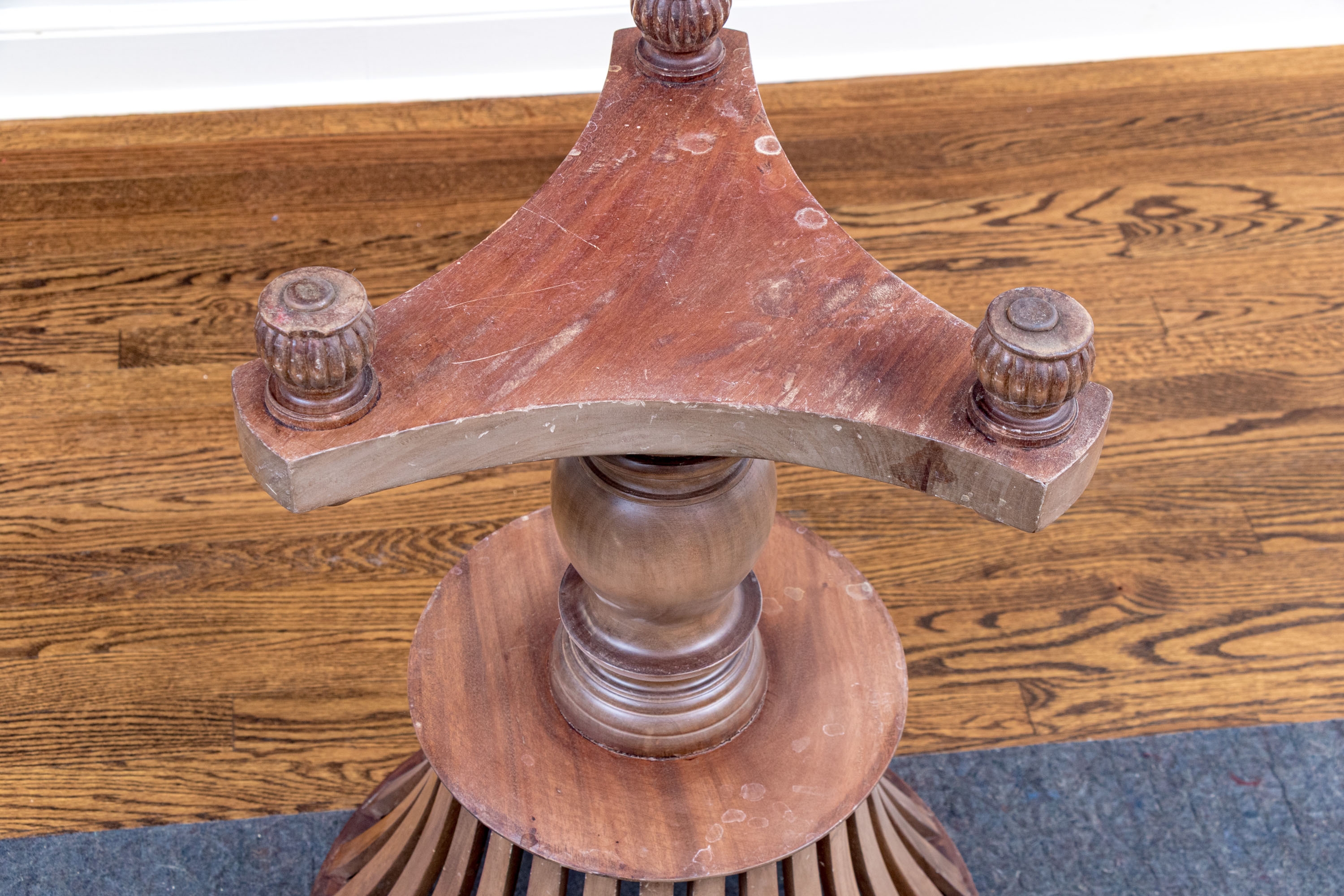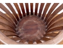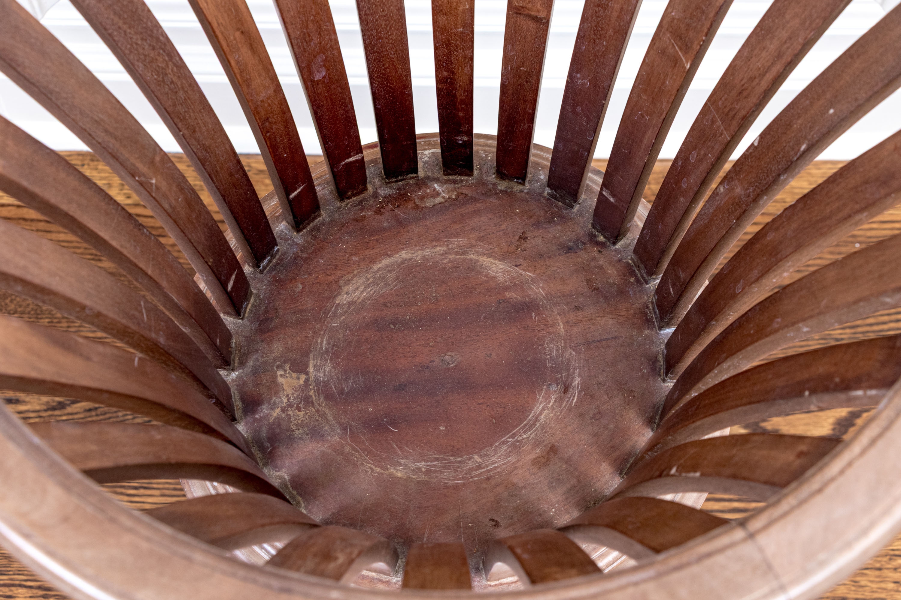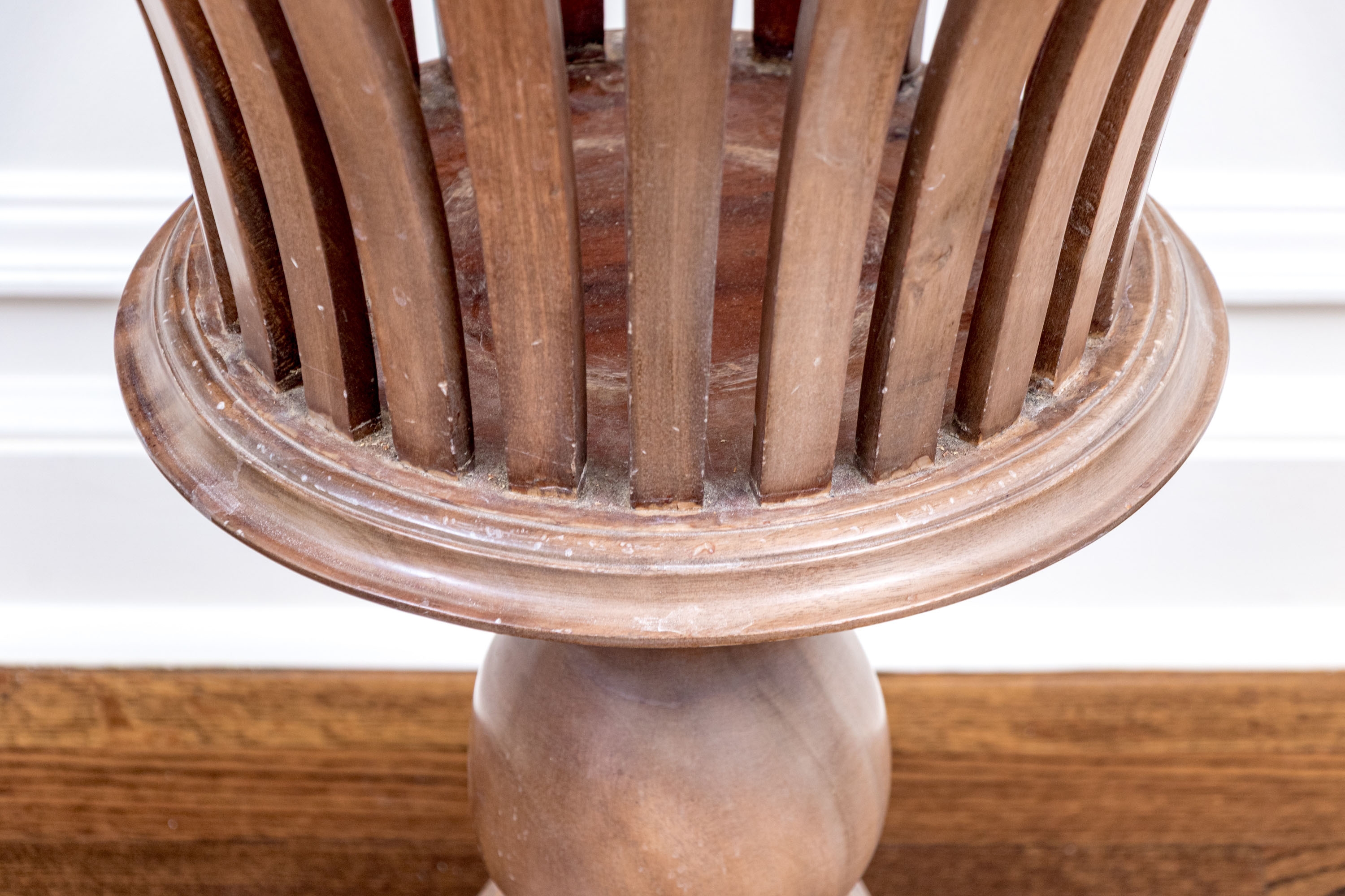 An openwork wooden basket made of curved staves on a carved frame. Raised on a baluster support mounted on a tripod base with raised knobs and ribbed ball feet.