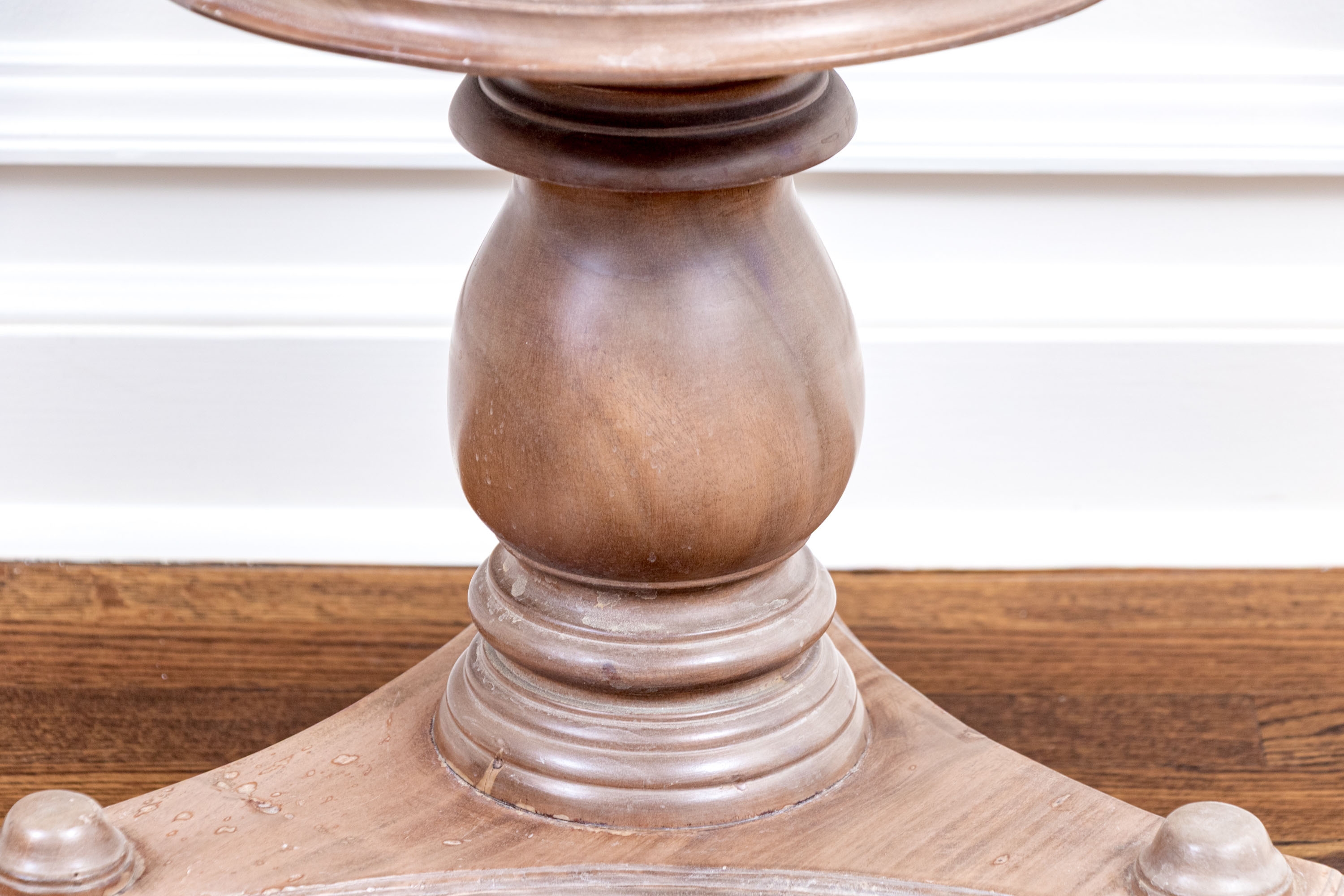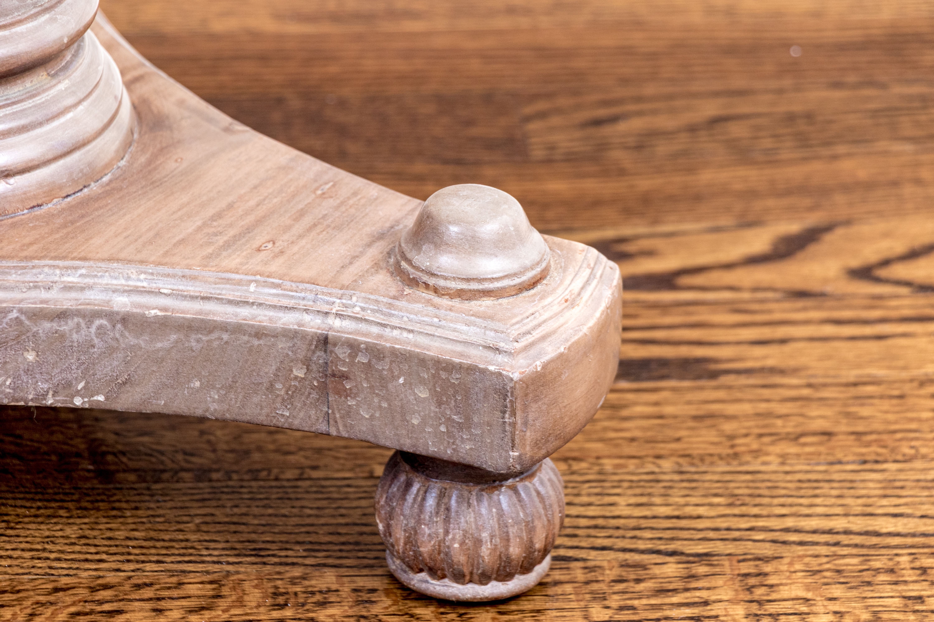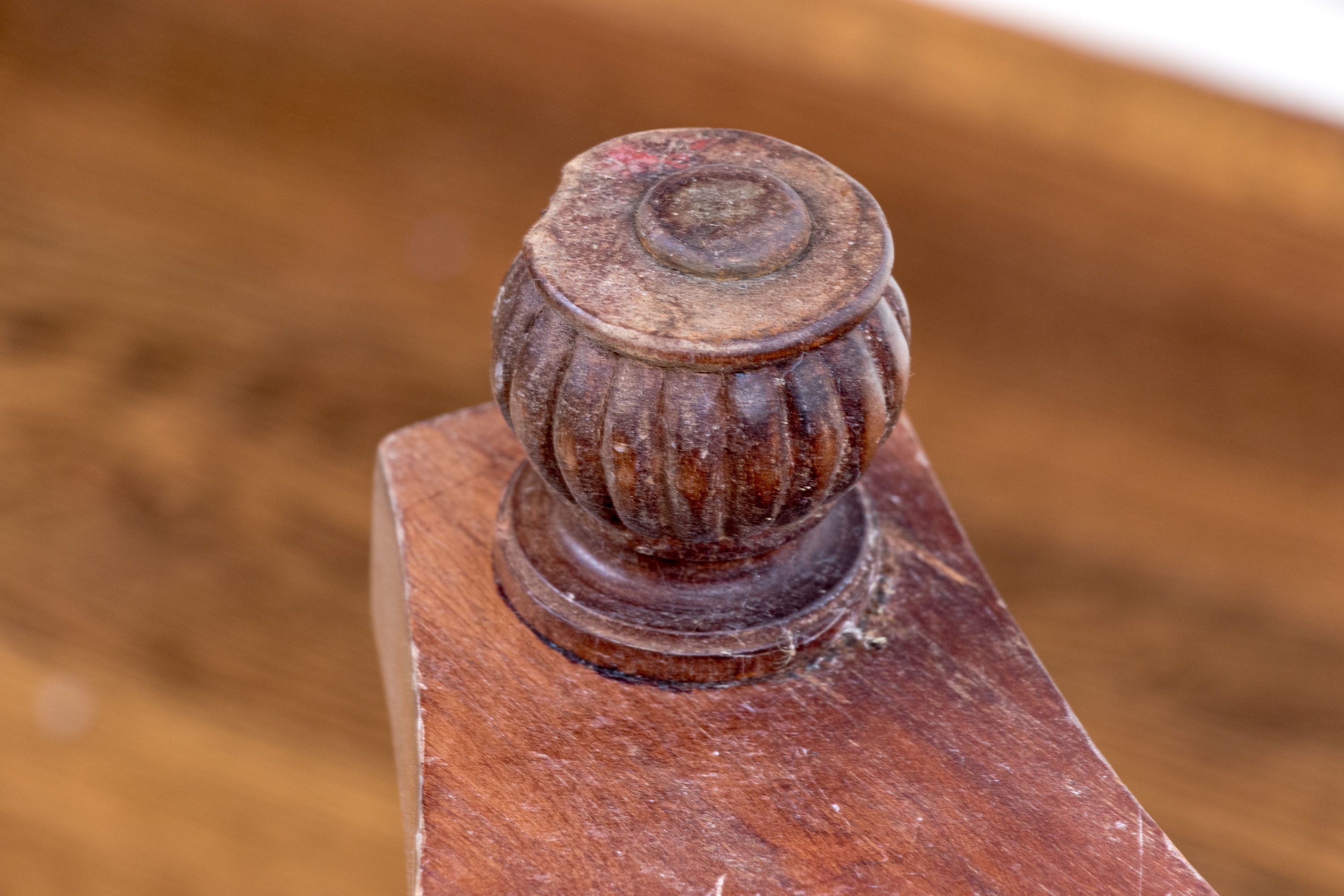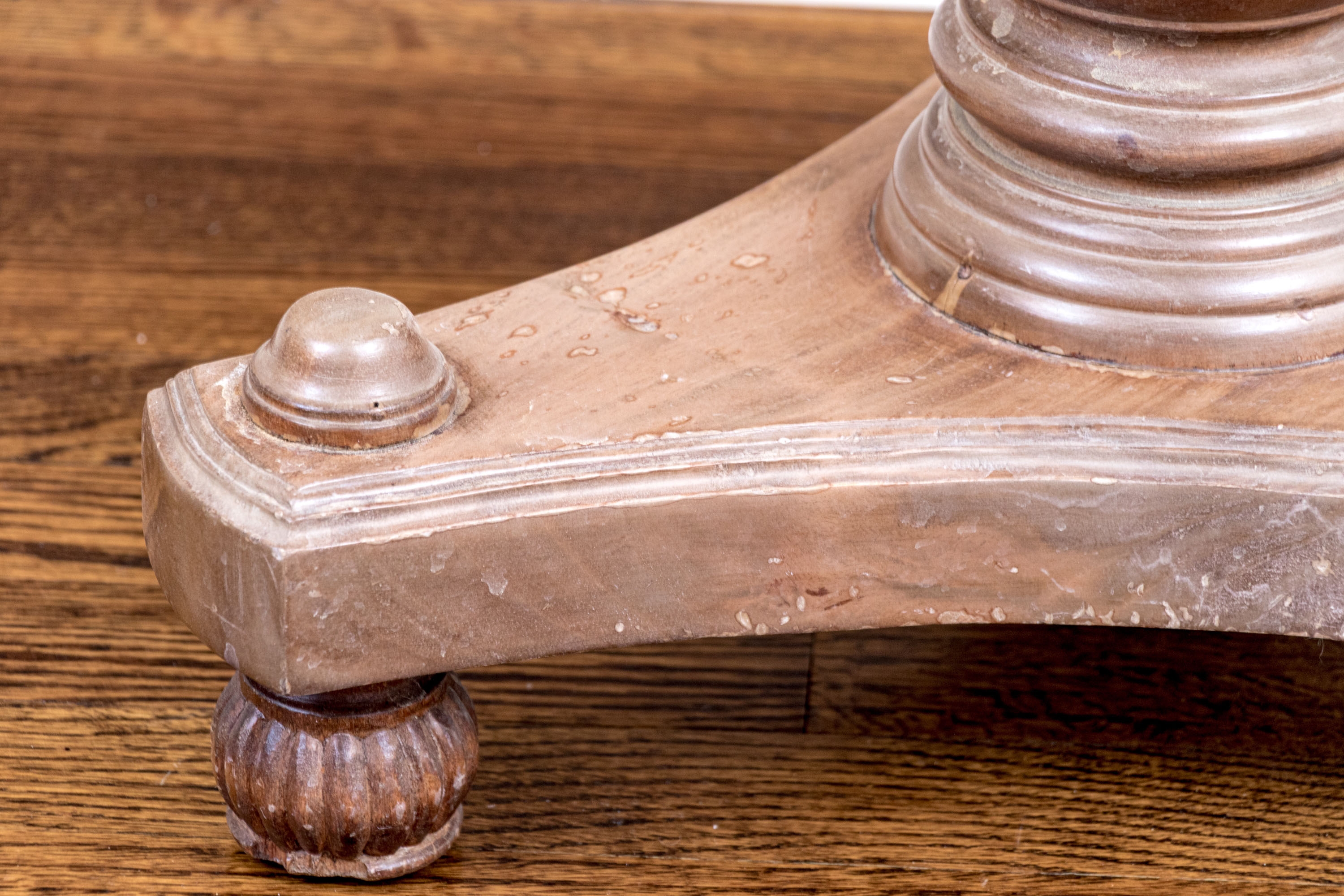 An openwork wooden basket made of curved staves on a carved frame. Raised on a baluster support mounted on a tripod base with raised knobs and ribbed ball feet.