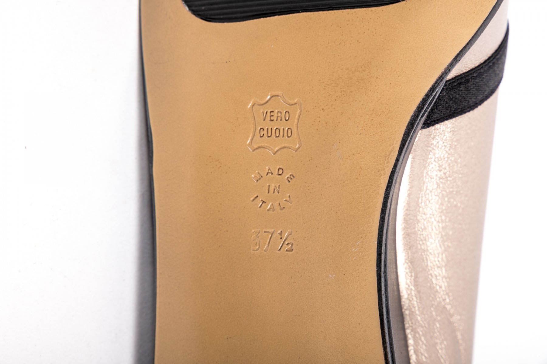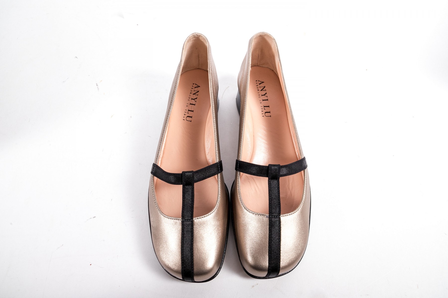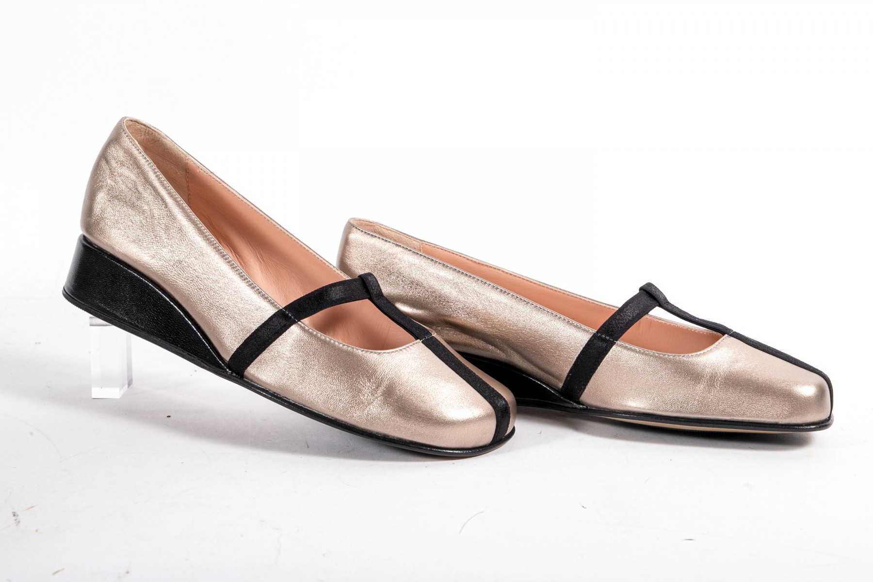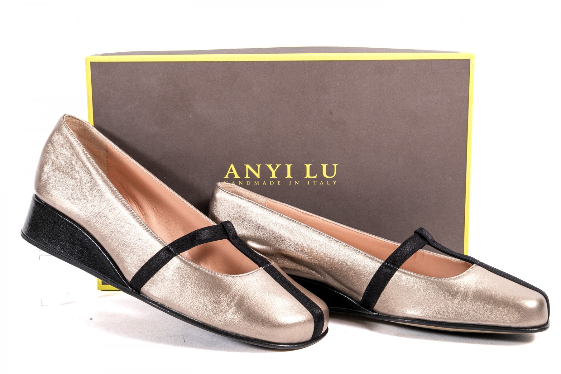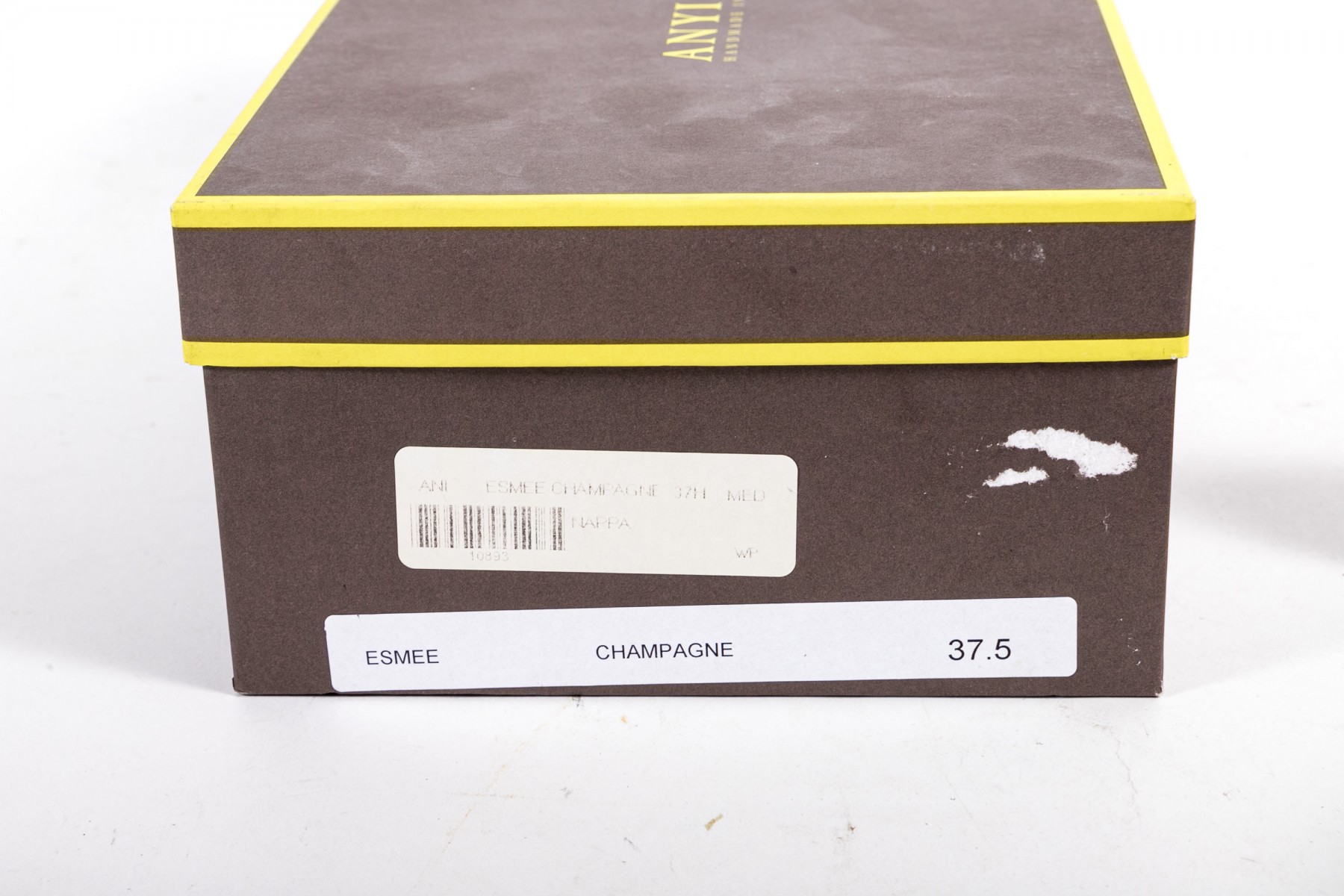 Anyi Lu pair of Esmee wedges in champagne hued Nappa leather, displaying a T-shaped black elastic band over gently box-shaped toes raised over black soles. Includes the original shoe box.