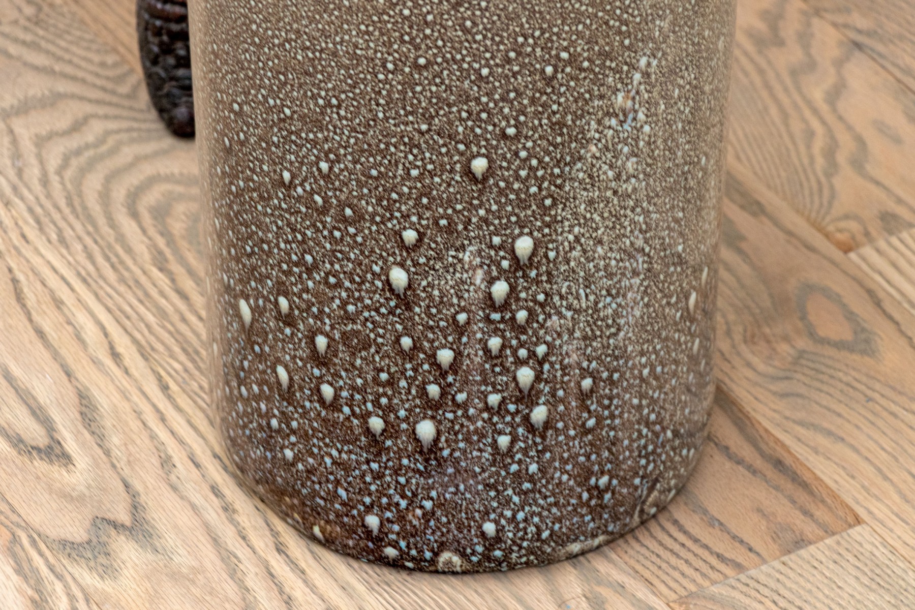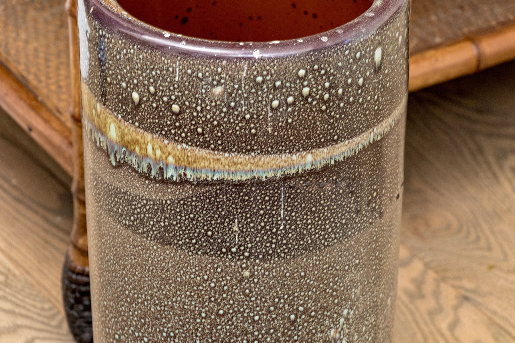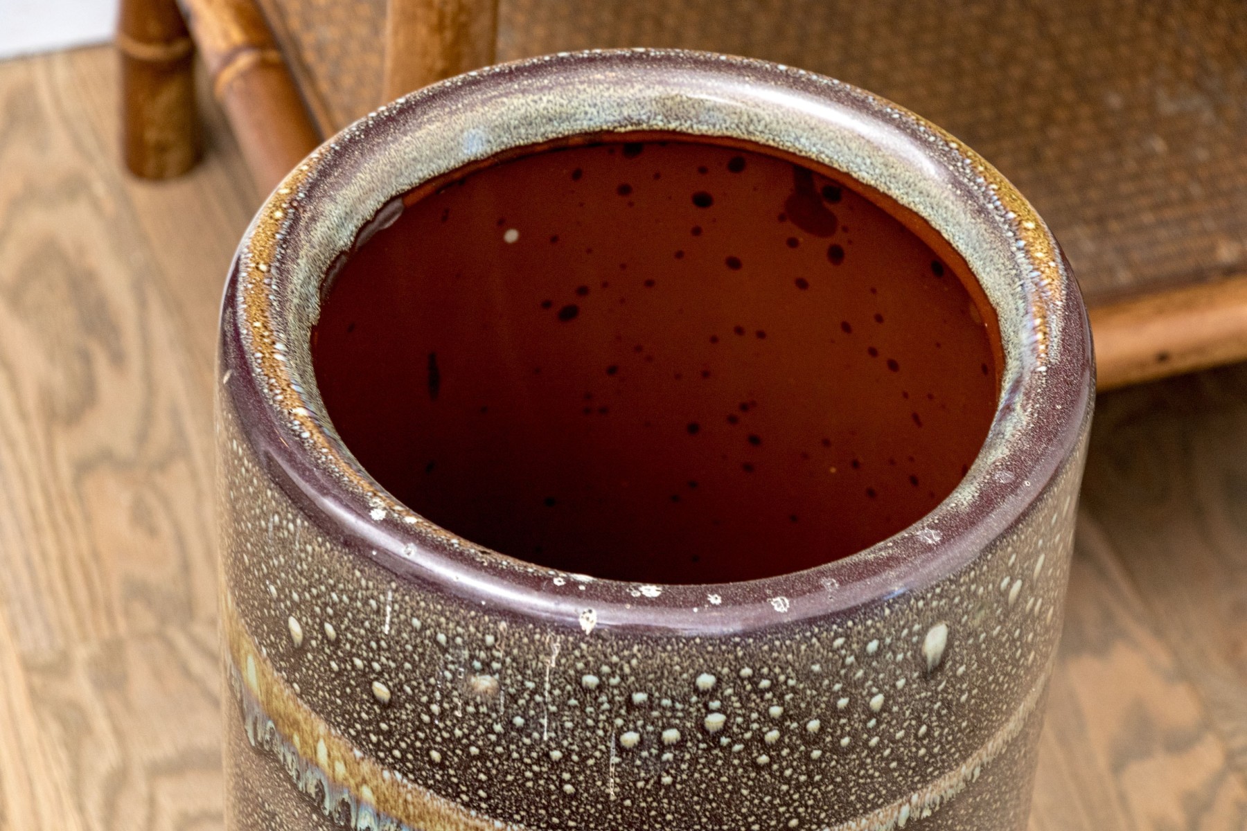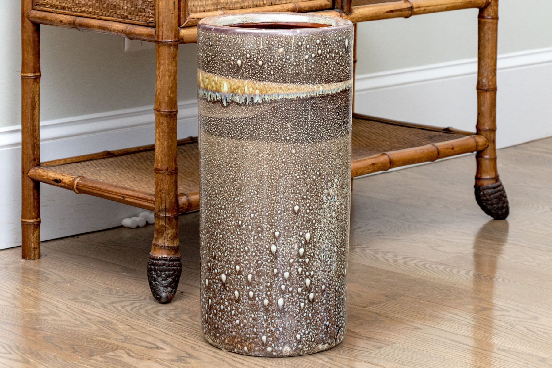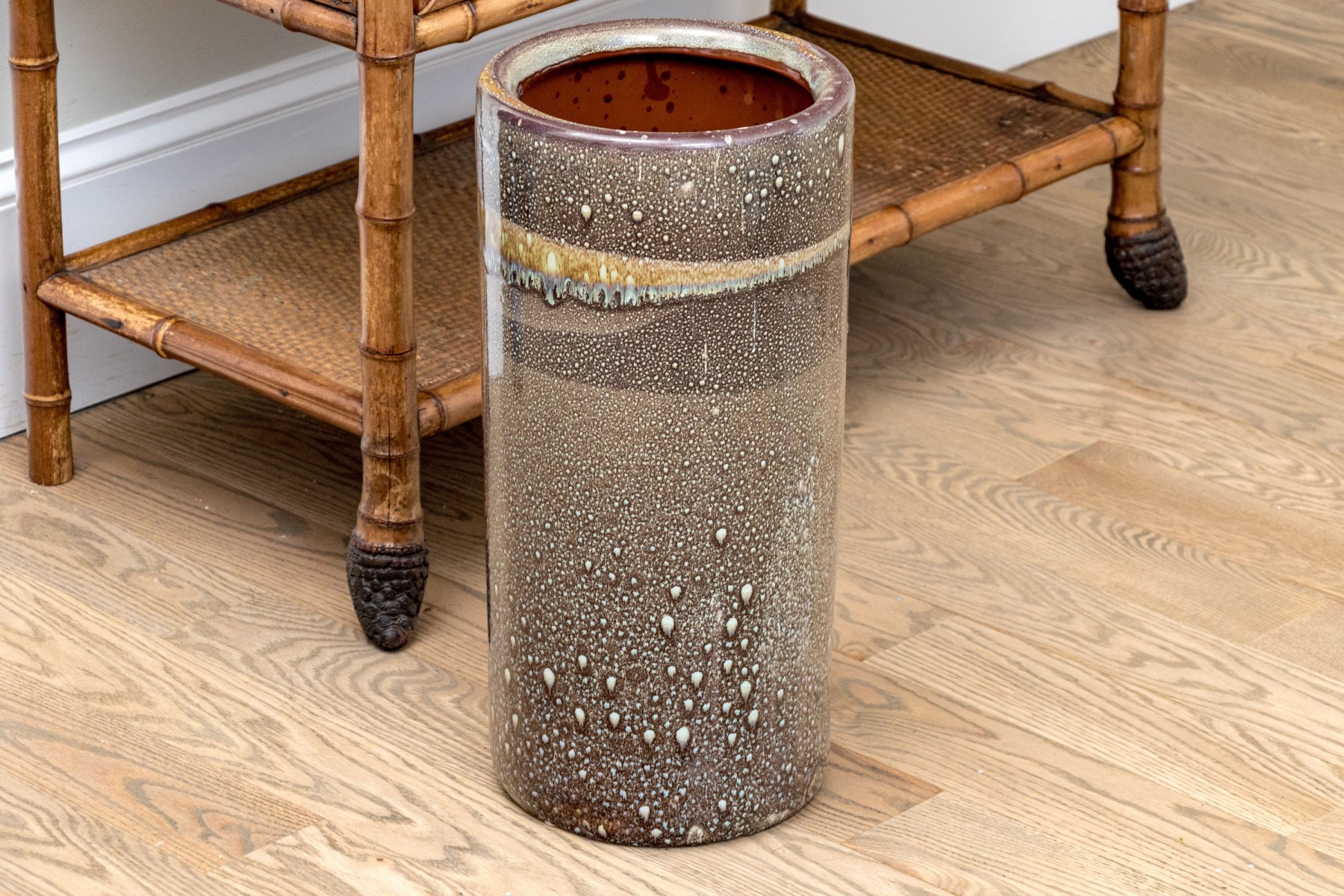 Labeled underfoot. The fabulous umbrella stand is cylindrical in form and embellished with a wonderful decorative textural, abstracted finish.