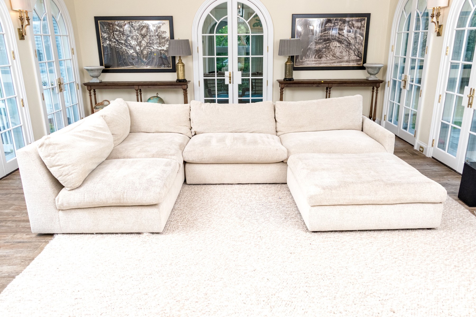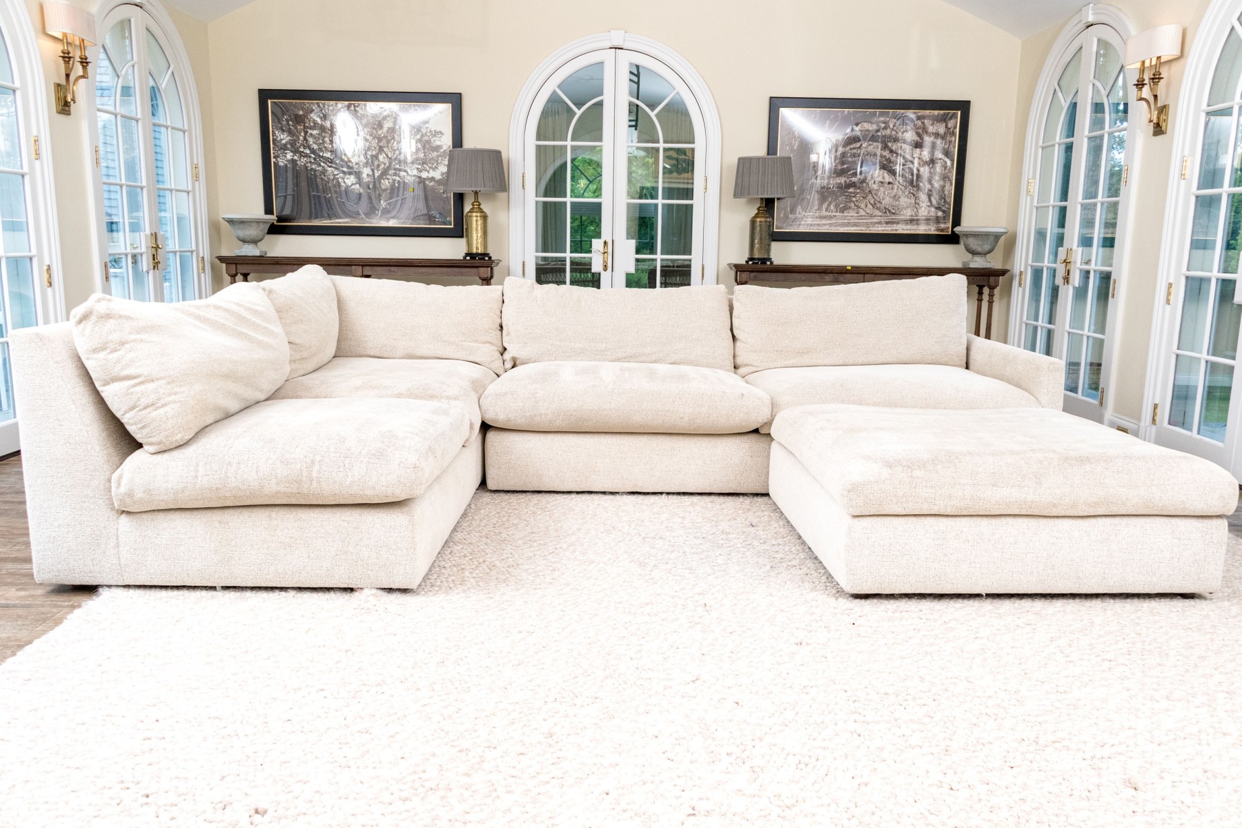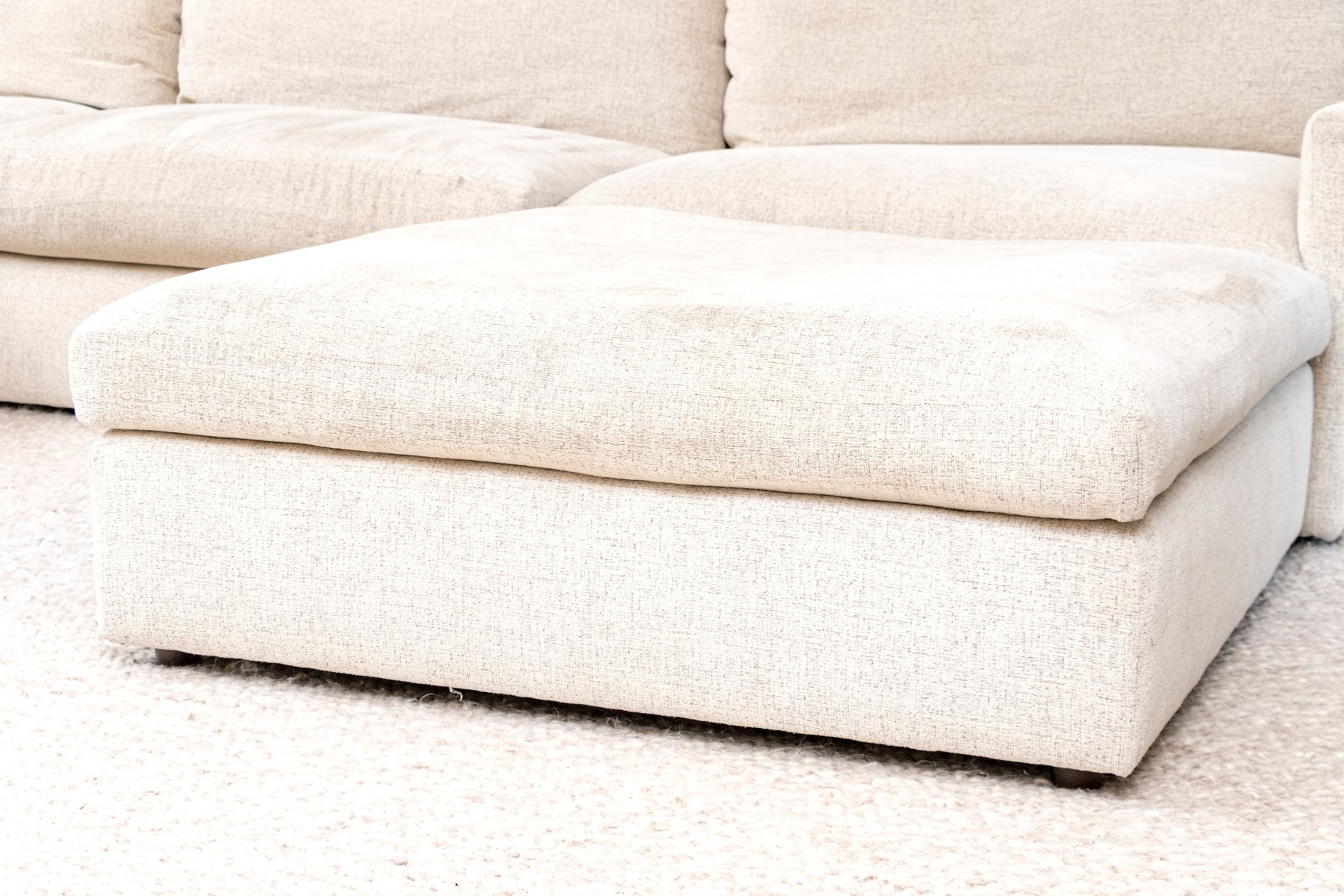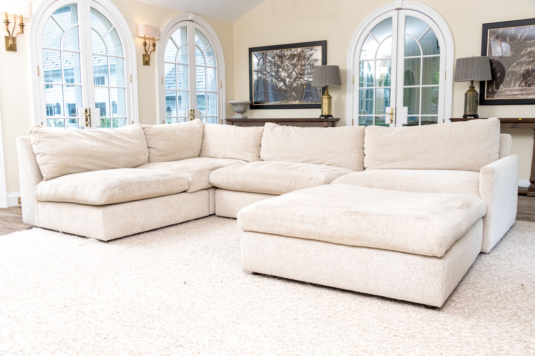 A high quality Arhaus sectional sofa comprised of a left arm oversized loveseat, corner section and single armless section together with one ottoman. The sectional features four loose seat cushions and five loose back cushions. All in wonderful neutral beige hued upholstery.