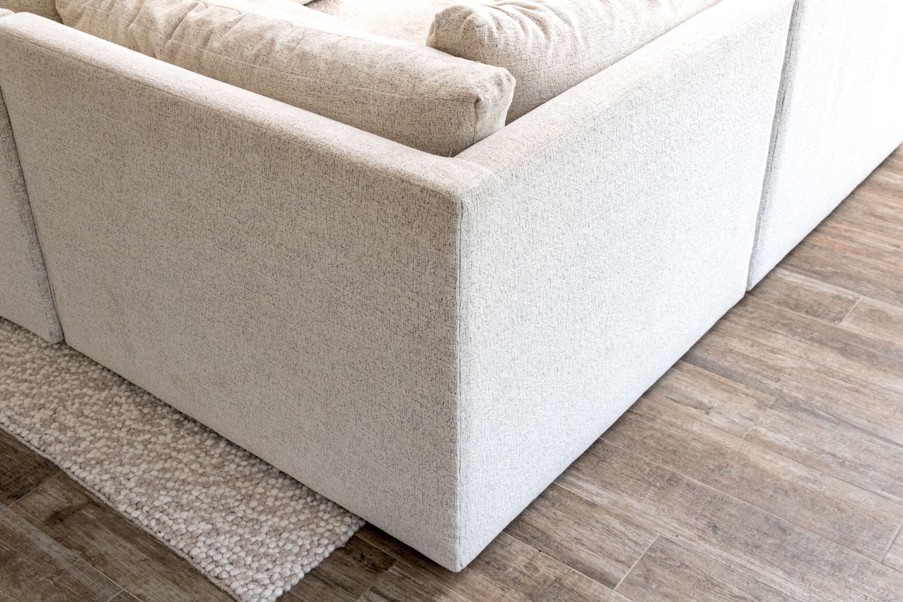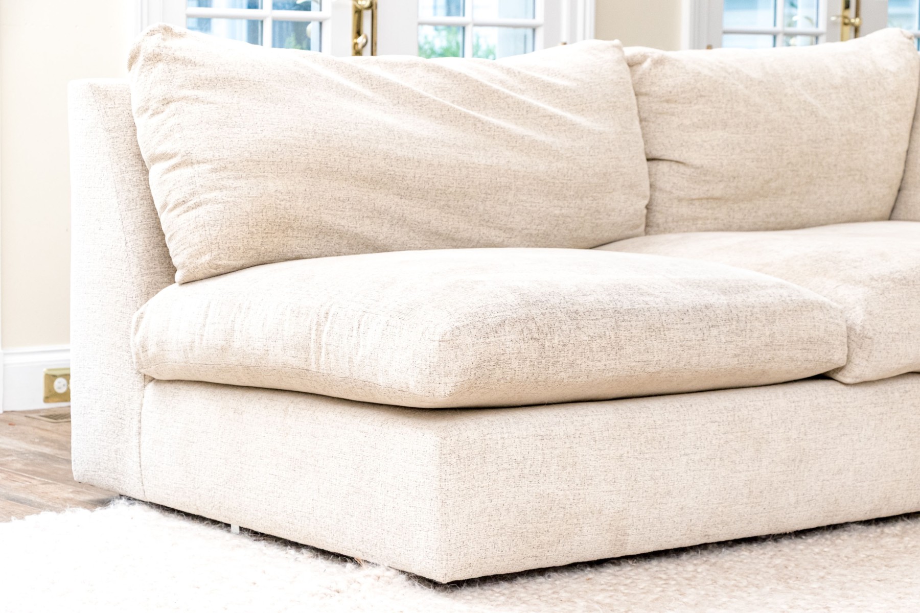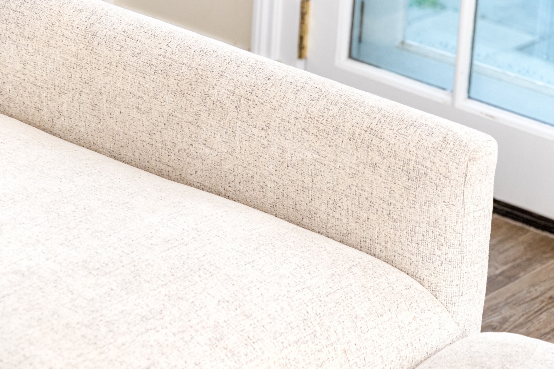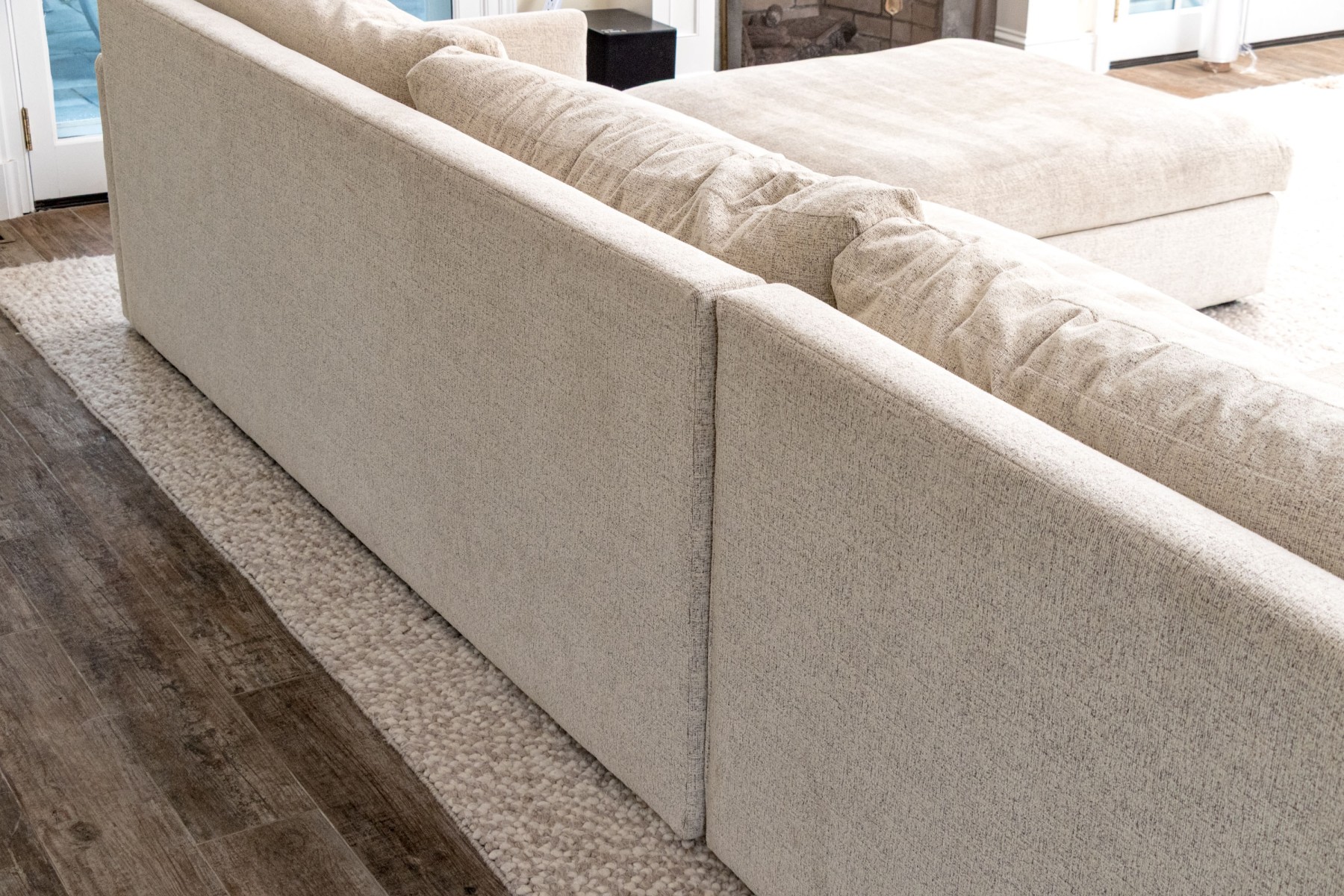 A high quality Arhaus sectional sofa comprised of a left arm oversized loveseat, corner section and single armless section together with one ottoman. The sectional features four loose seat cushions and five loose back cushions. All in wonderful neutral beige hued upholstery.