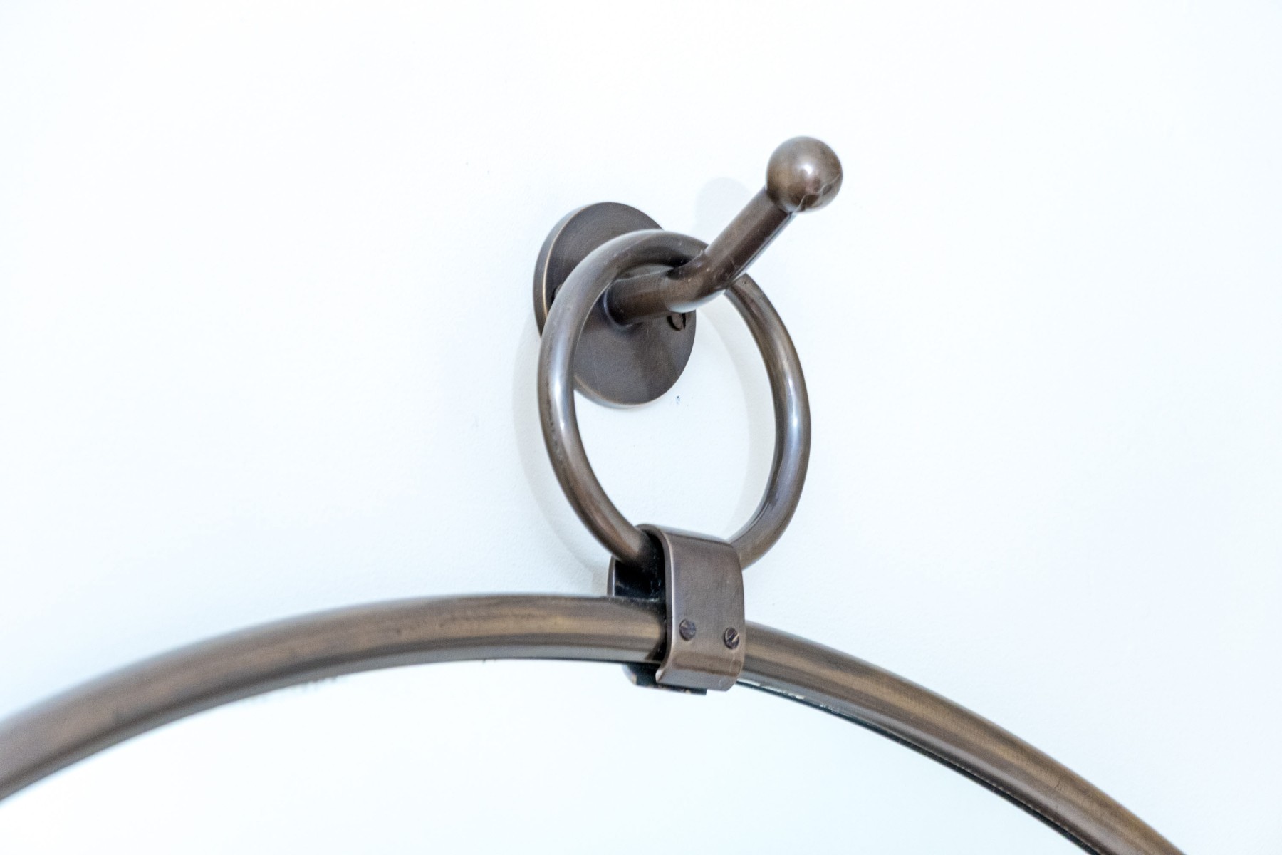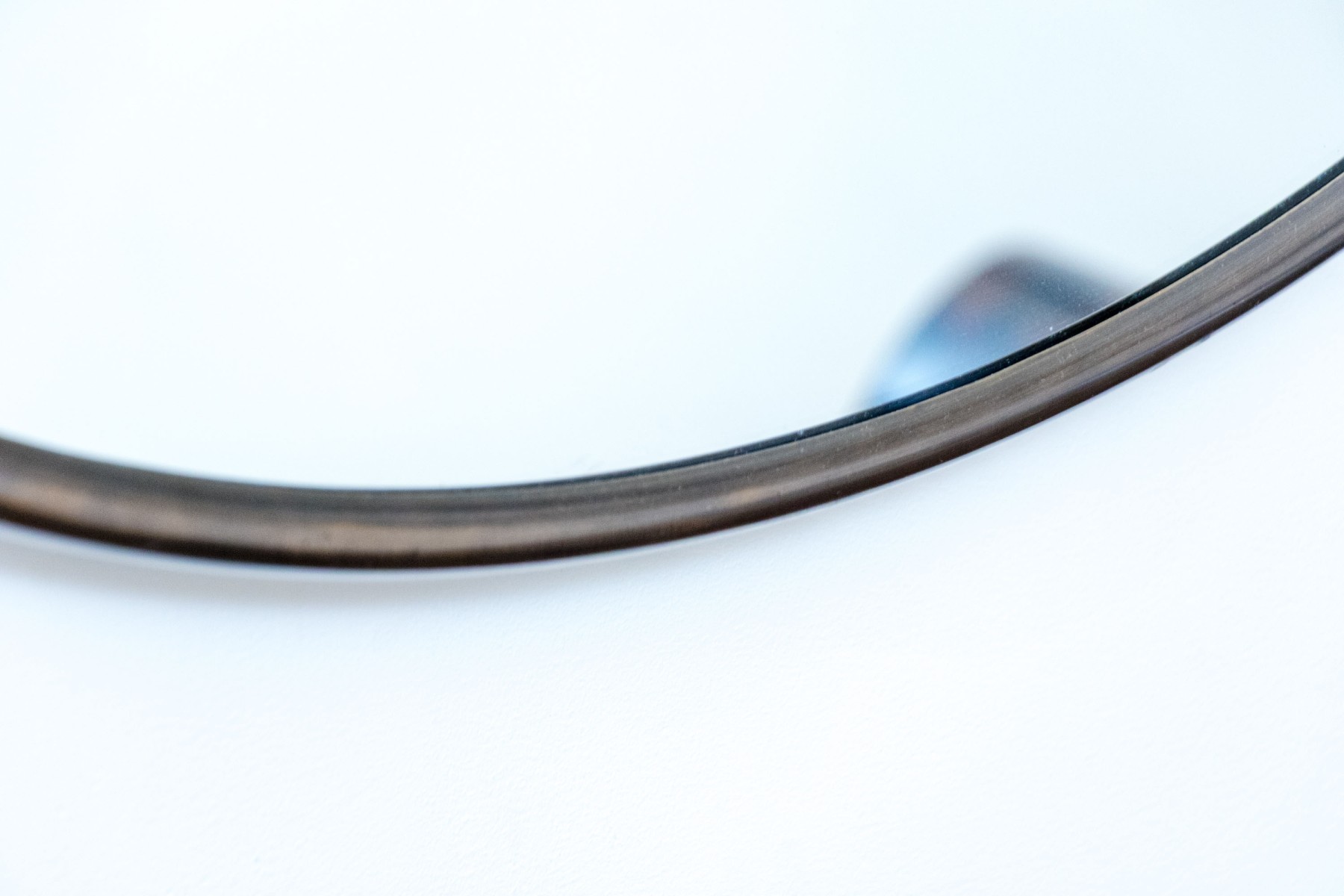 A stunning and stylish Arhaus "Thomas" round pendant wall mirror displaying a sleek round mirror plate in a minimalist gray patinaed finish. The mirror hangs from a hook with a circular bail connecting to the frame with a wide jump ring detailed with two screws to the front.