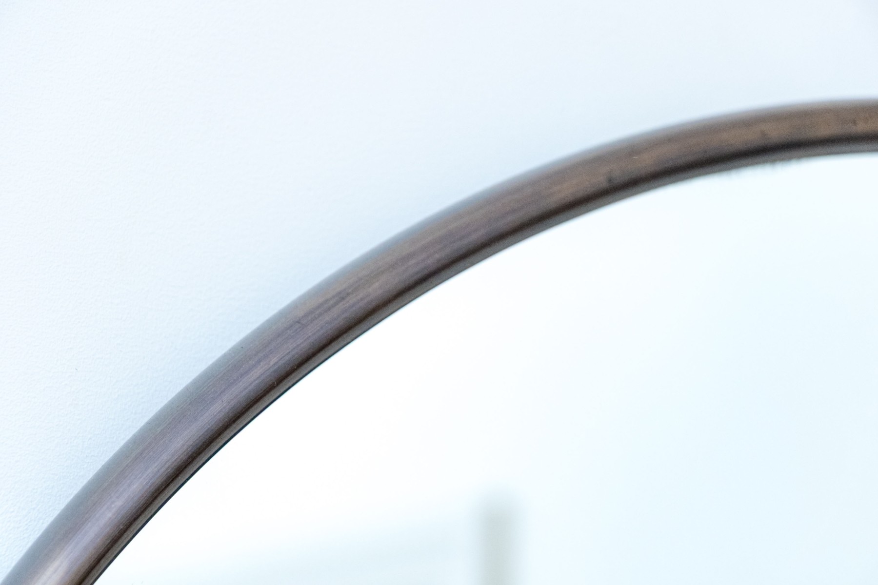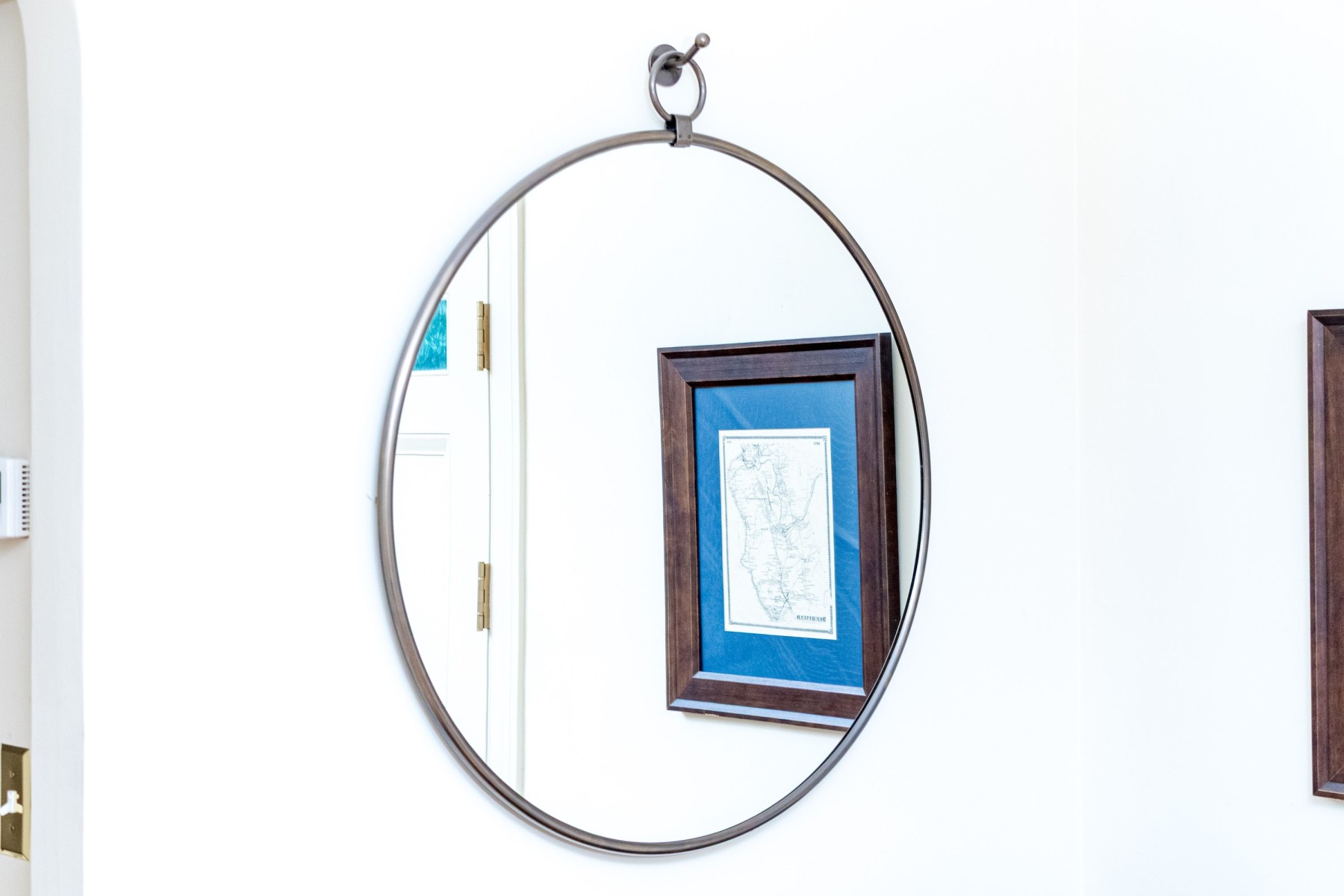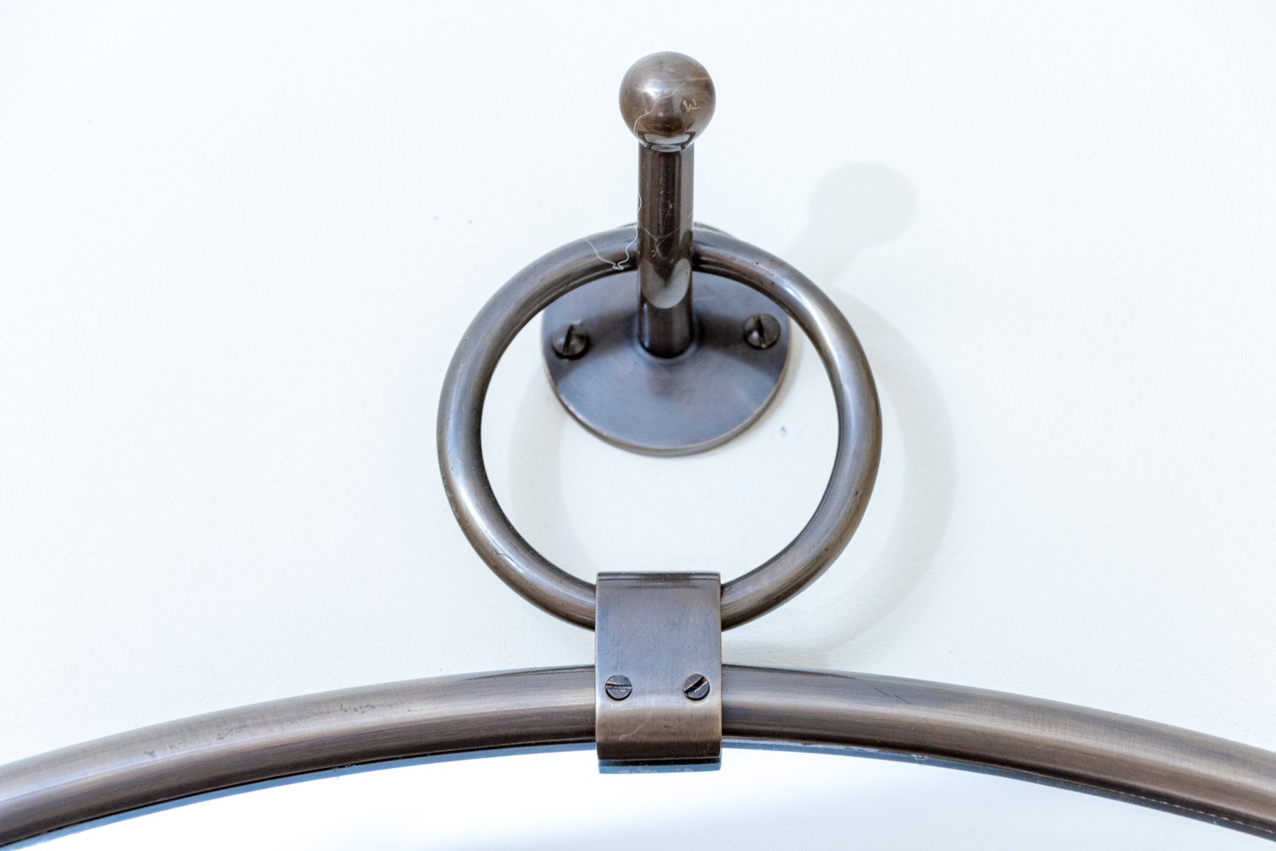 A stunning and stylish Arhaus "Thomas" round pendant wall mirror displaying a sleek round mirror plate in a minimalist gray patinaed finish. The mirror hangs from a hook with a circular bail connecting to the frame with a wide jump ring detailed with two screws to the front.