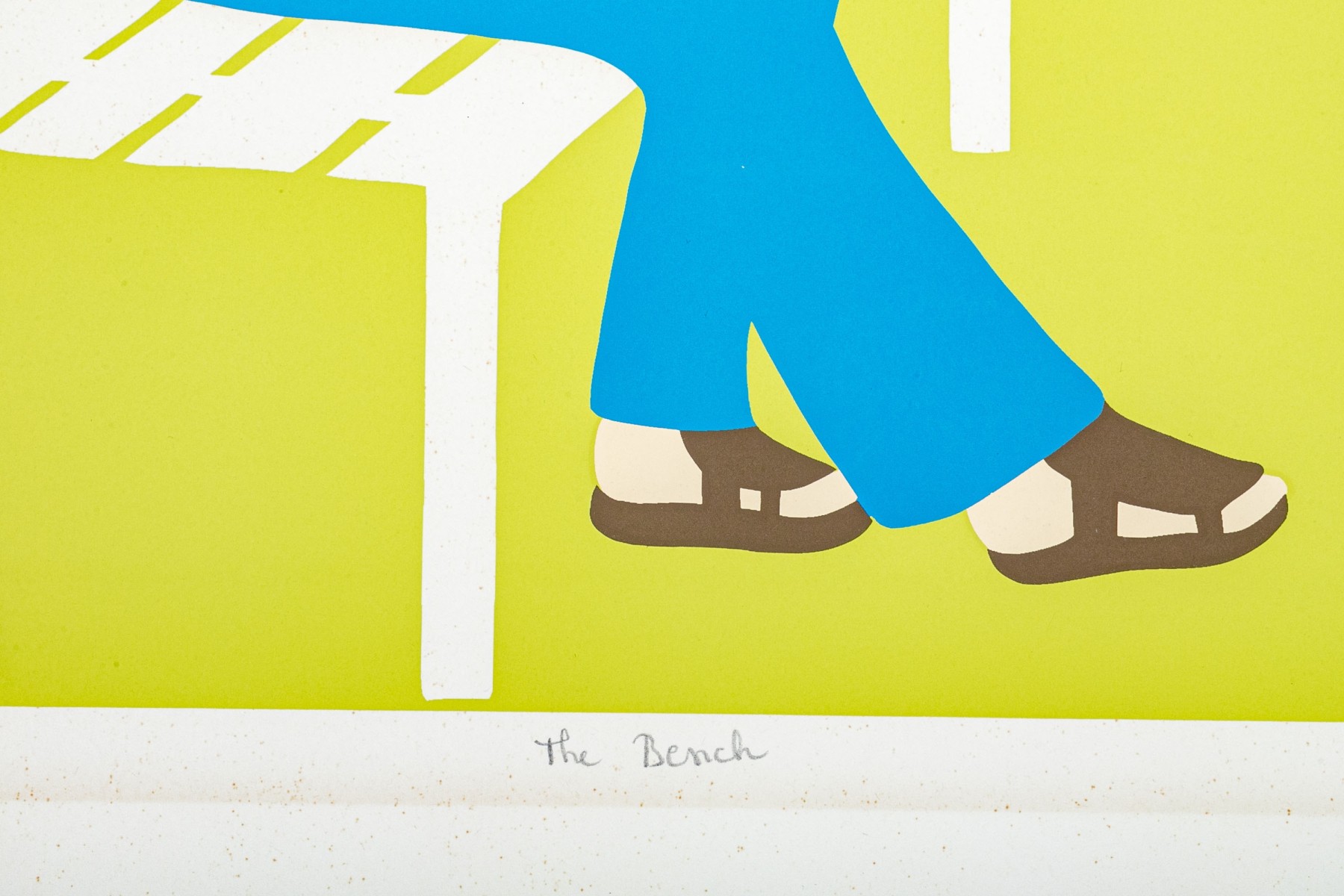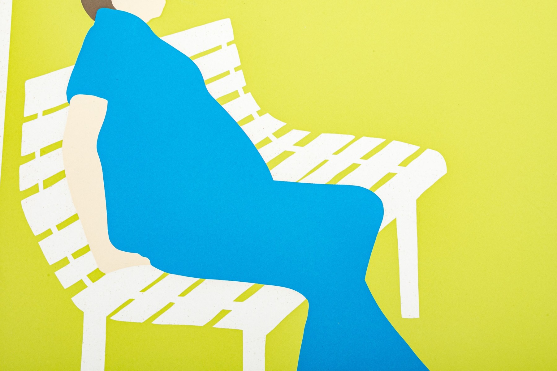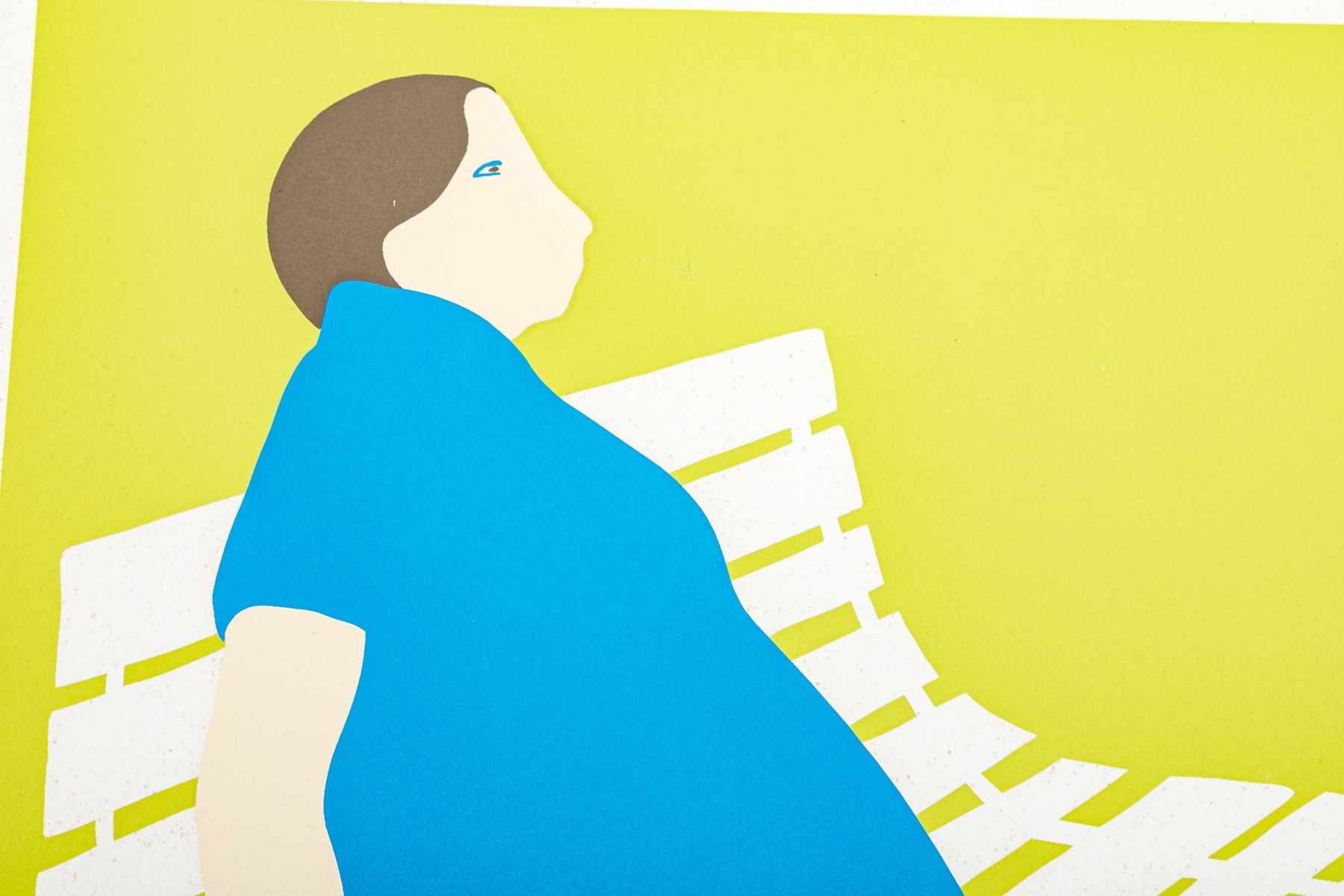 The image depicts a woman in blue seated on a white park bench against a monochromatic green ground.