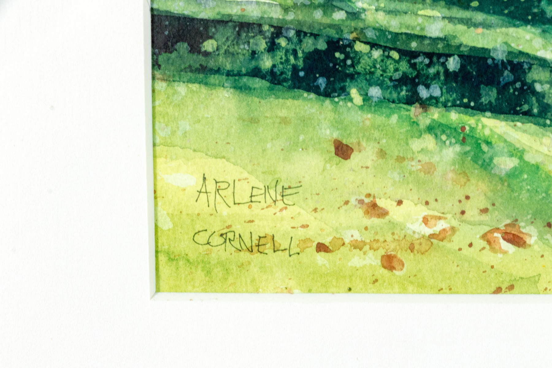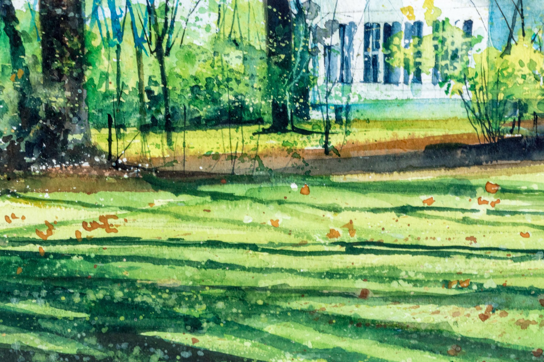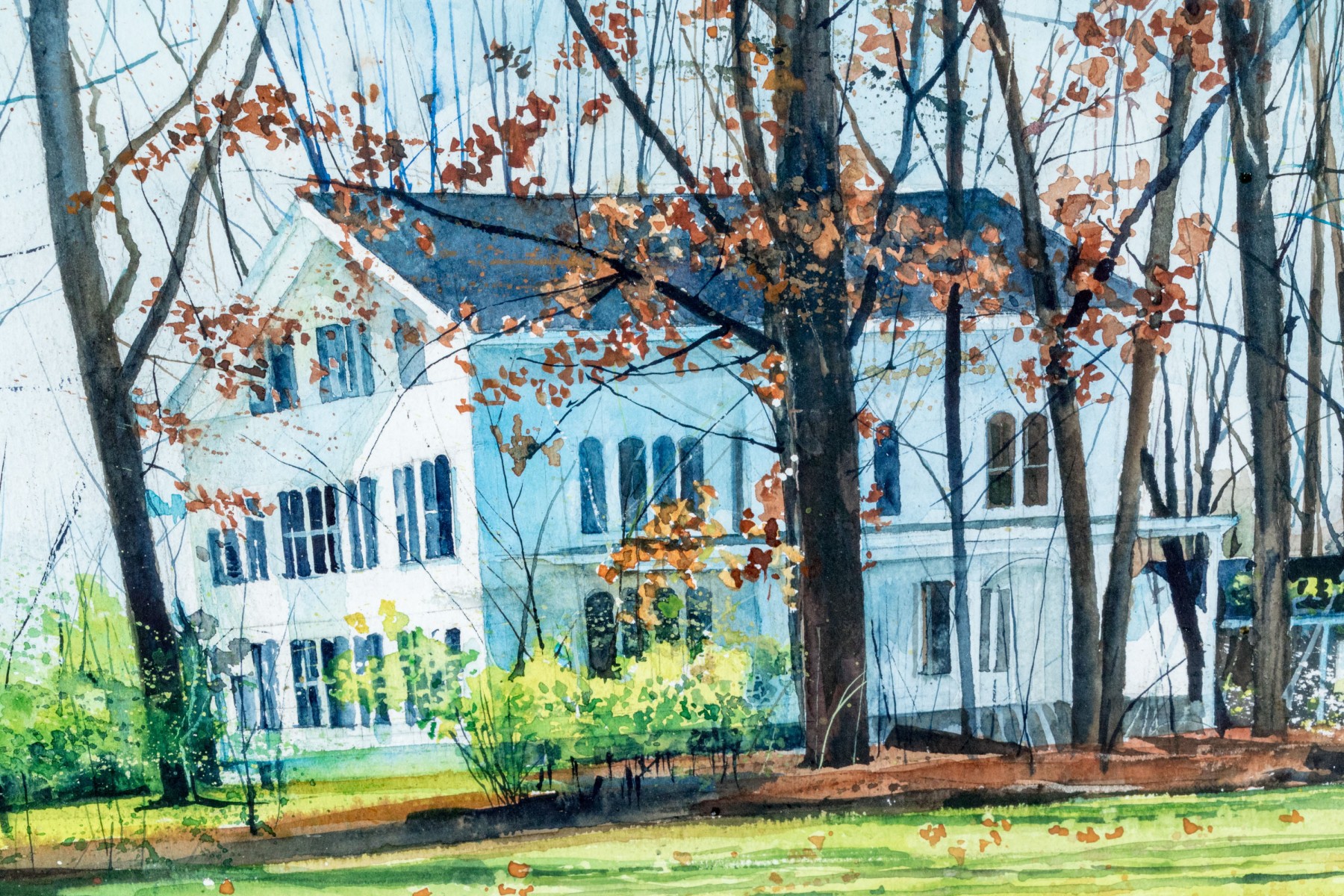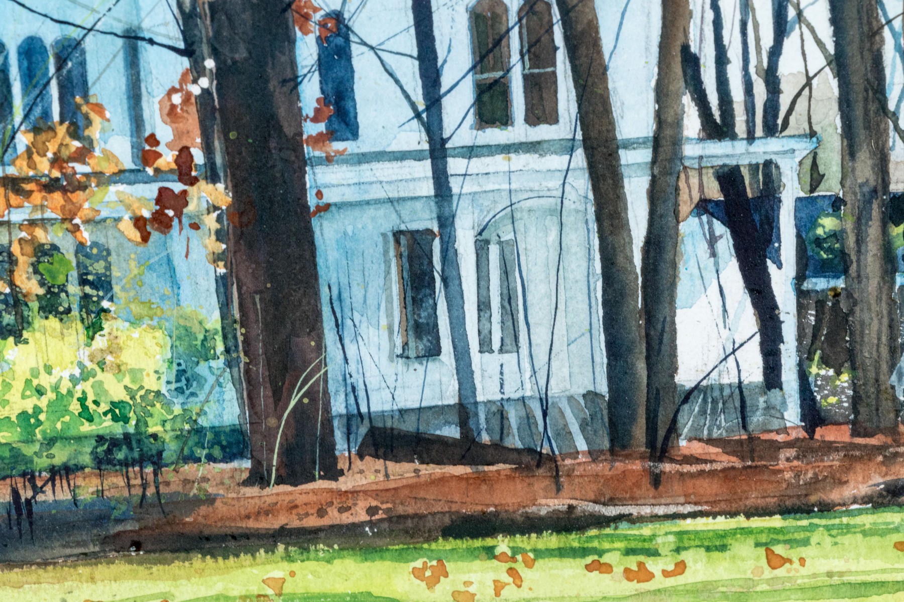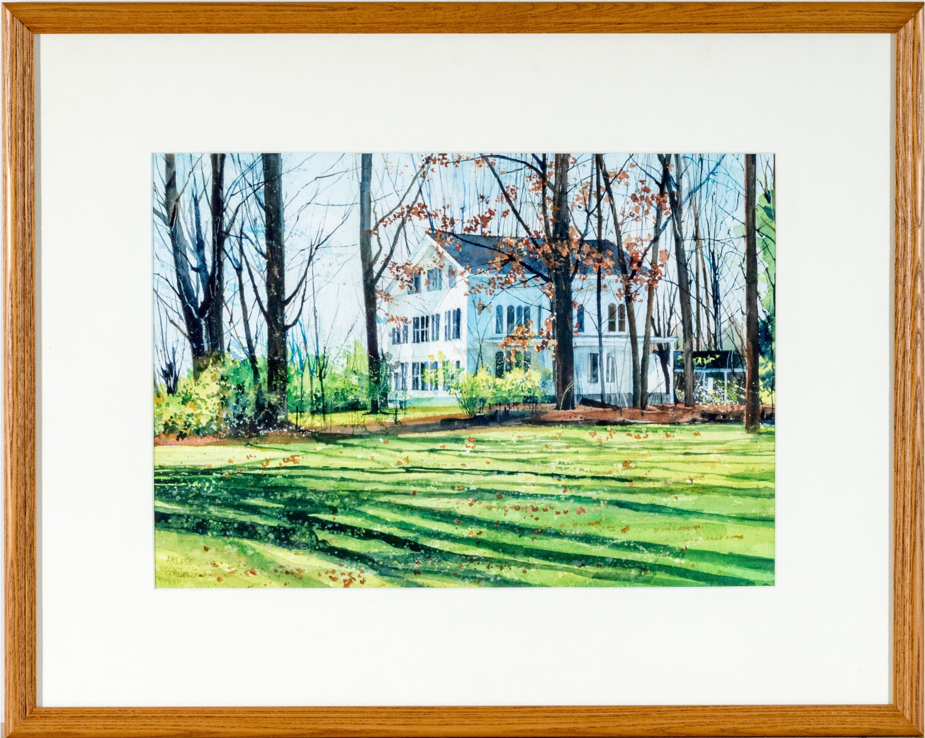 Arlene Cornell (American, B. 20th C.) watercolor on paper depicting a beautiful white house along a landscape of lush green grass, overlaid by the shadows of autumnal trees. Presented matted, framed, and glazed.