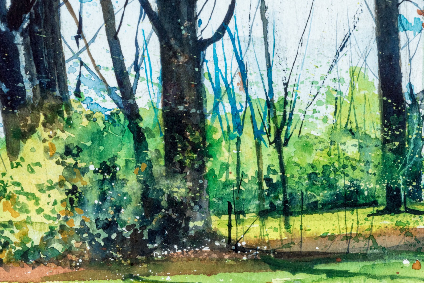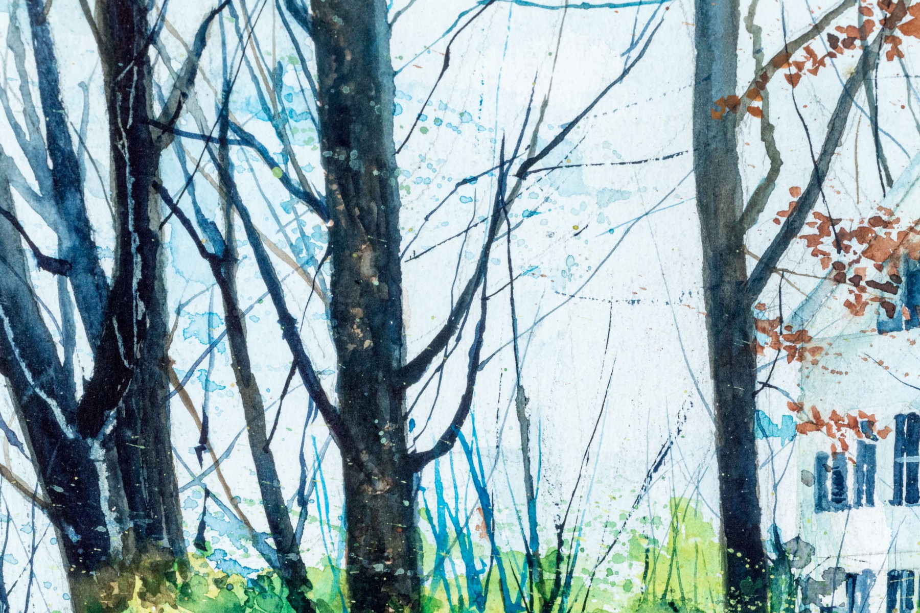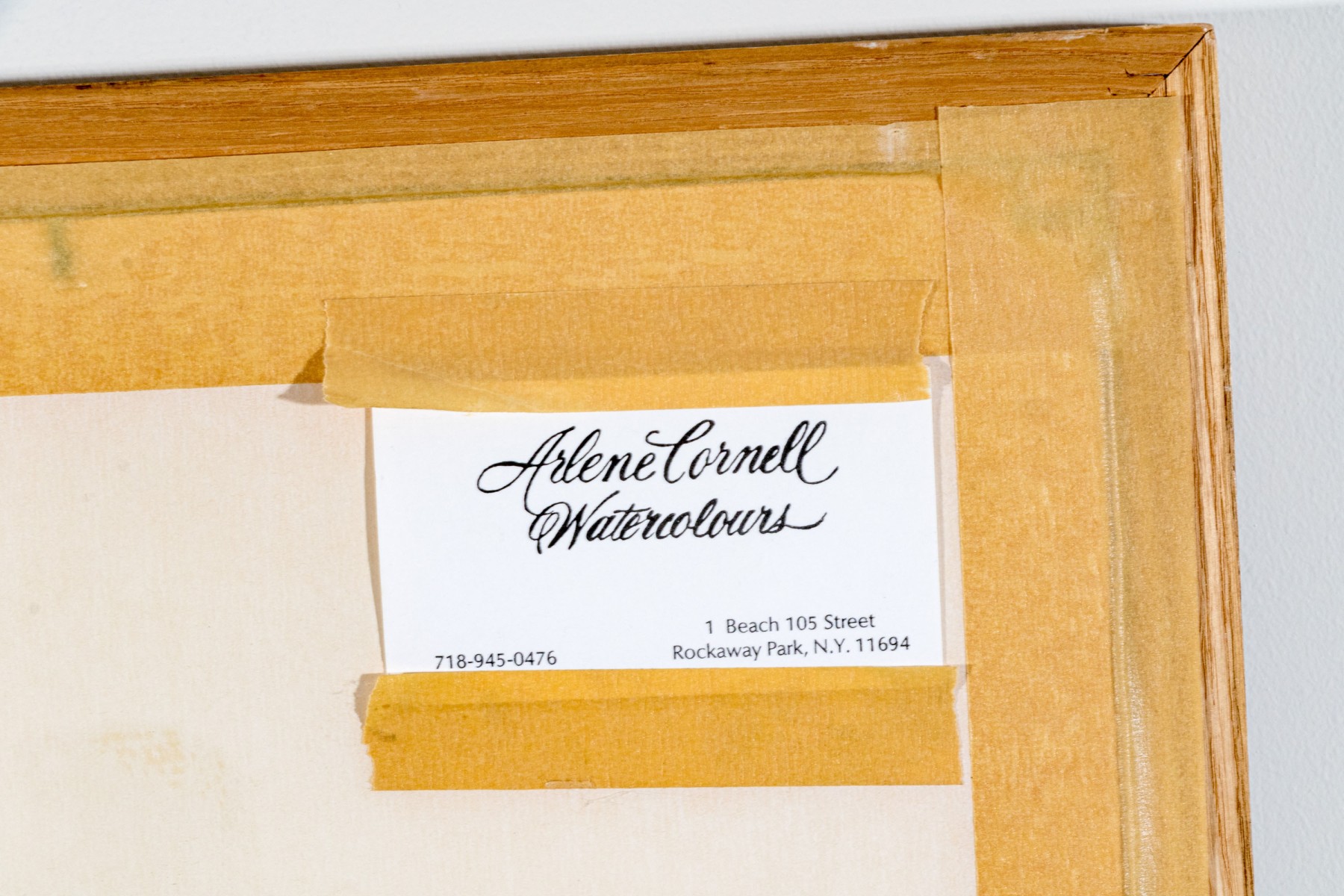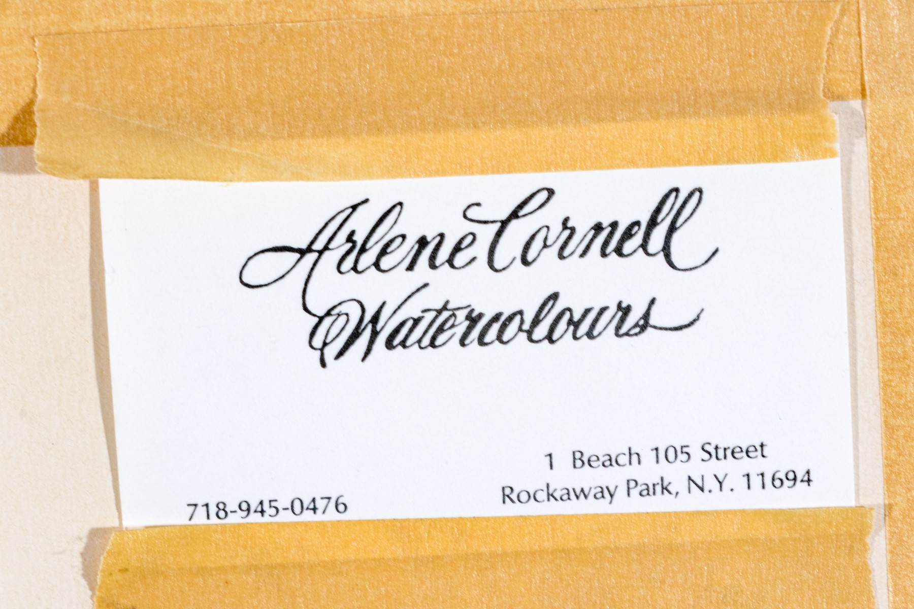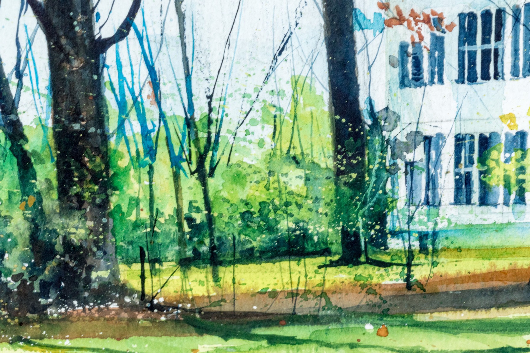 Arlene Cornell (American, B. 20th C.) watercolor on paper depicting a beautiful white house along a landscape of lush green grass, overlaid by the shadows of autumnal trees. Presented matted, framed, and glazed.