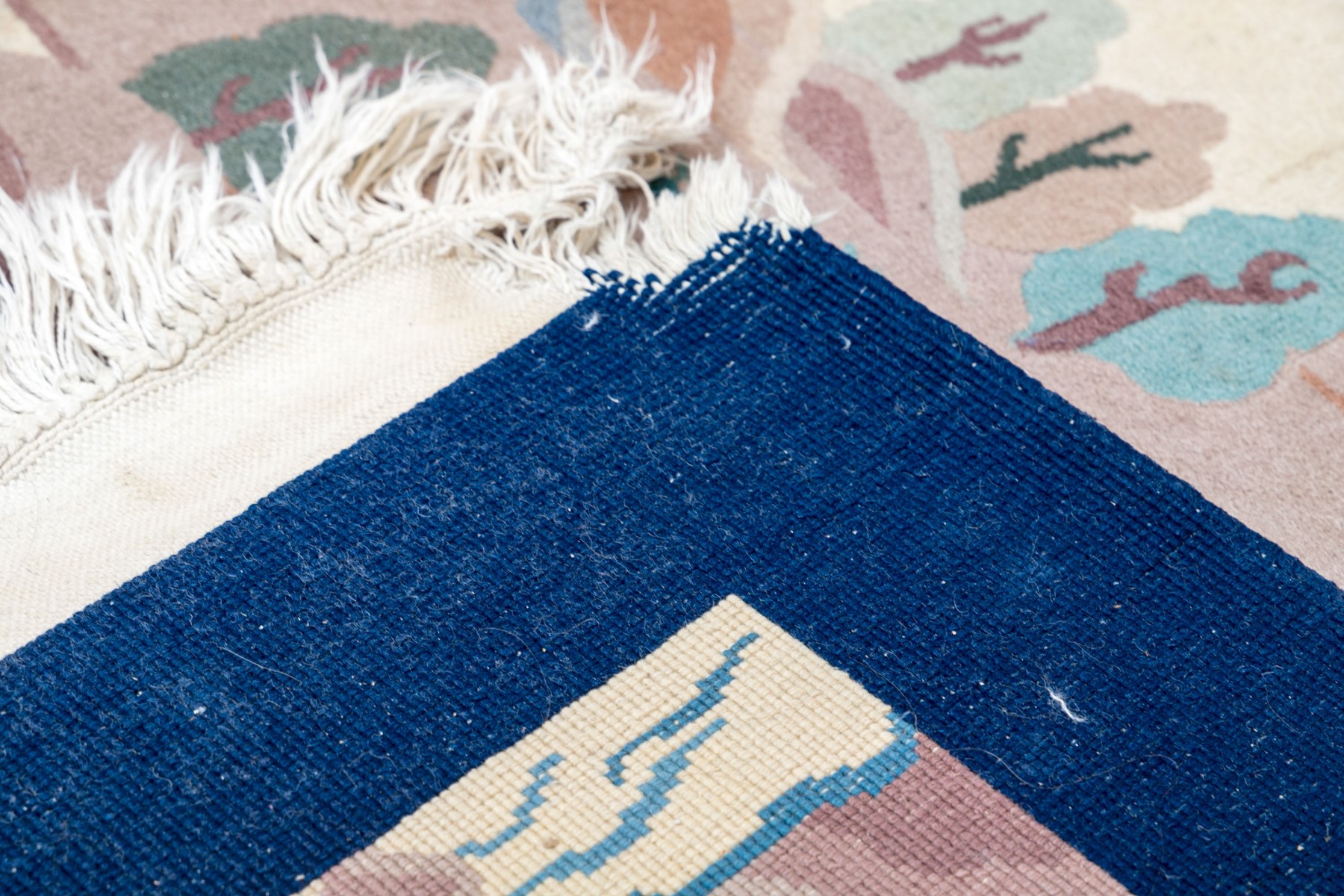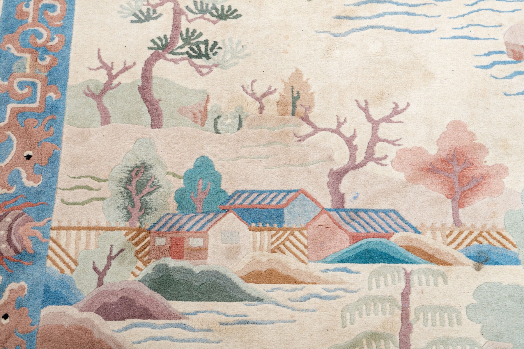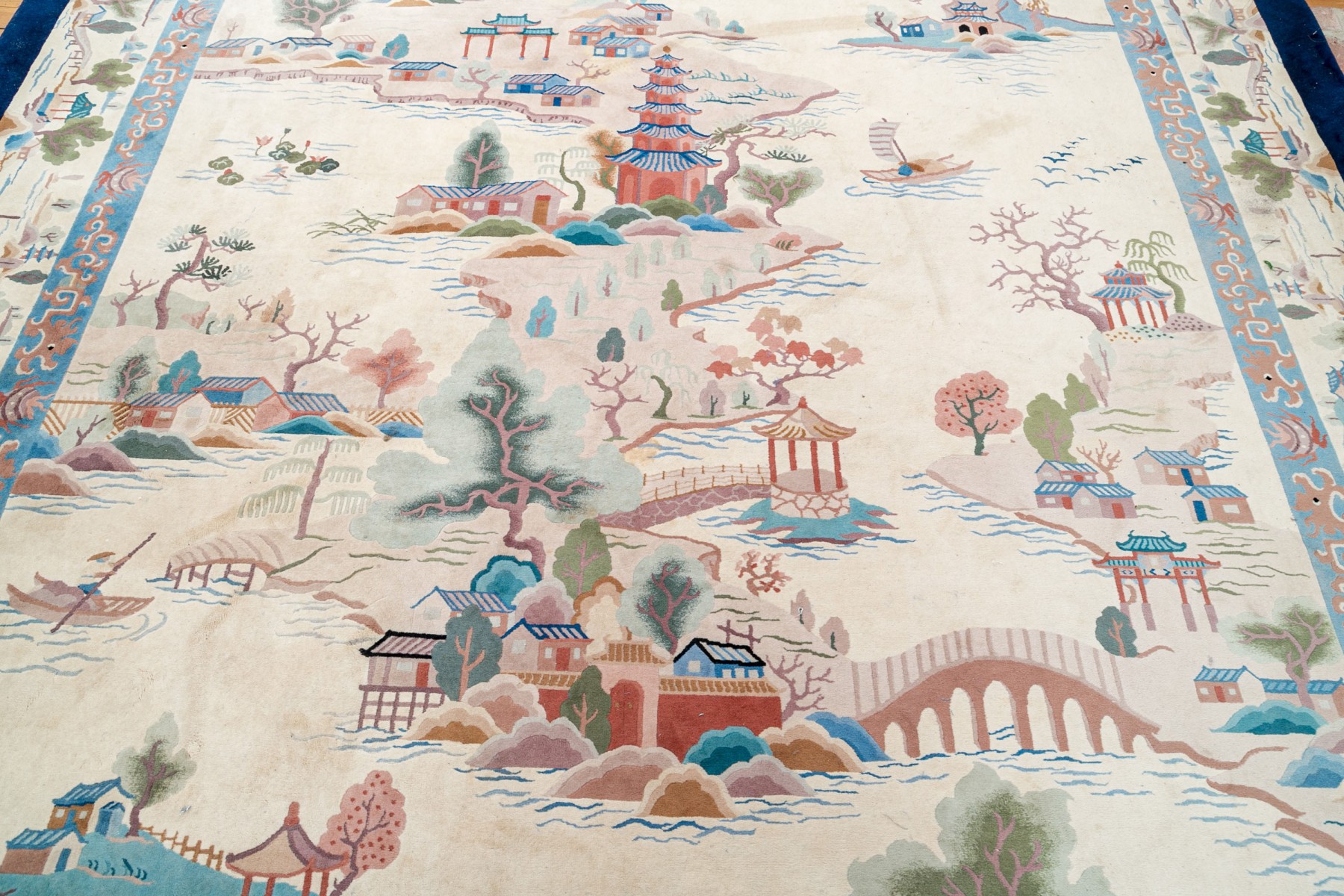 This Art Deco Chinese pictorial rug showcases a sophisticated design with a navy blue border and a serene beige ground.