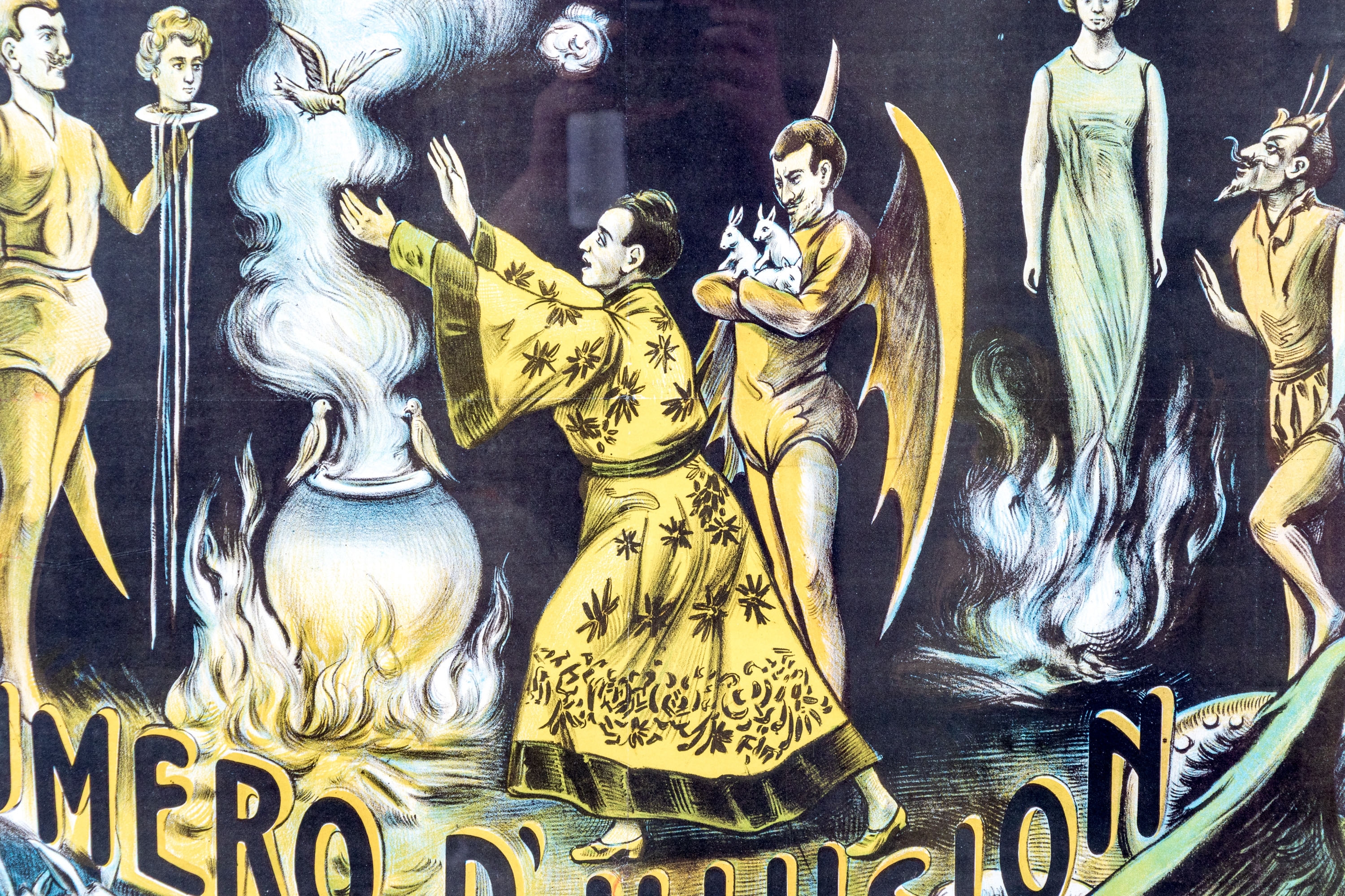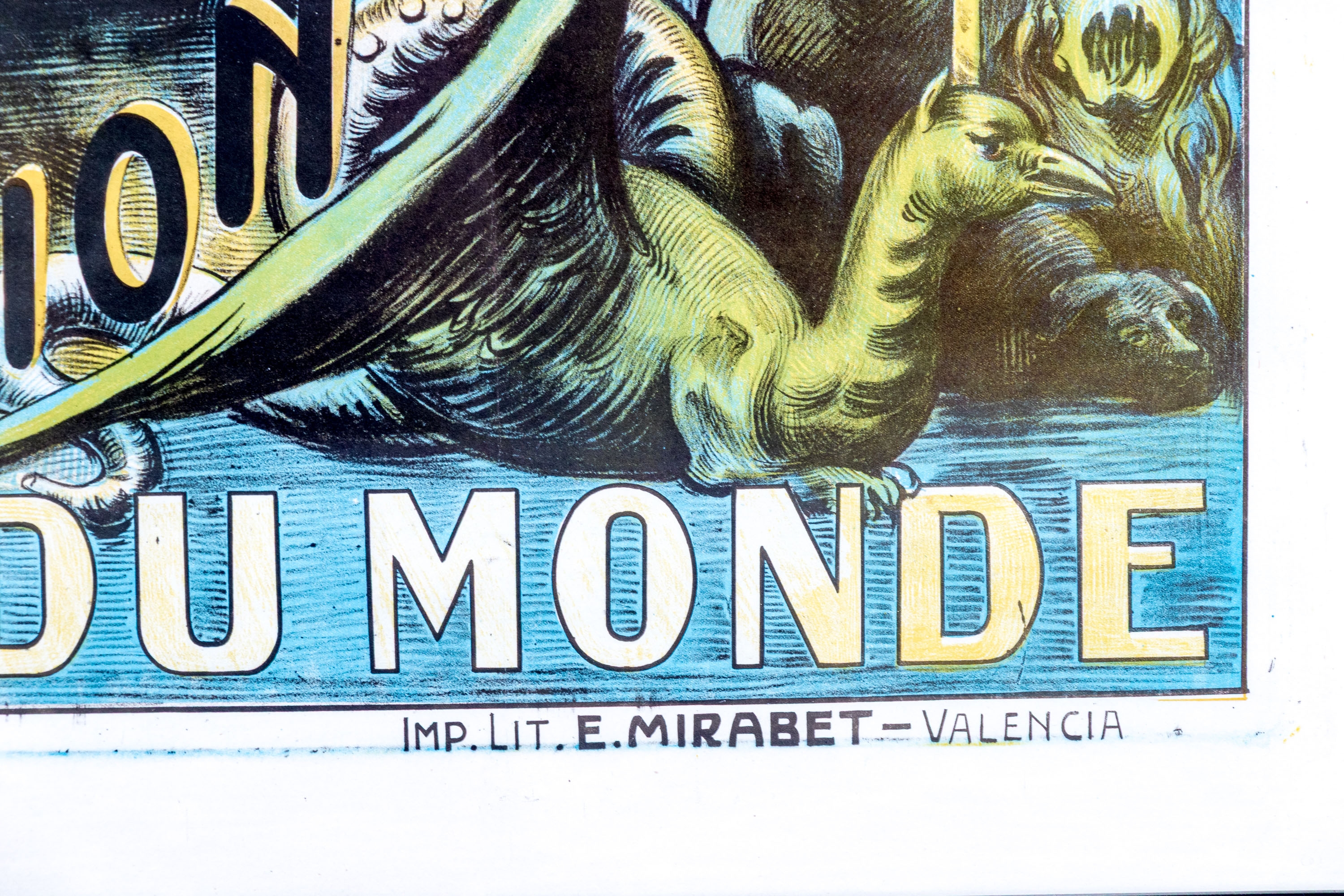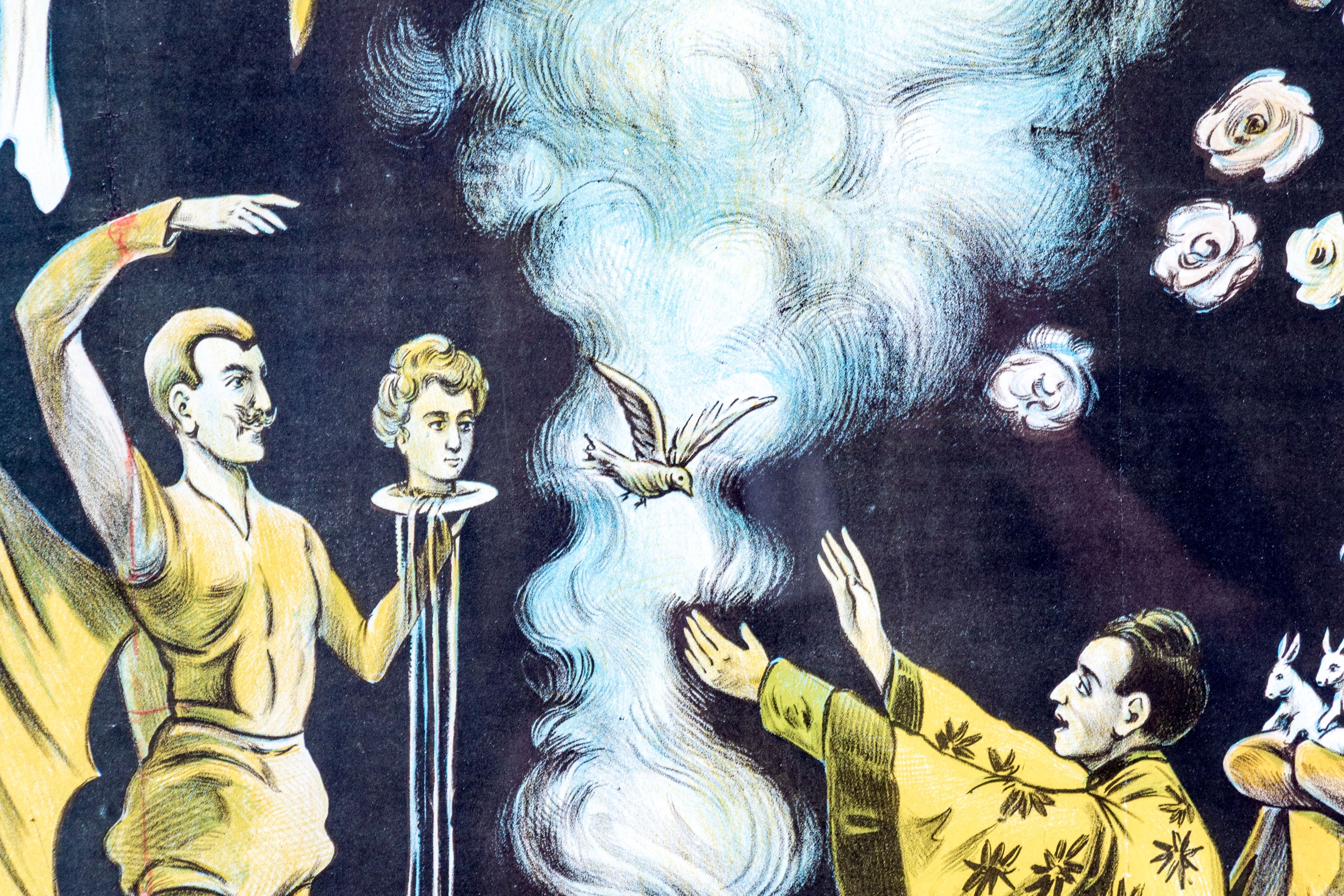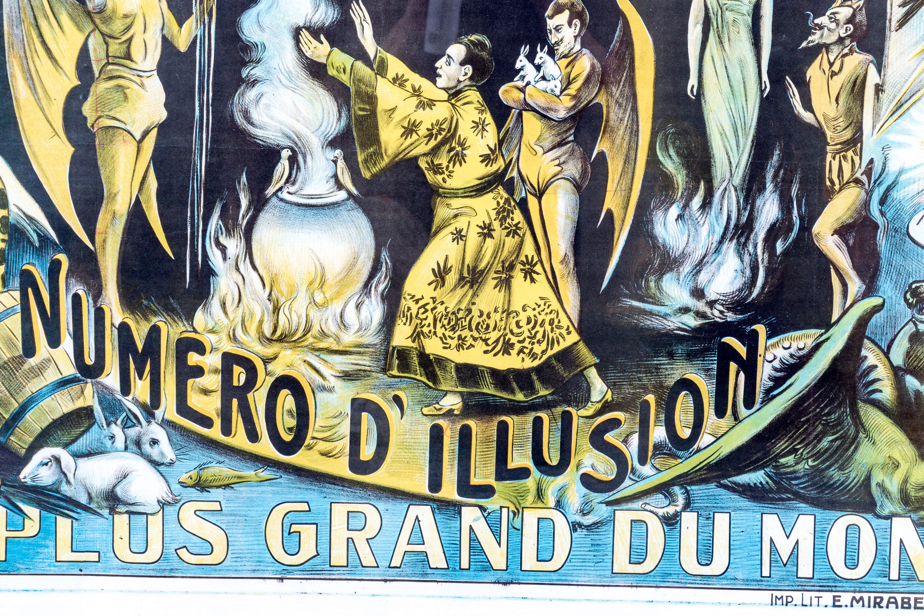 A fantastic antique advertising poster for "The Fak Hongs Le Plus Grand," ca. 1930. Lithograph published by E. Mirabet, Valencia, Spain. The oversized poster features portraits of two gentlemen in white within circular medallions over a two-part scene depicting figures, birds, and mythological motifs with a yellow-green top and blue bottom. The poster reads "The Fak Hongs, Numero D'Illusion, Le Plus Grand Du Monde."
